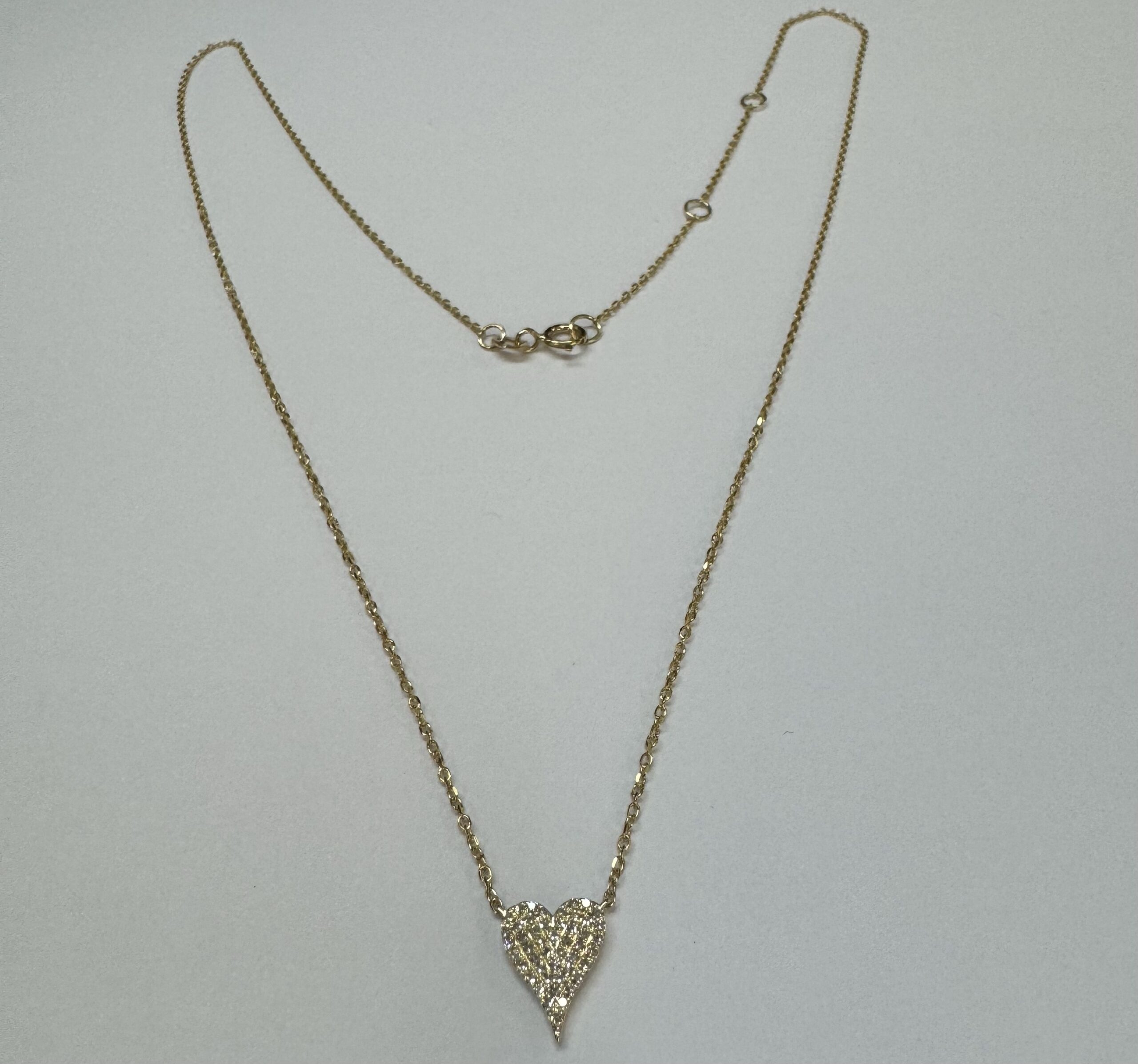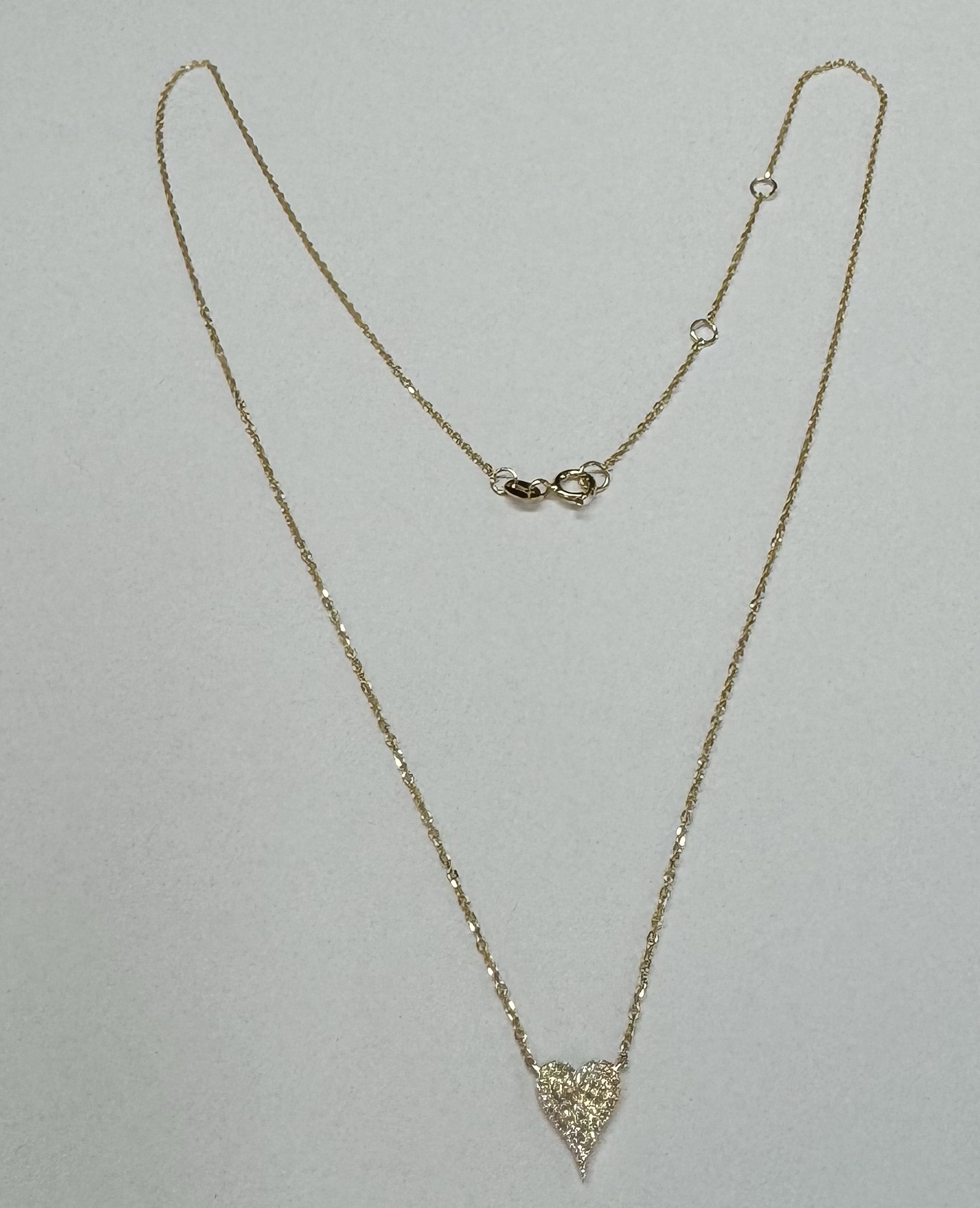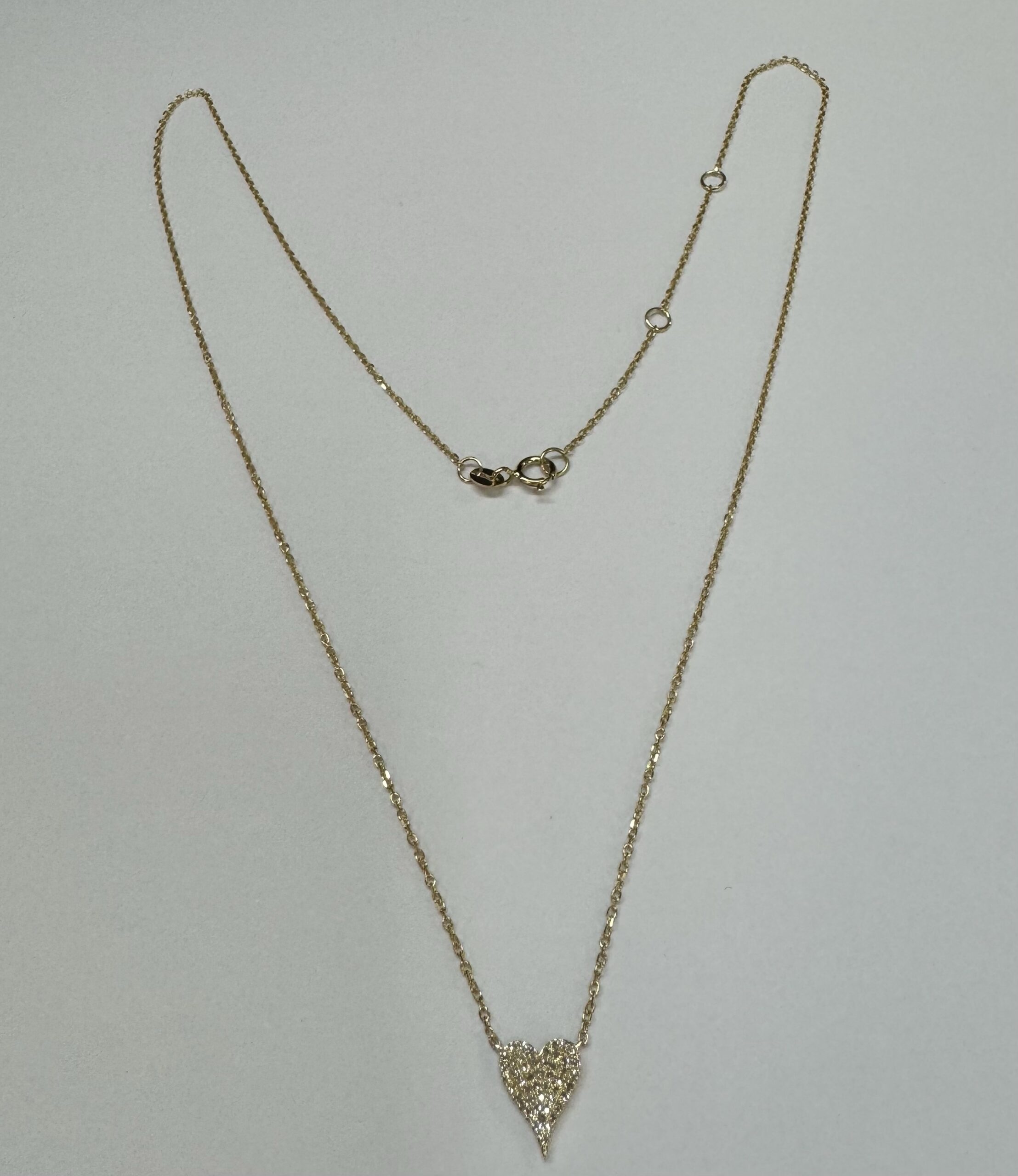 14k yellow gold genuine .10 cttw Round Brilliant Cut diamond pave’ heart pendant, adjustable 16-17-18″. These diamonds average H in color and SI in clarity. This pendant has an entire weight of 1.3 grams.