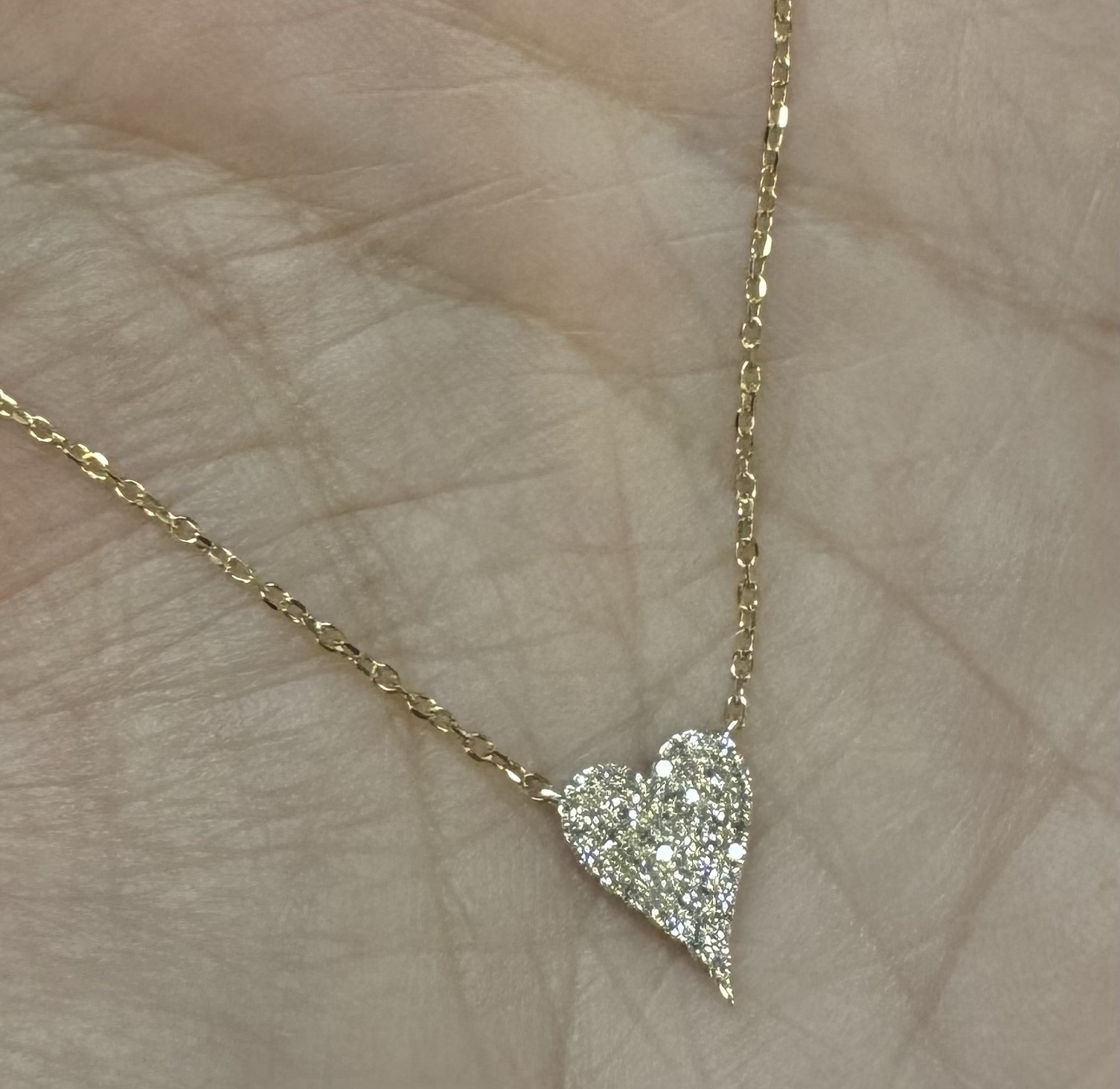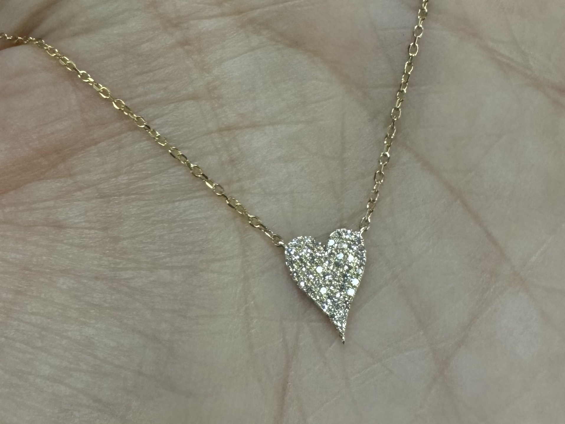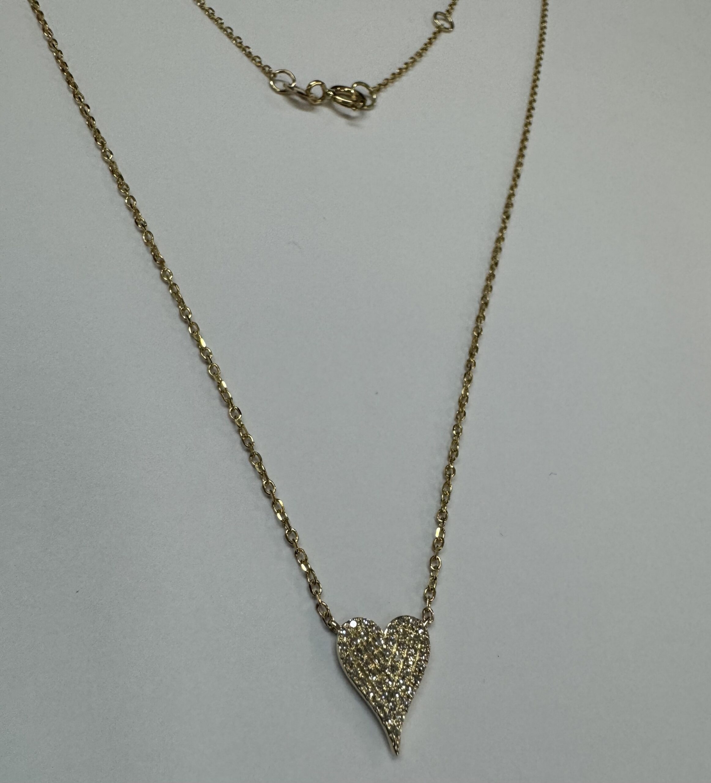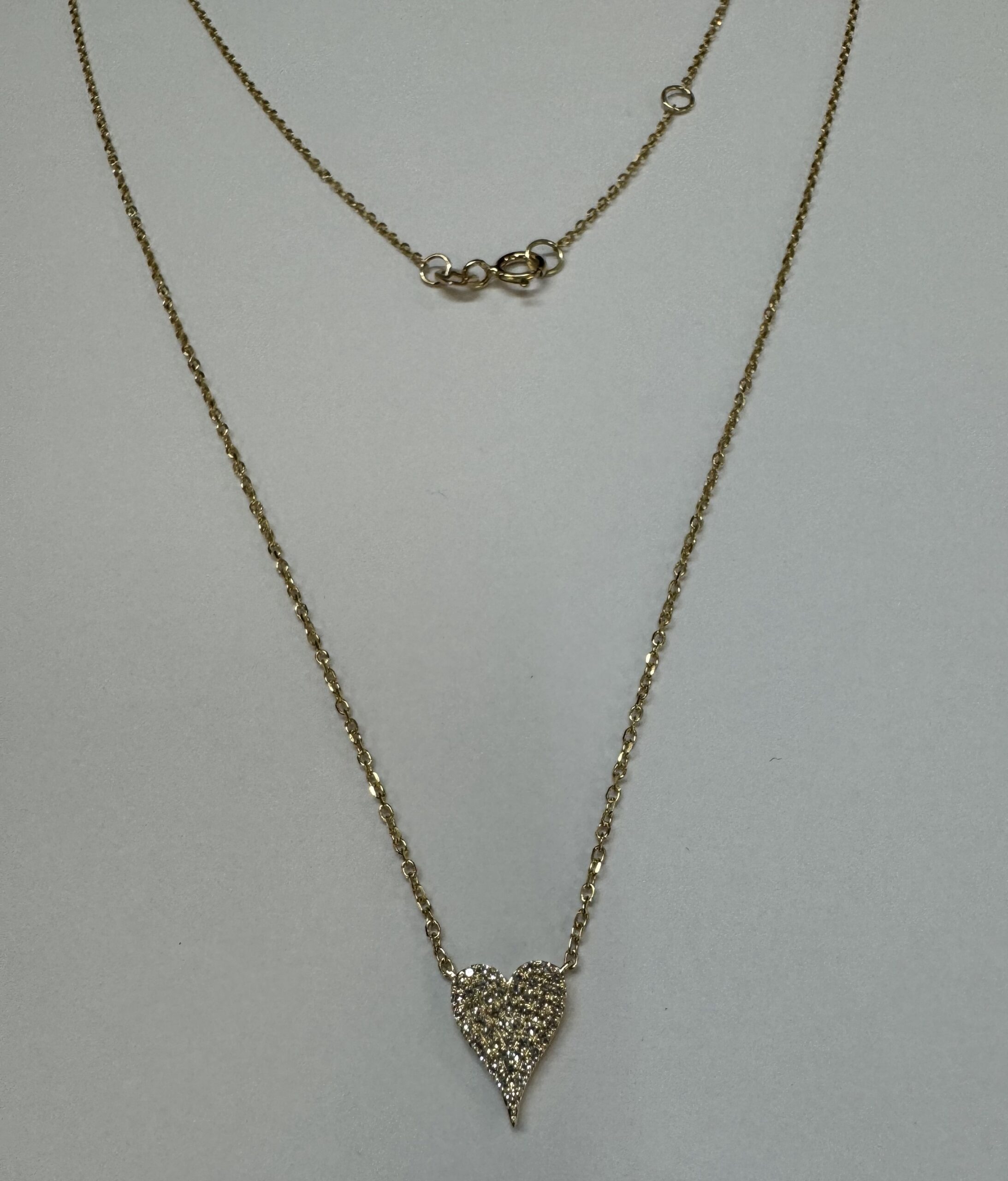 14k yellow gold genuine .10 cttw Round Brilliant Cut diamond pave’ heart pendant, adjustable 16-17-18″. These diamonds average H in color and SI in clarity. This pendant has an entire weight of 1.3 grams.