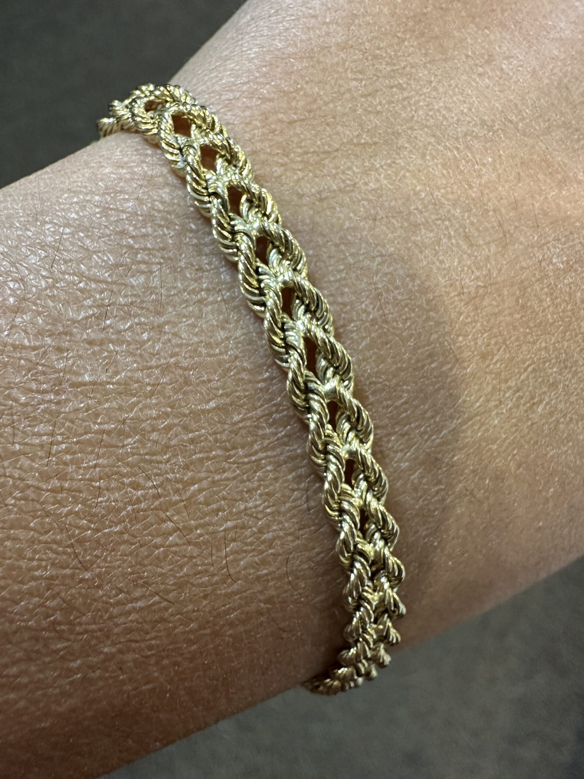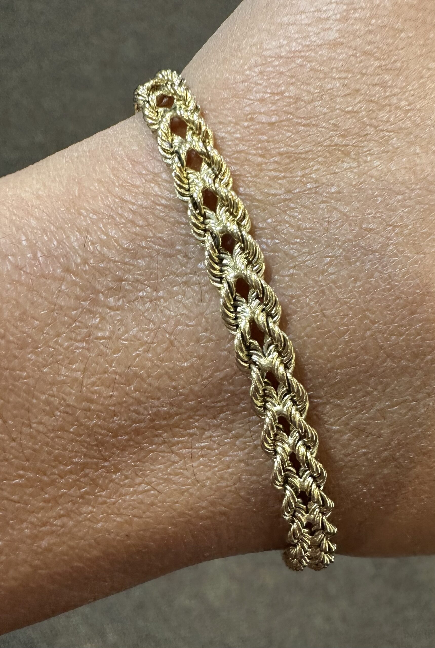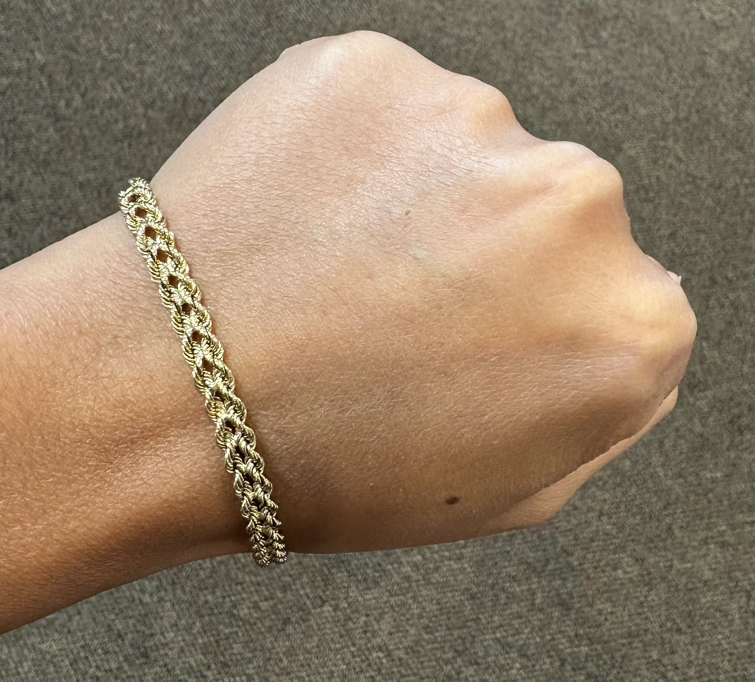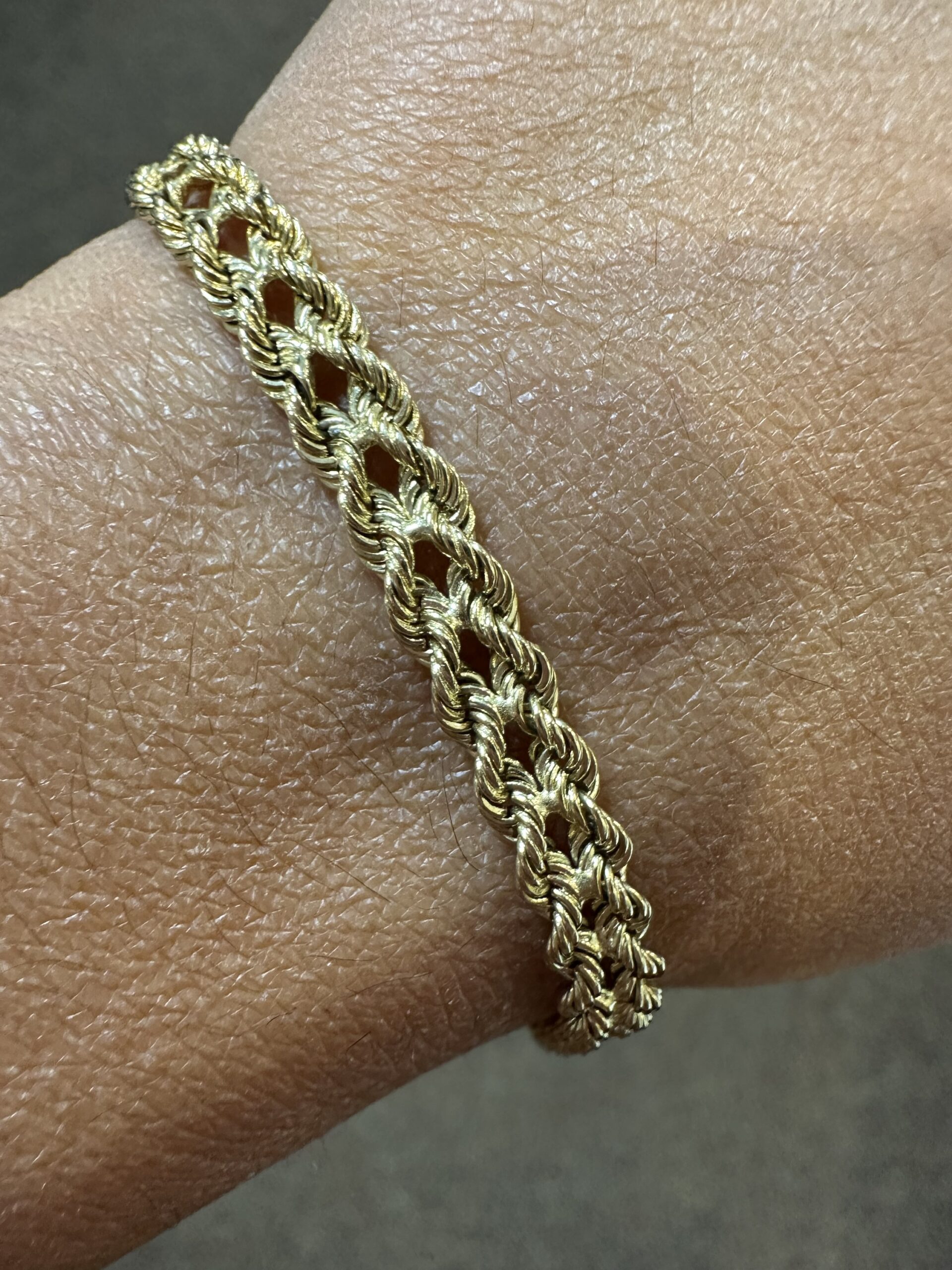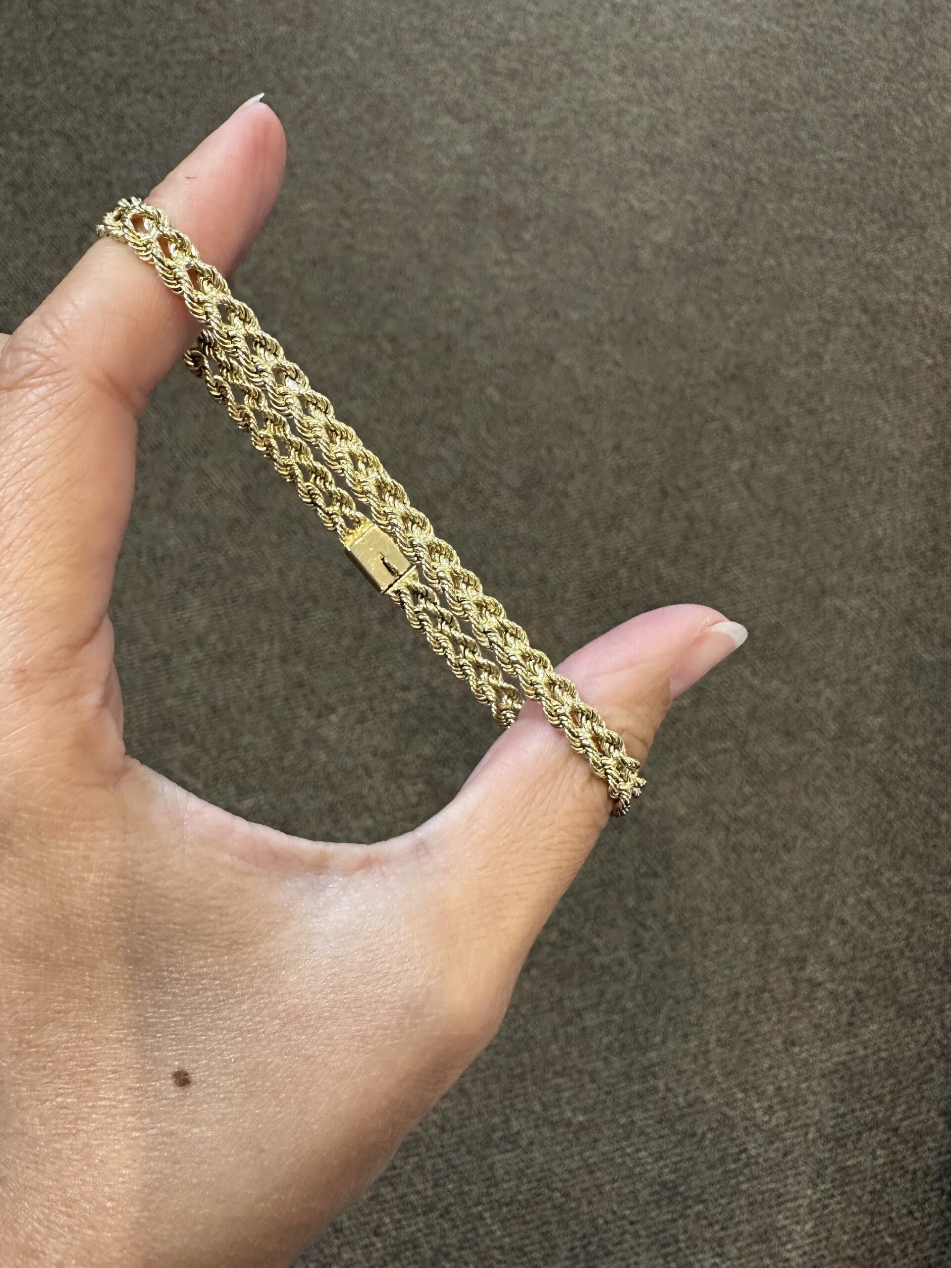 Vintage 14k yellow gold double row rope style bracelet. This bracelet measures 8 1/4″ in length, 5.5 mm in width, and it has an entire weight of 11.8 grams.