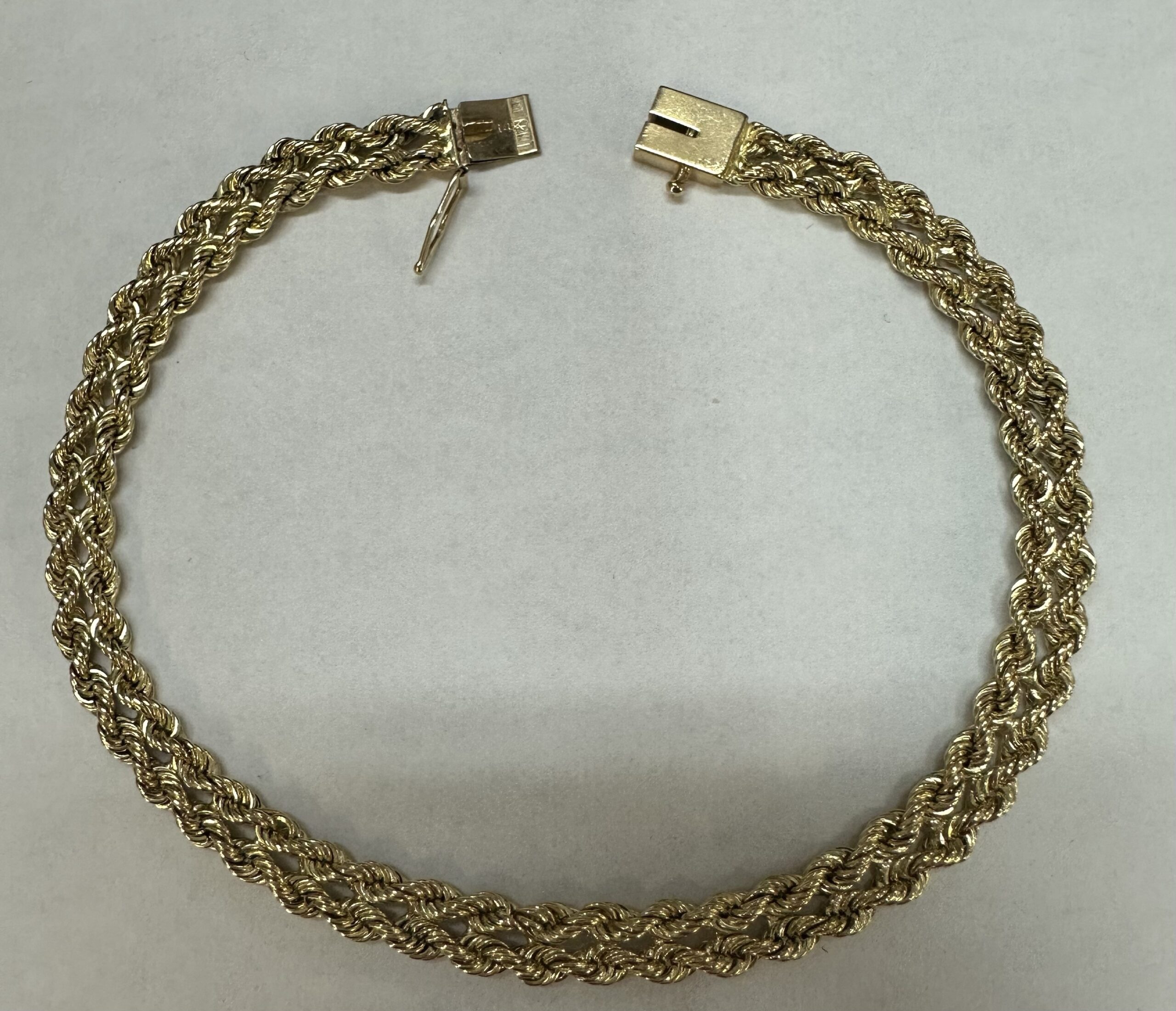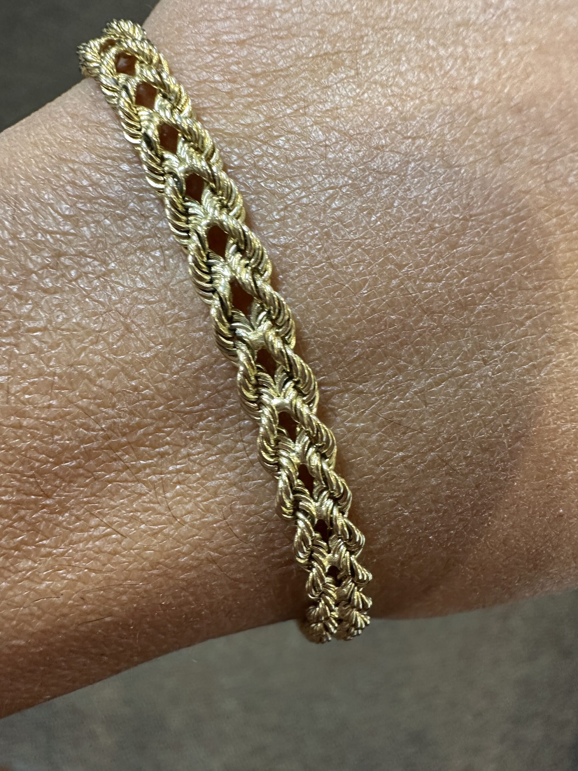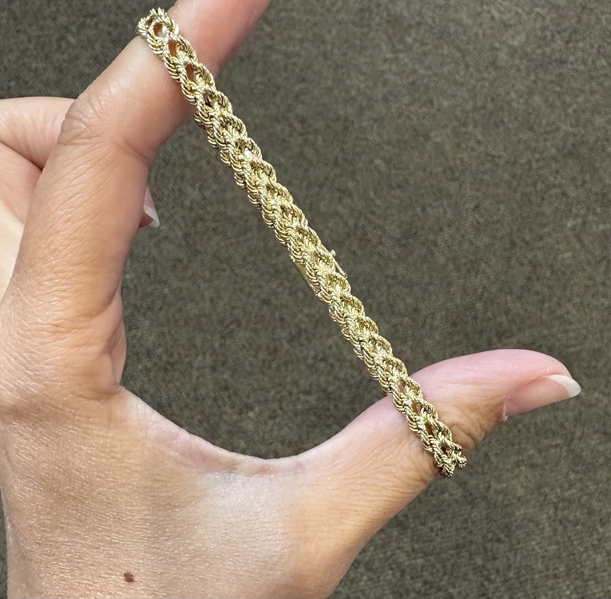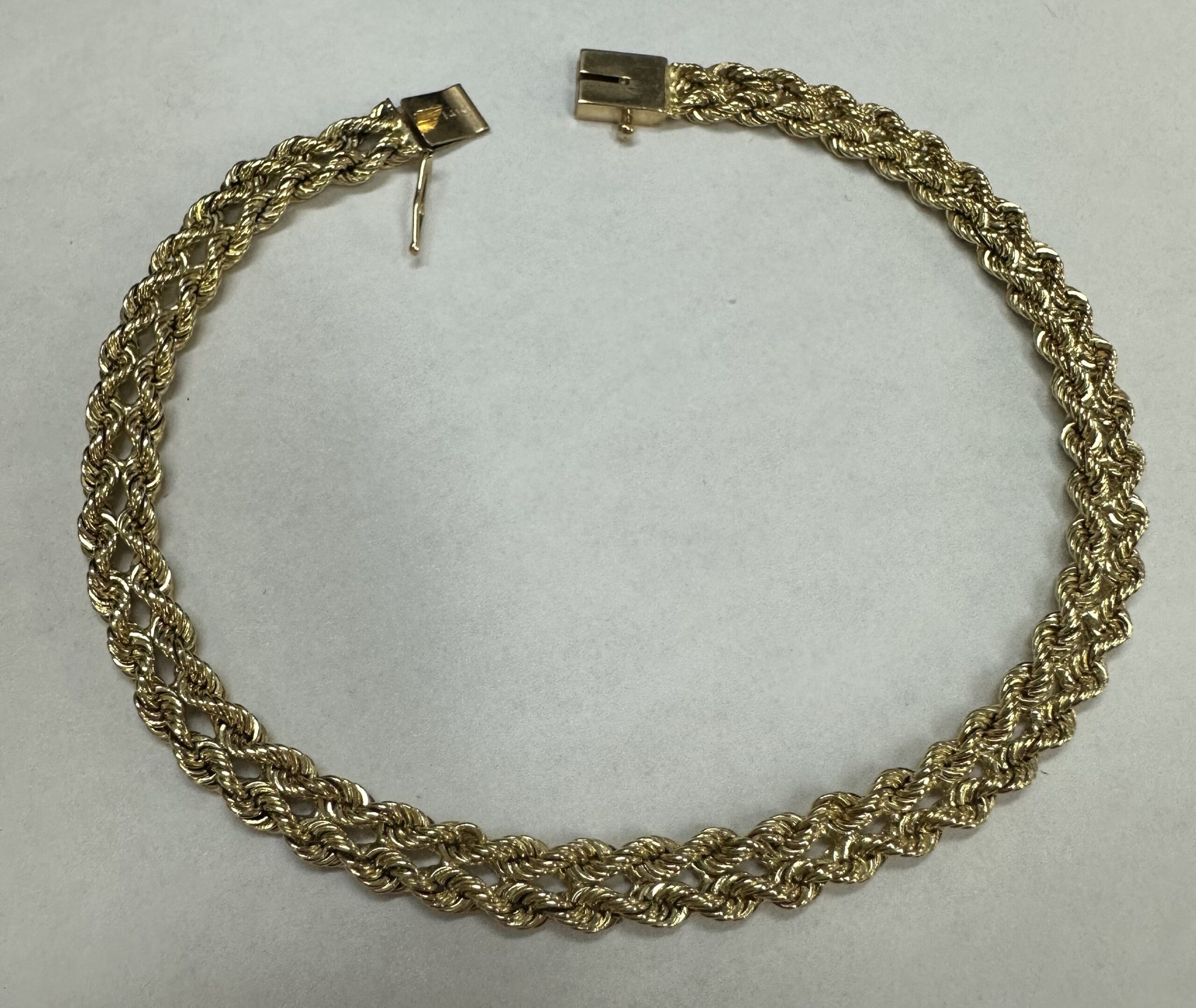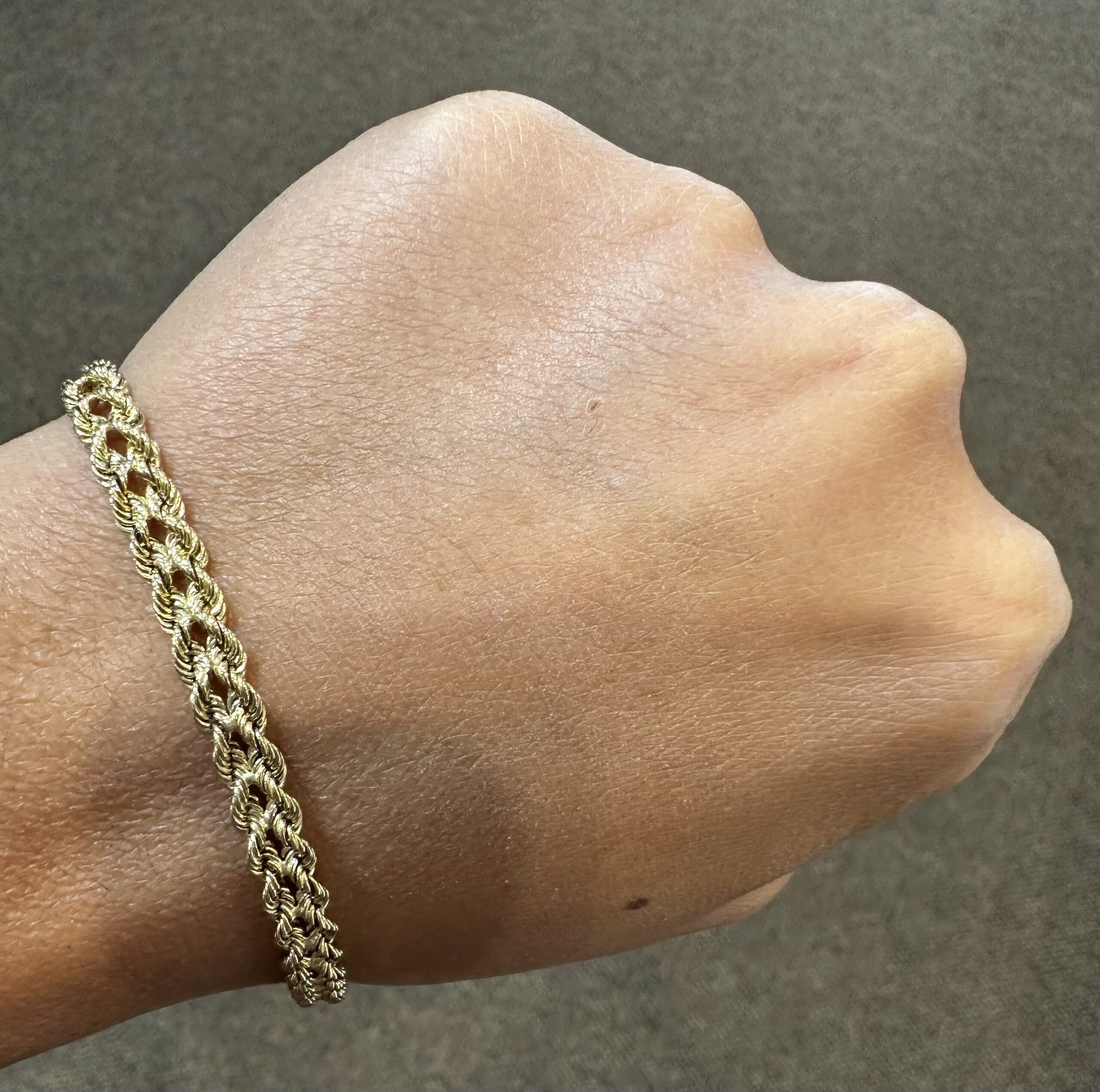 Vintage 14k yellow gold double row rope style bracelet. This bracelet measures 8 1/4″ in length, 5.5 mm in width, and it has an entire weight of 11.8 grams.