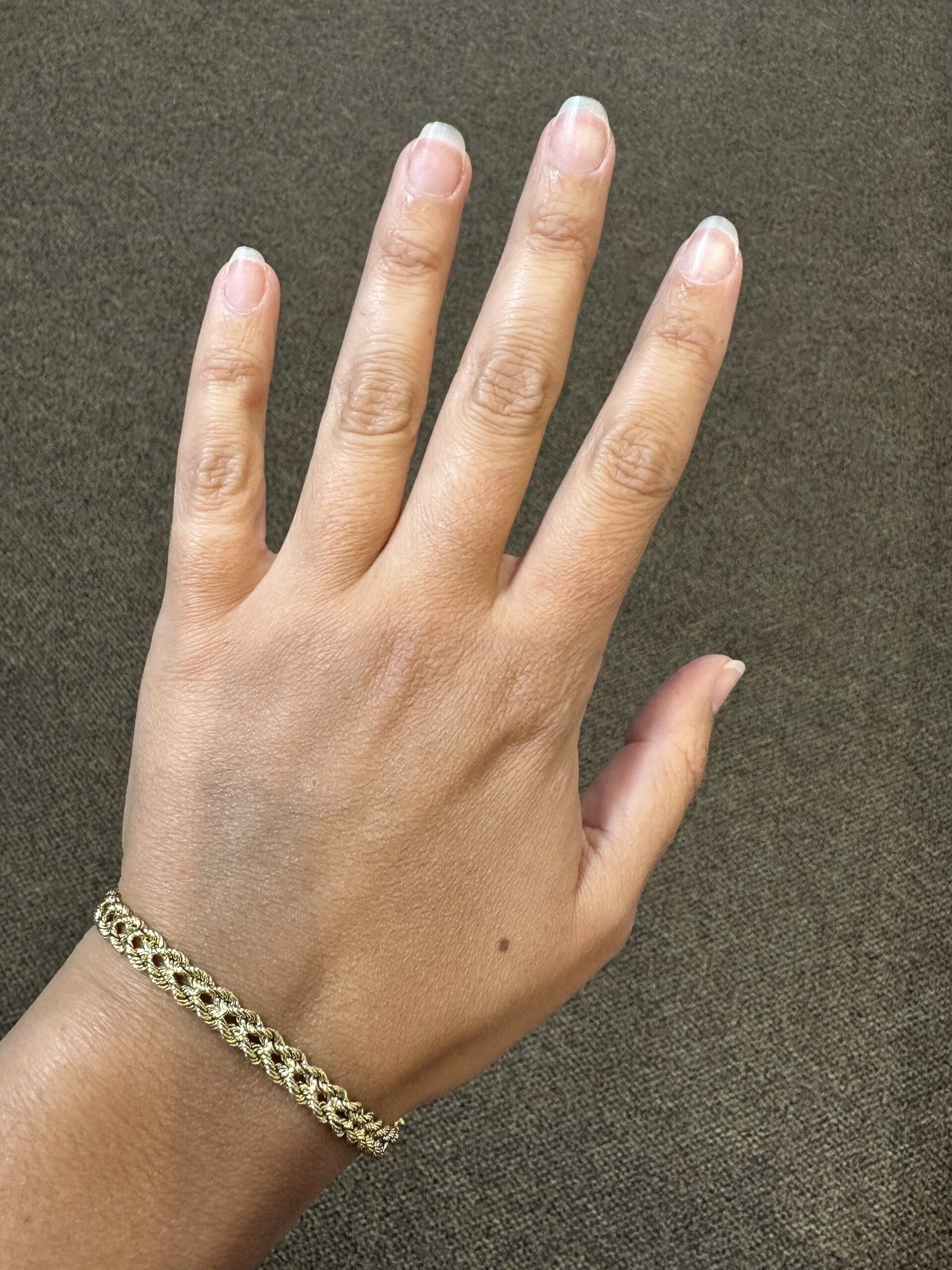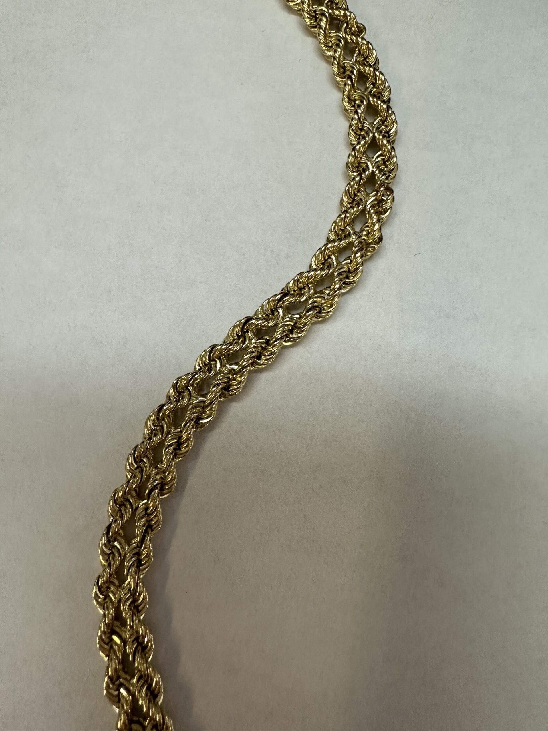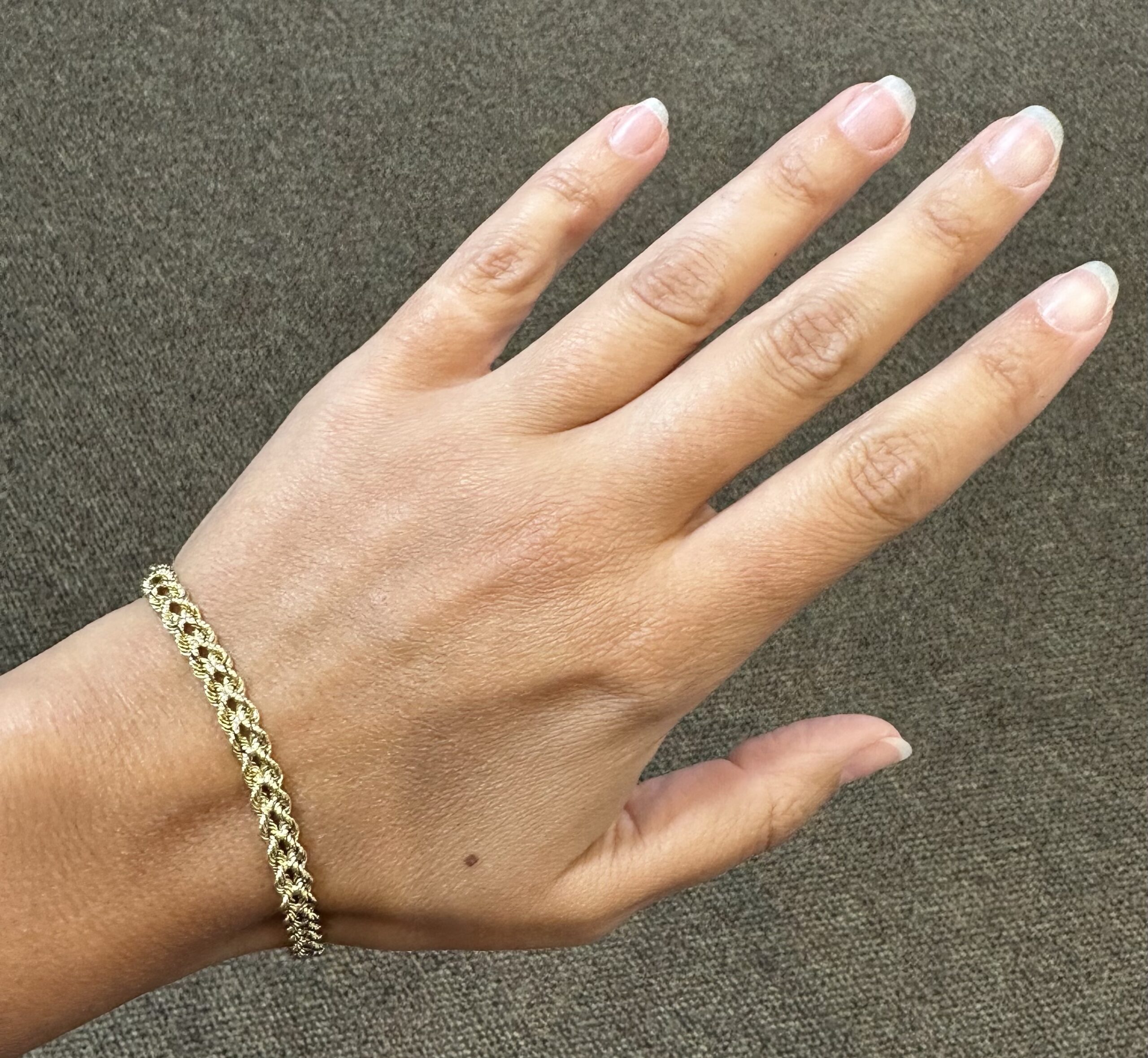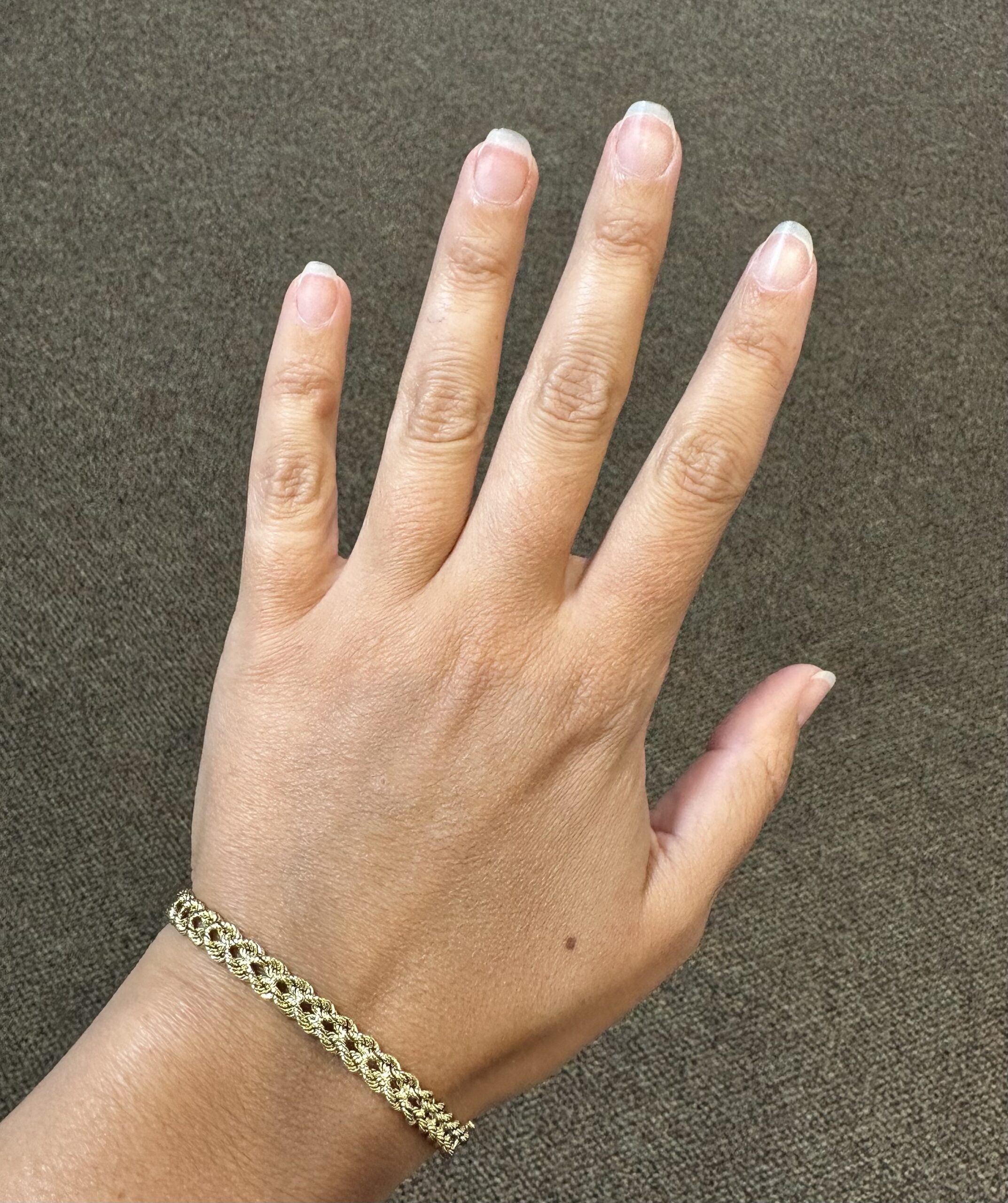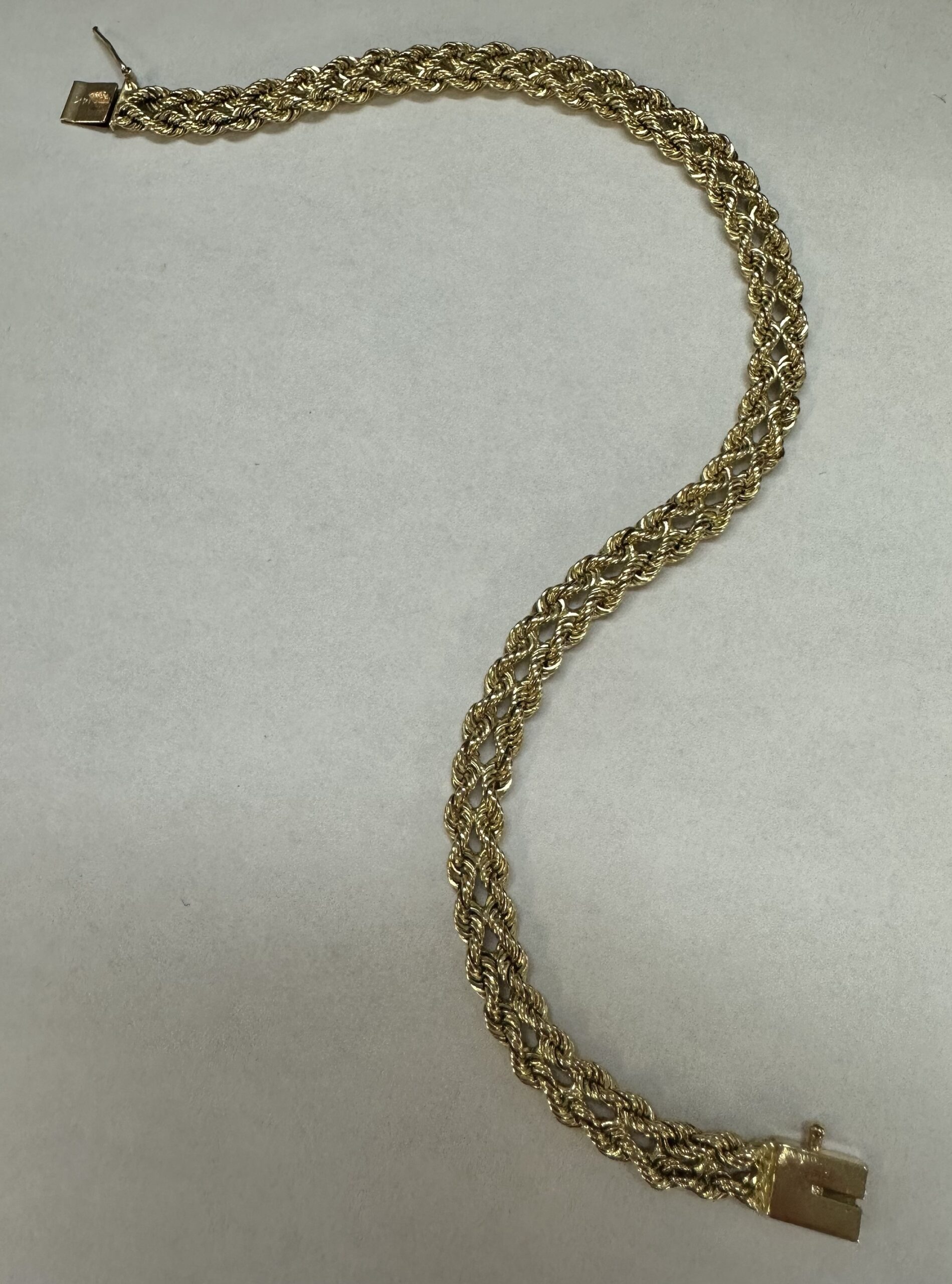Vintage 14k yellow gold double row rope style bracelet. This bracelet measures 8 1/4″ in length, 5.5 mm in width, and it has an entire weight of 11.8 grams.