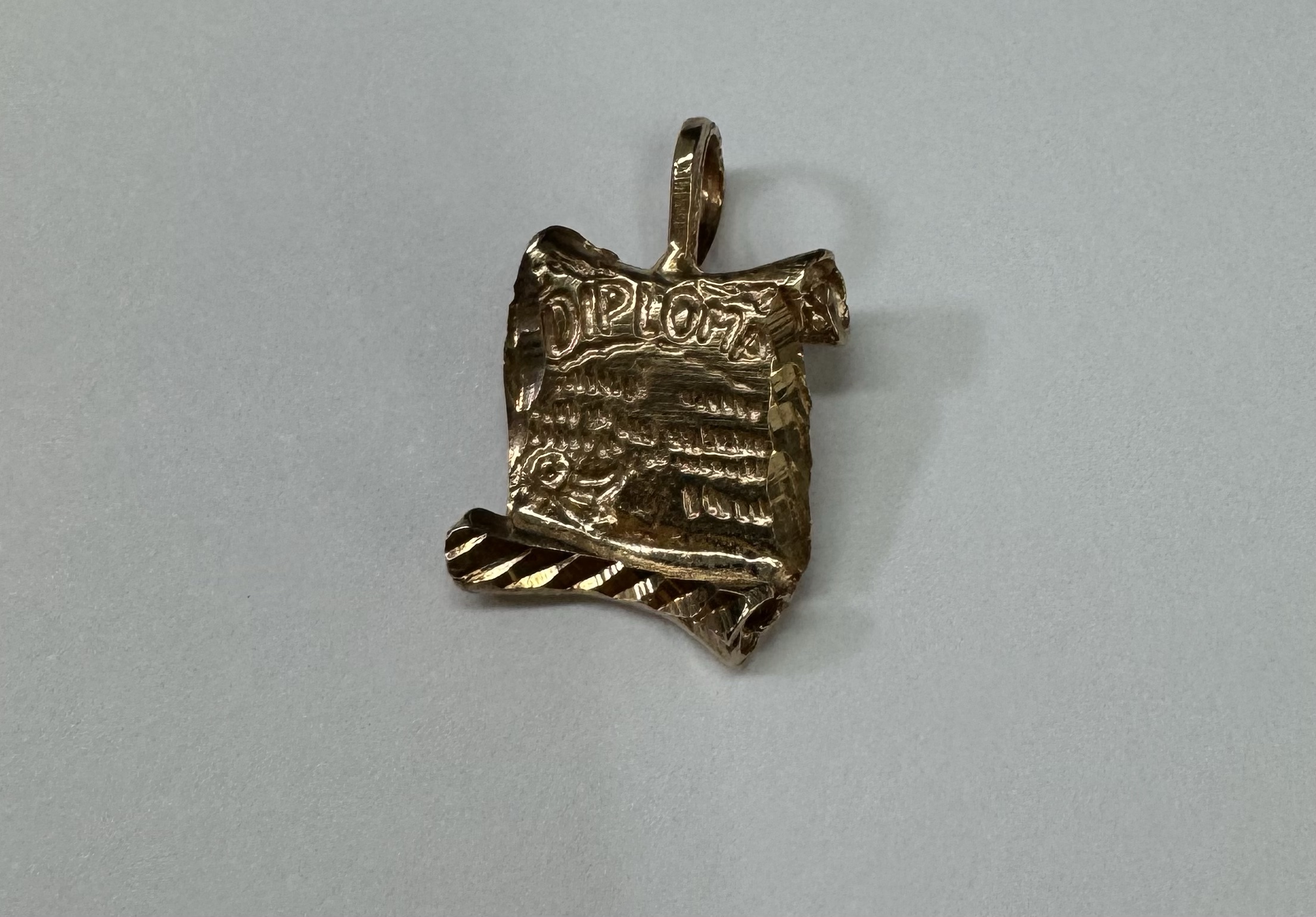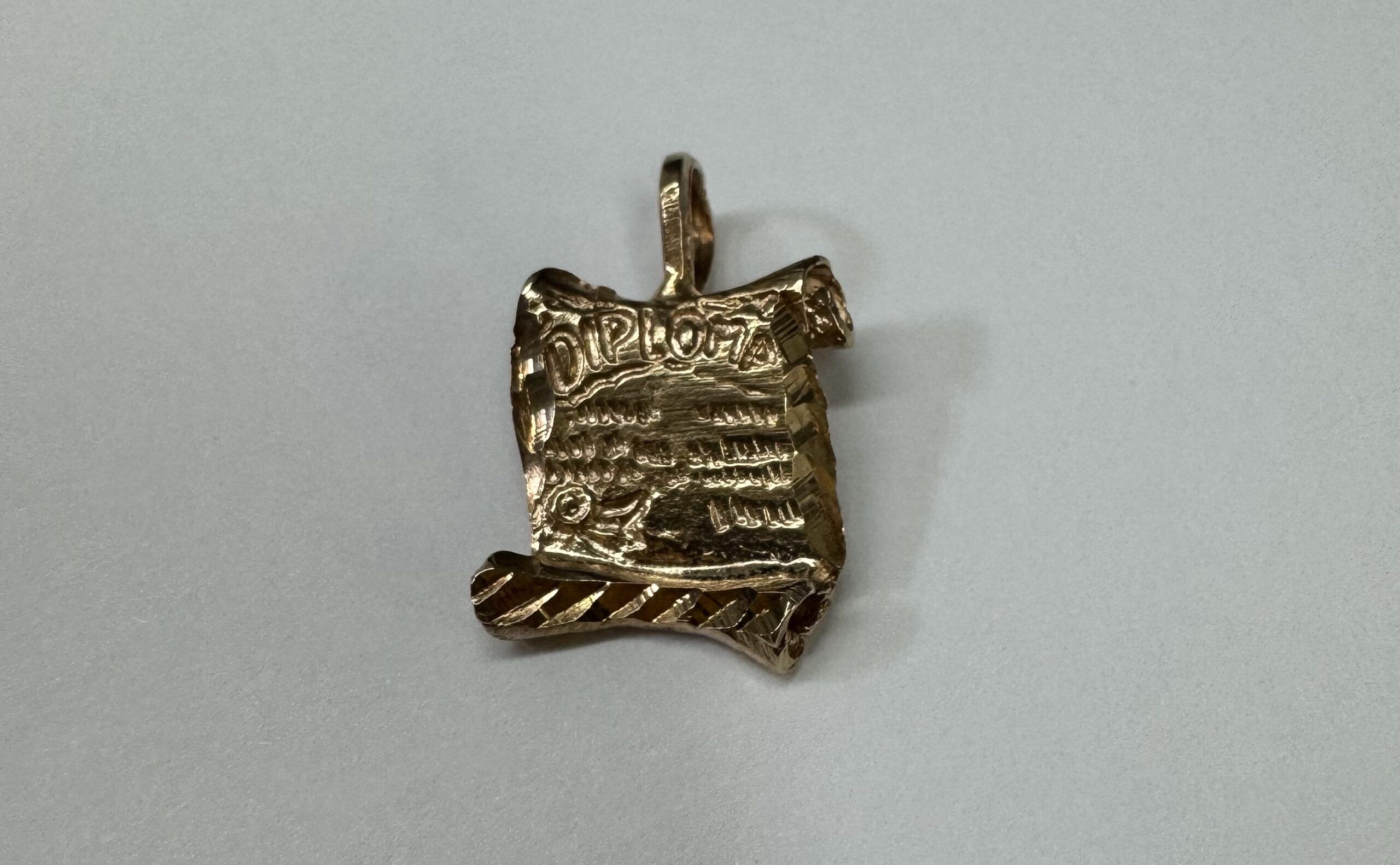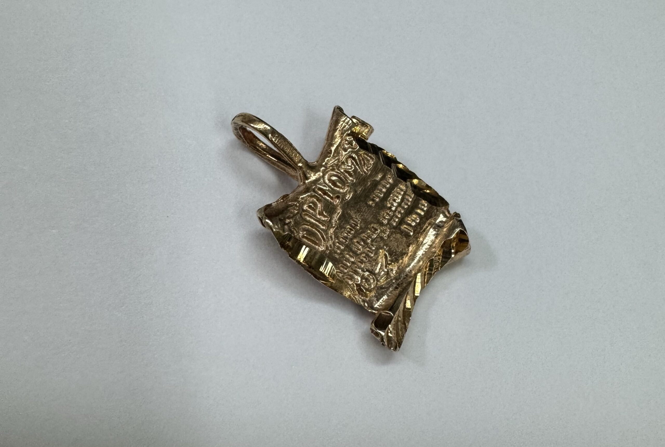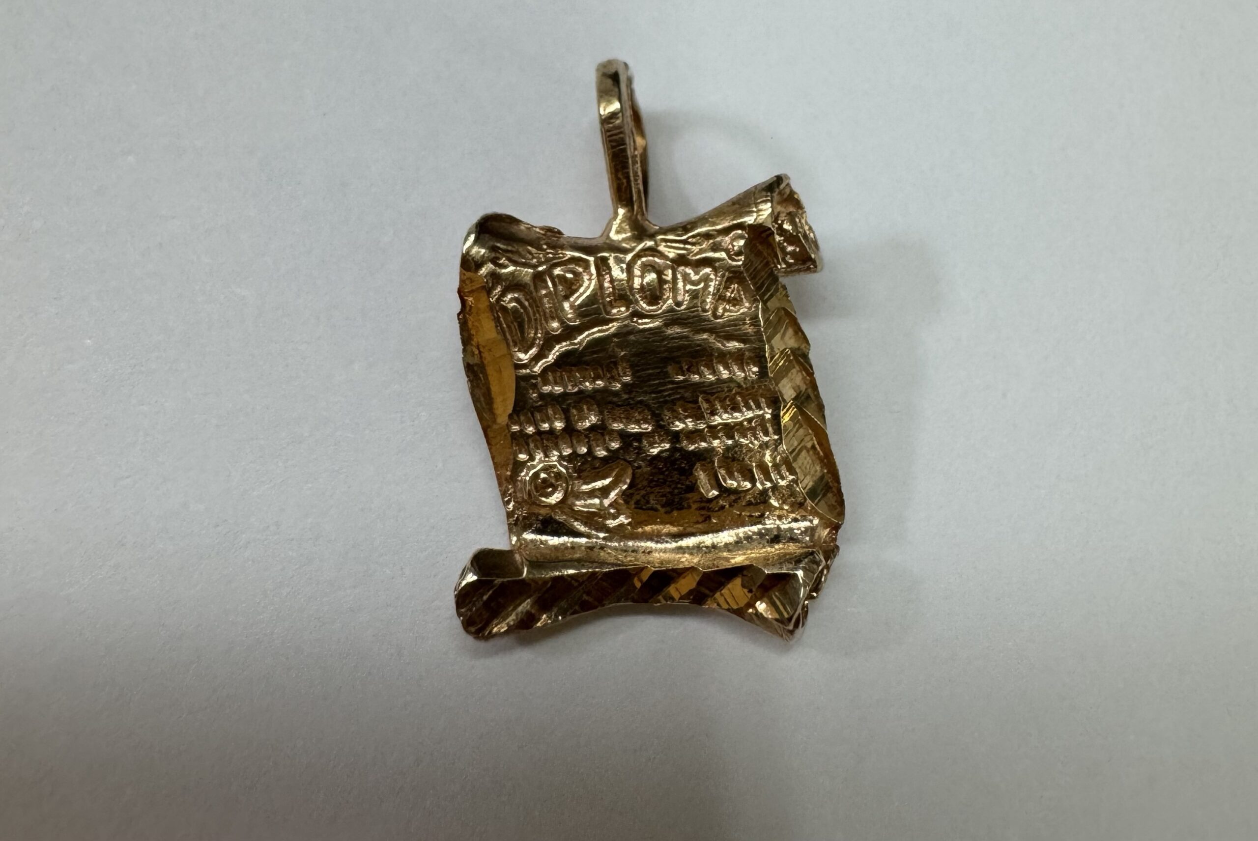 14k yellow gold engraved Diploma charm/pendant. This piece has an entire weight of 1.6 grams.