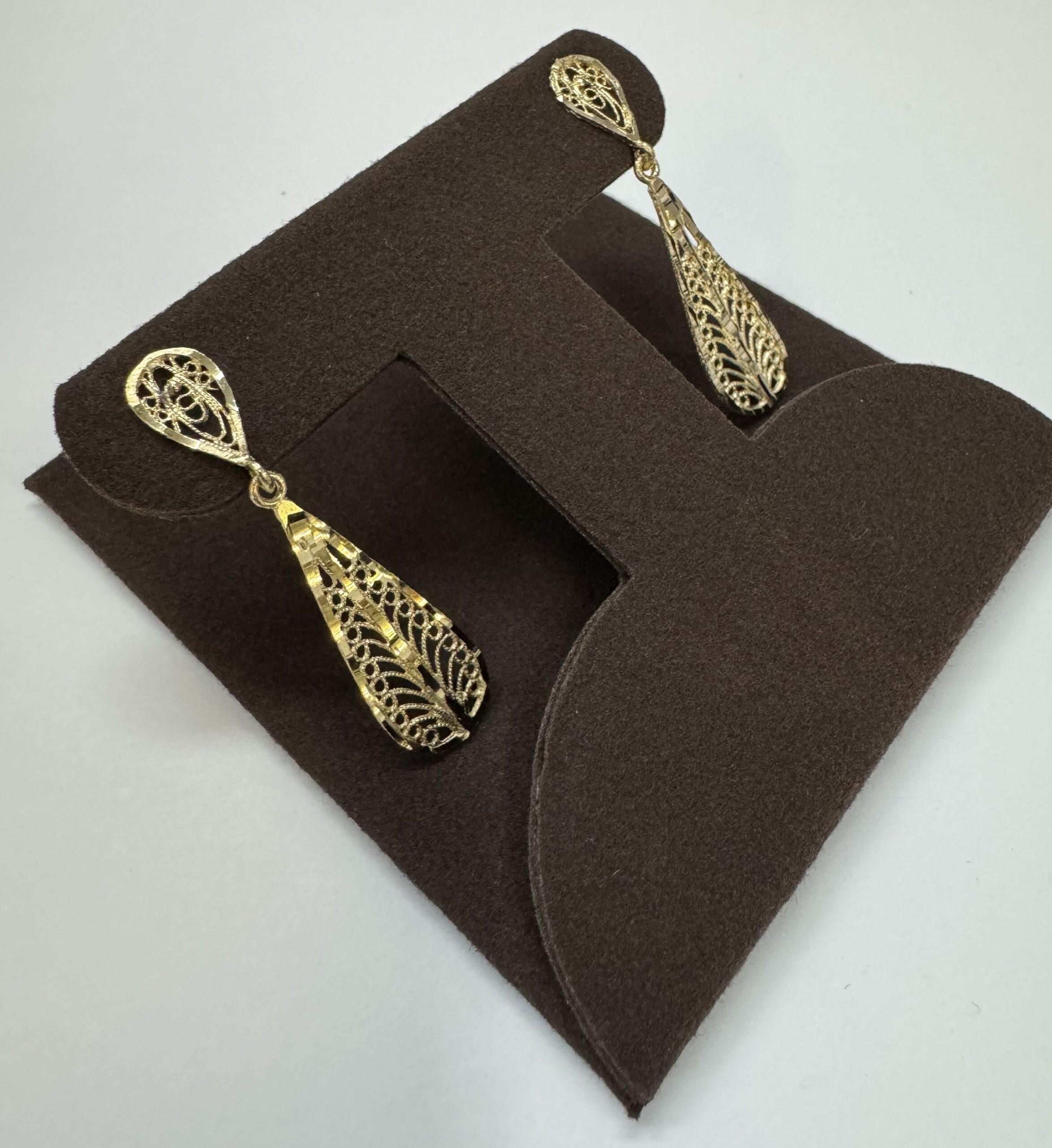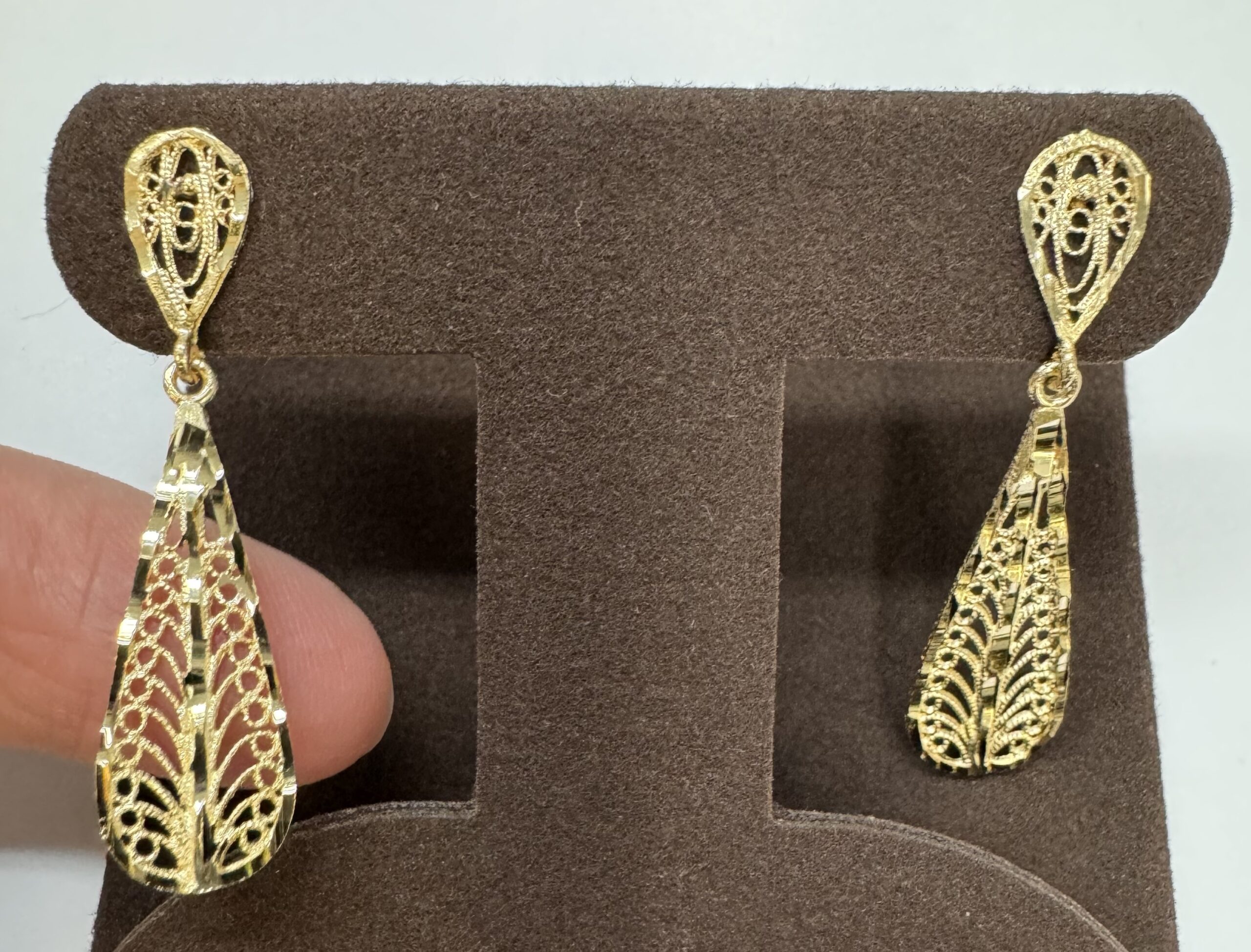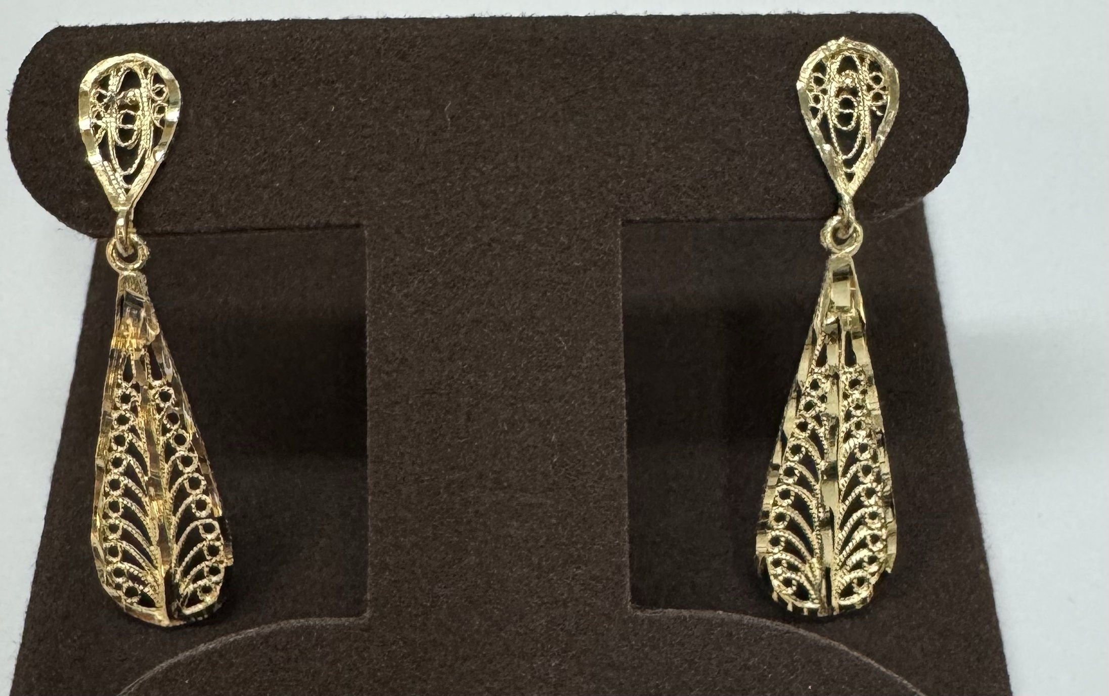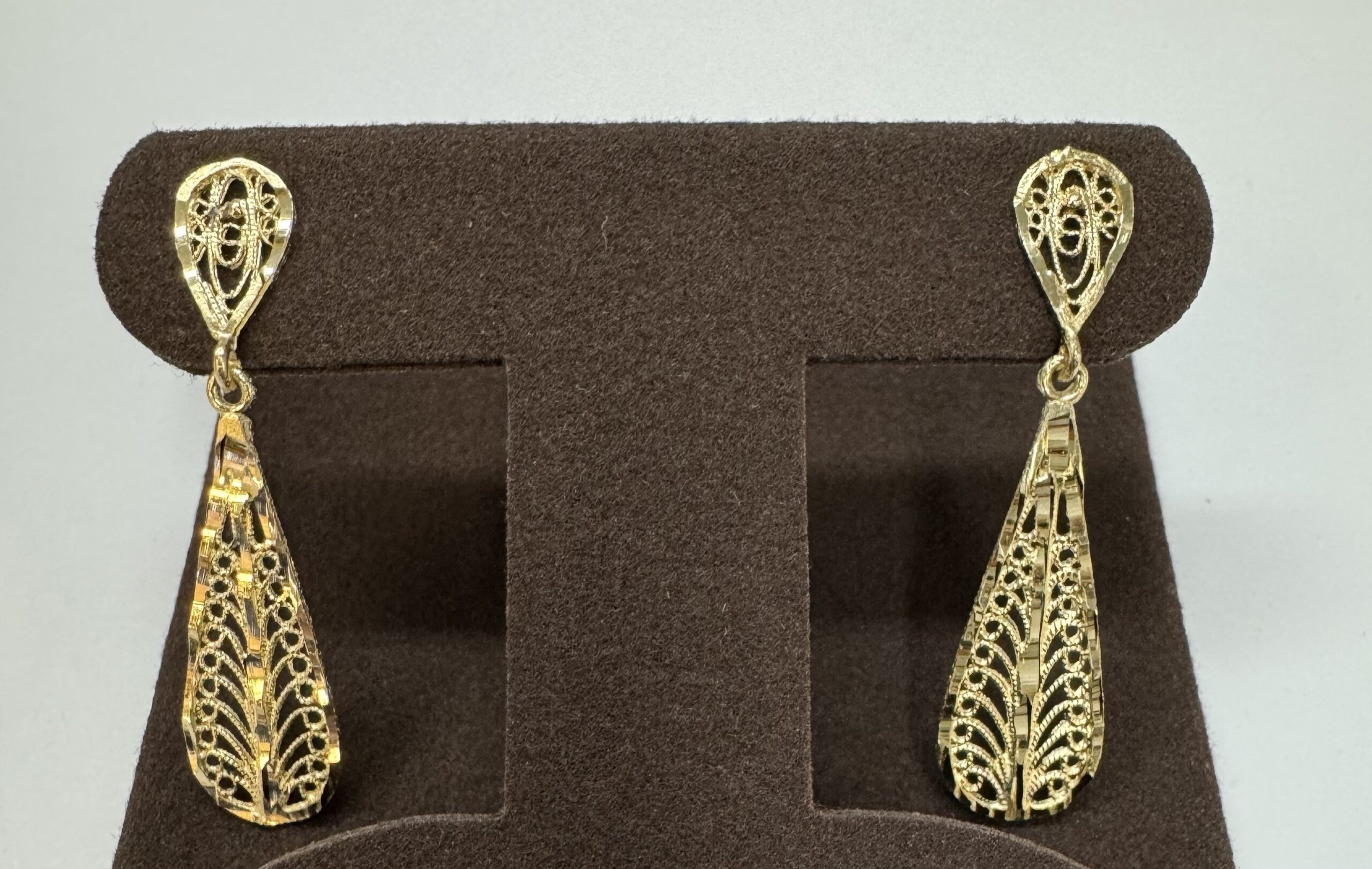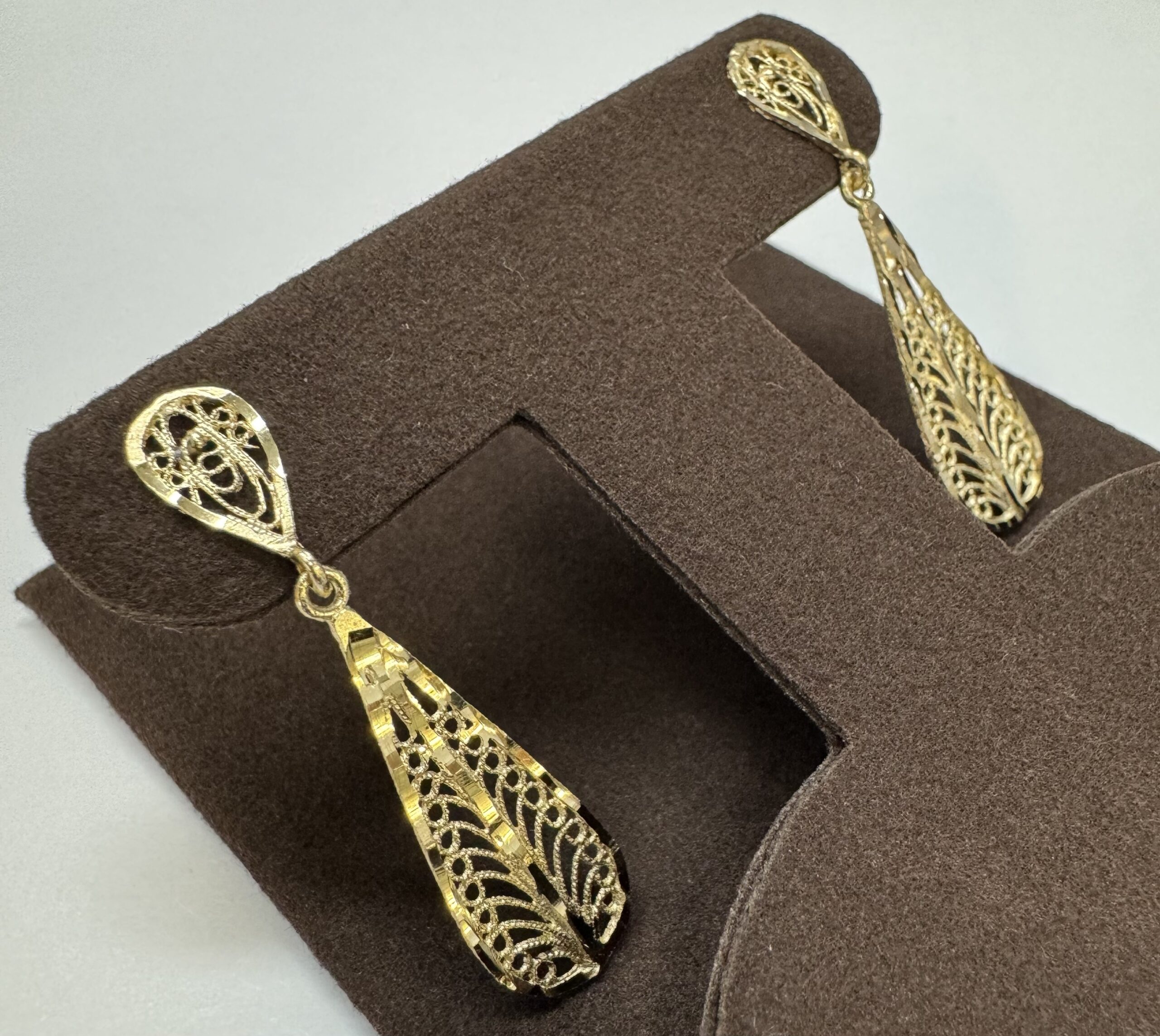 Vintage 14k yellow gold teardrop shaped filigree dangle stud earrings. These earrings dangle 1.5″ in total length, and they have an entire weight of 2.4 grams. Only one pair like these available!
