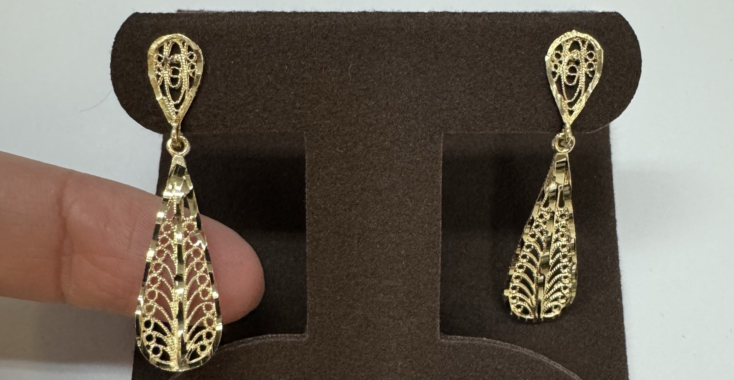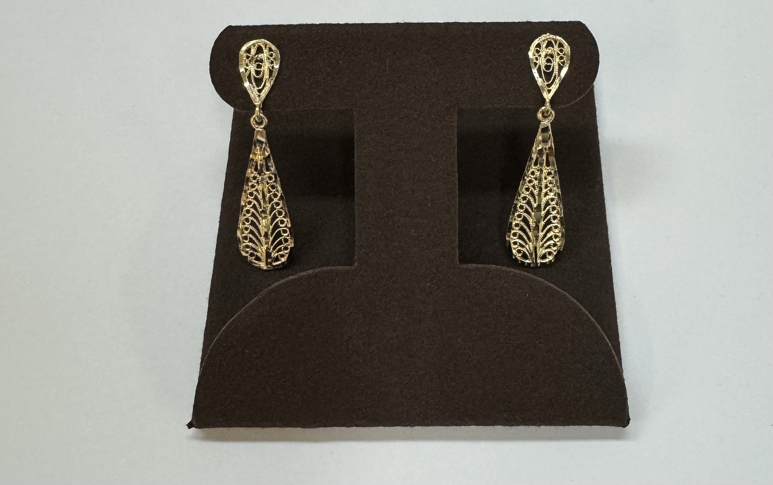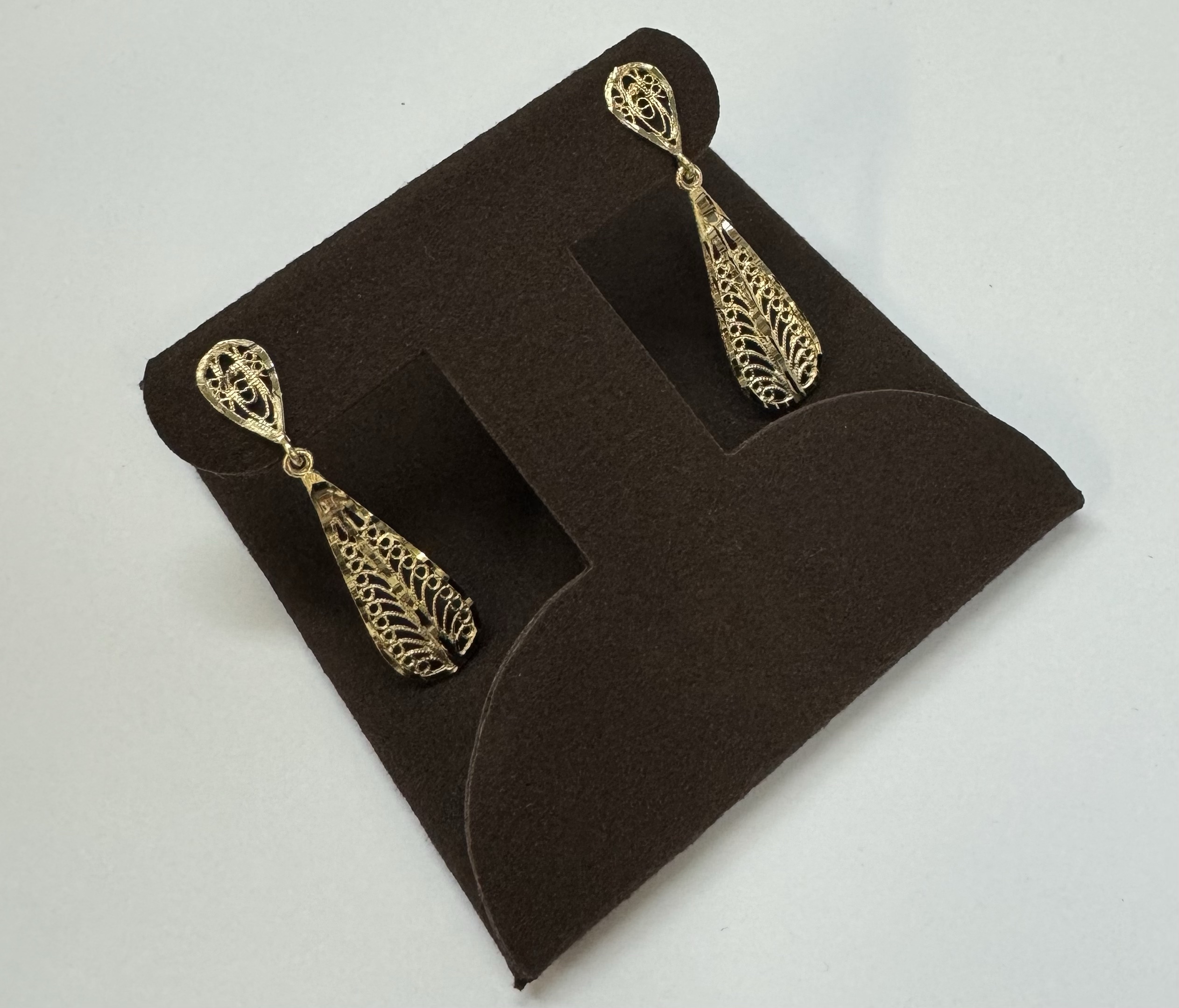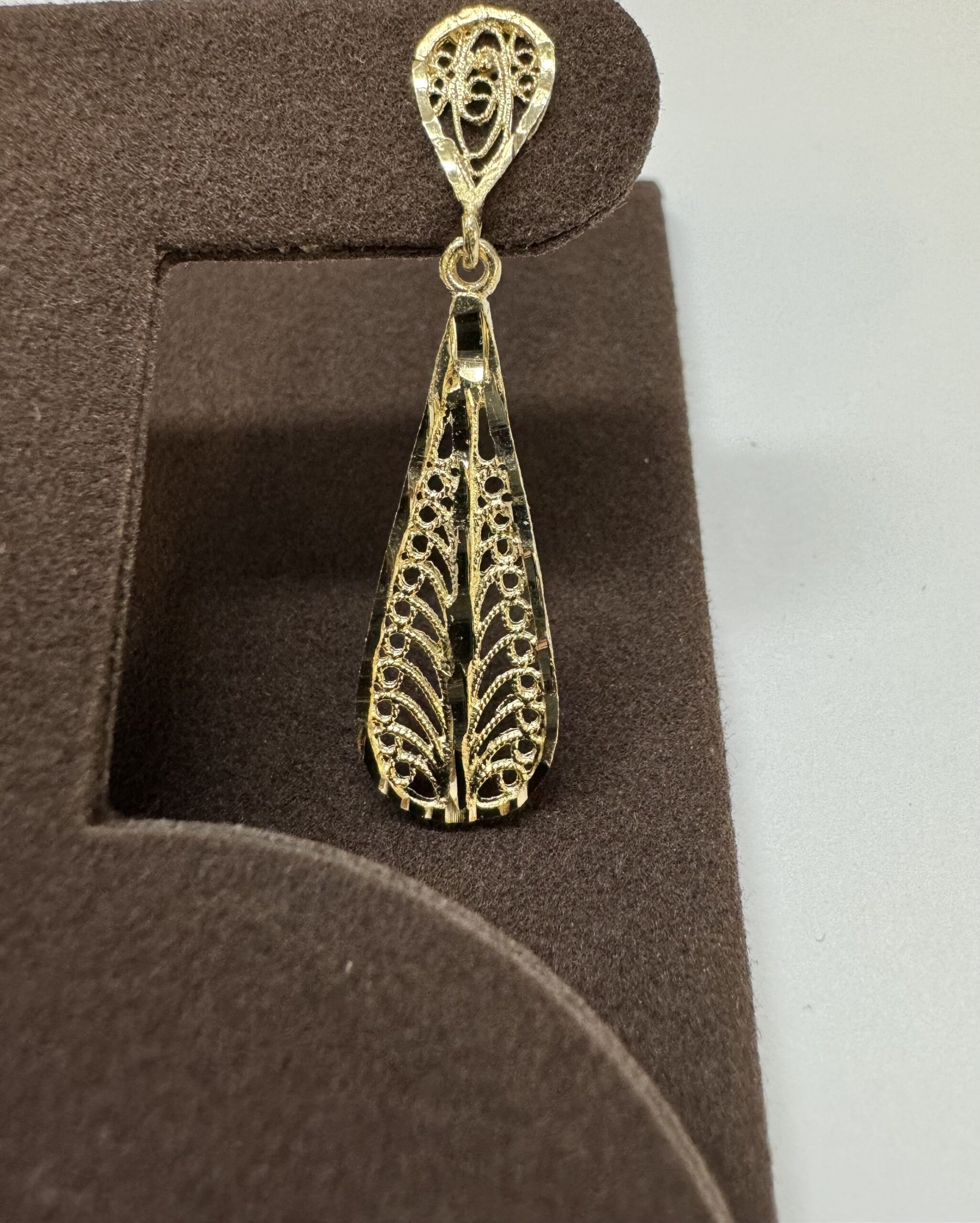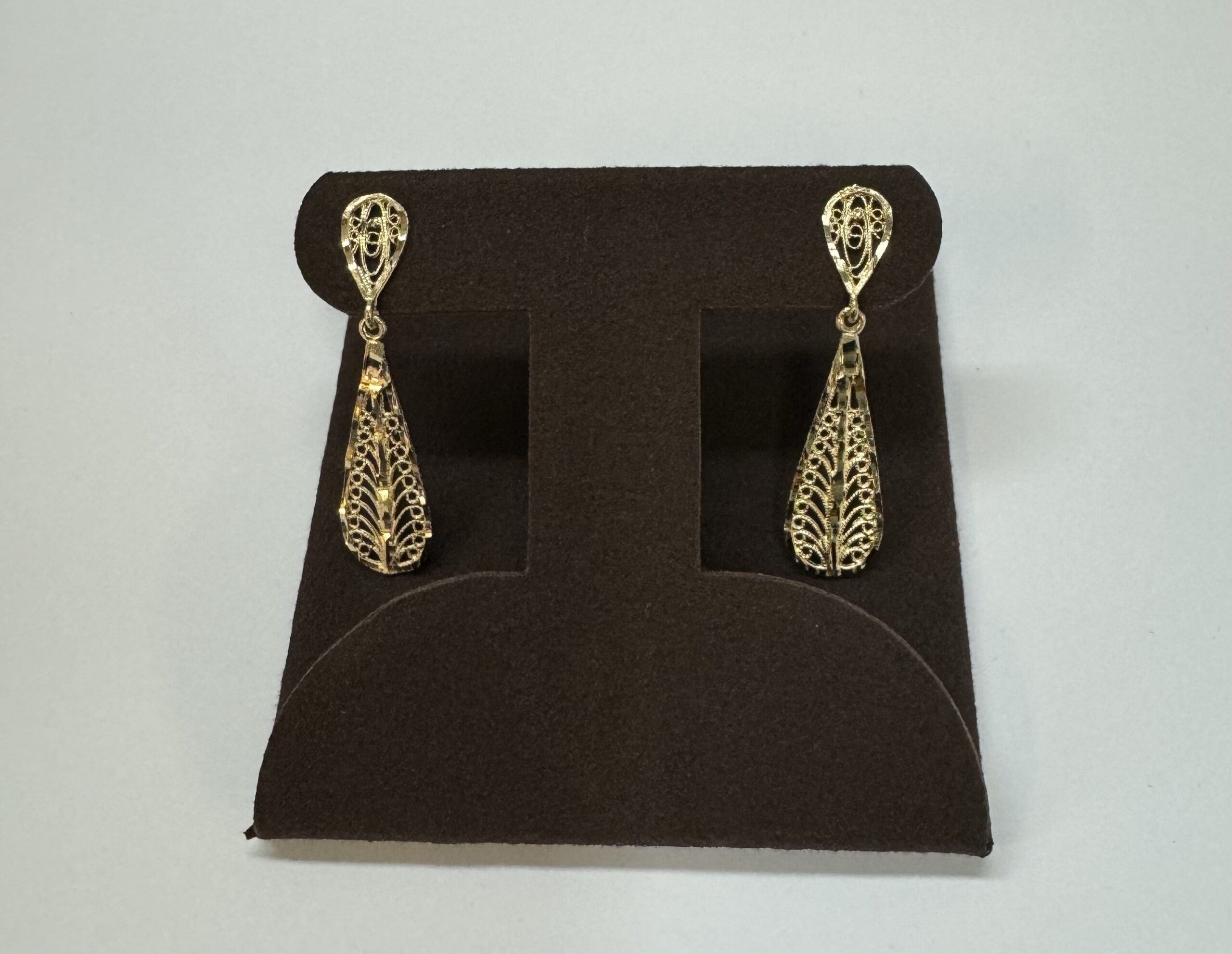 Vintage 14k yellow gold teardrop shaped filigree dangle stud earrings. These earrings dangle 1.5″ in total length, and they have an entire weight of 2.4 grams. Only one pair like these available!