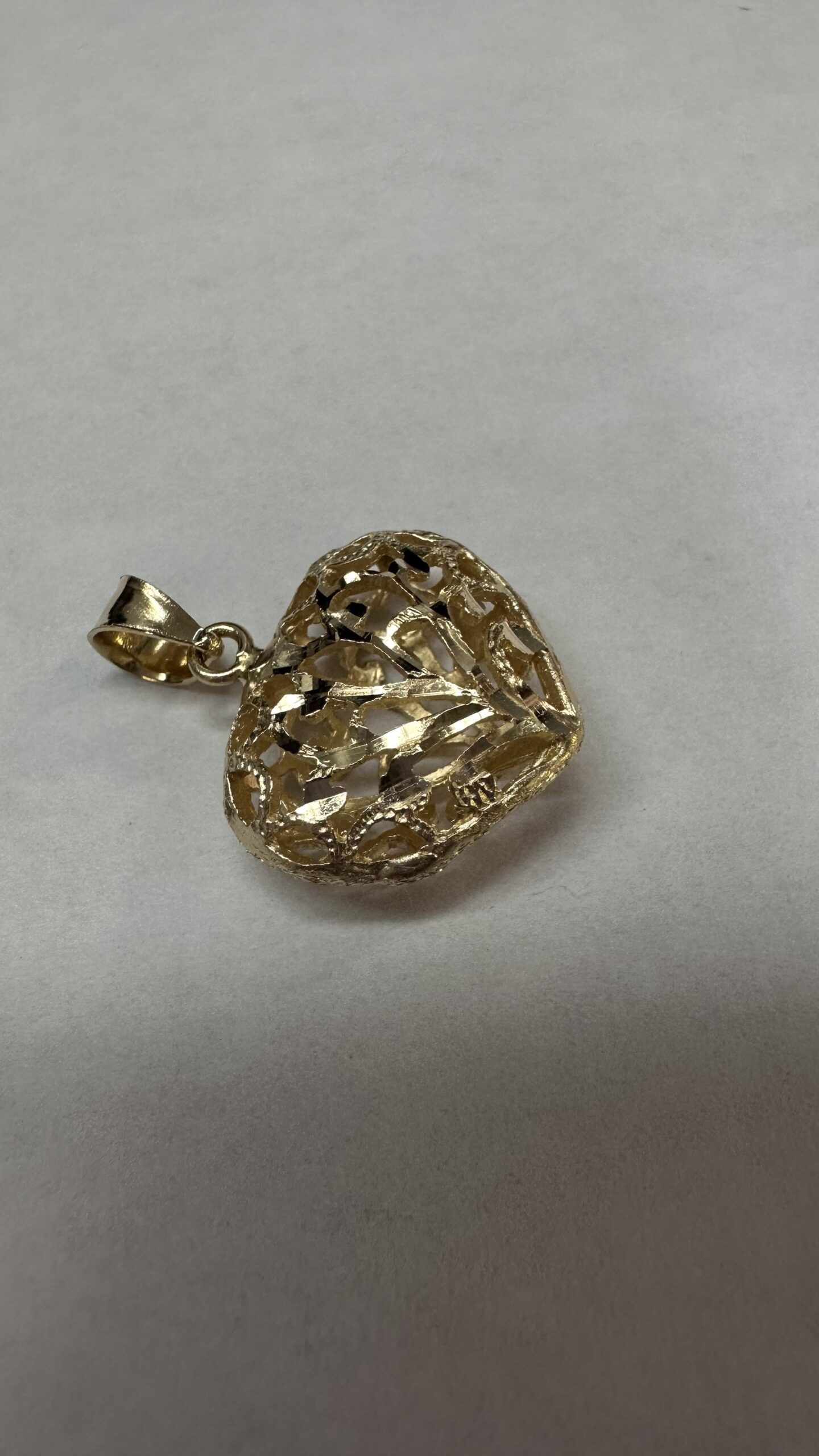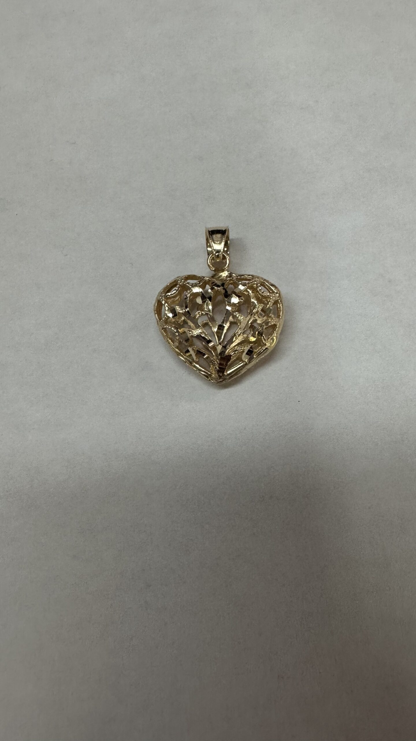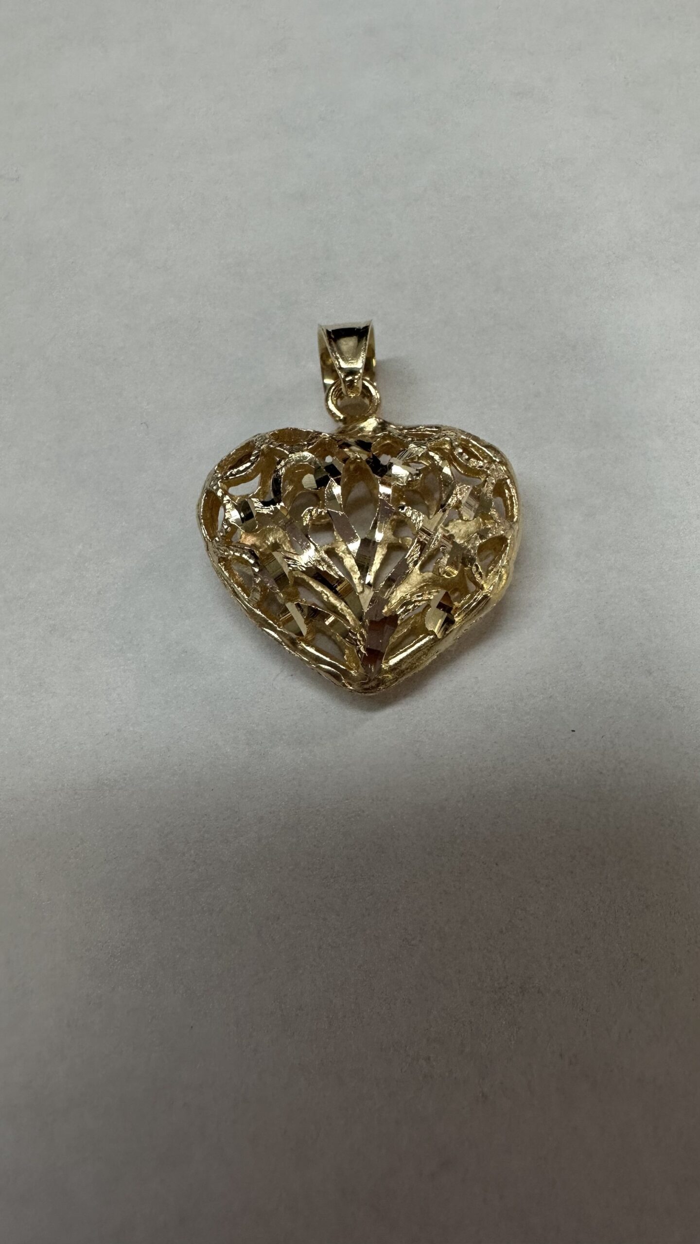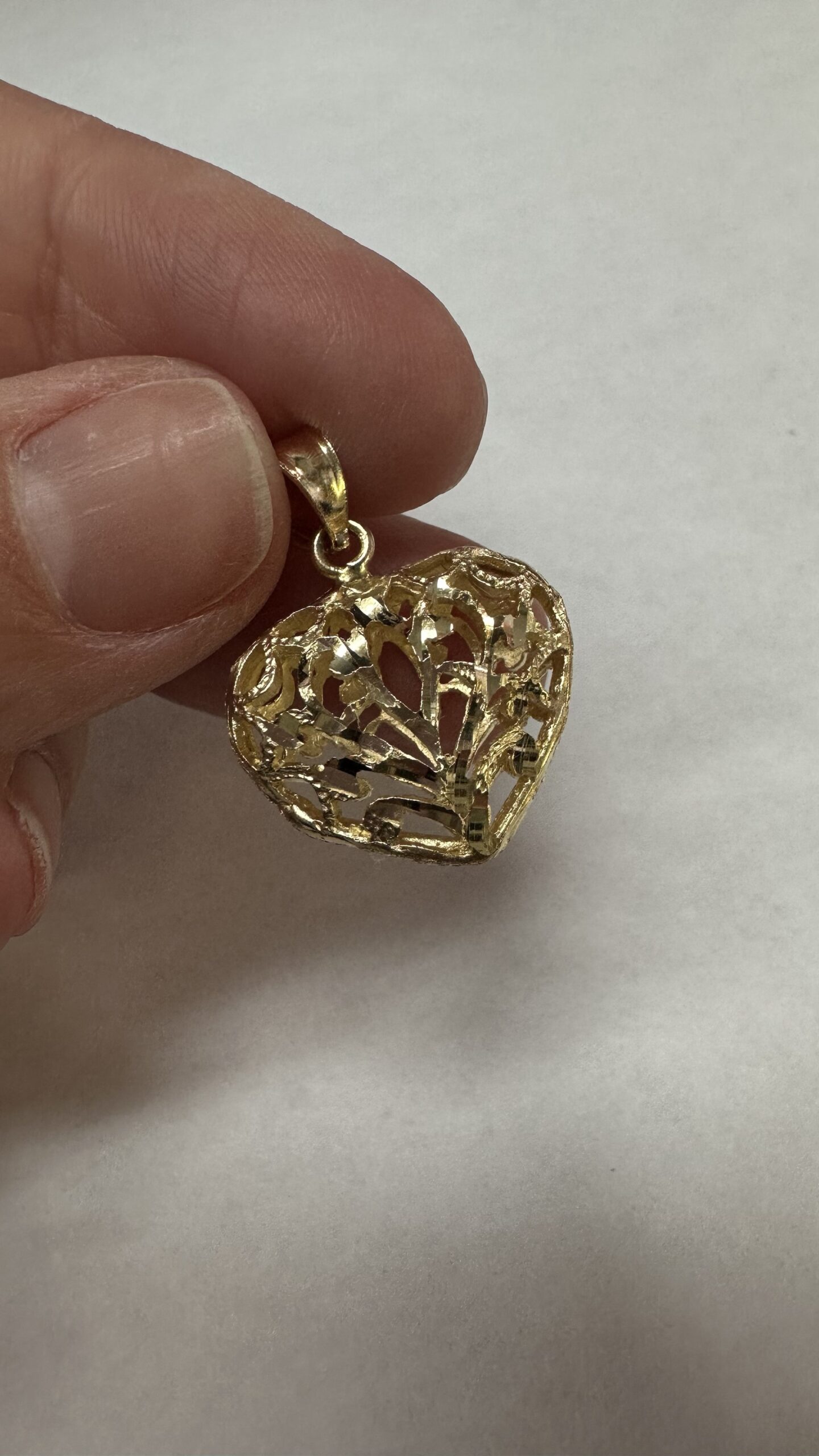 14k yellow gold filigree heart pendant. This pendant measures 14 x 18.5 mm in size, and it has an entire weight of 2.7 grams.