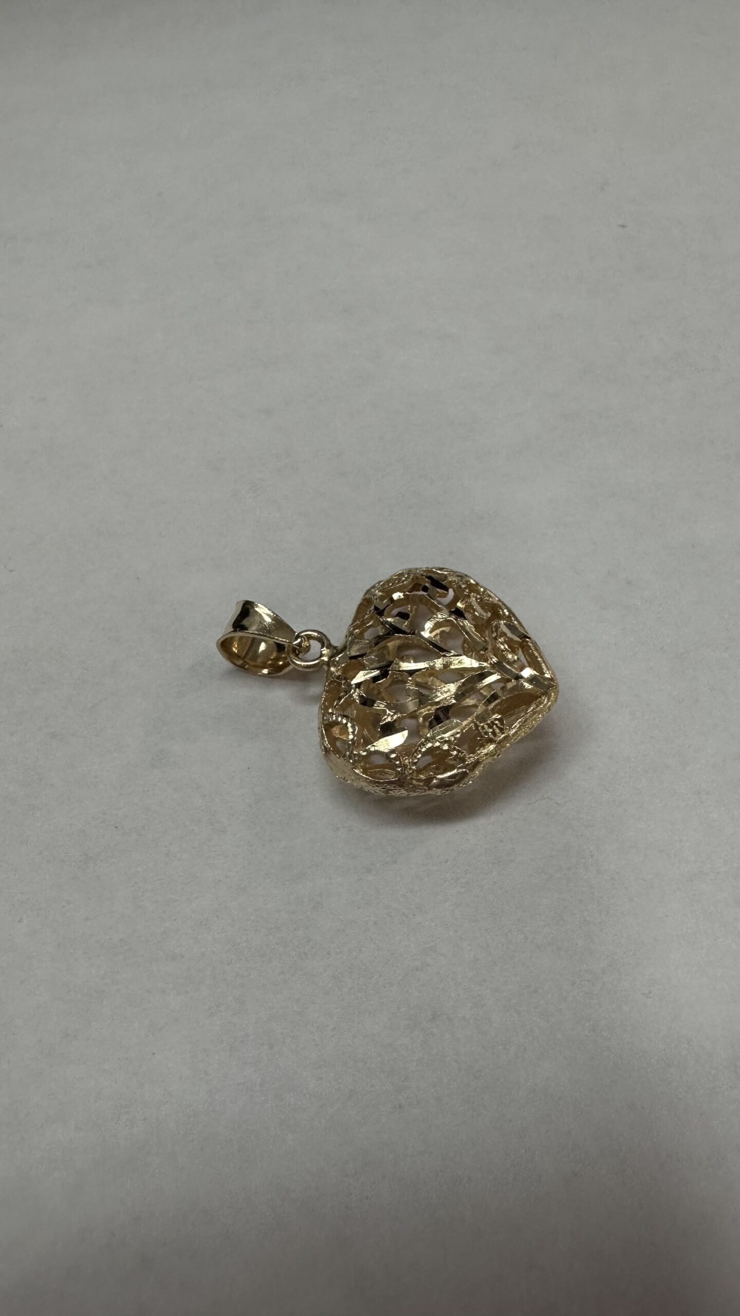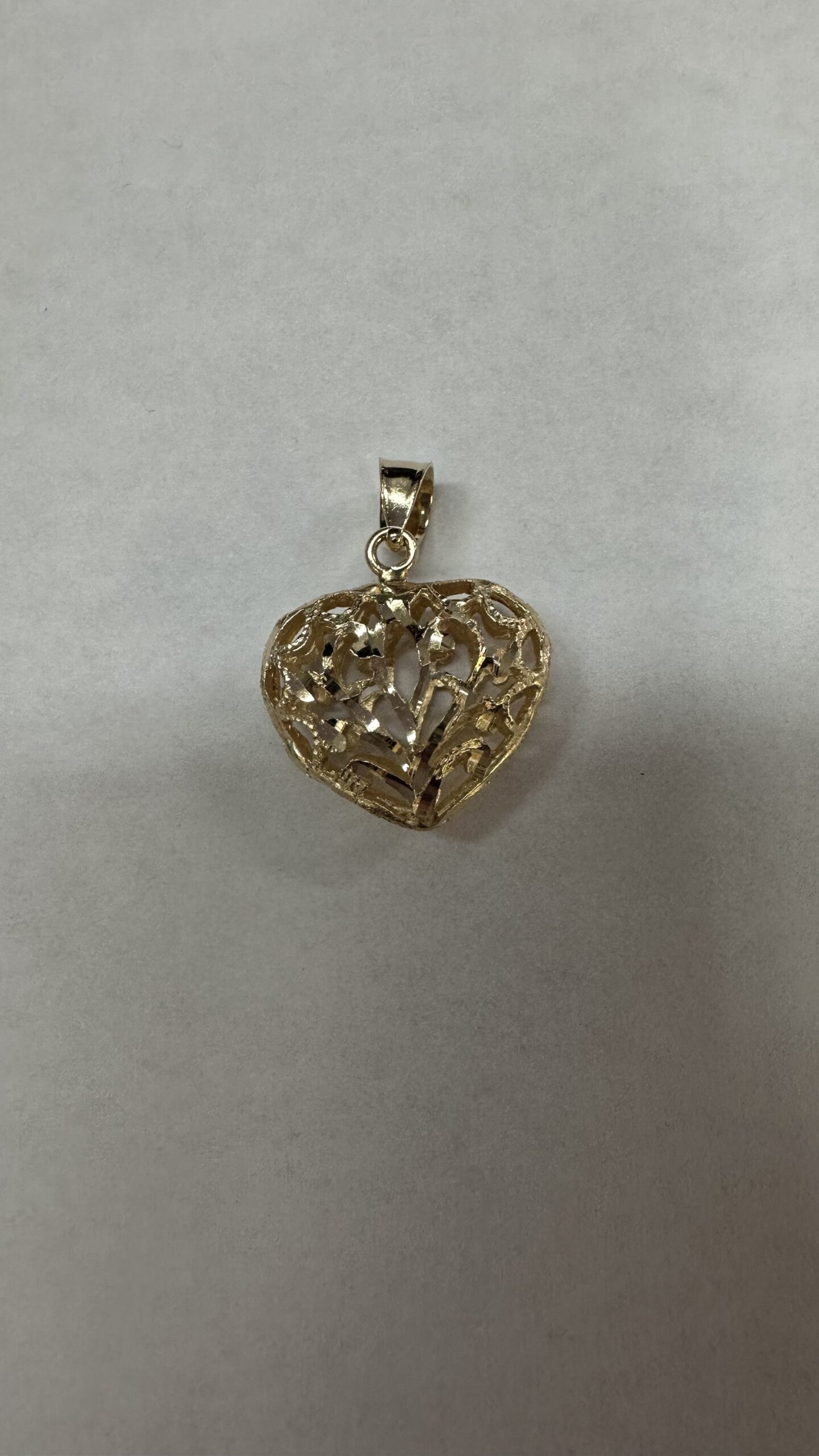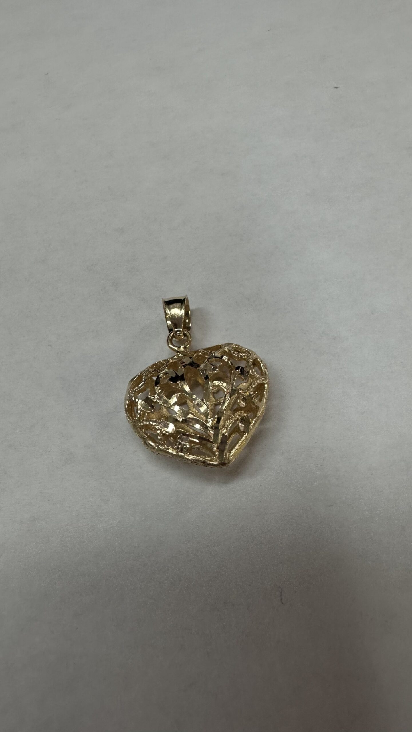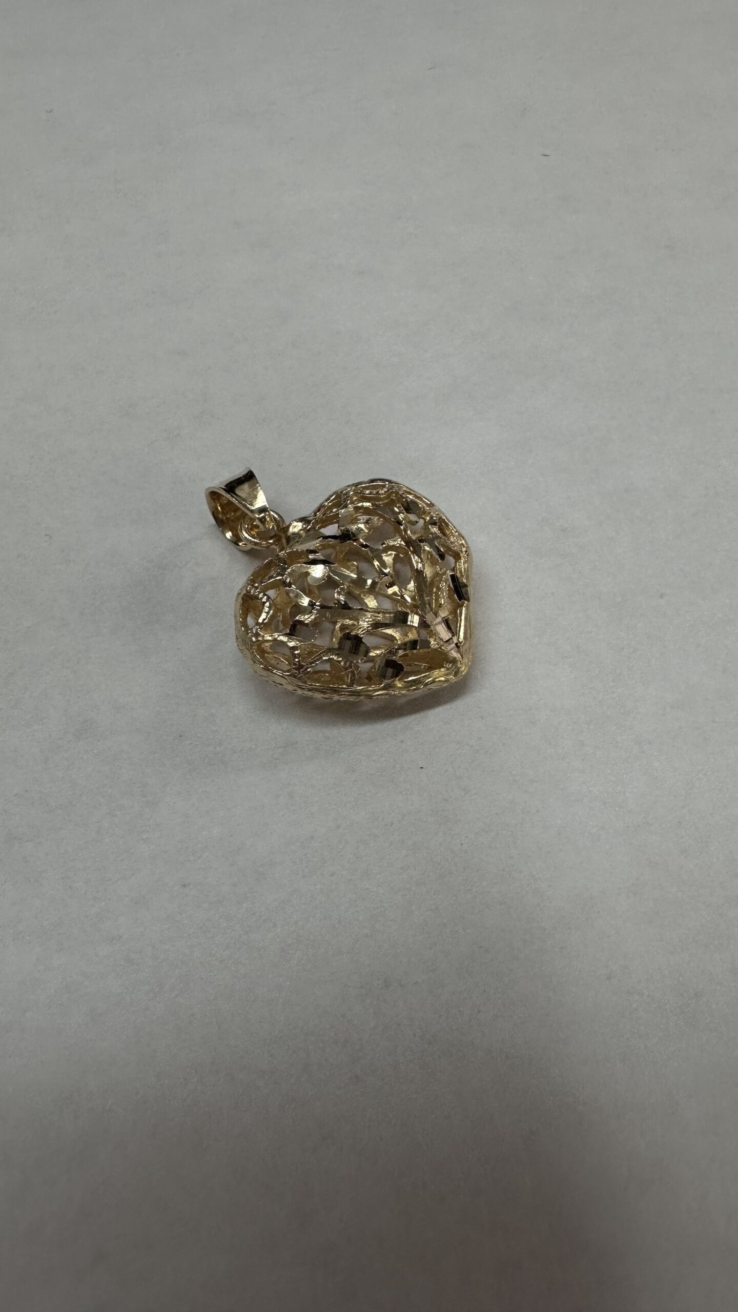 14k yellow gold filigree heart pendant. This pendant measures 14 x 18.5 mm in size, and it has an entire weight of 2.7 grams.