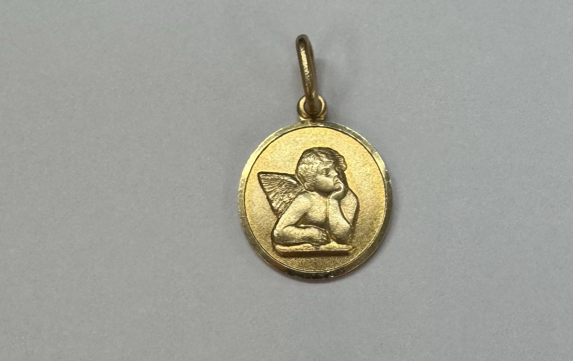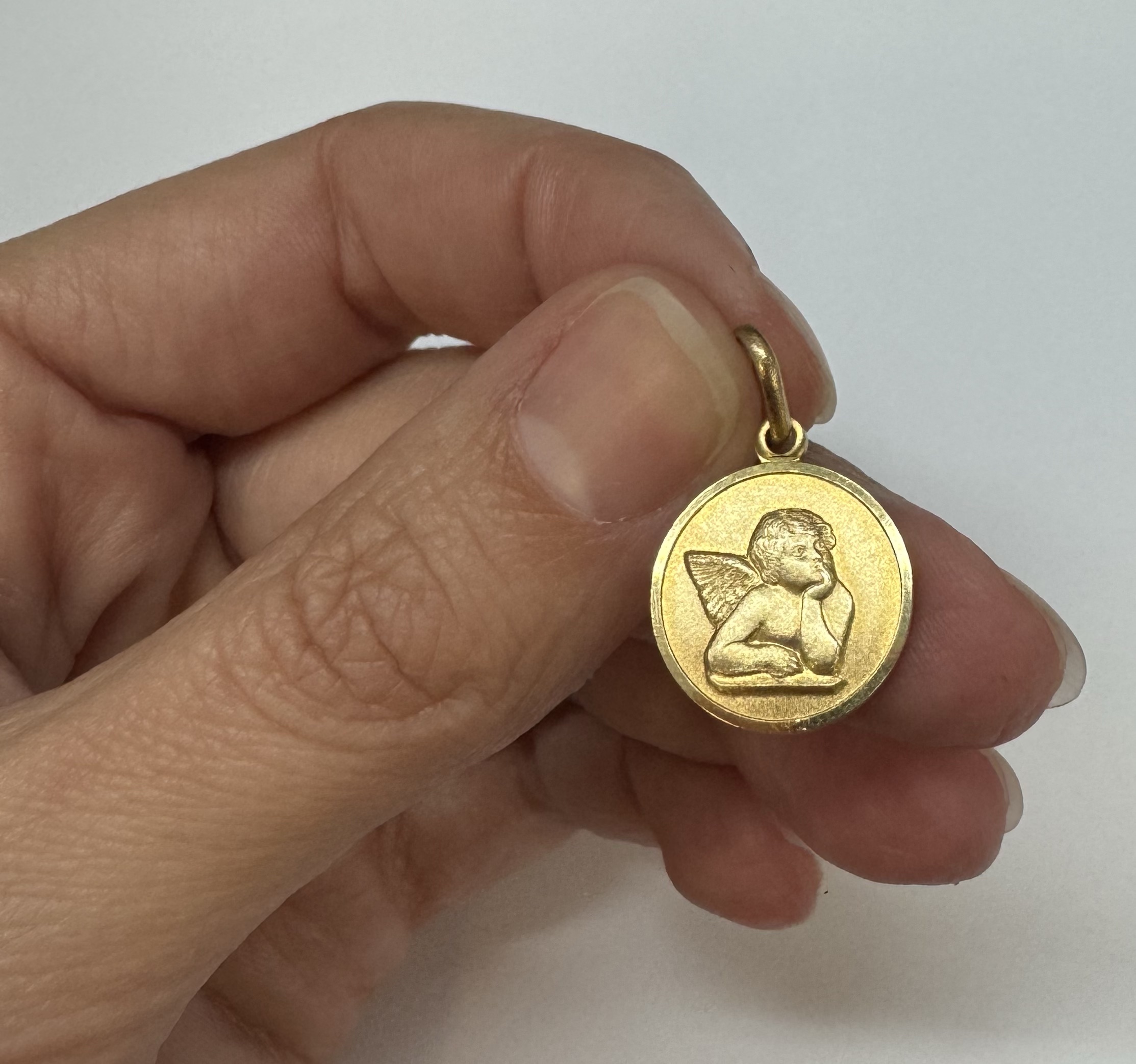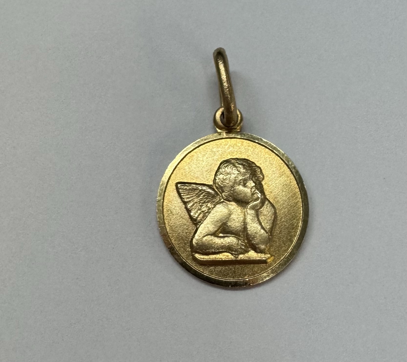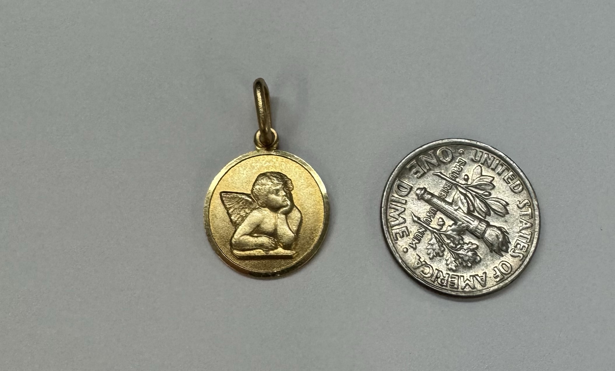 14k yellow gold flat round disc charm/pendant with angel, with burnished finish. This piece has an entire weight of 2.0 grams.