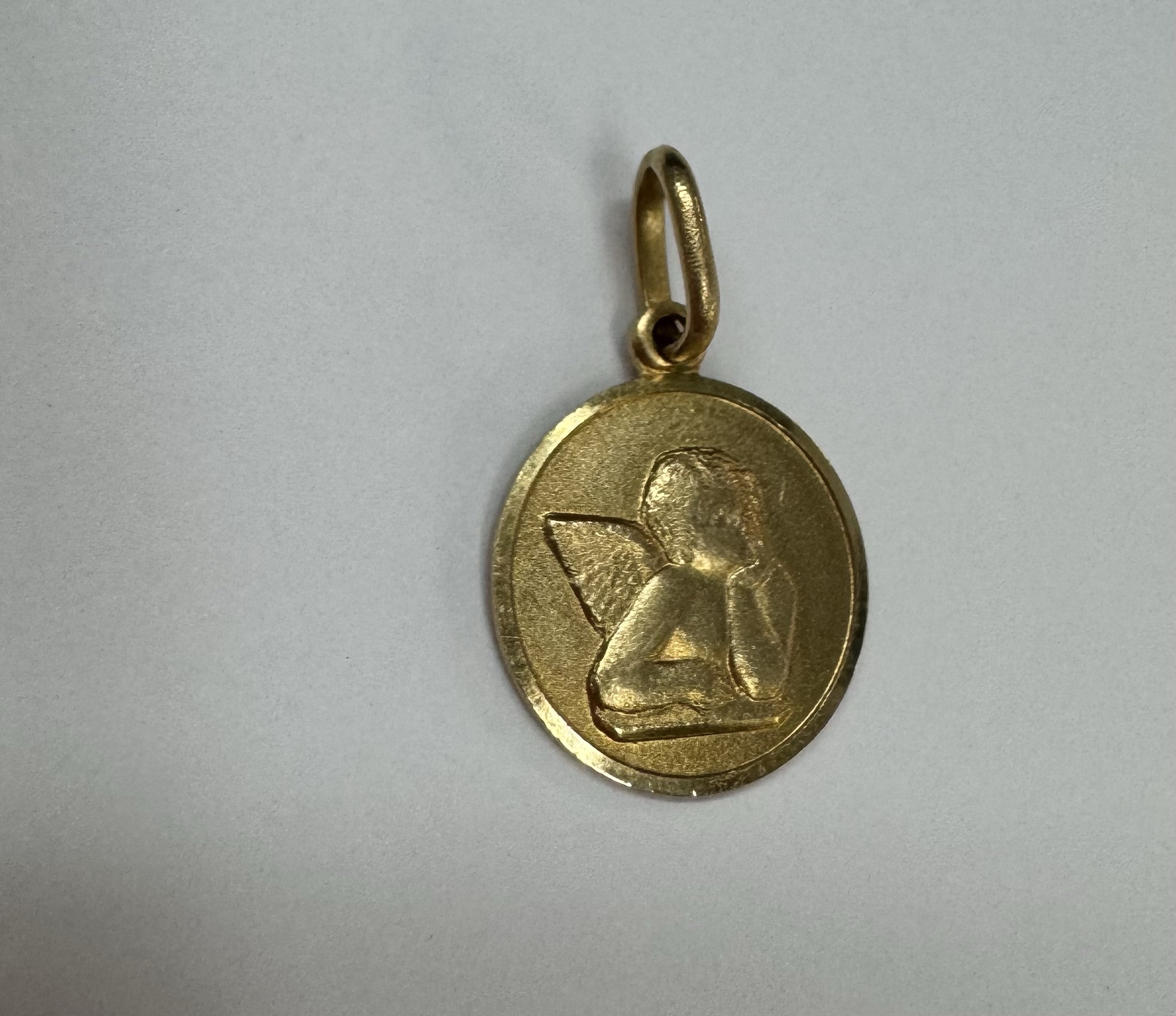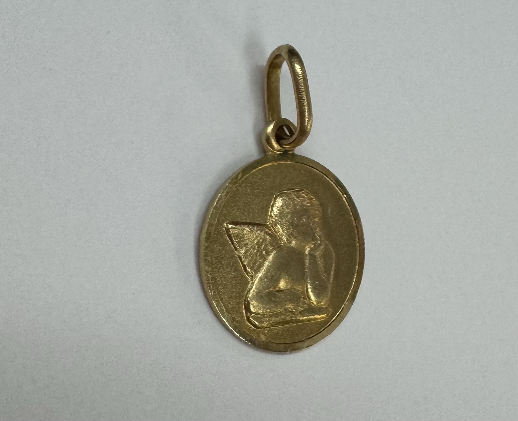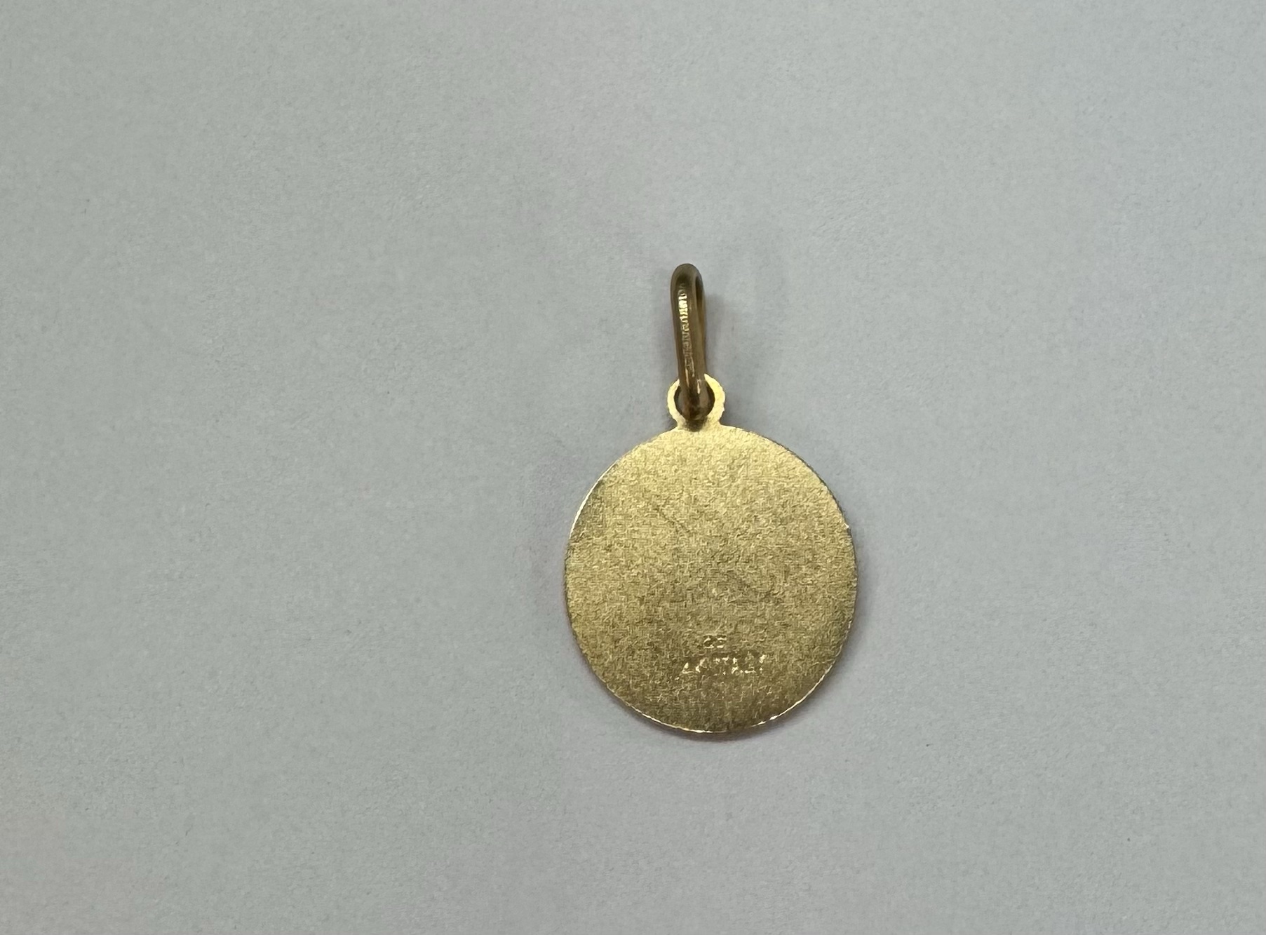 14k yellow gold flat round disc charm/pendant with angel, with burnished finish. This piece has an entire weight of 2.0 grams.