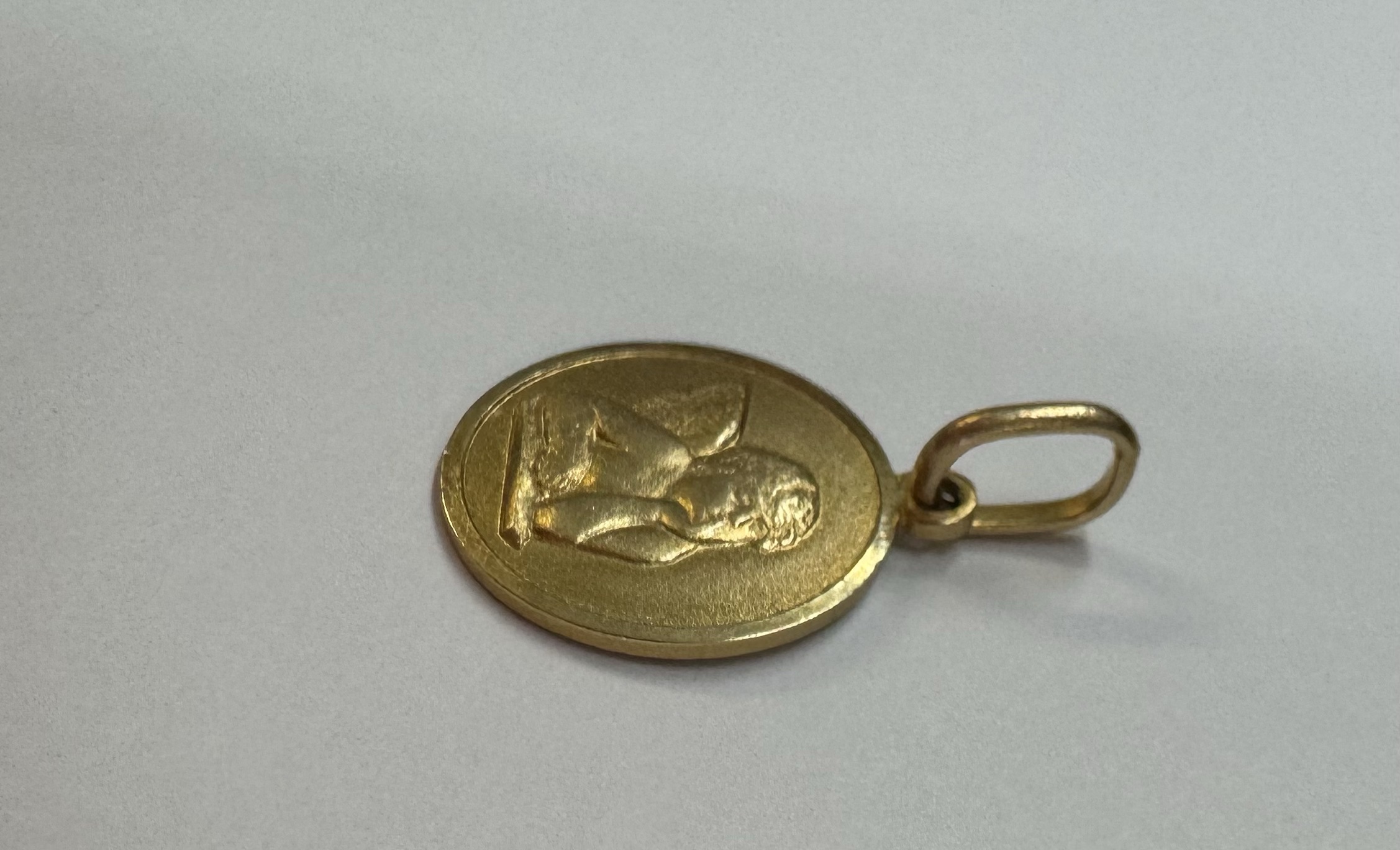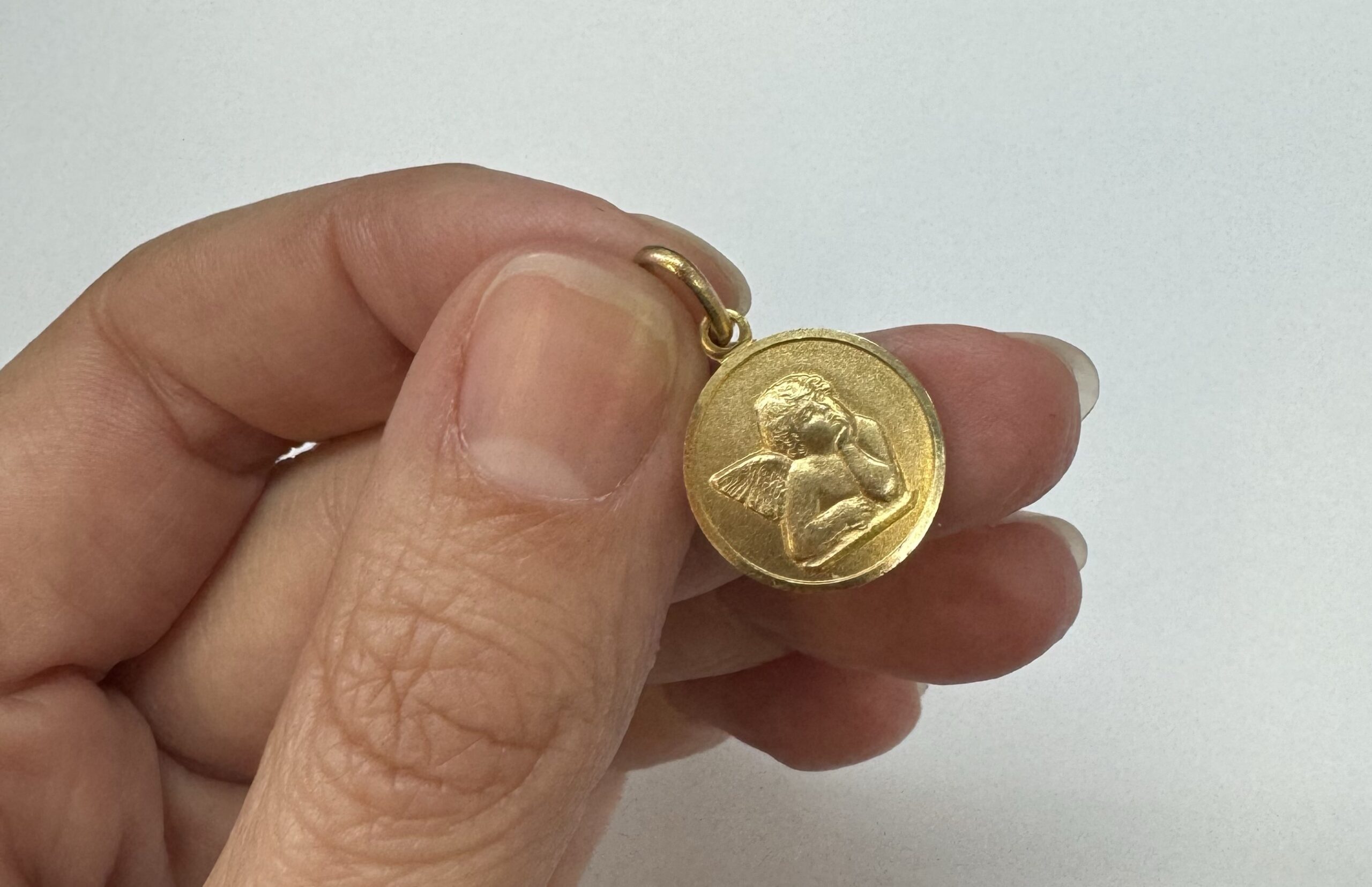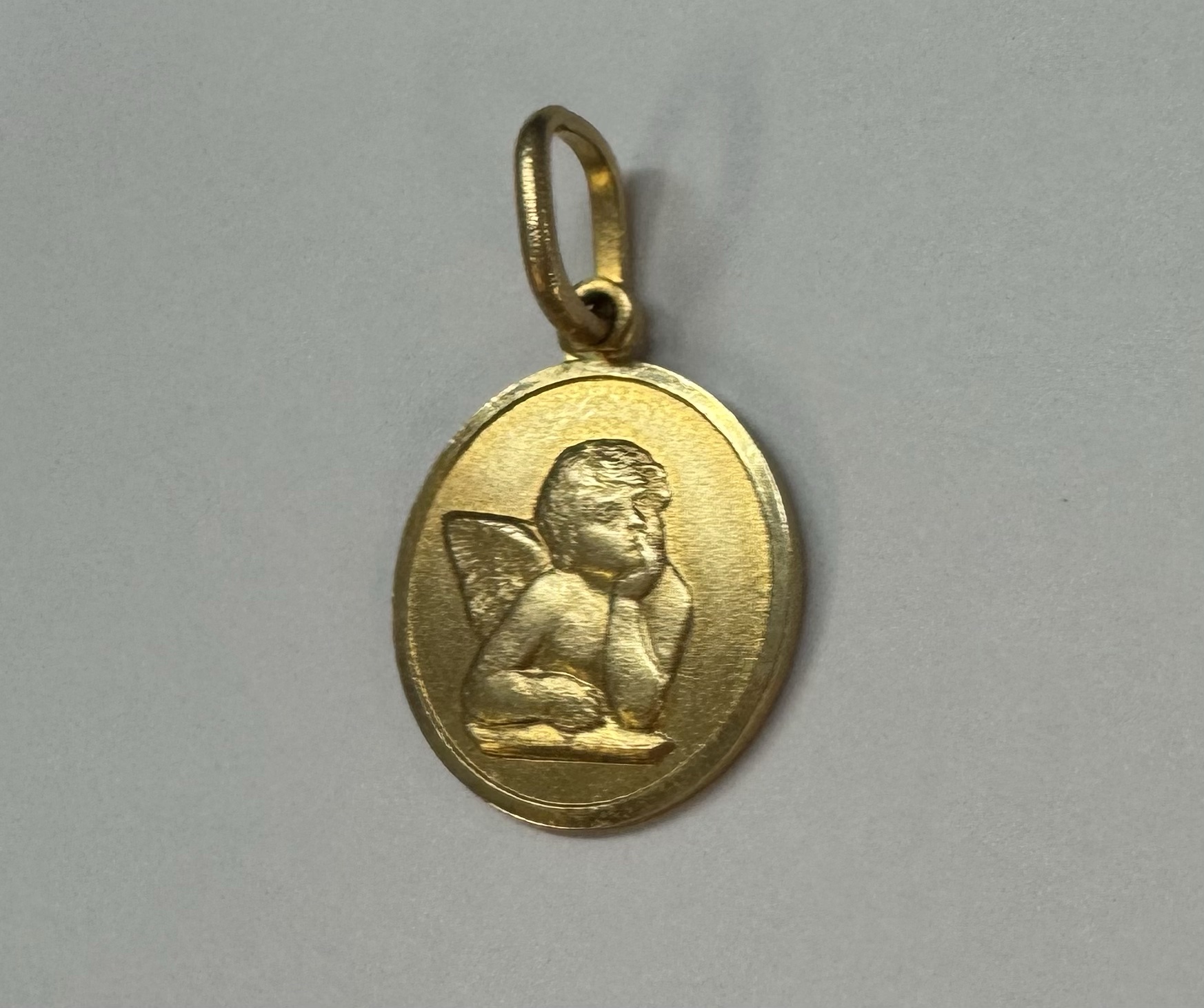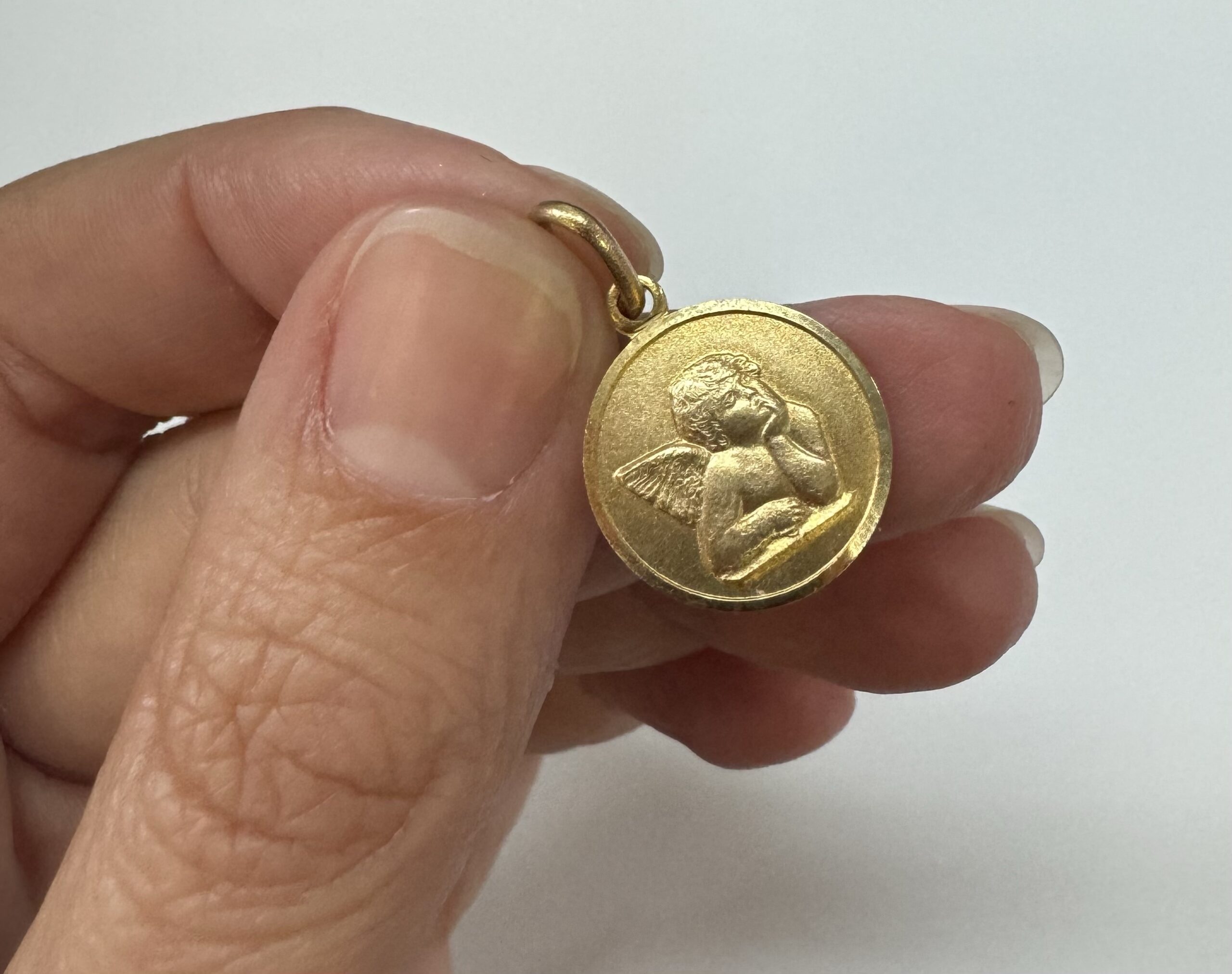14k yellow gold flat round disc charm/pendant with angel, with burnished finish. This piece has an entire weight of 2.0 grams.