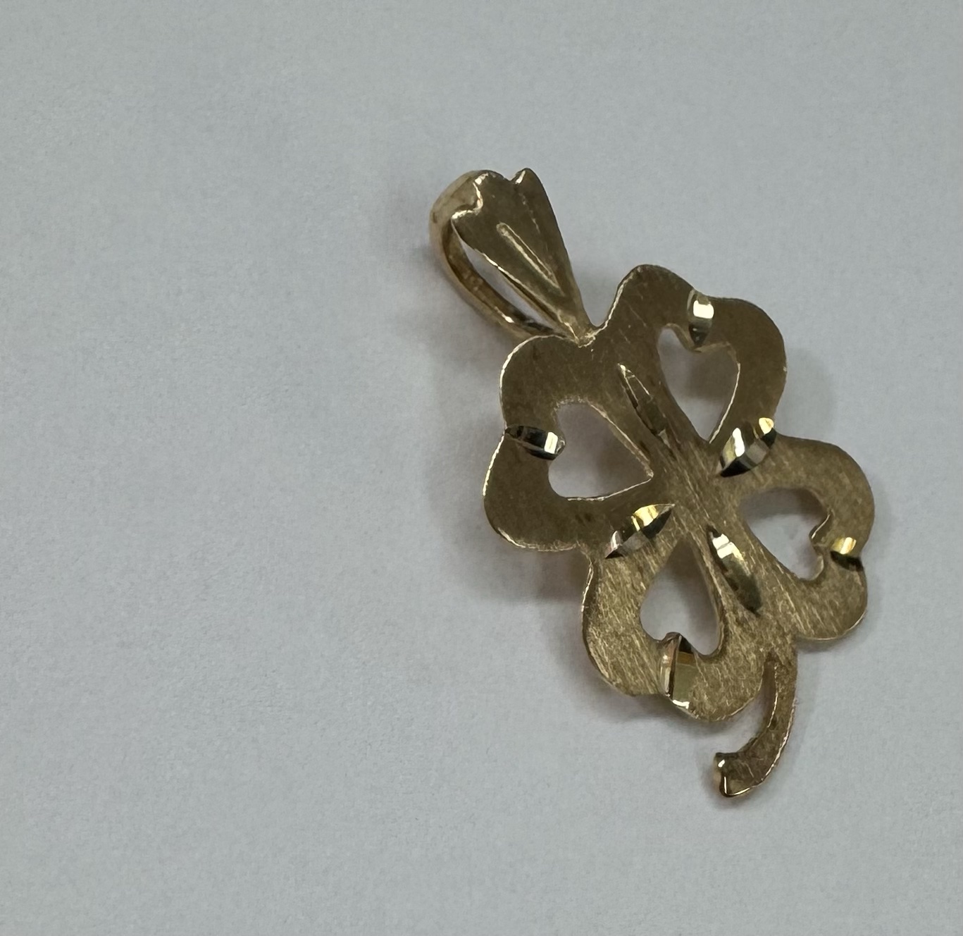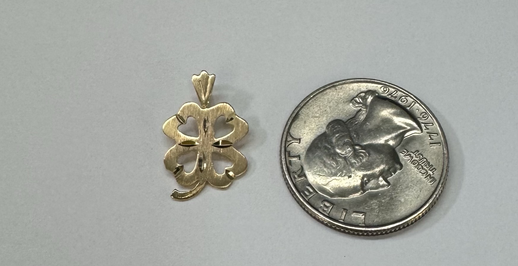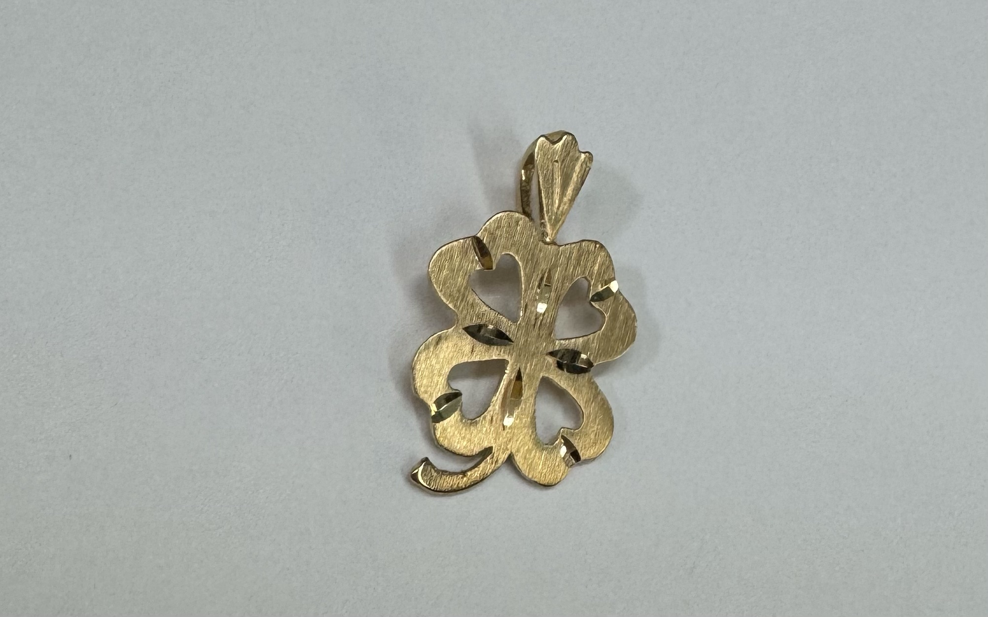 14k yellow gold four leaf clover pendant with engraved details. This piece has an entire weight of 0.7 grams.