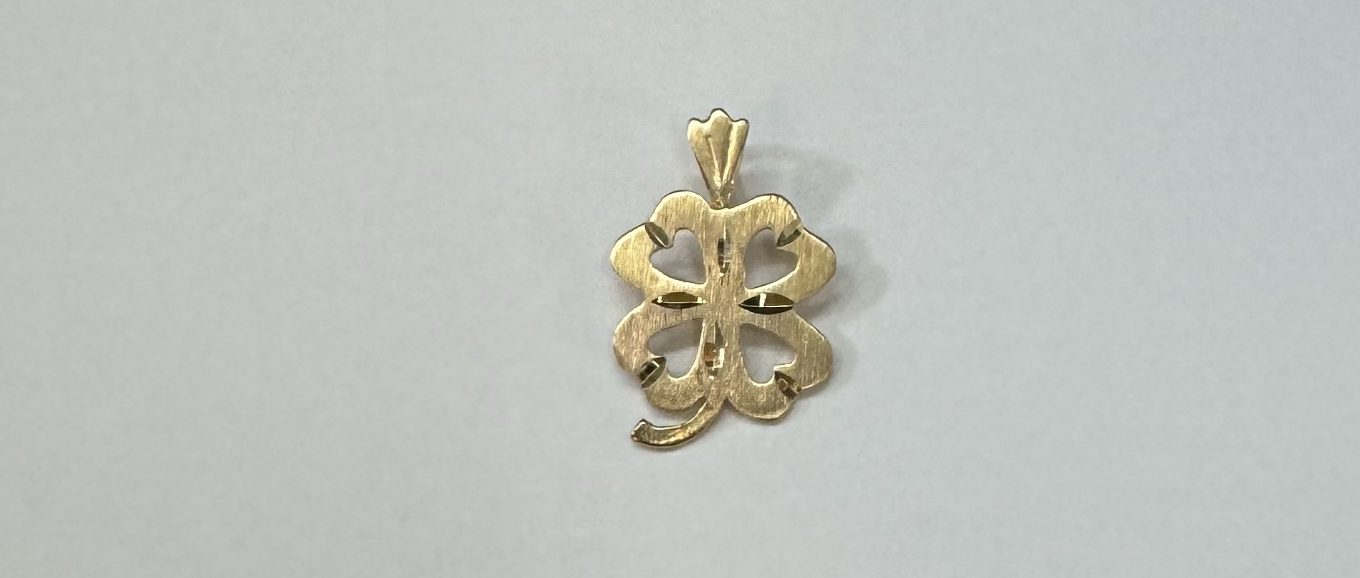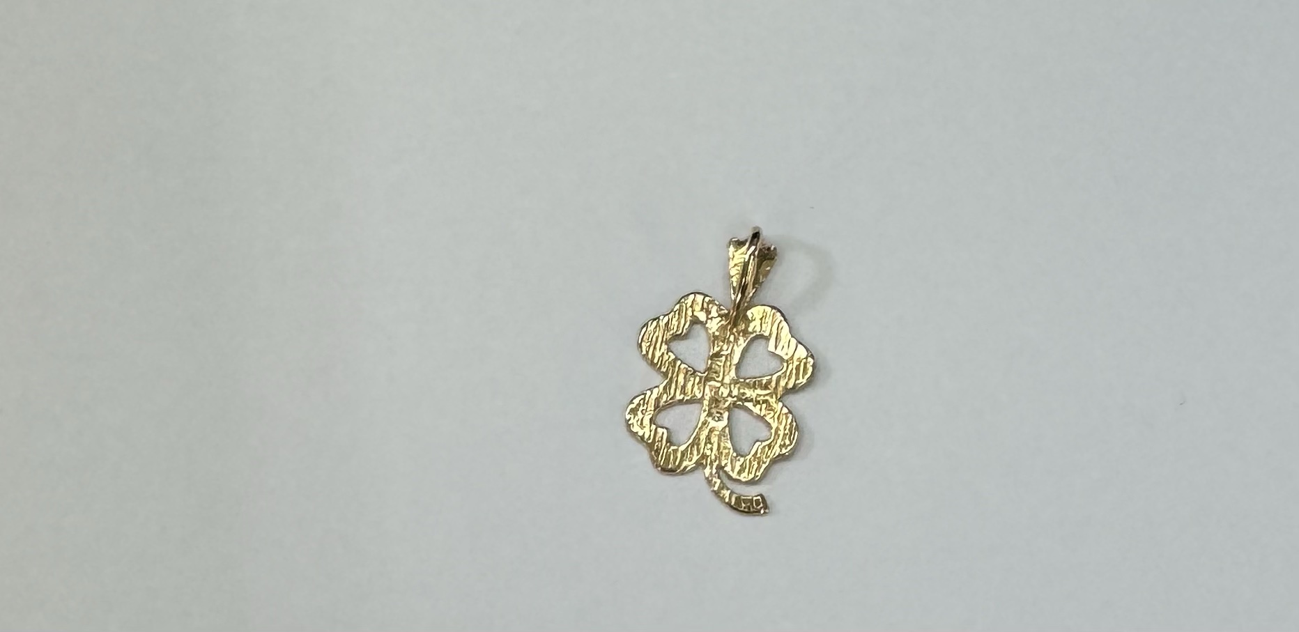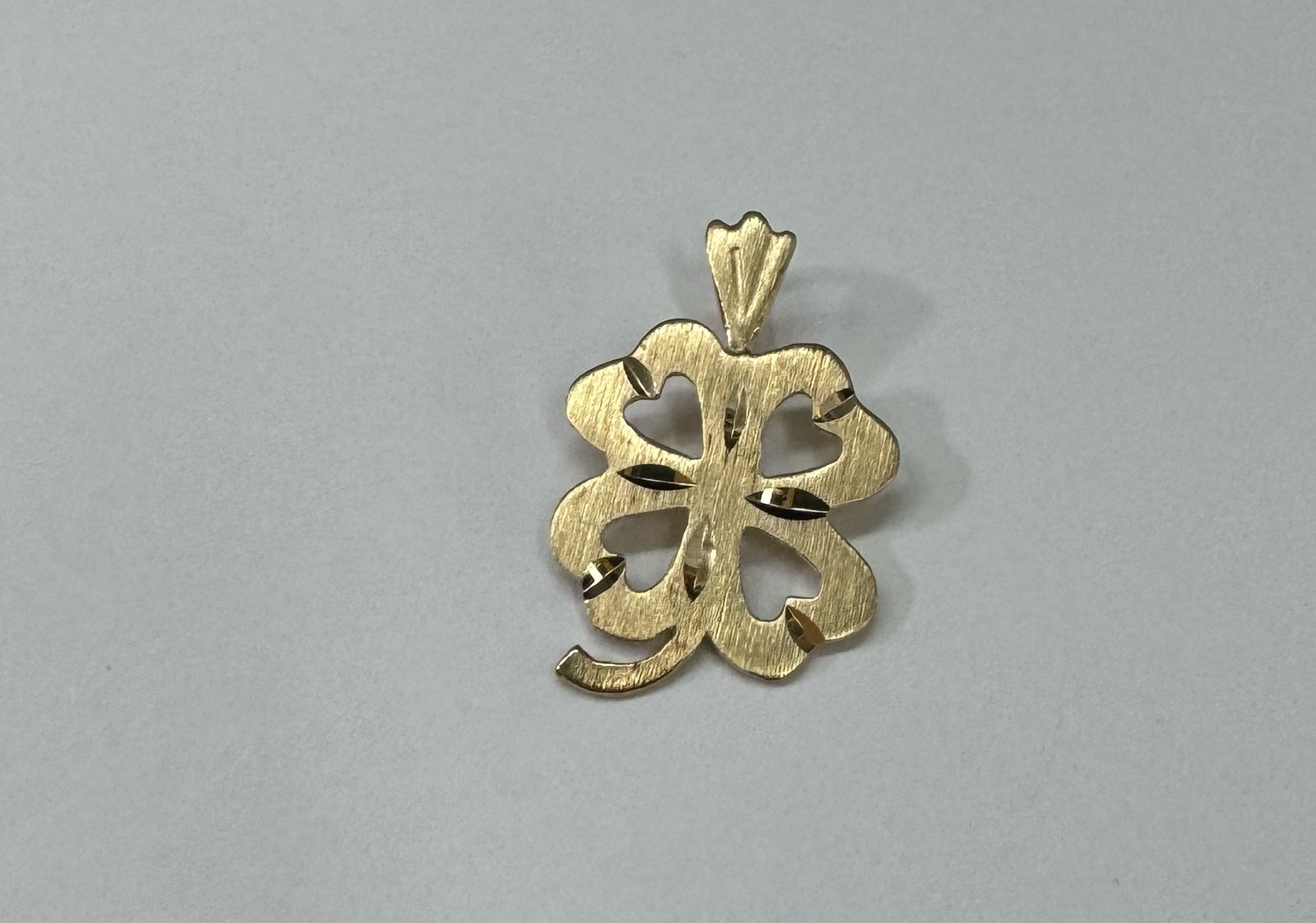 14k yellow gold four leaf clover pendant with engraved details. This piece has an entire weight of 0.7 grams.