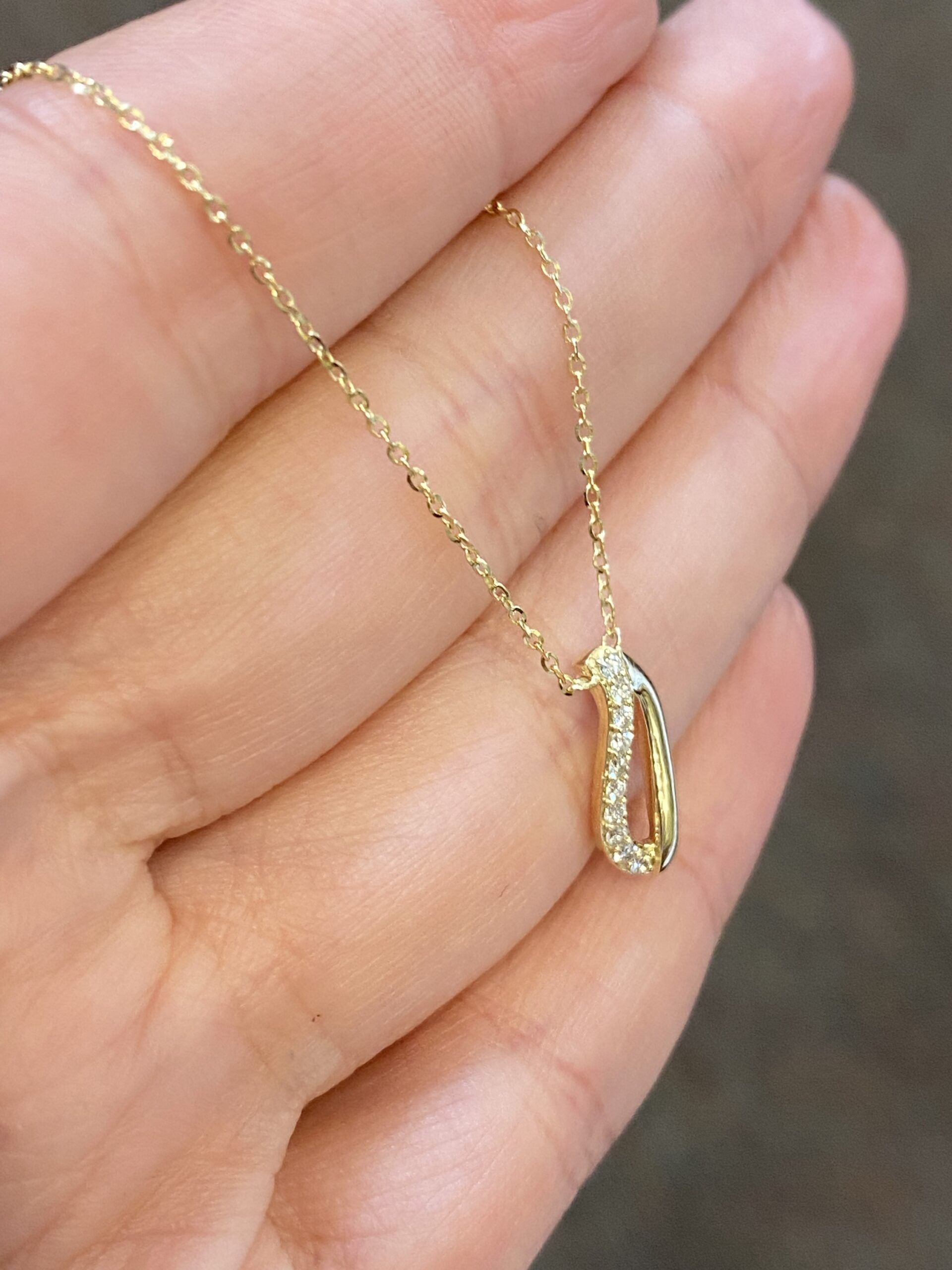14k yellow gold .09 cttw genuine Round Brilliant Cut diamond free form pendant. These diamonds average H-I in color, SI in clarity. This pendant is adjustable 15.5-17.5”. Also available in 14k white gold. This piece has an entire weight of 1.7 grams.