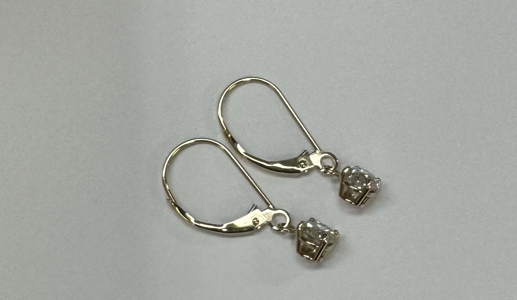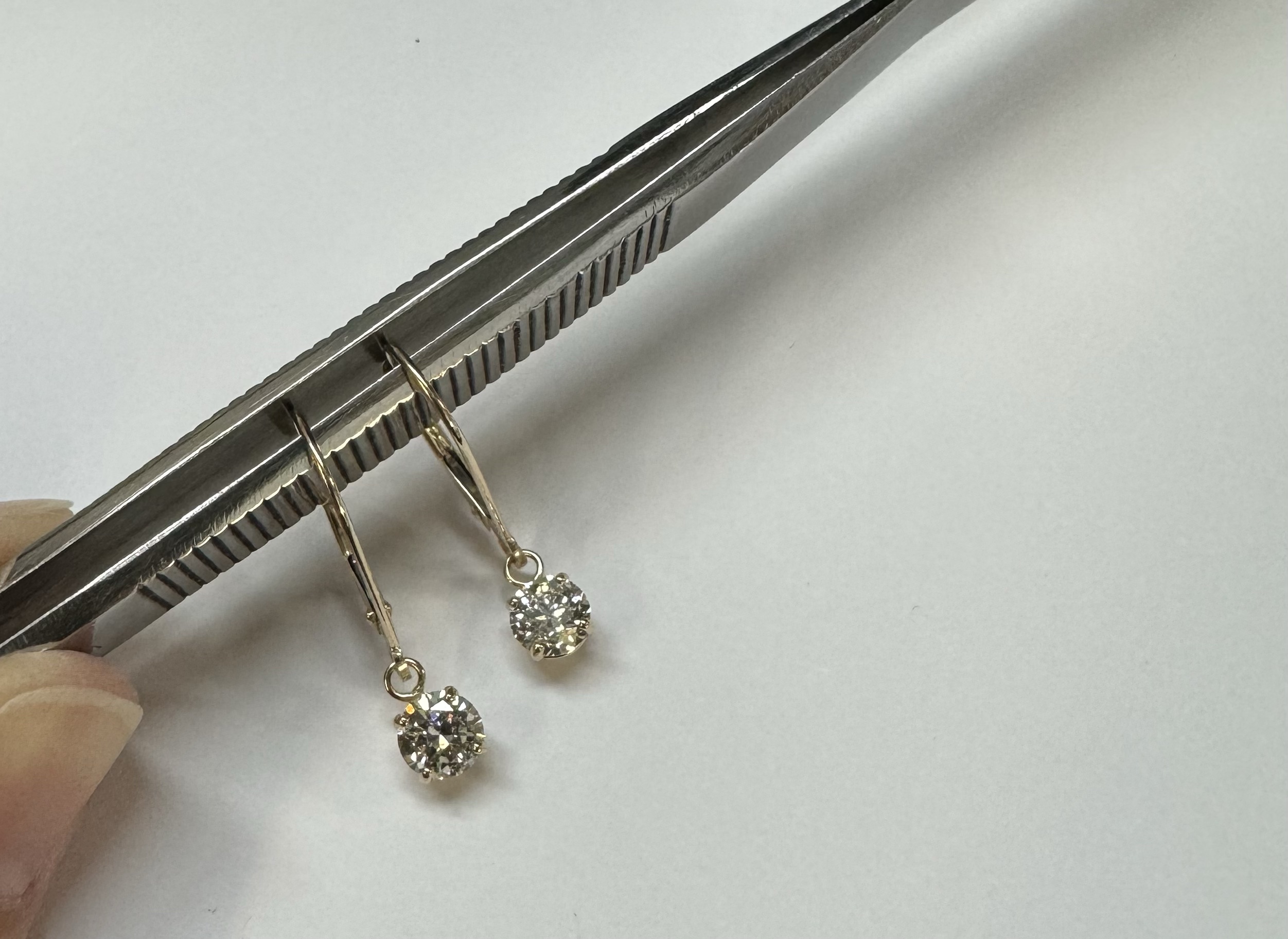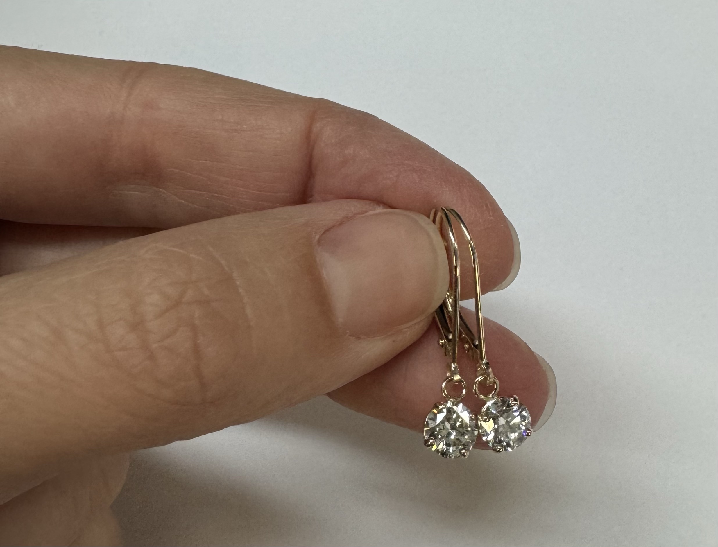 14k yellow gold four prong basket set genuine 1.00 carat total weight Round Brilliant Cut diamond lever back dangle earrings. These diamonds average H in color, and SI1 in clarity. These diamonds are nicely proportioned and well finished. These earrings have an entire weight of 1.09 grams.