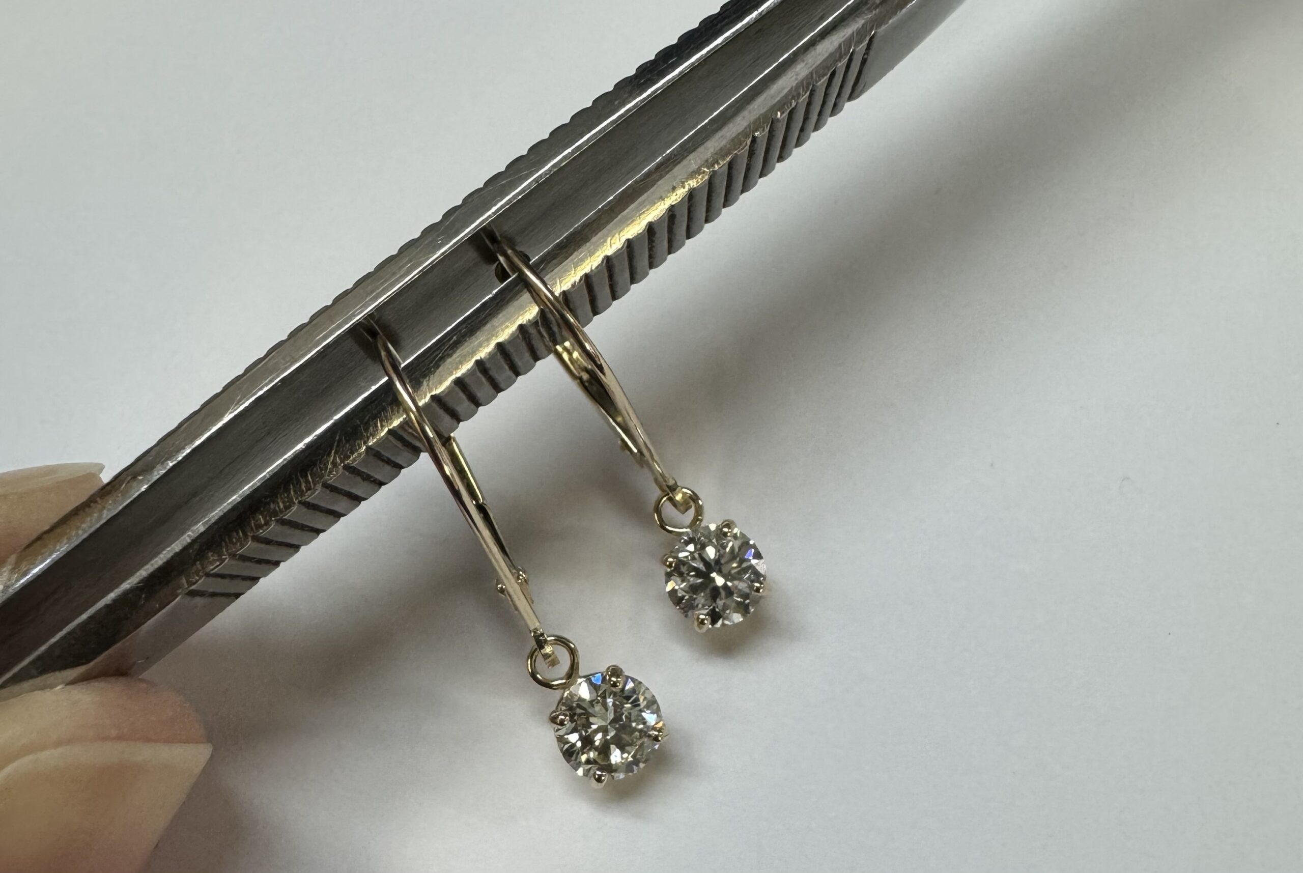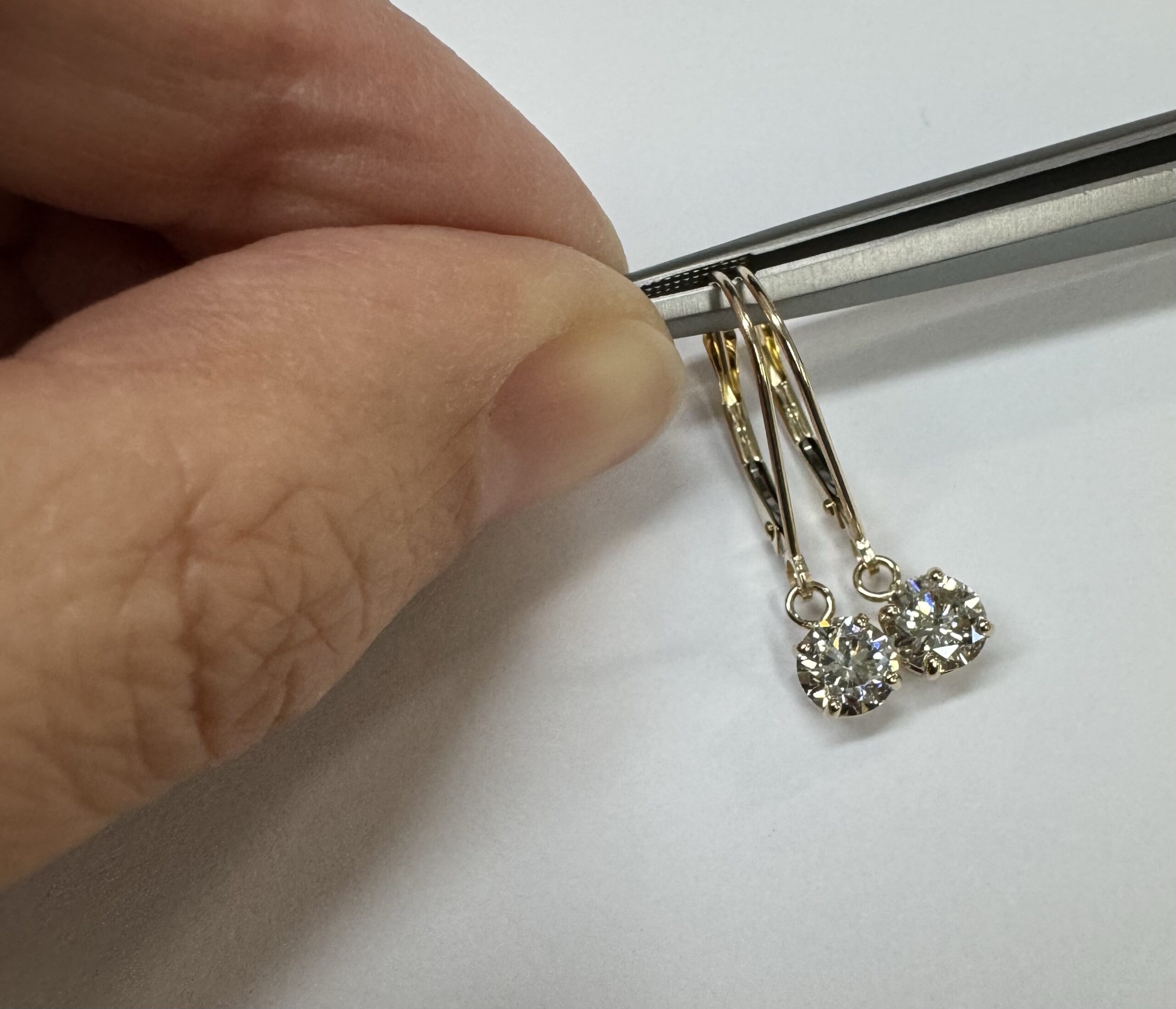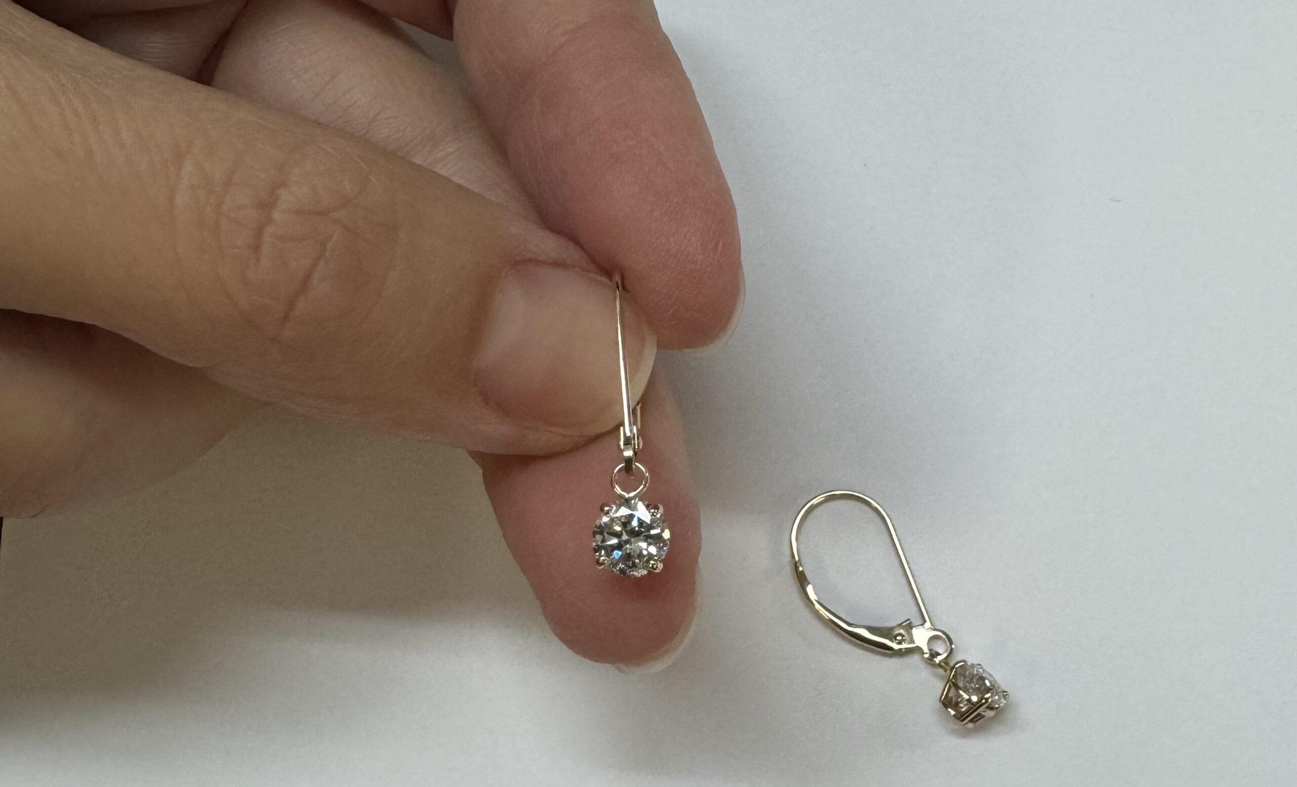 14k yellow gold four prong basket set genuine 1.00 carat total weight Round Brilliant Cut diamond lever back dangle earrings. These diamonds average H in color, and SI1 in clarity. These diamonds are nicely proportioned and well finished. These earrings have an entire weight of 1.09 grams.