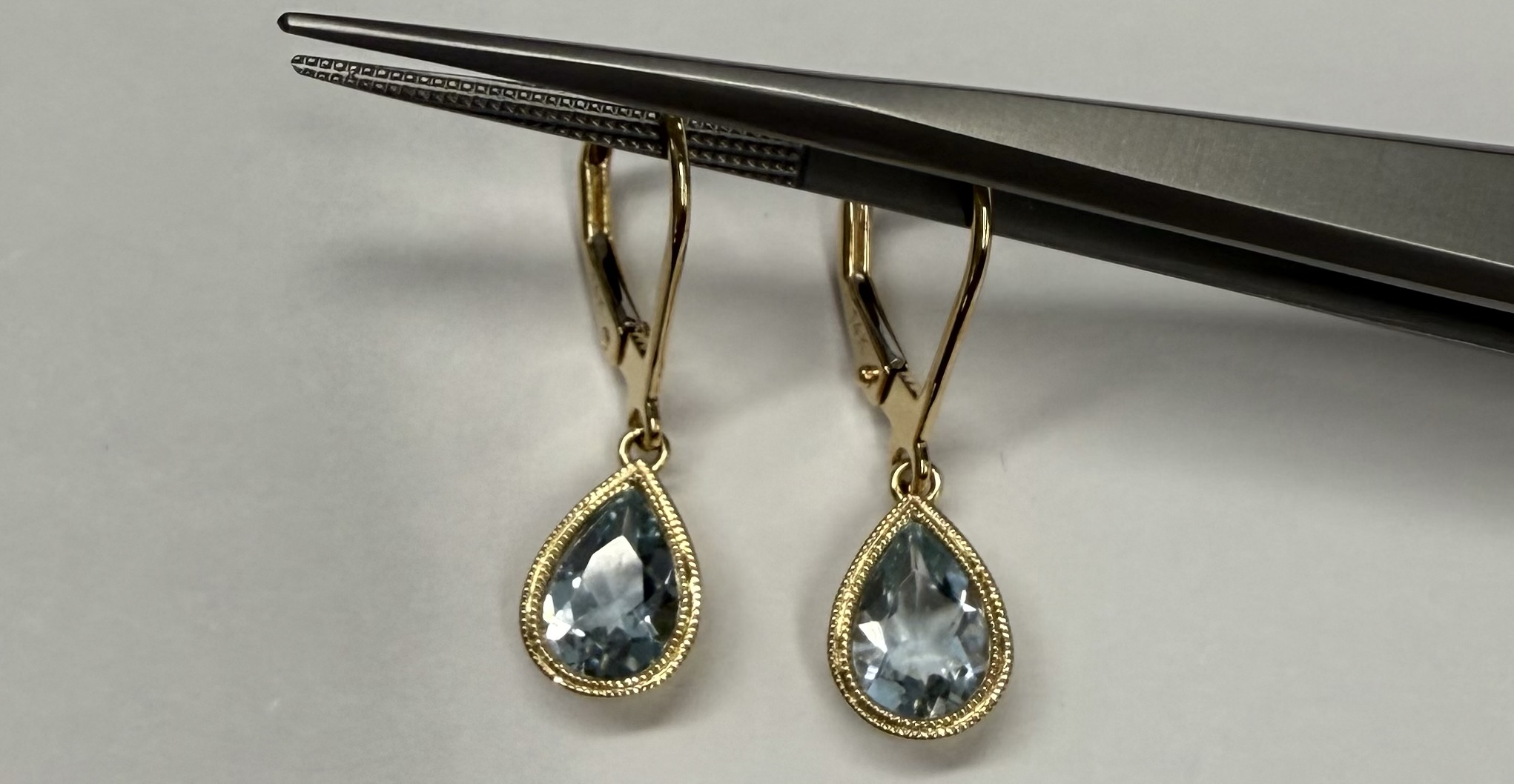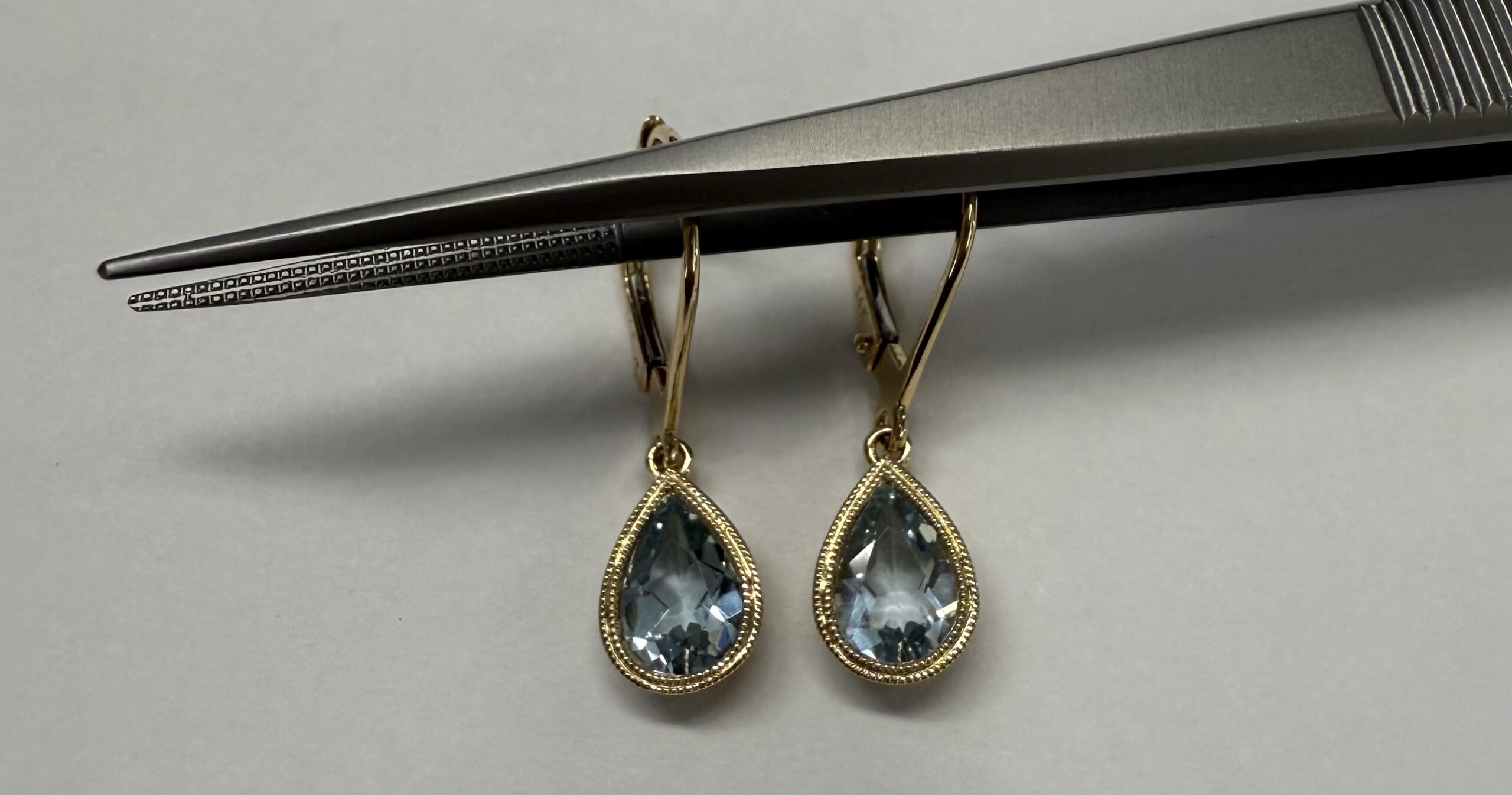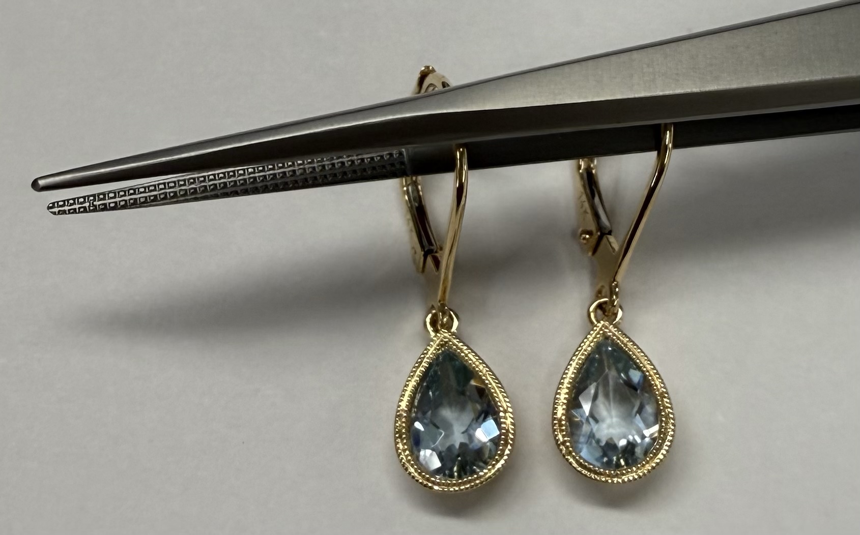 14k yellow gold bezel set pear shaped, faceted genuine 1.12 cttw Aquamarine (March birthstone) lever back dangle earrings with filigree details. These earrings have an entire weight of 1.7 grams.