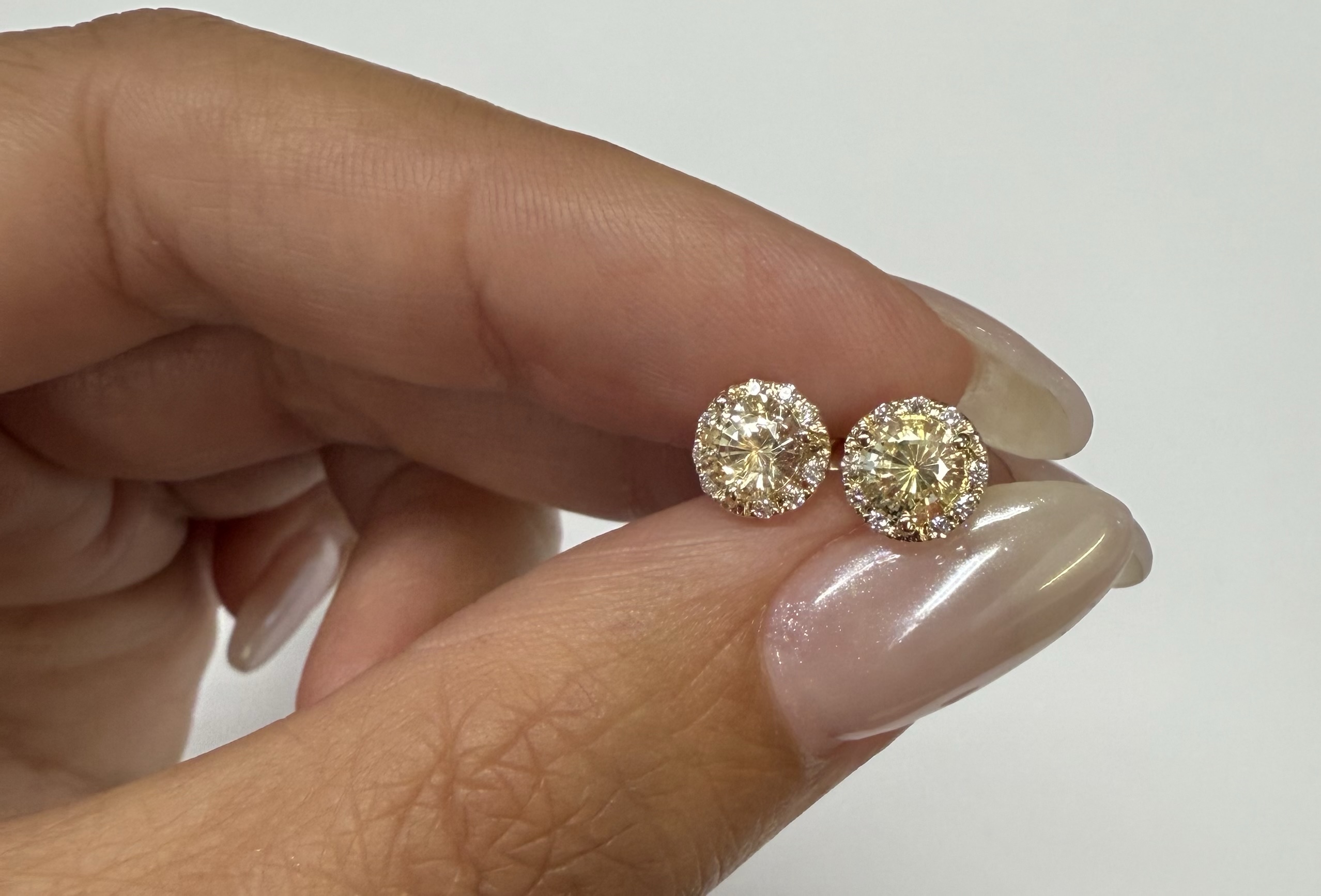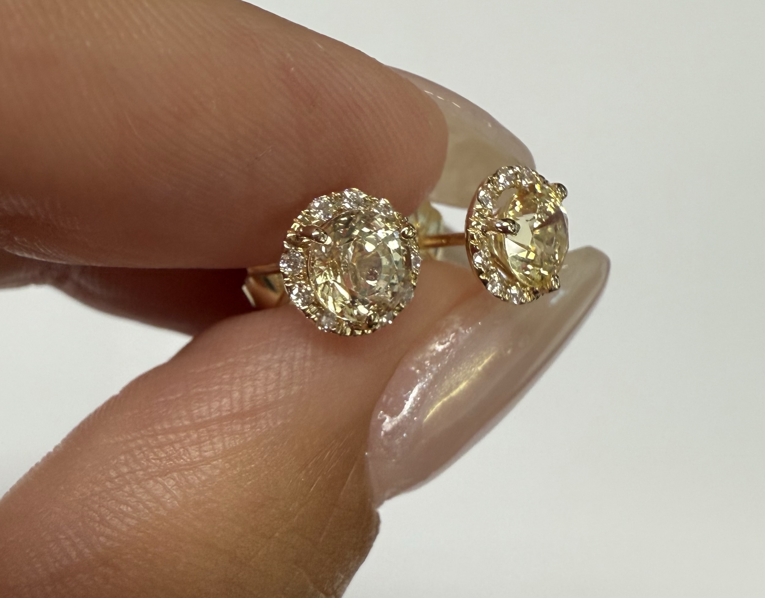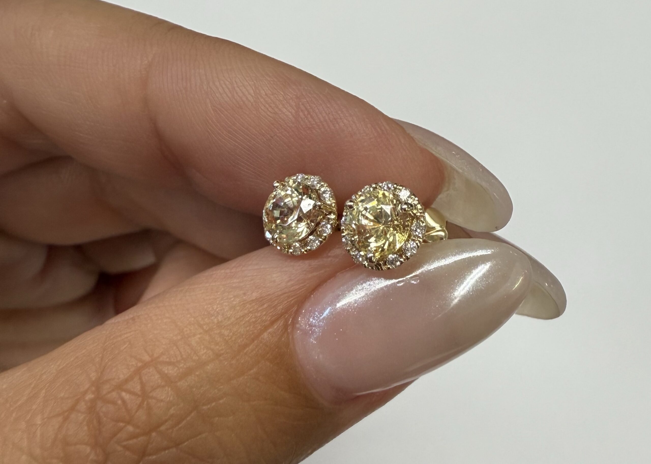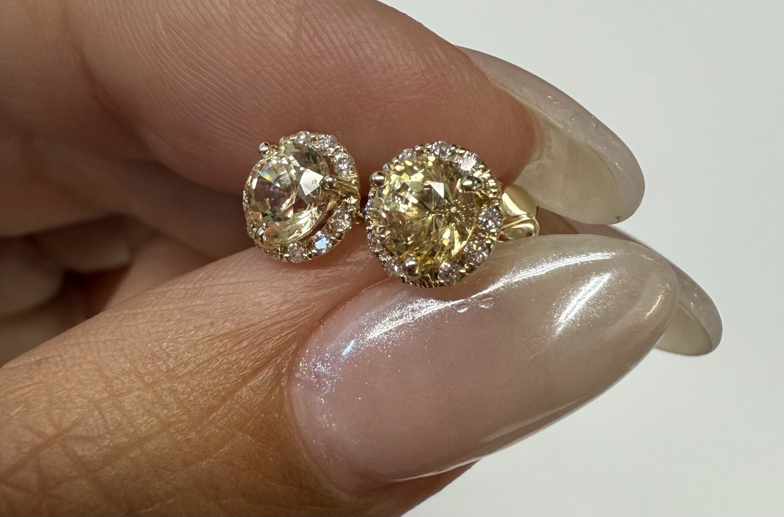 14k yellow gold genuine round, faceted 1.38 cttw Yellow Sapphire and genuine .11 cttw Round Brilliant Cut diamond halo stud earrings. These diamonds average G-H in color, and SI1 in clarity. These earrings have an entire weight of grams.