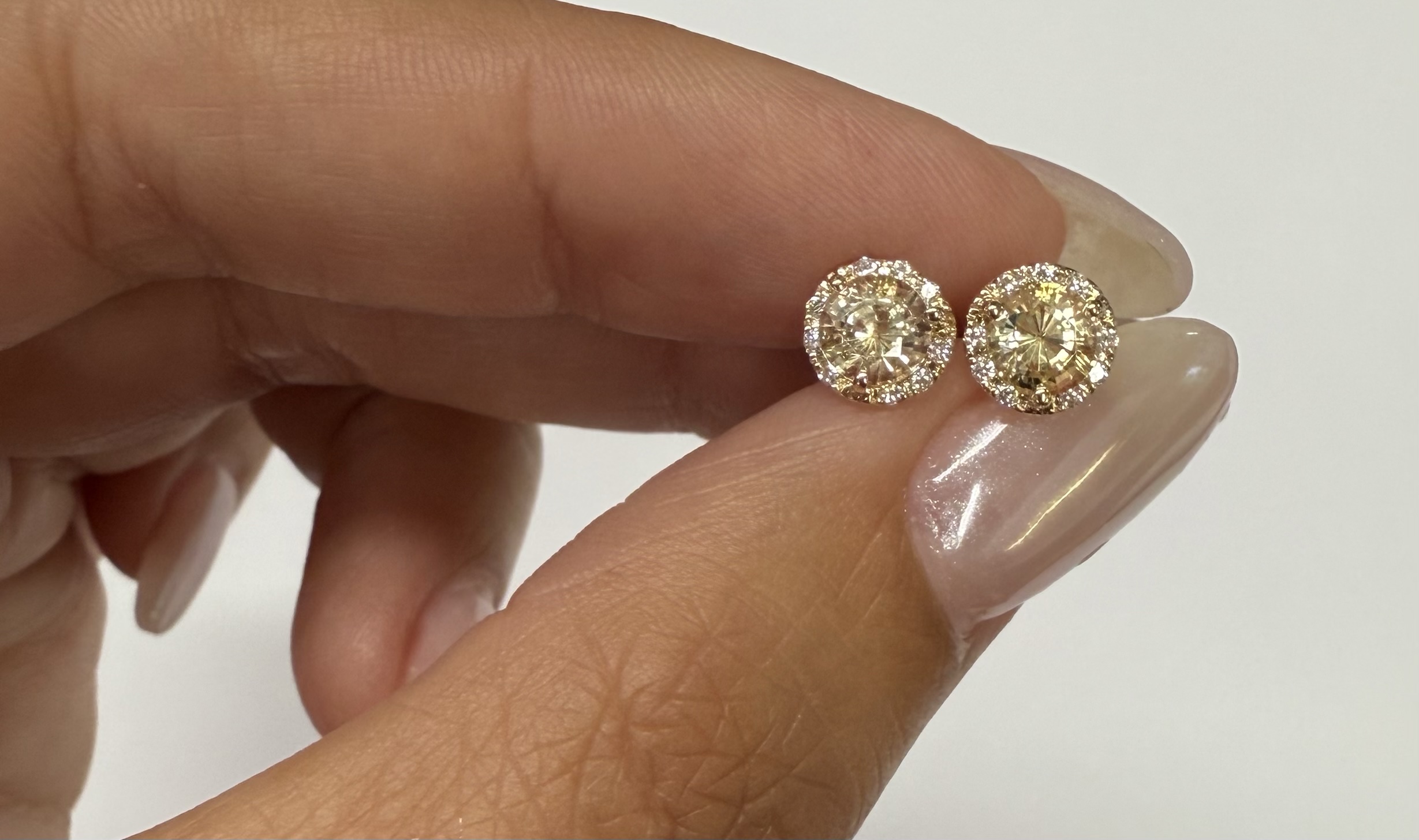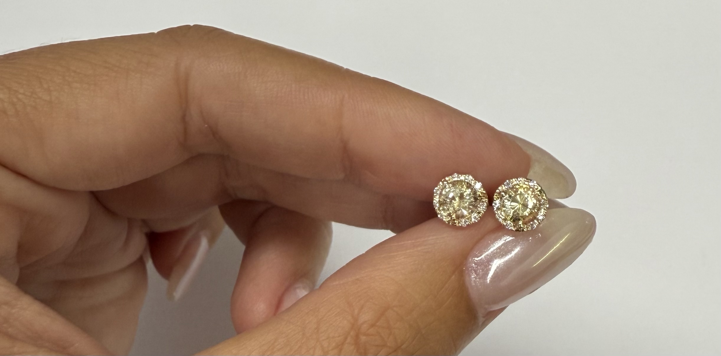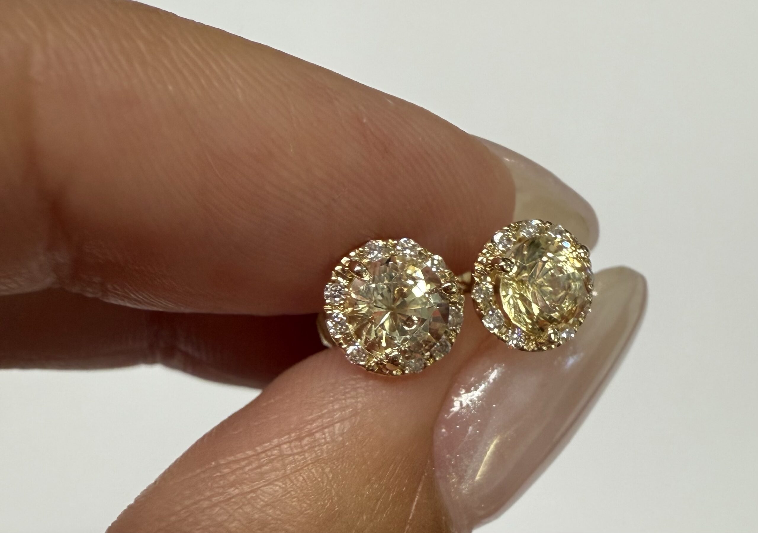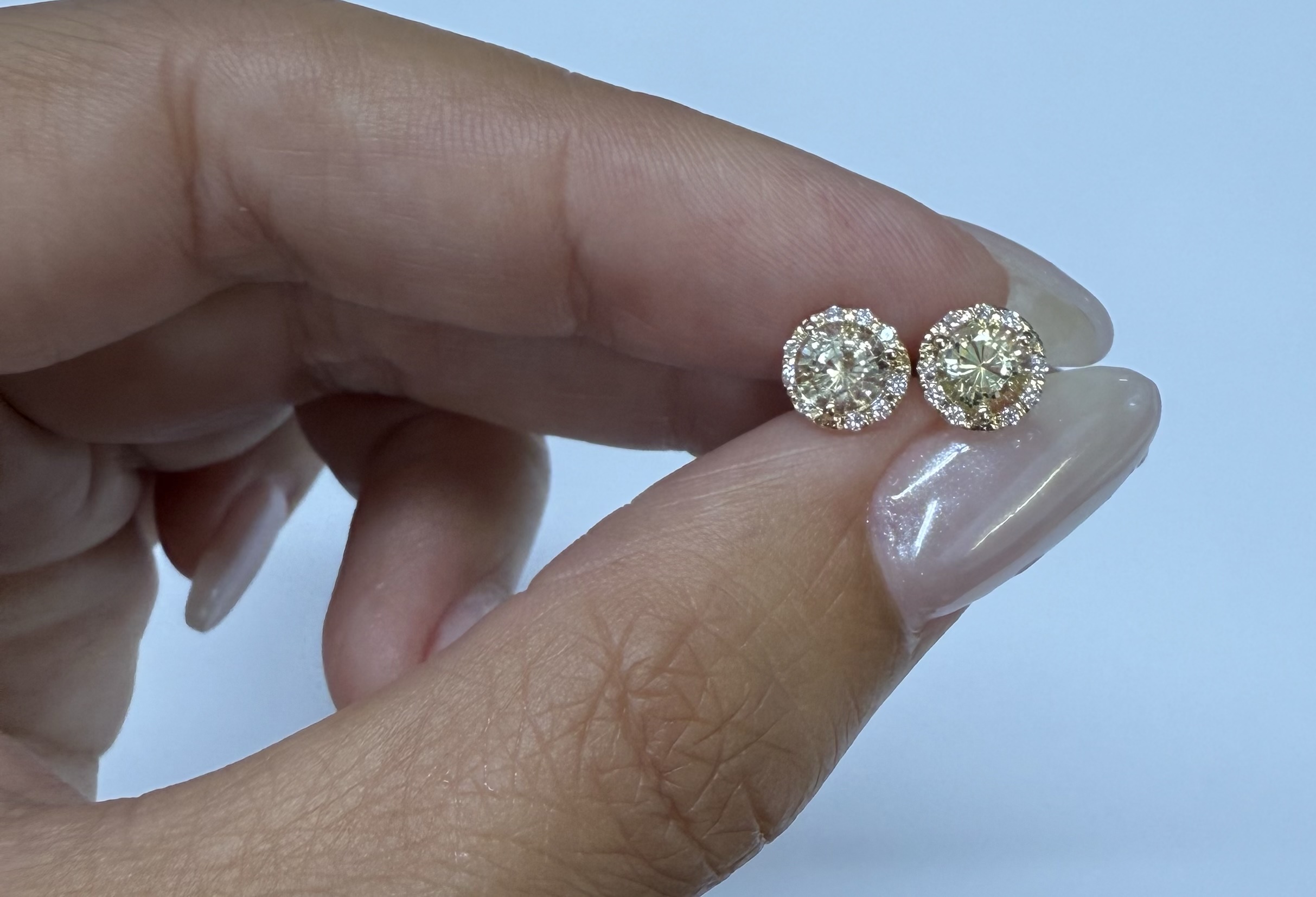 14k yellow gold genuine round, faceted 1.38 cttw Yellow Sapphire and genuine .11 cttw Round Brilliant Cut diamond halo stud earrings. These diamonds average G-H in color, and SI1 in clarity. These earrings have an entire weight of grams.