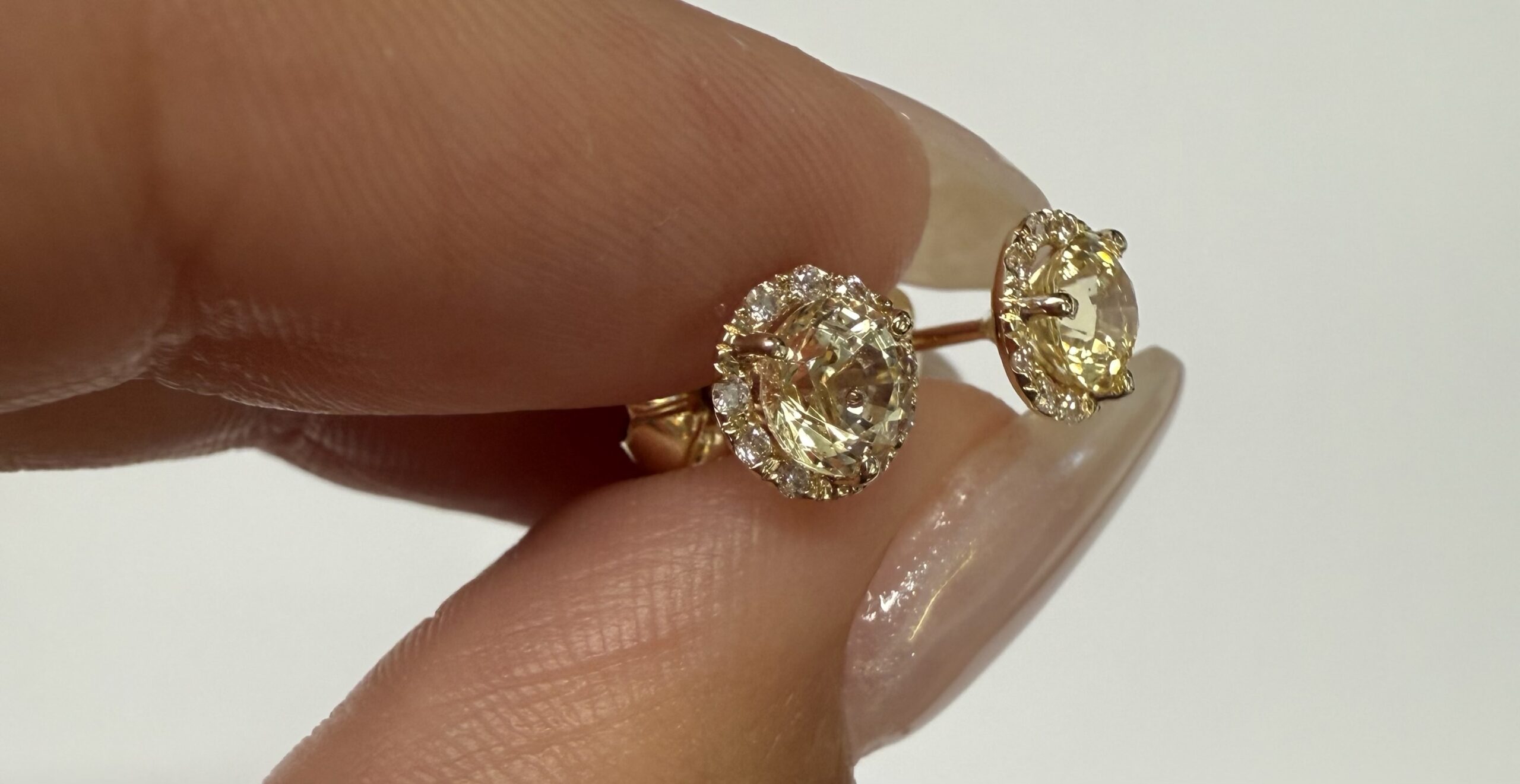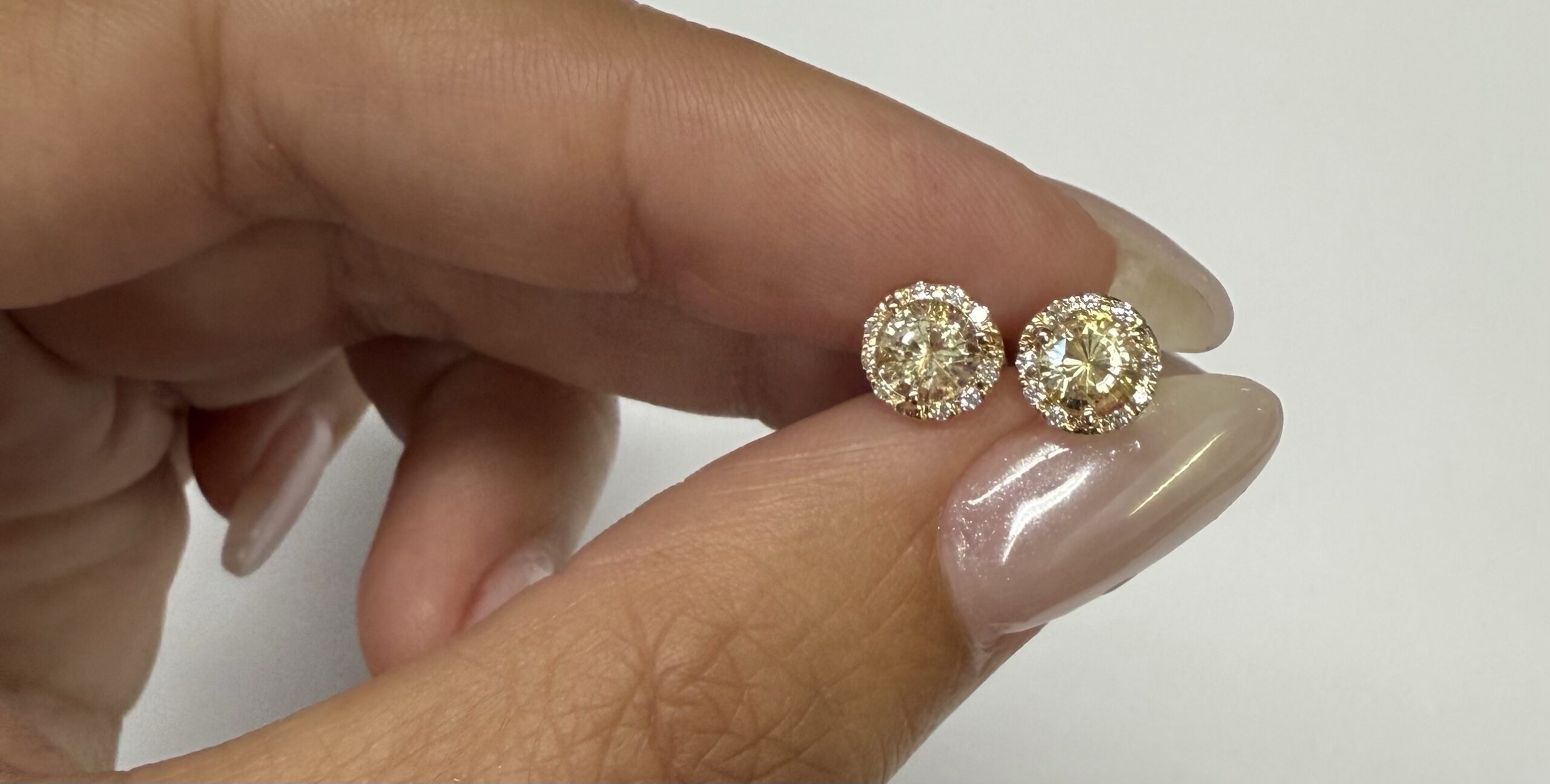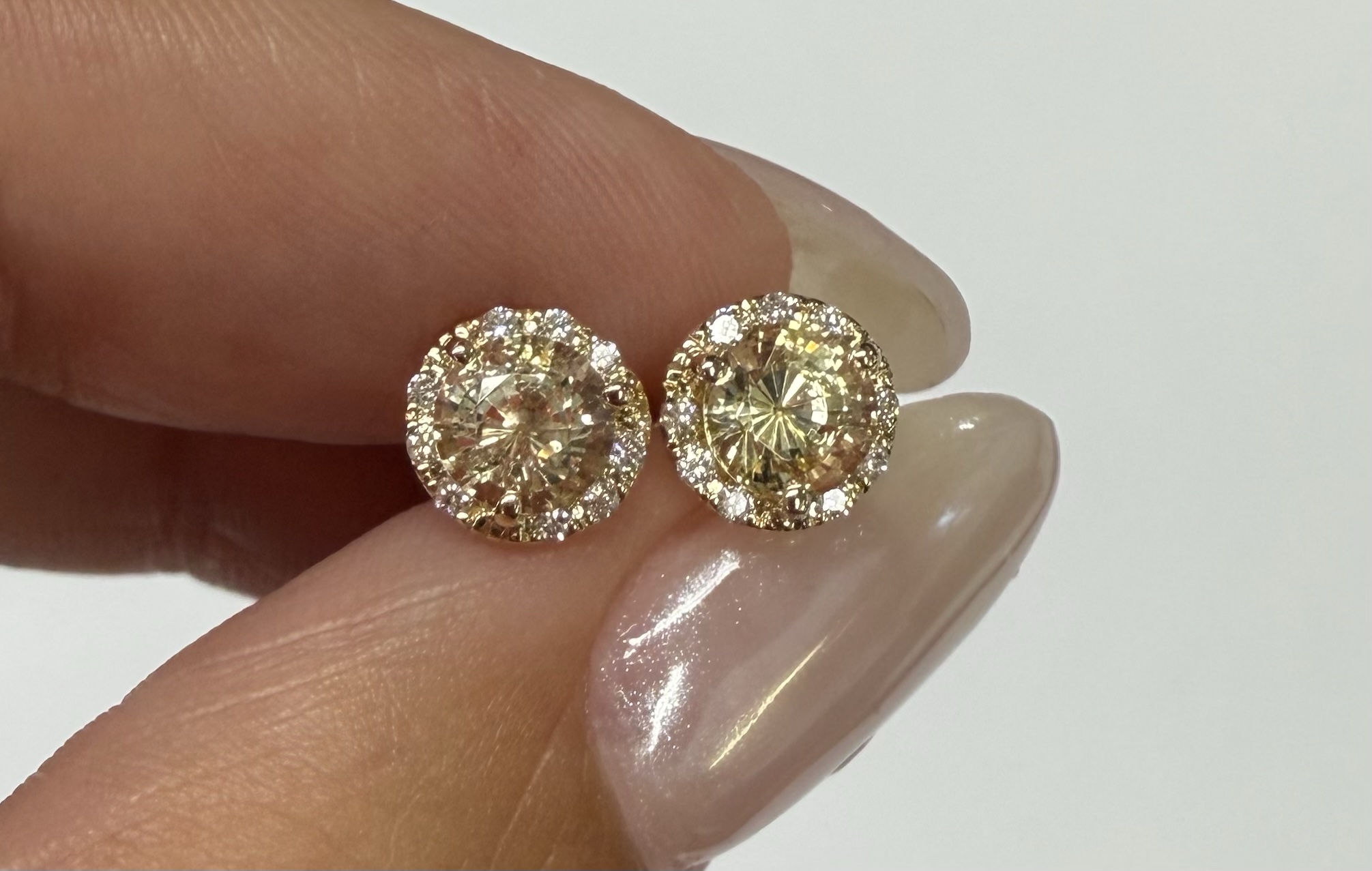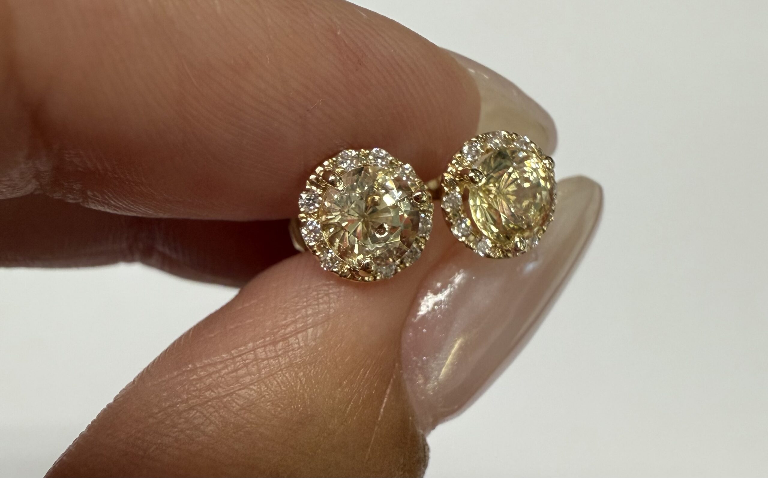 14k yellow gold genuine round, faceted 1.38 cttw Yellow Sapphire and genuine .11 cttw Round Brilliant Cut diamond halo stud earrings. These diamonds average G-H in color, and SI1 in clarity. These earrings have an entire weight of grams.