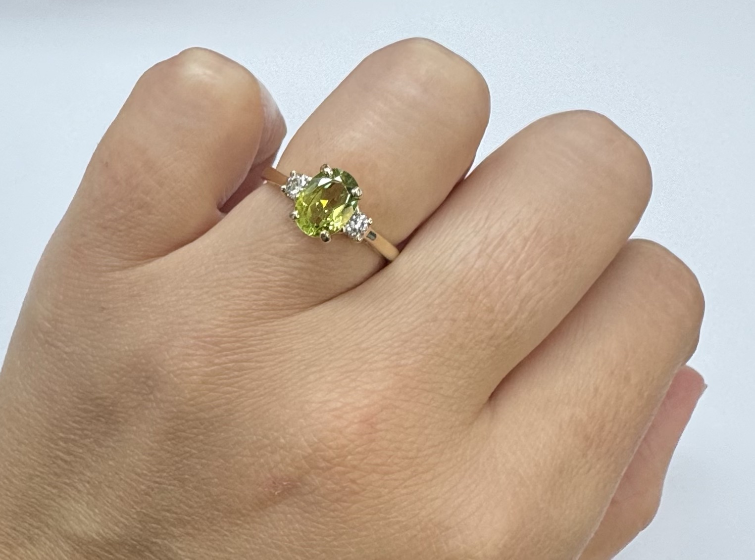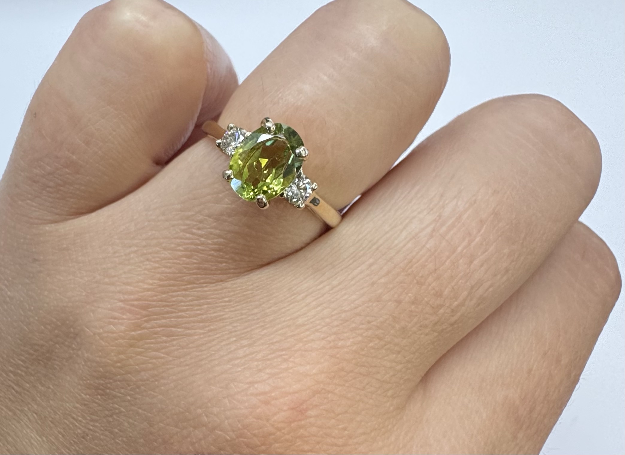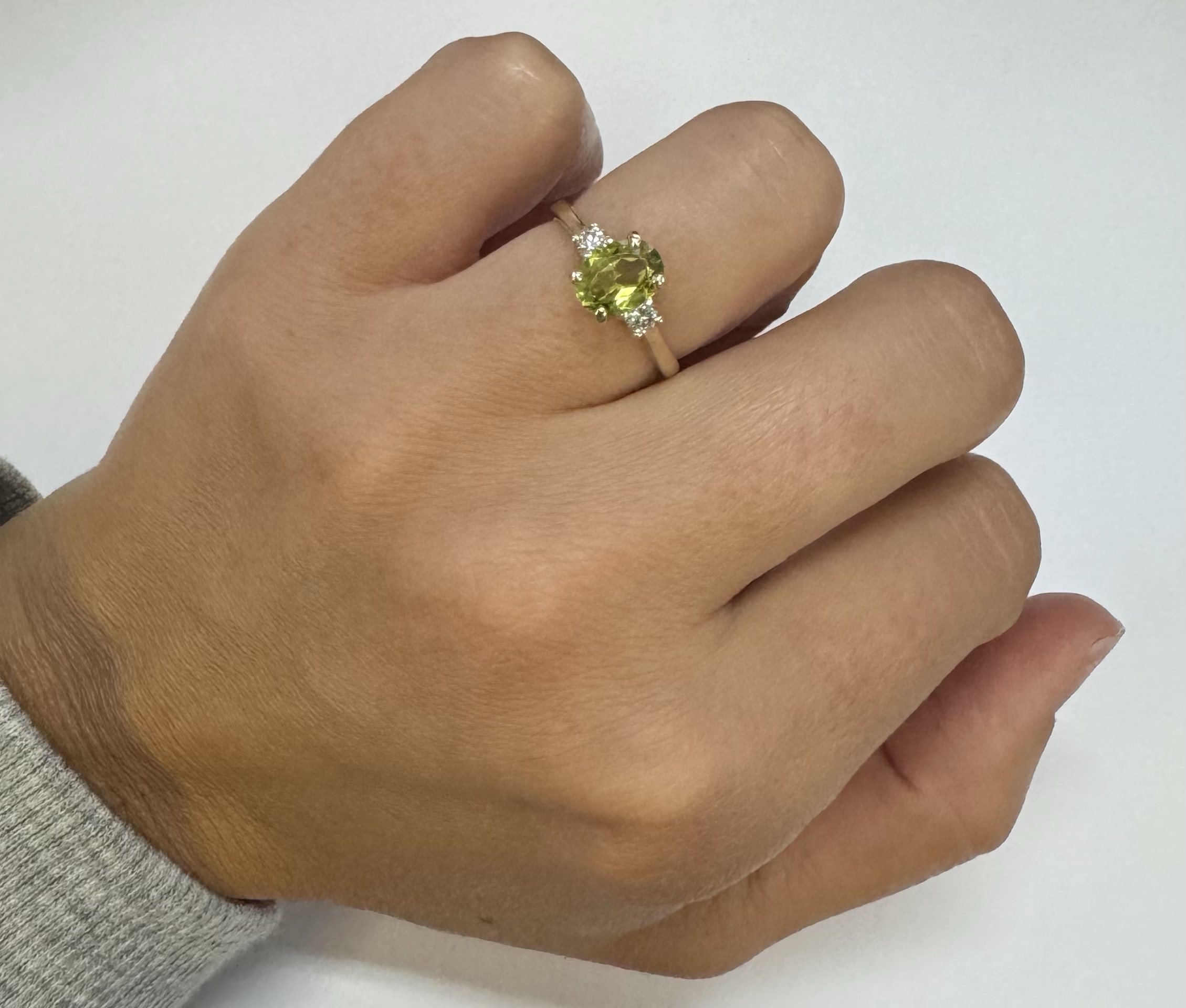 14k yellow gold genuine oval shaped, faceted 1.50 cttw Peridot (August birthstone) and genuine .20 cttw Round Brilliant Cut diamond 3 stone ring. These diamonds average G-H in color, and VS2-SI1 in clarity. This ring is a finger size 6 1/2, but it can be reasonably sized. Please make note of the finger size desired in the comments section at checkout. This ring has an entire weight of 2.6 grams.