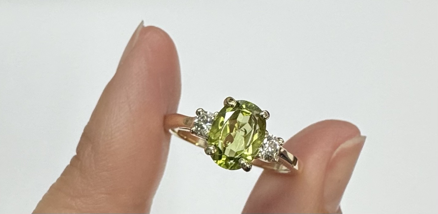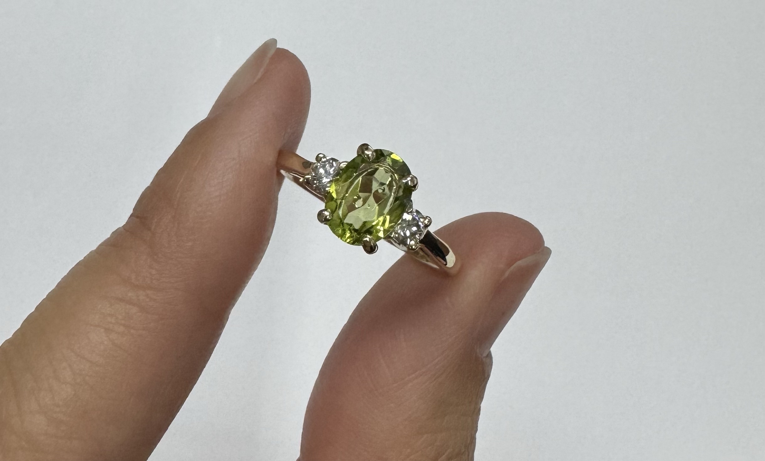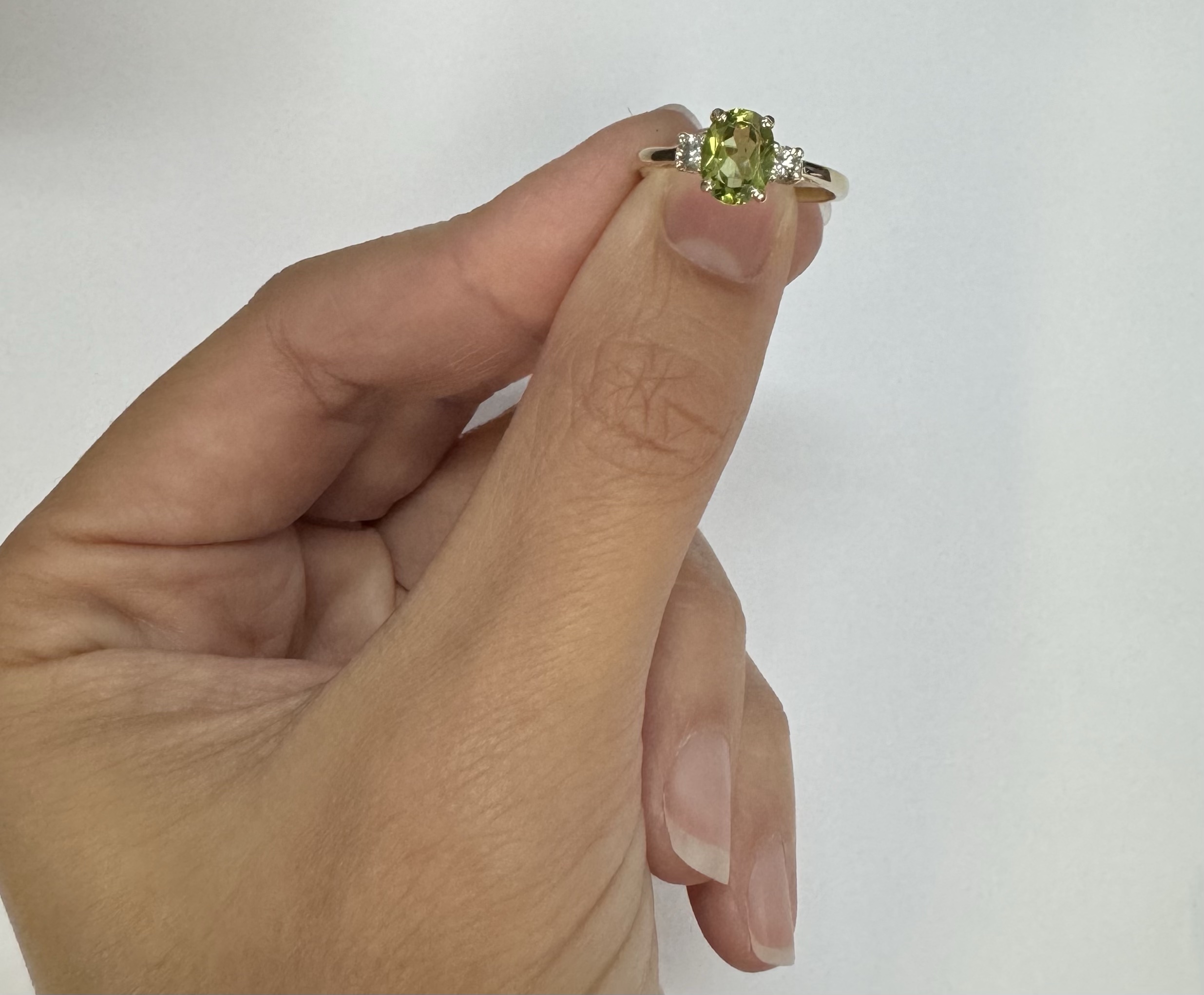 14k yellow gold genuine oval shaped, faceted 1.50 cttw Peridot (August birthstone) and genuine .20 cttw Round Brilliant Cut diamond 3 stone ring. These diamonds average G-H in color, and VS2-SI1 in clarity. This ring is a finger size 6 1/2, but it can be reasonably sized. Please make note of the finger size desired in the comments section at checkout. This ring has an entire weight of 2.6 grams.
