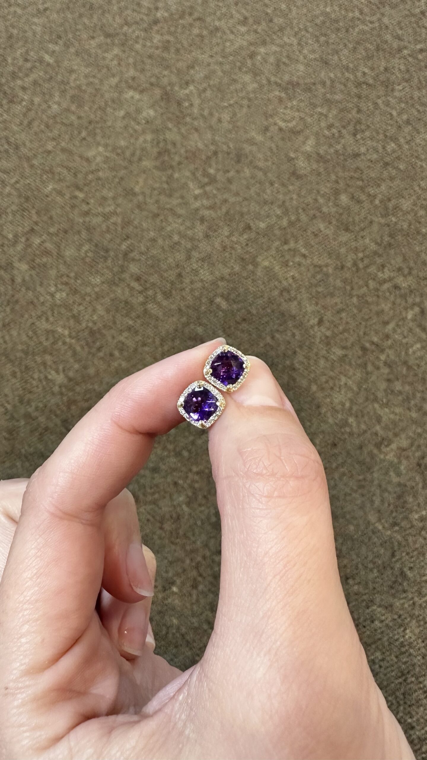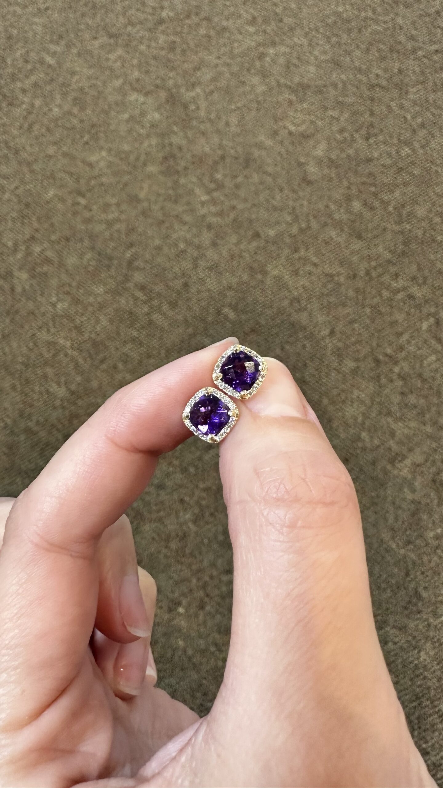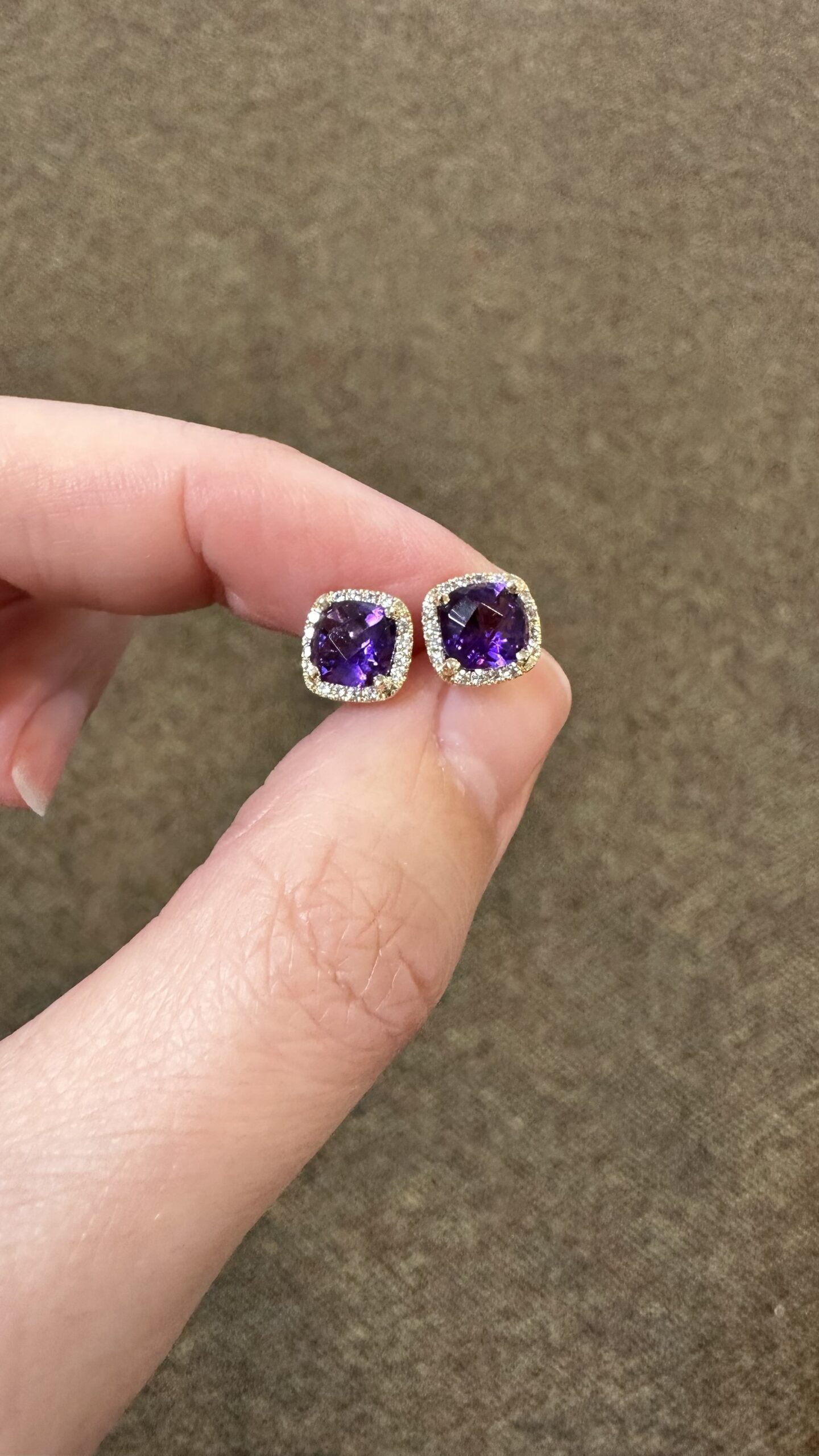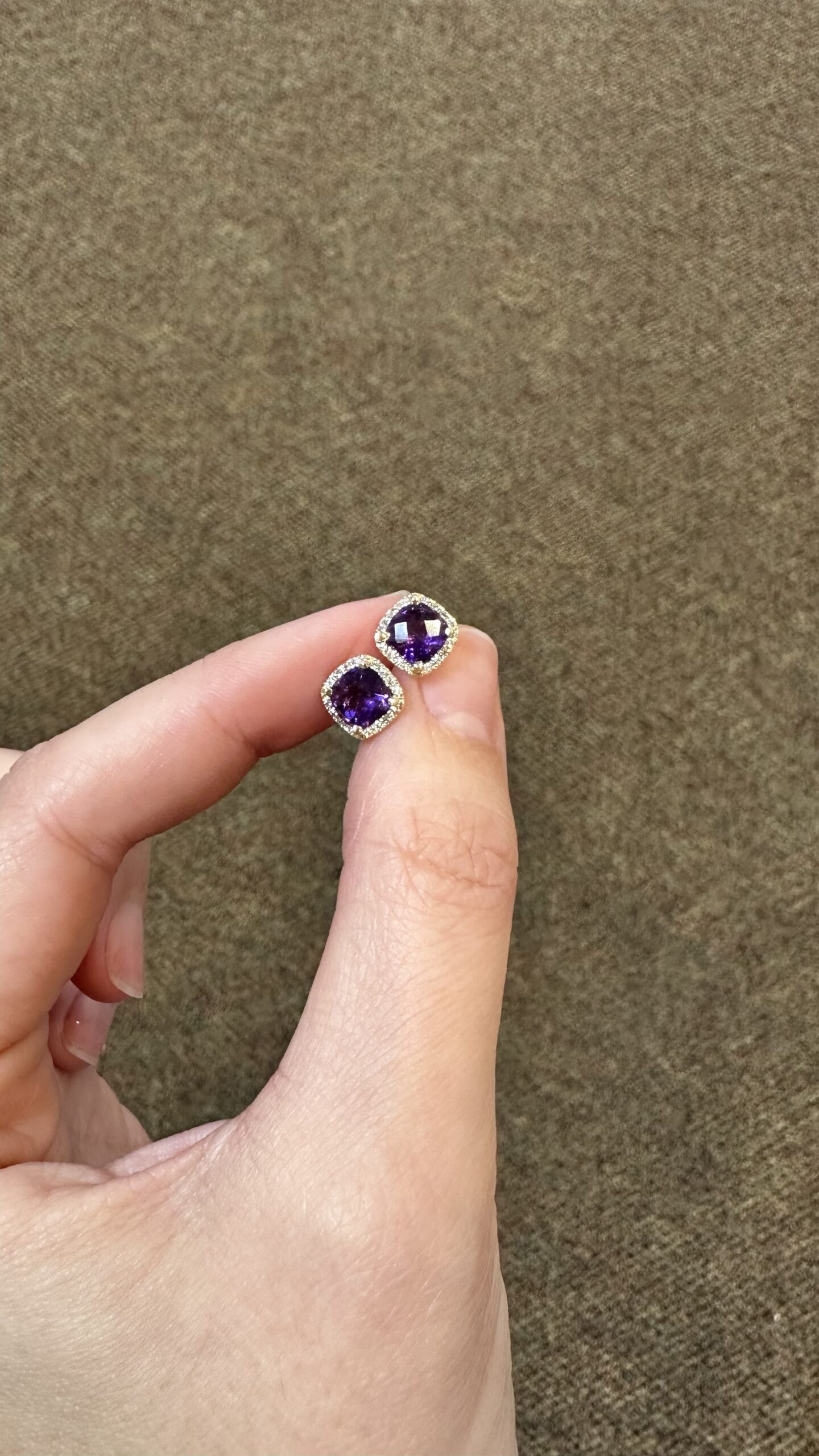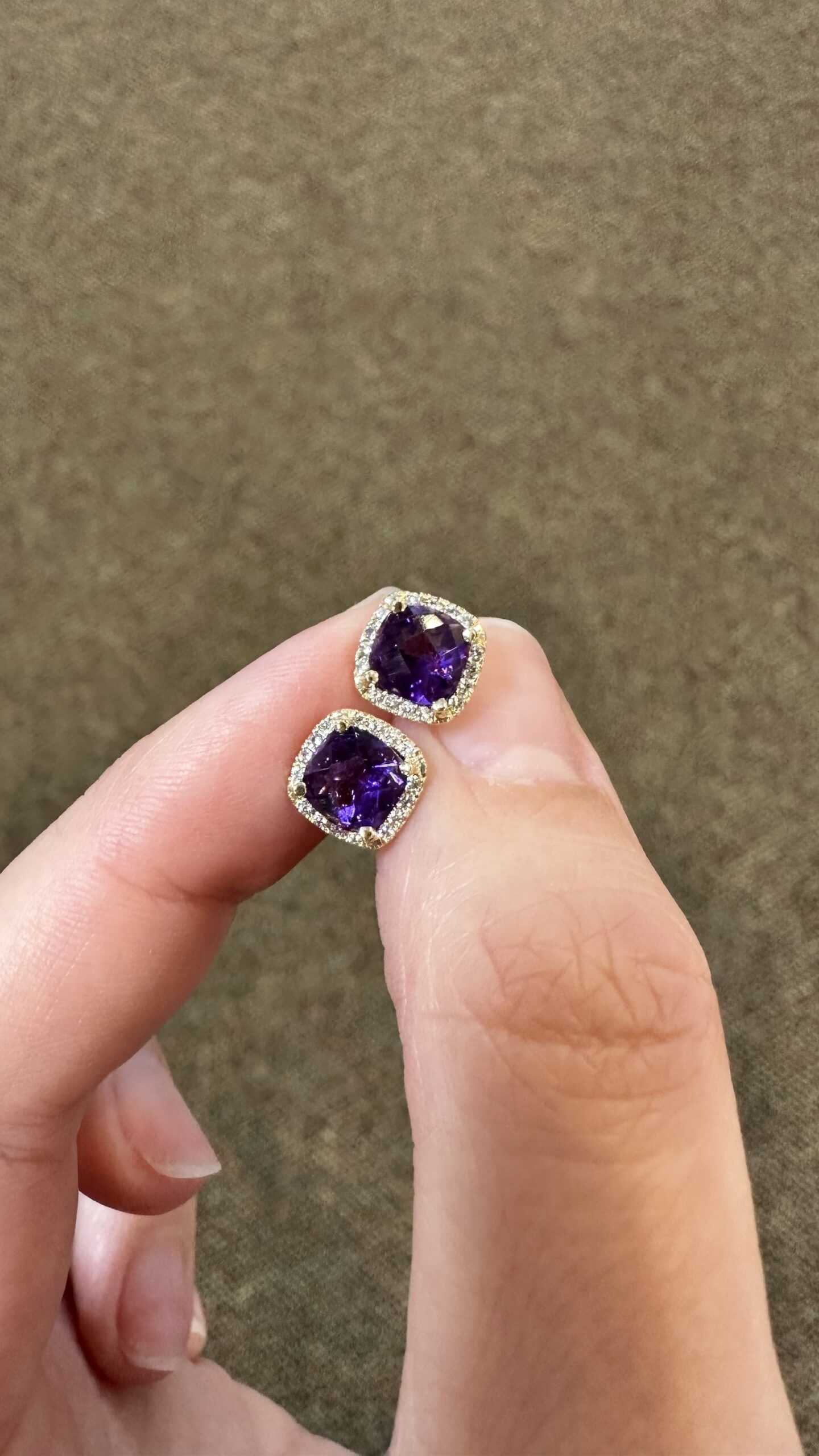 14k yellow gold genuine 1.70 cttw cushion shaped Amethyst (February birthstone) & genuine .17 cttw Round Brilliant Cut diamond halo stud earrings. These diamonds average G-H in color and SI in clarity, These earrings measure 8 mm in size and they have an entire weight of 1.5 grams.