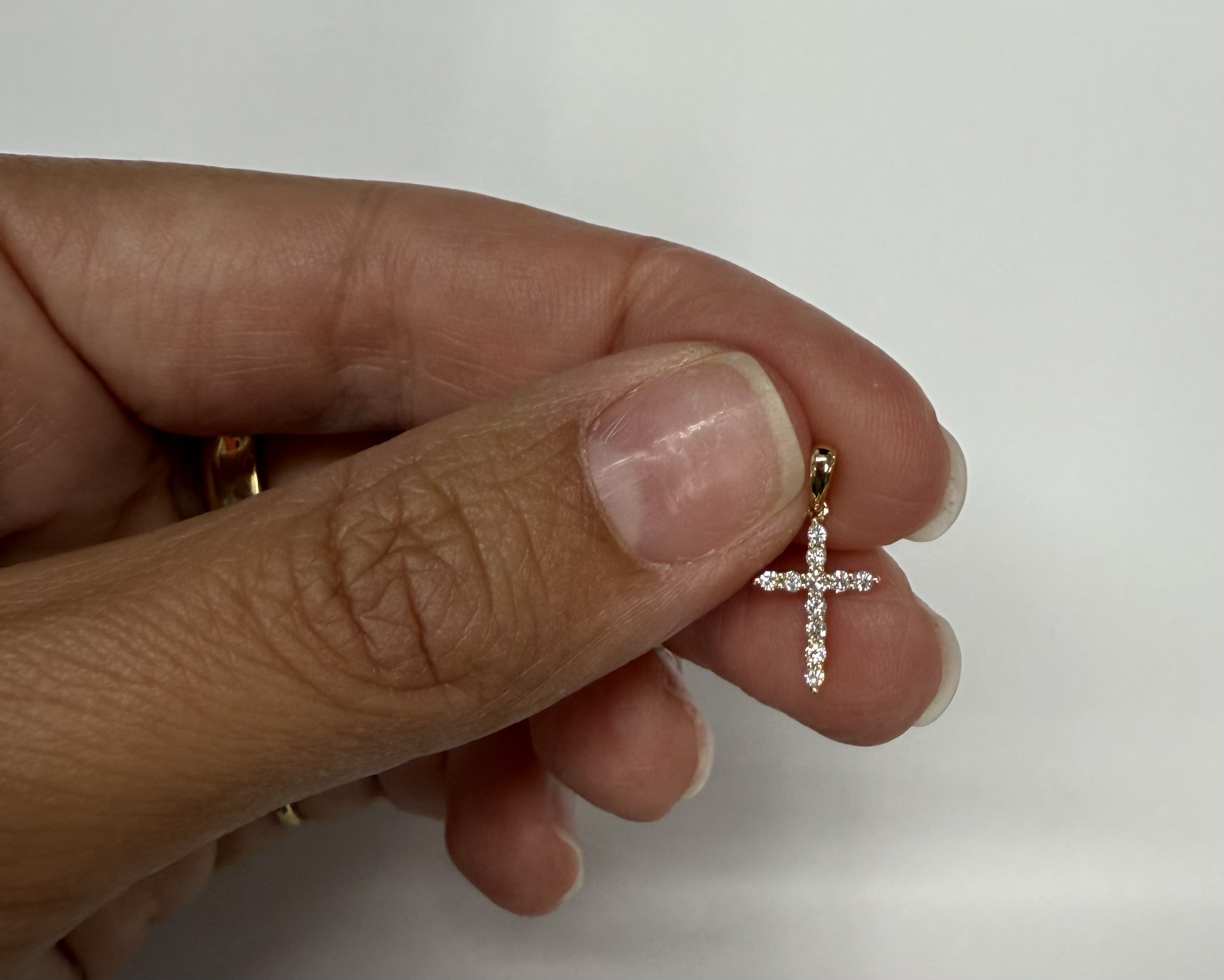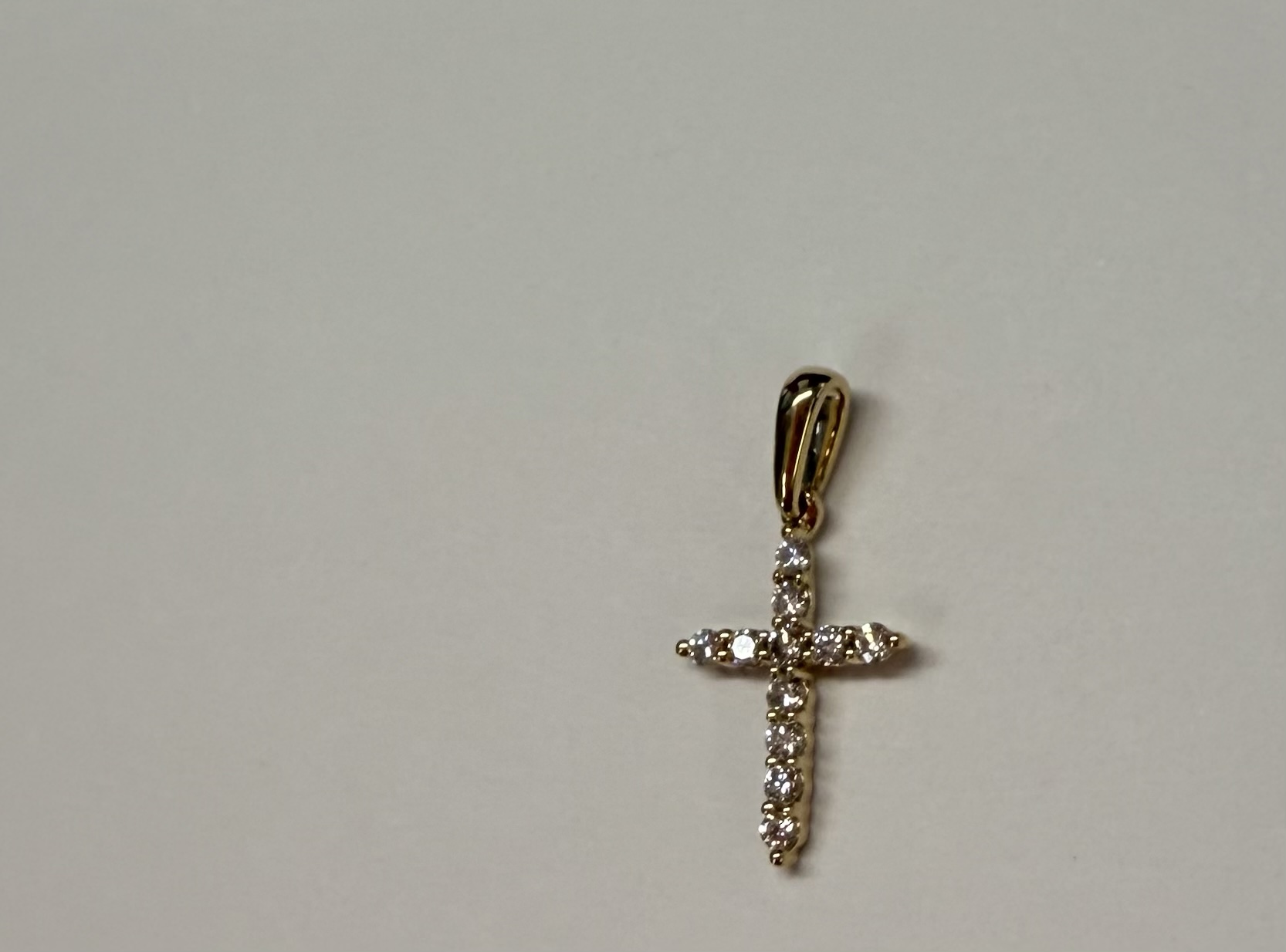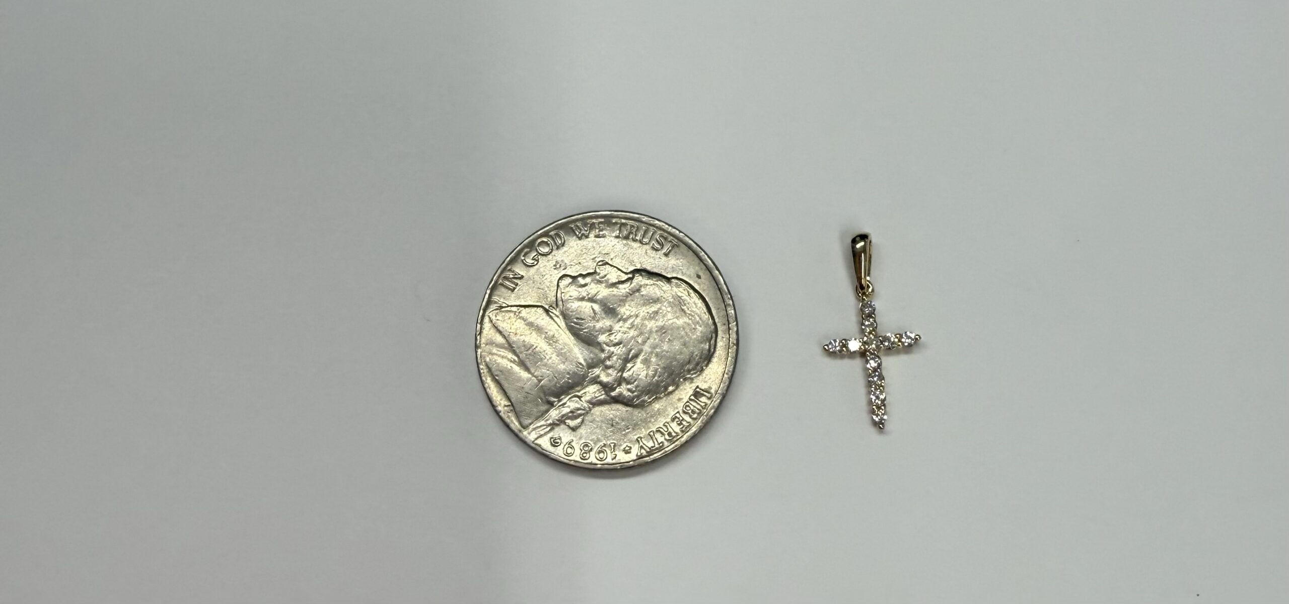 The sweetest little 14k yellow gold genuine .10 cttw Round Brilliant Cut diamond cross pendant. The diamonds average H-I in color and SI2 in clarity. This pendant has an entire weight of 0.3 grams.