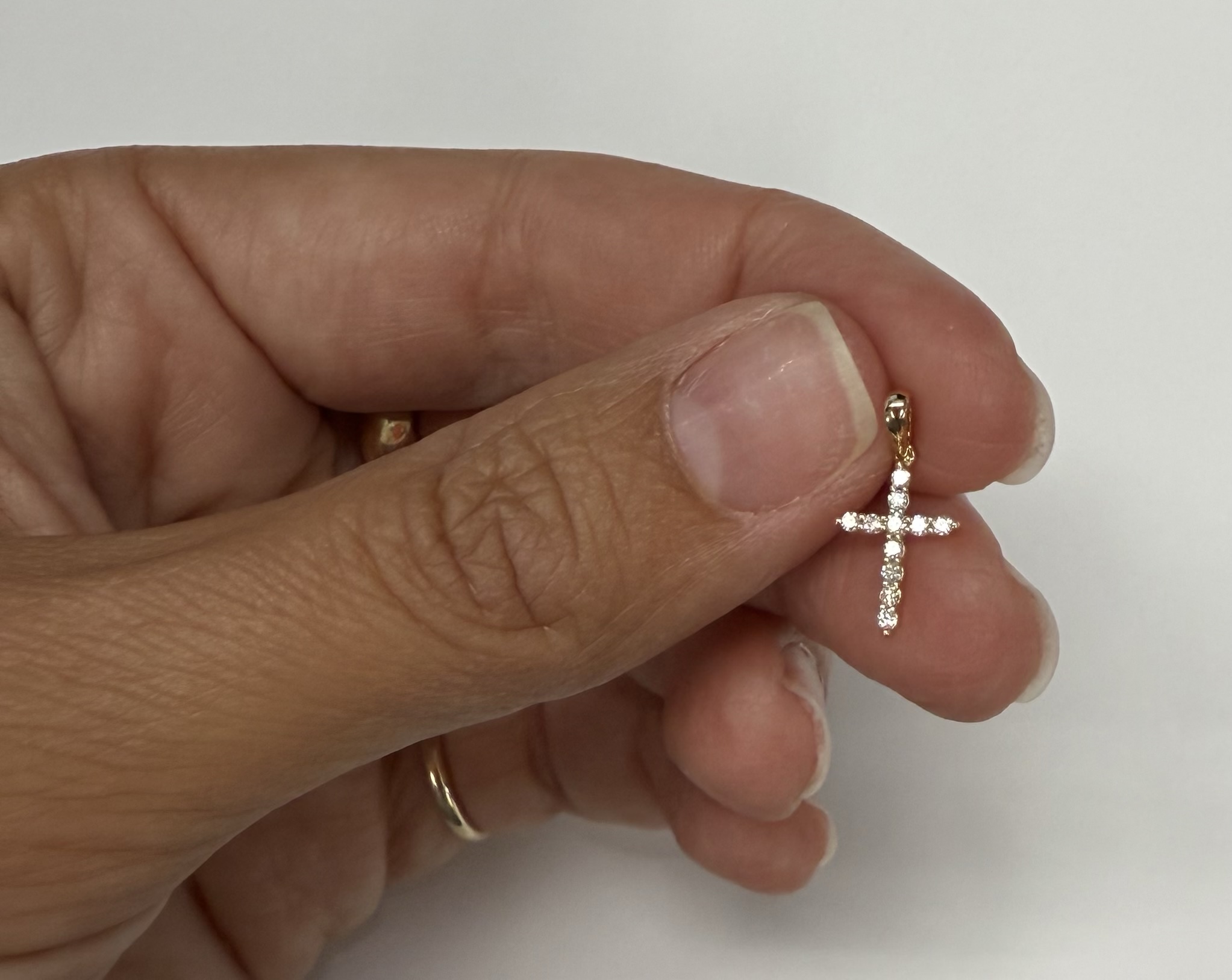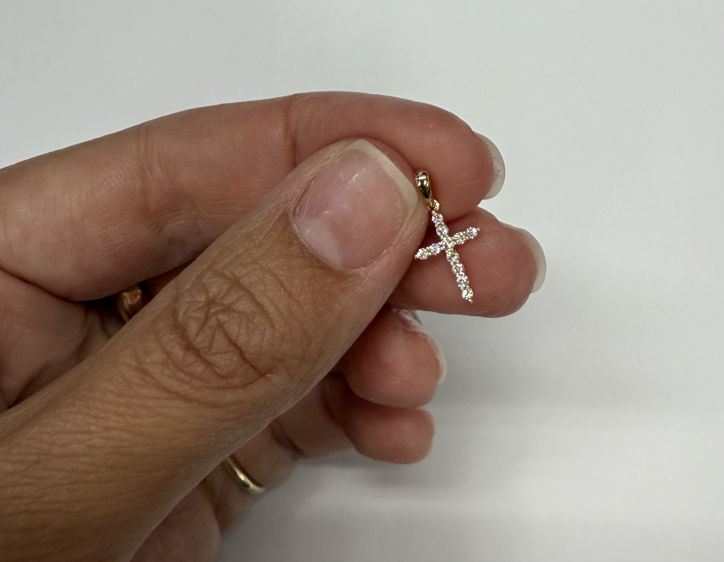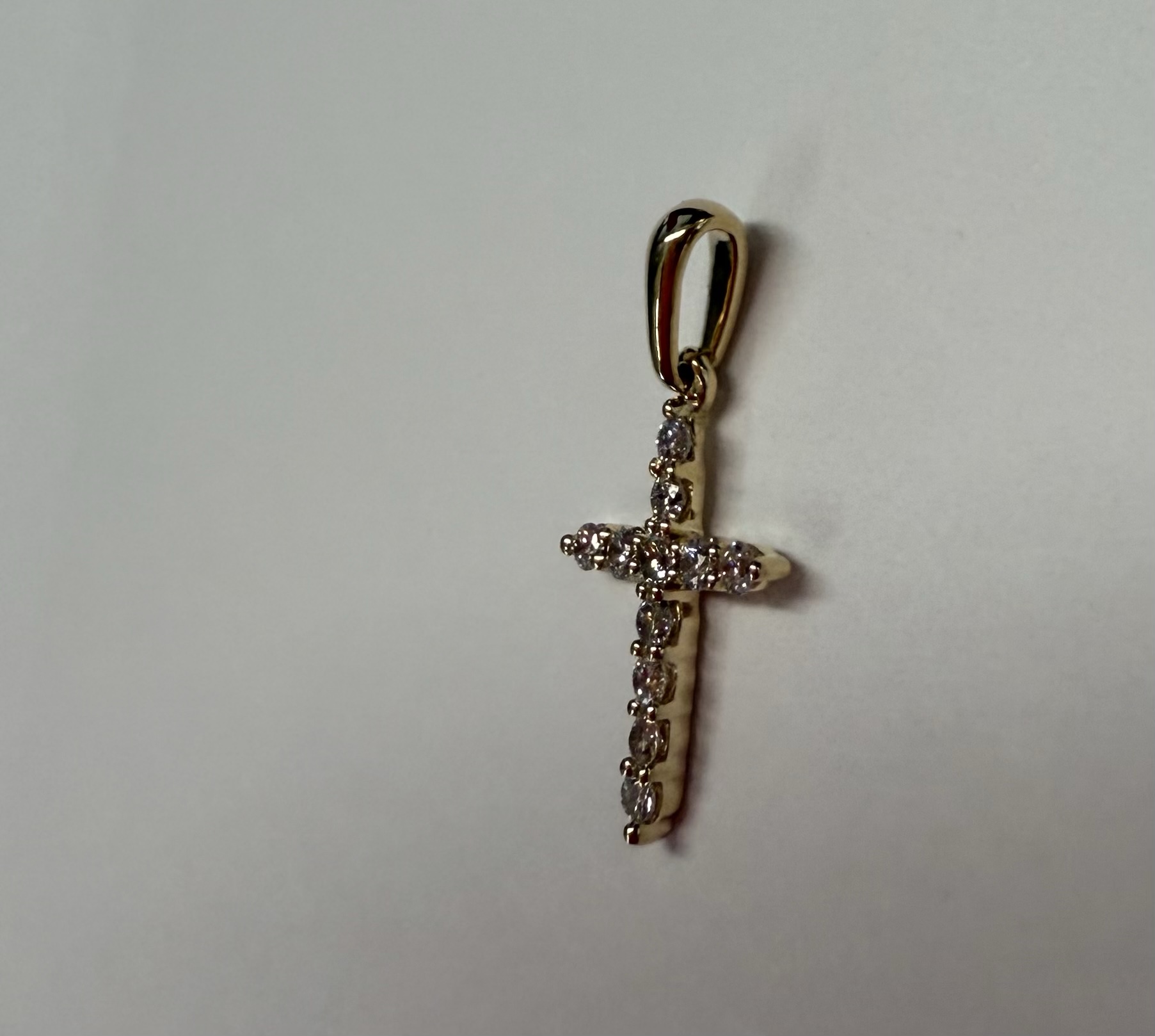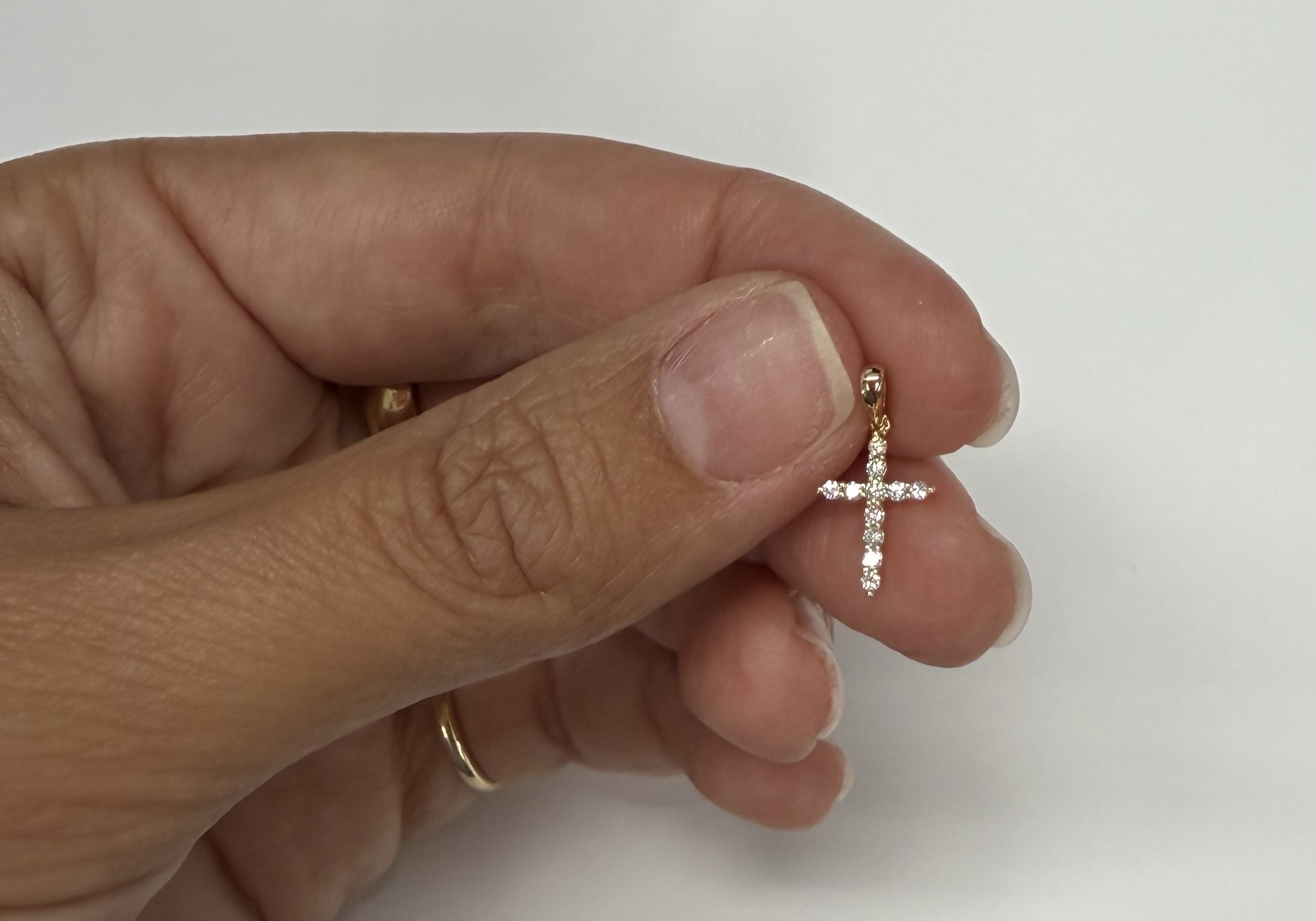 The sweetest little 14k yellow gold genuine .10 cttw Round Brilliant Cut diamond cross pendant. The diamonds average H-I in color and SI2 in clarity. This pendant has an entire weight of 0.3 grams.