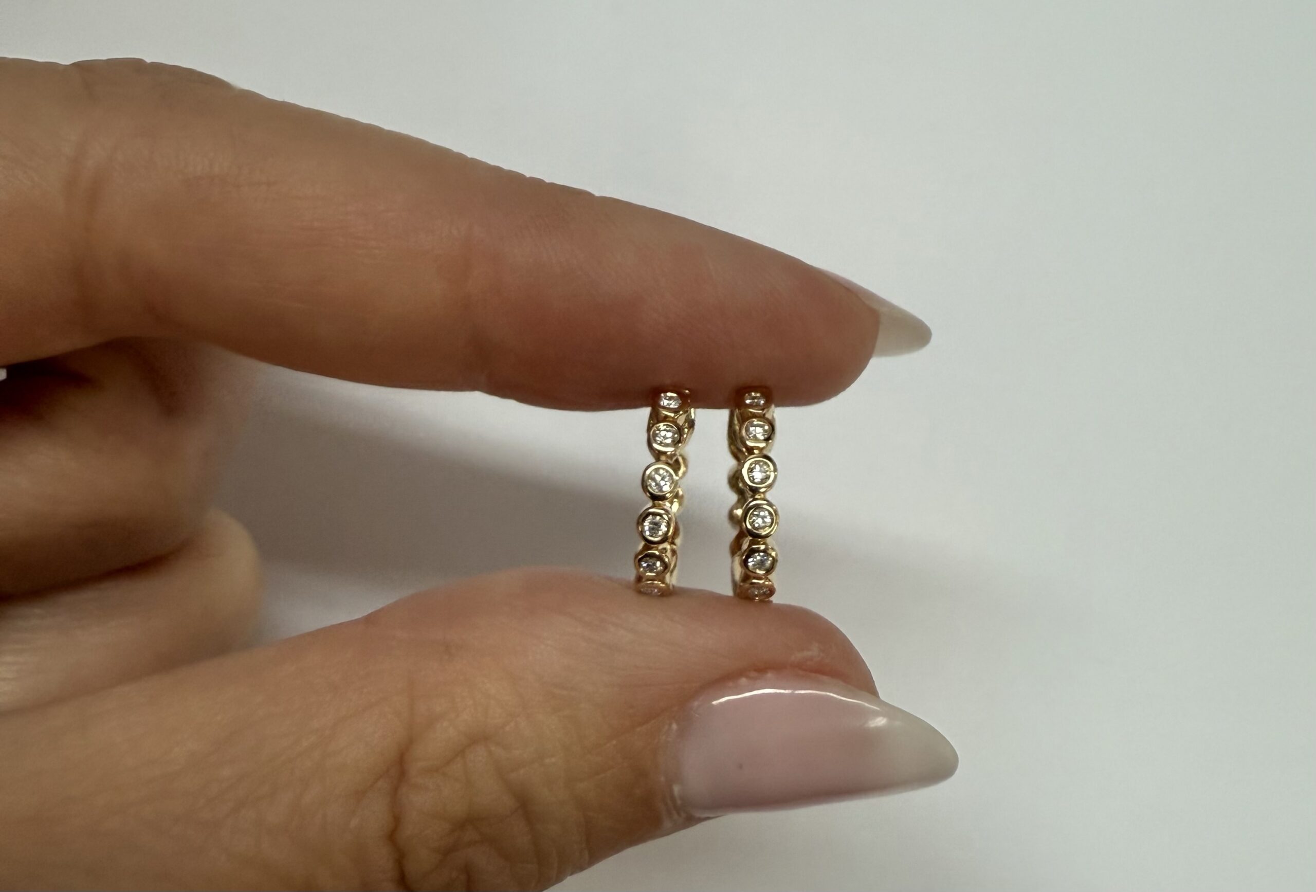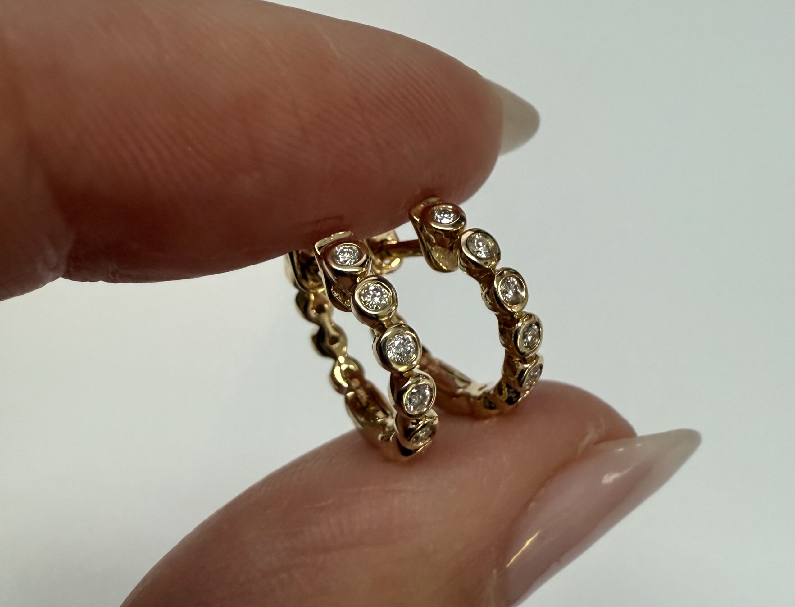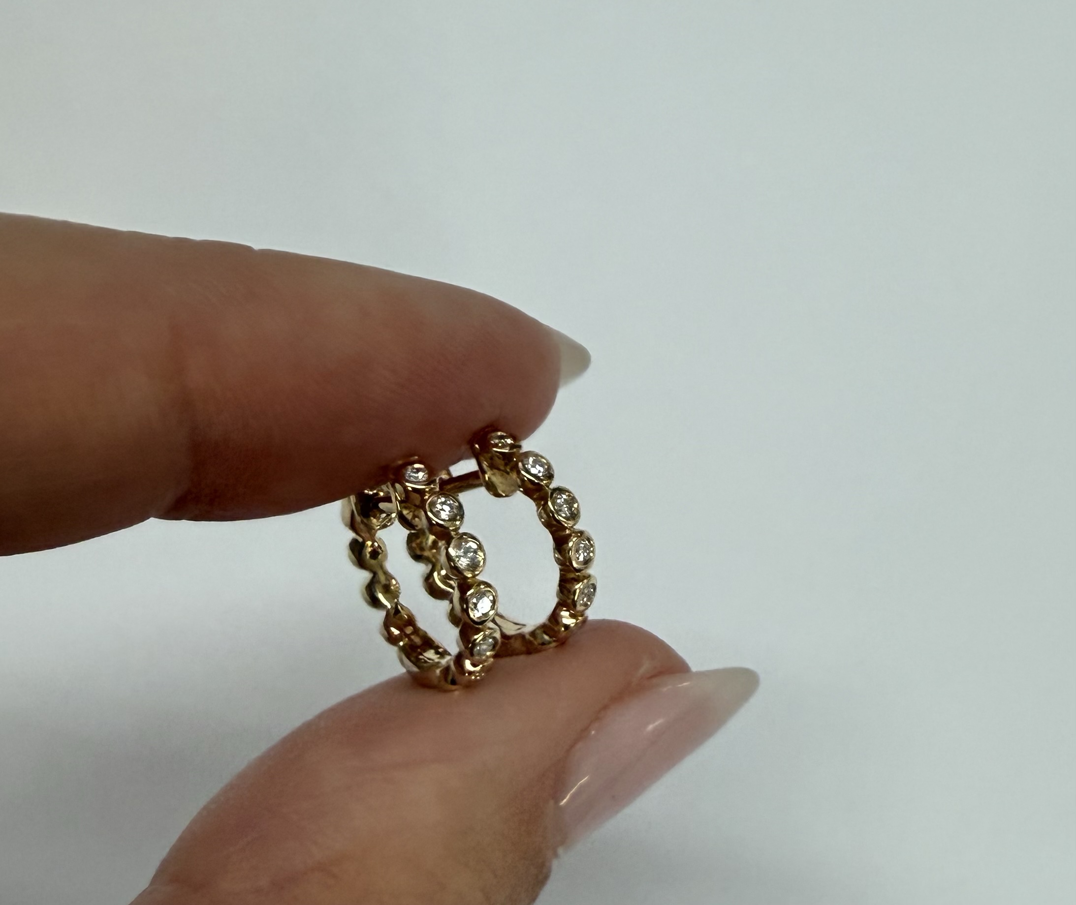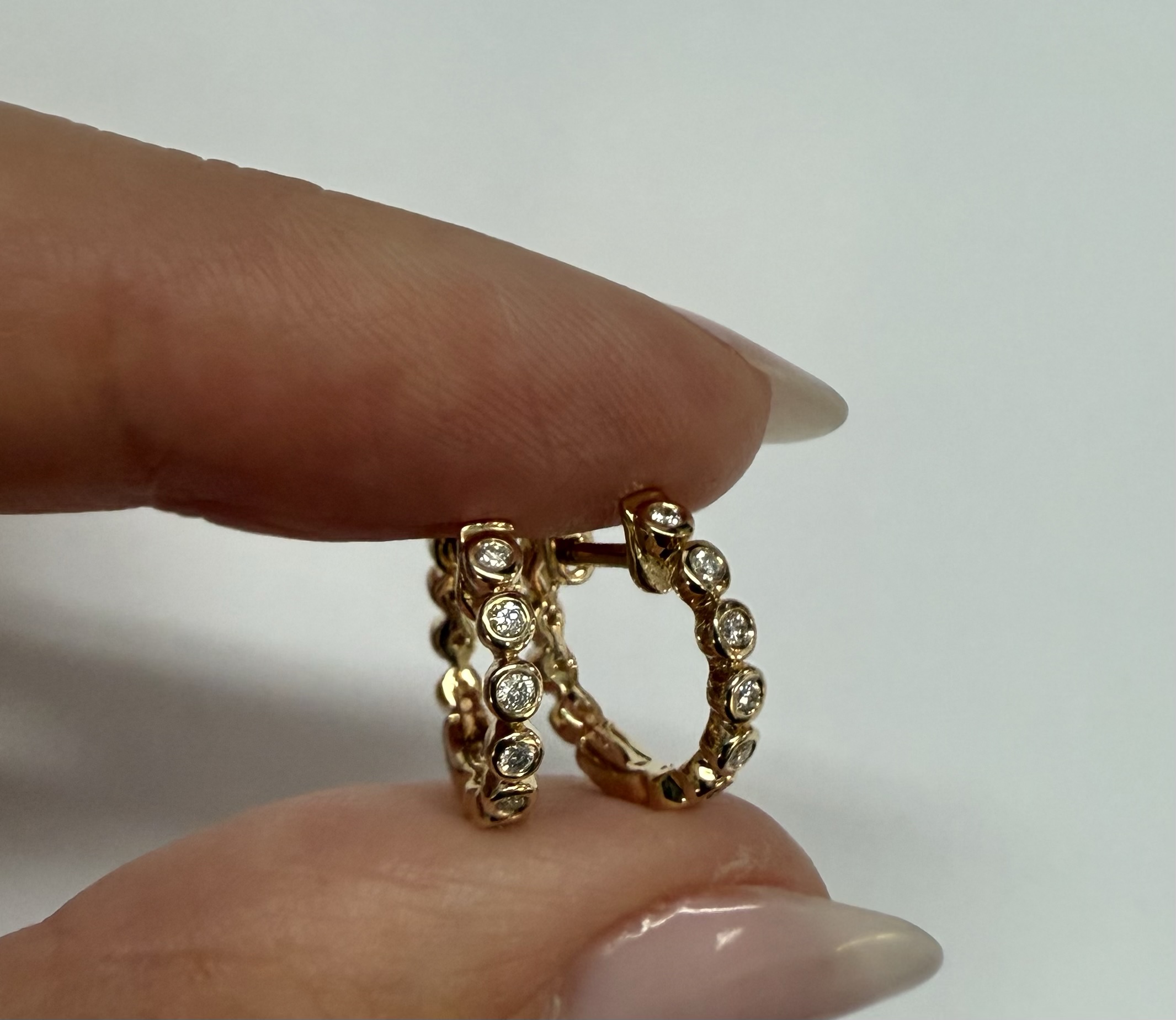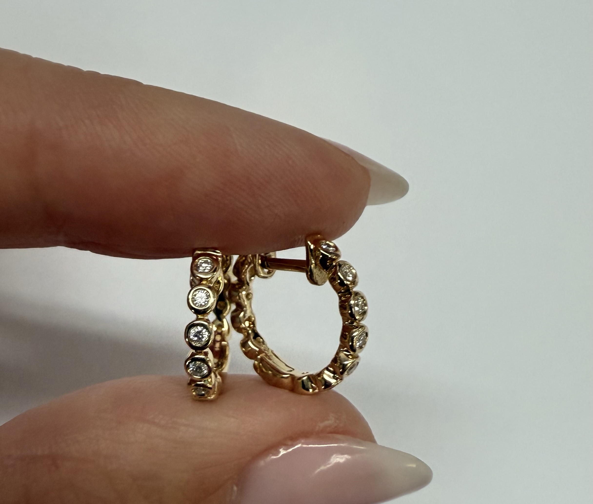 14k yellow gold bezel set genuine .15 cttw Round Brilliant Cut diamond hoop earrings. The diamonds average G-H in color, and SI1 in clarity. These earrings have an entire weight of 2.2 grams.