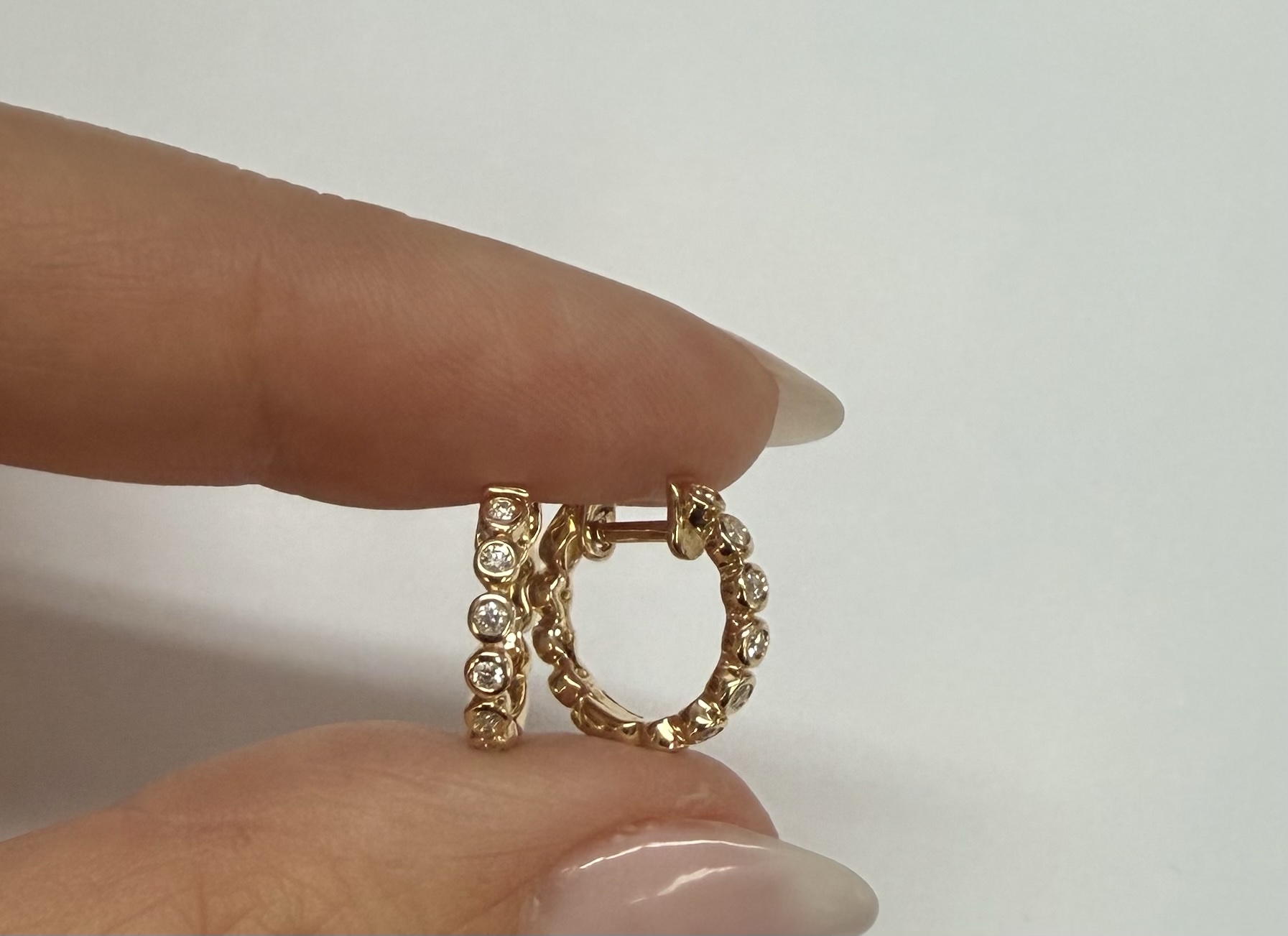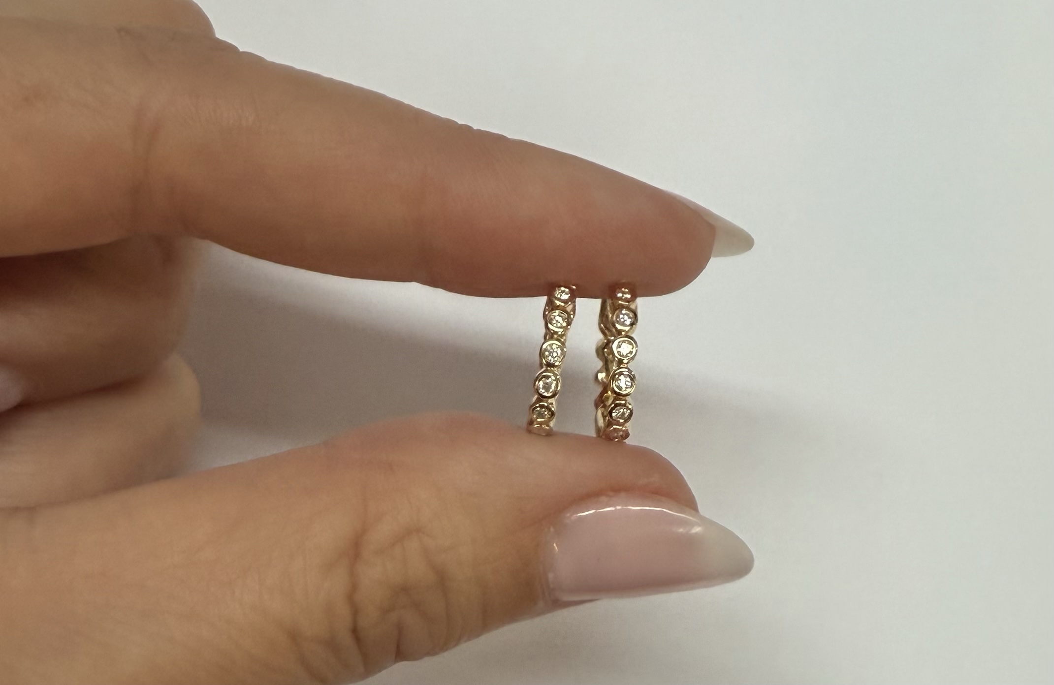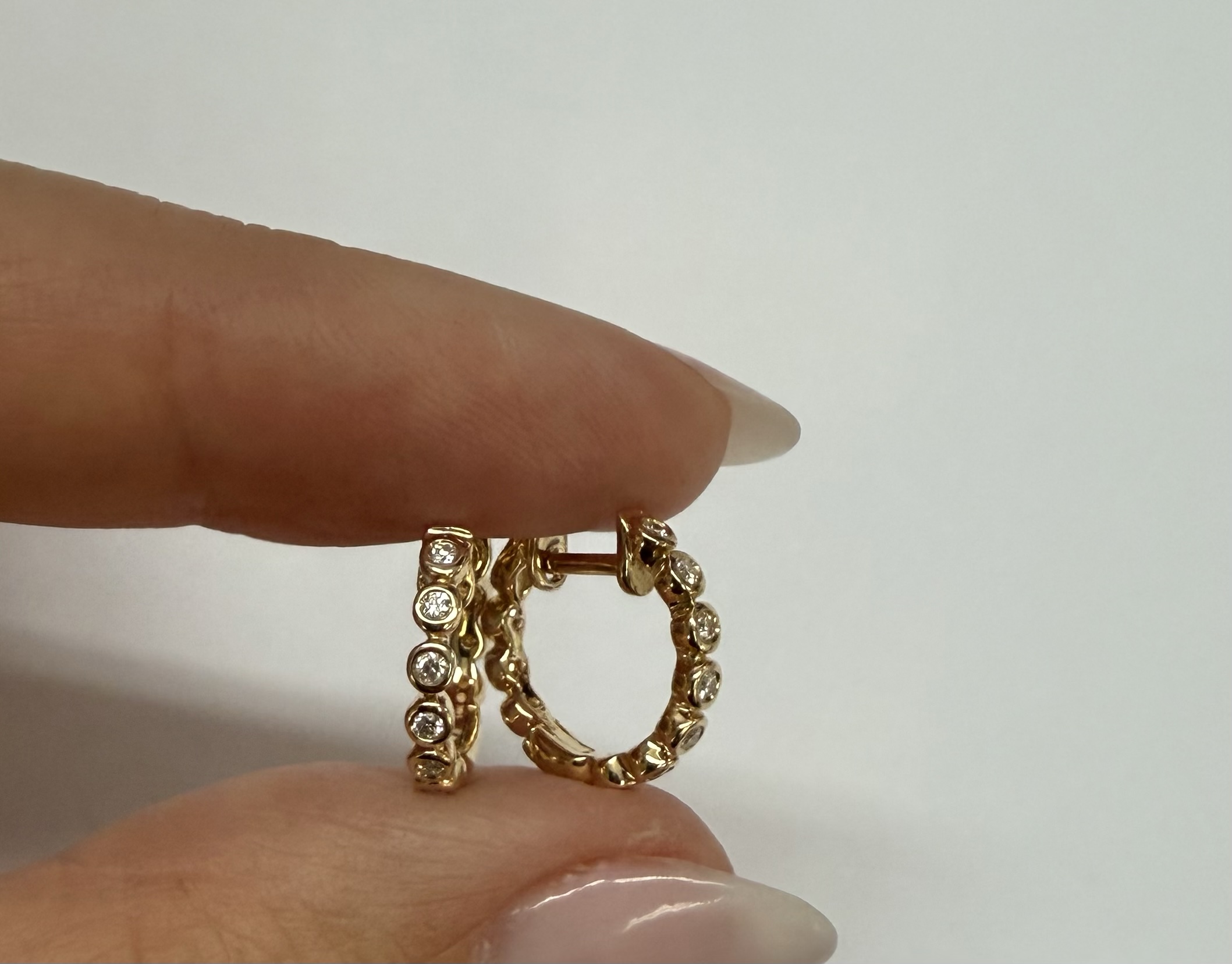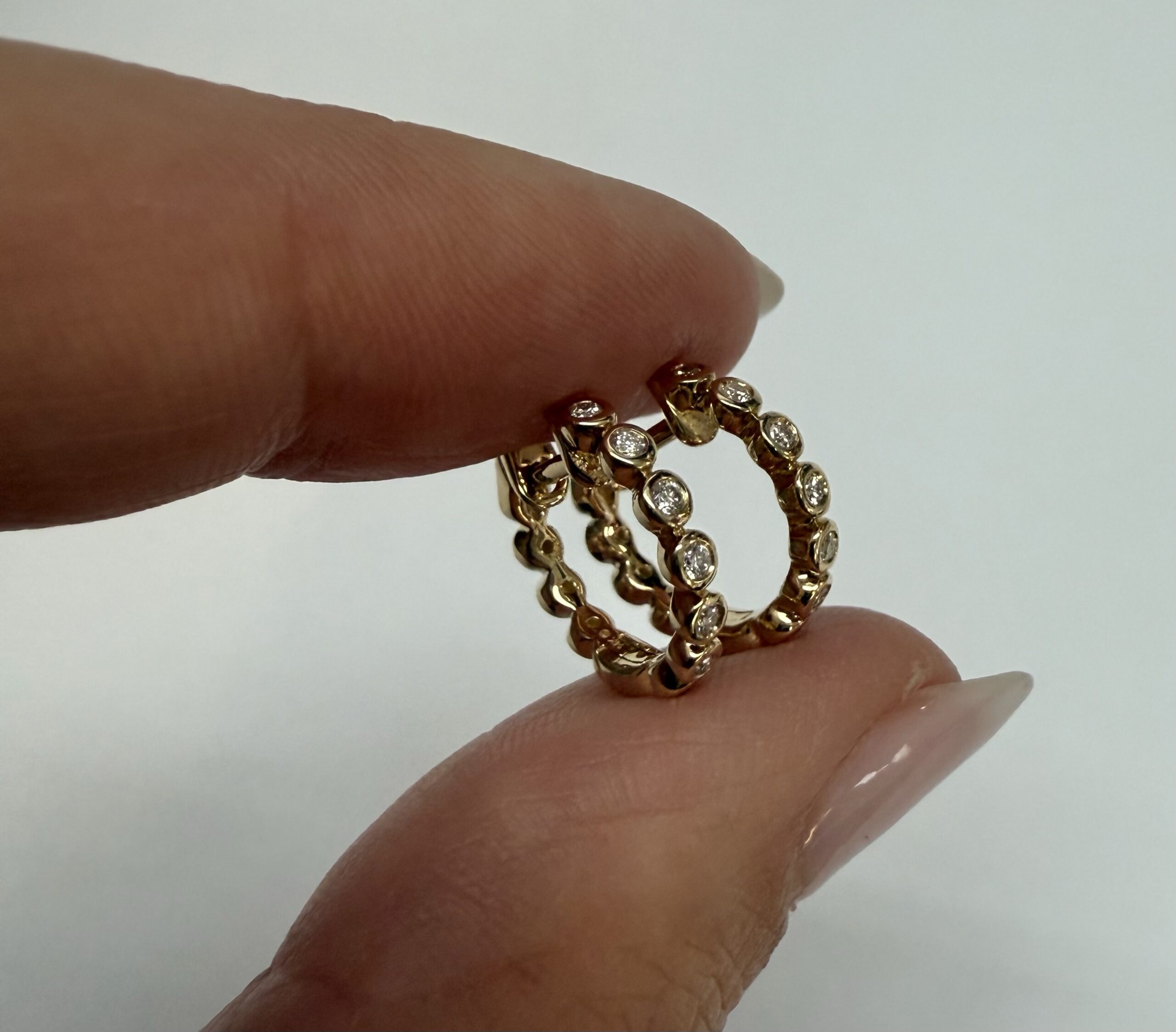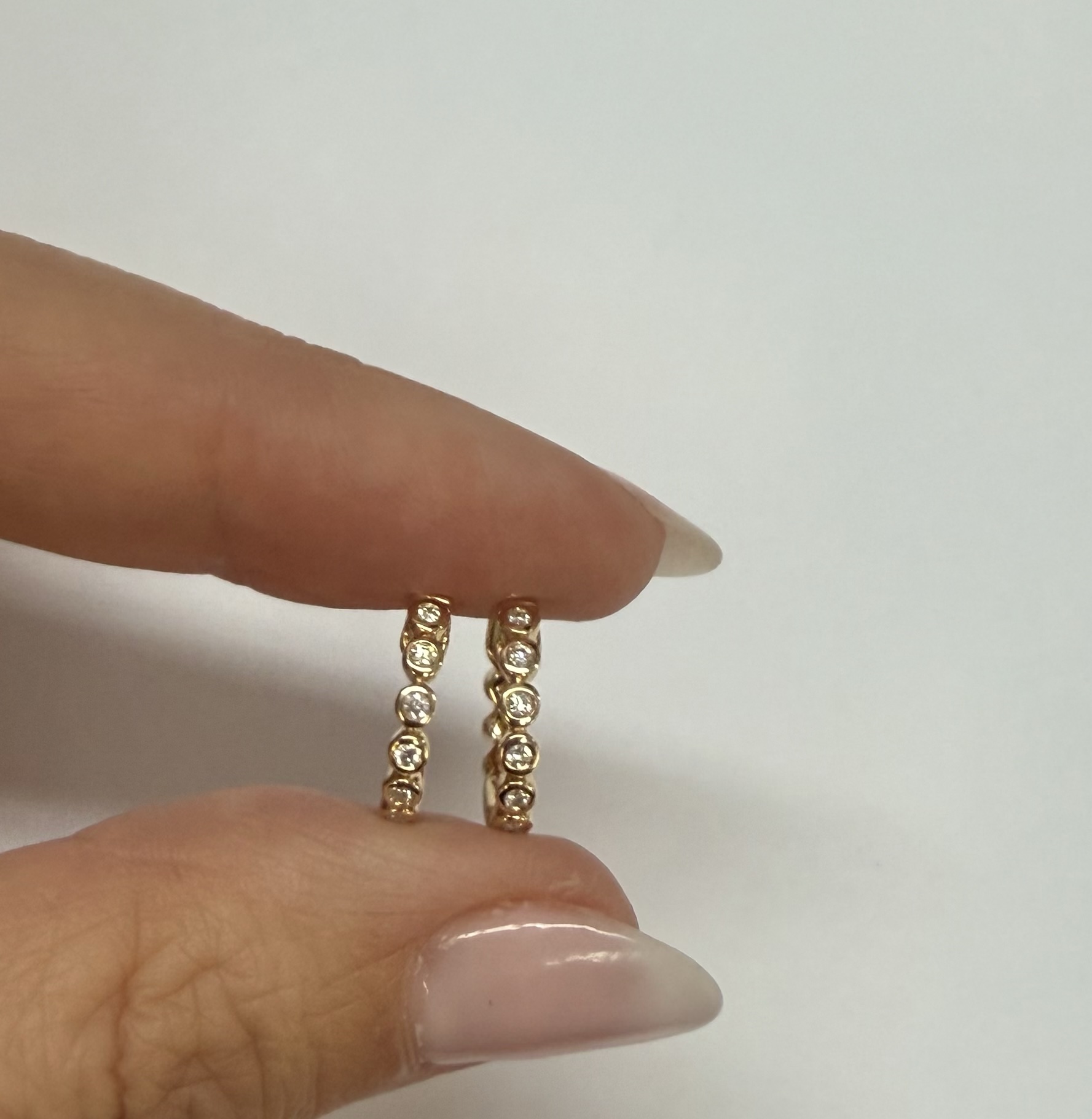 14k yellow gold bezel set genuine .15 cttw Round Brilliant Cut diamond hoop earrings. The diamonds average G-H in color, and SI1 in clarity. These earrings have an entire weight of 2.2 grams.