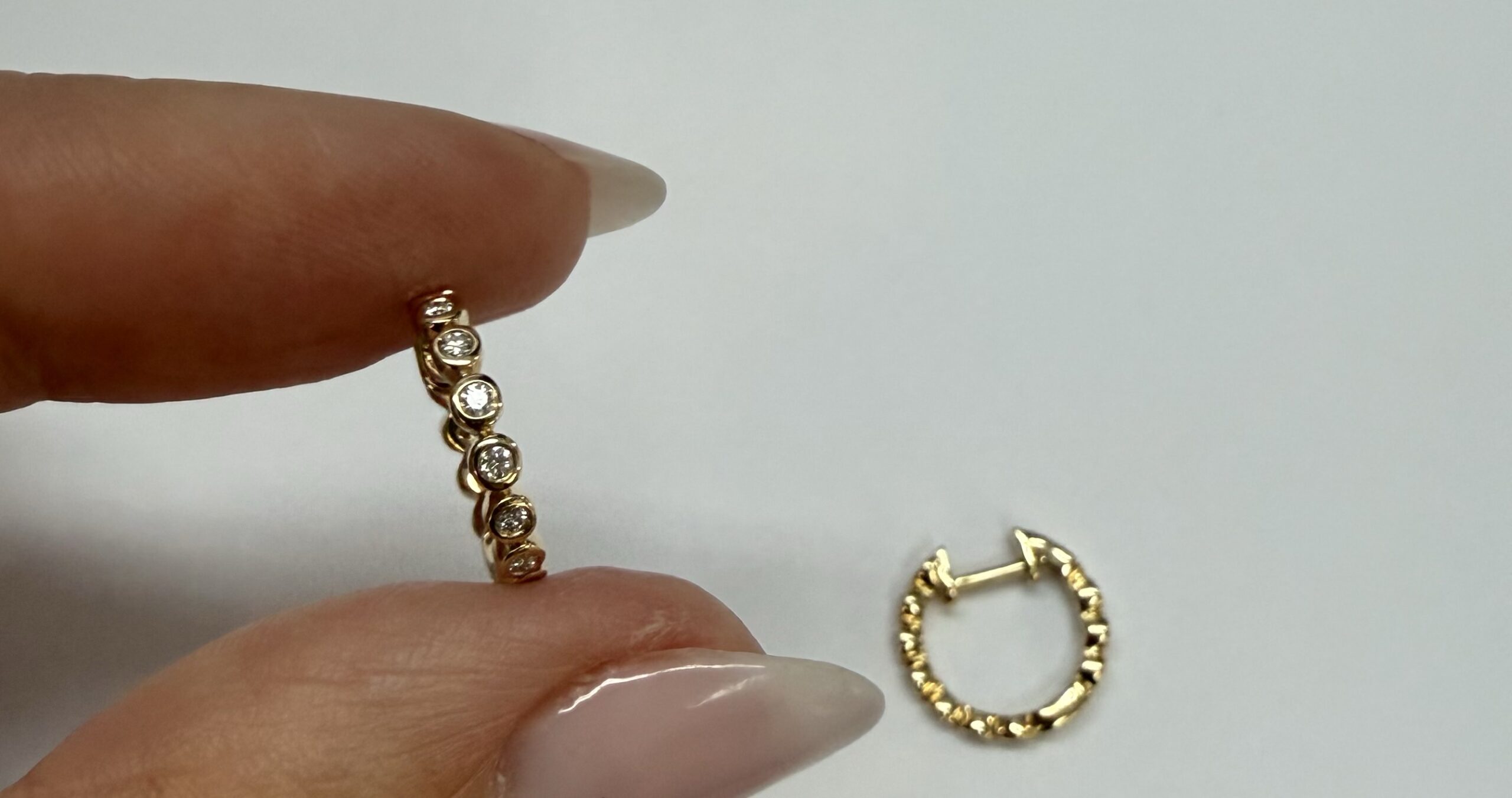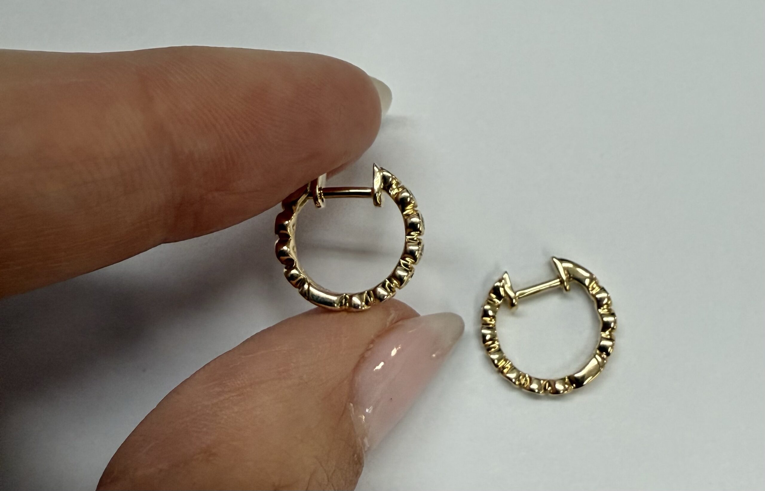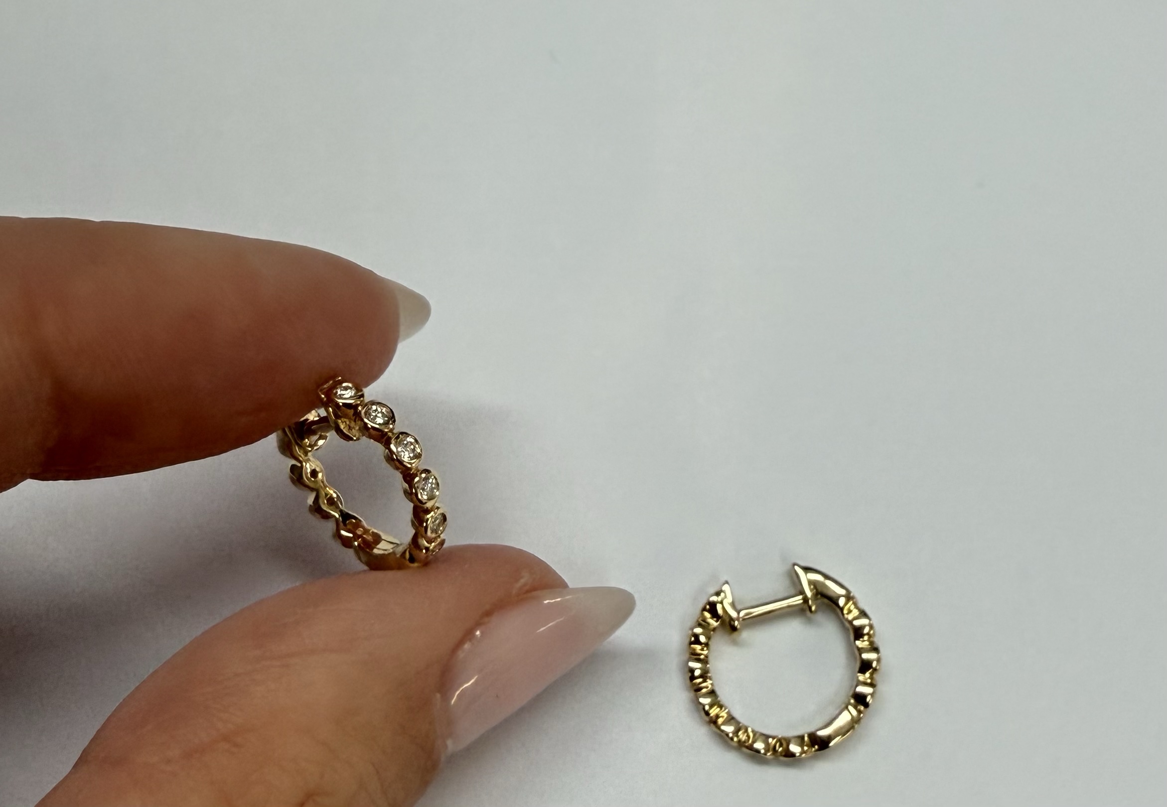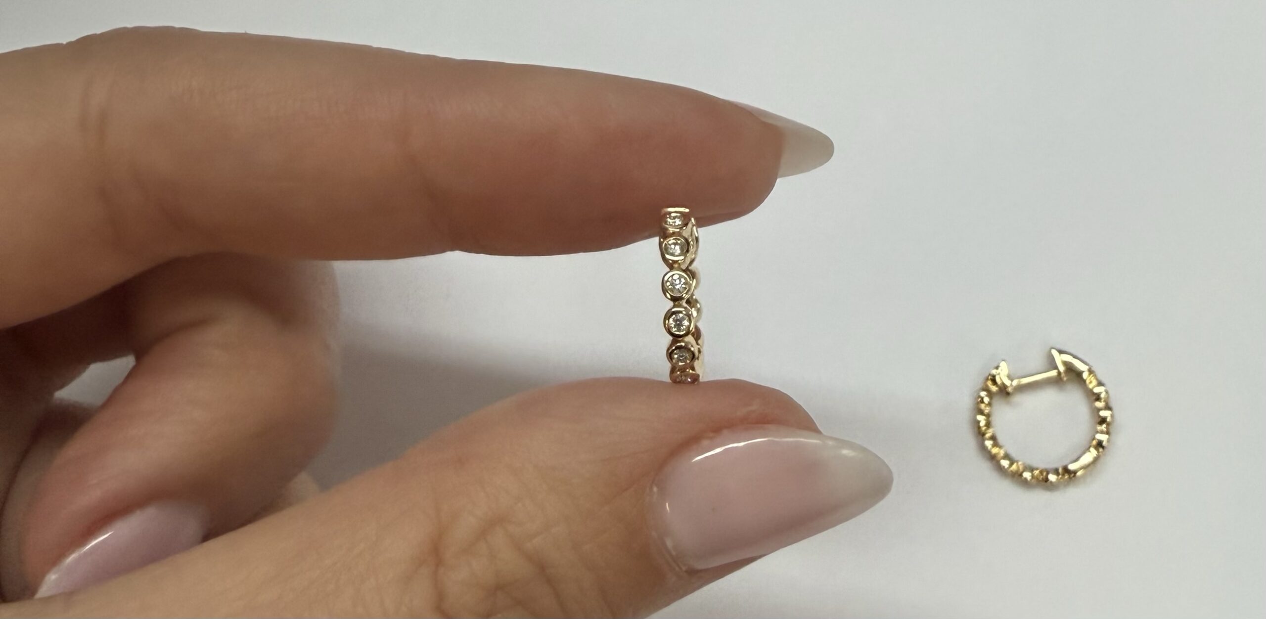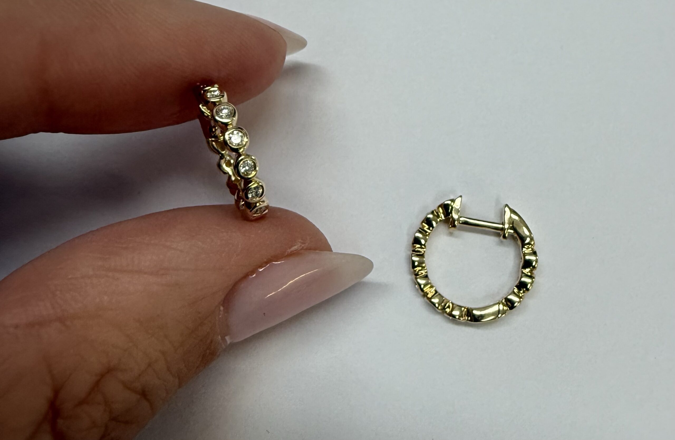 14k yellow gold bezel set genuine .15 cttw Round Brilliant Cut diamond hoop earrings. The diamonds average G-H in color, and SI1 in clarity. These earrings have an entire weight of 2.2 grams.