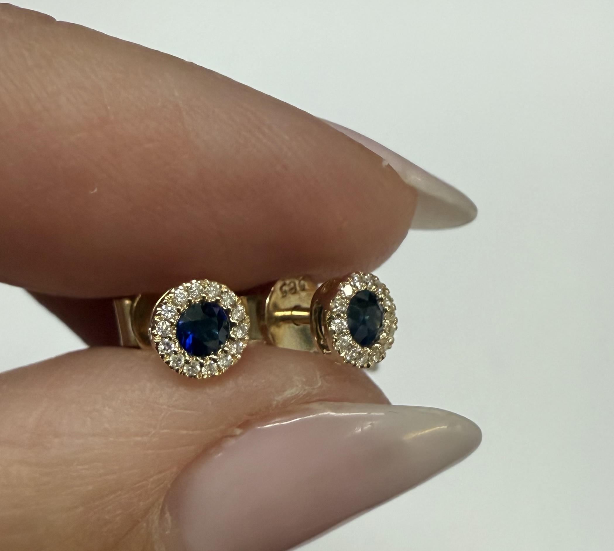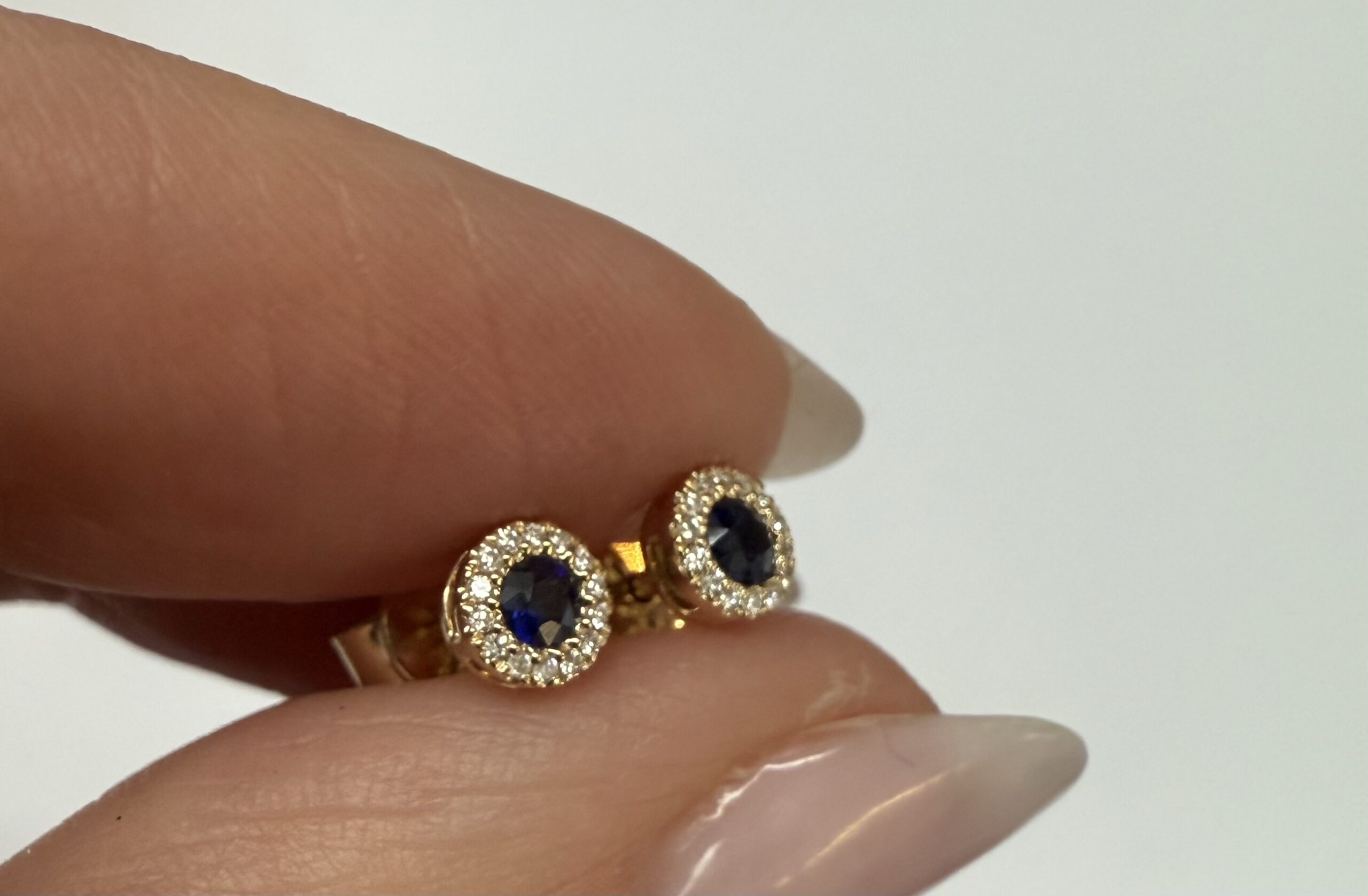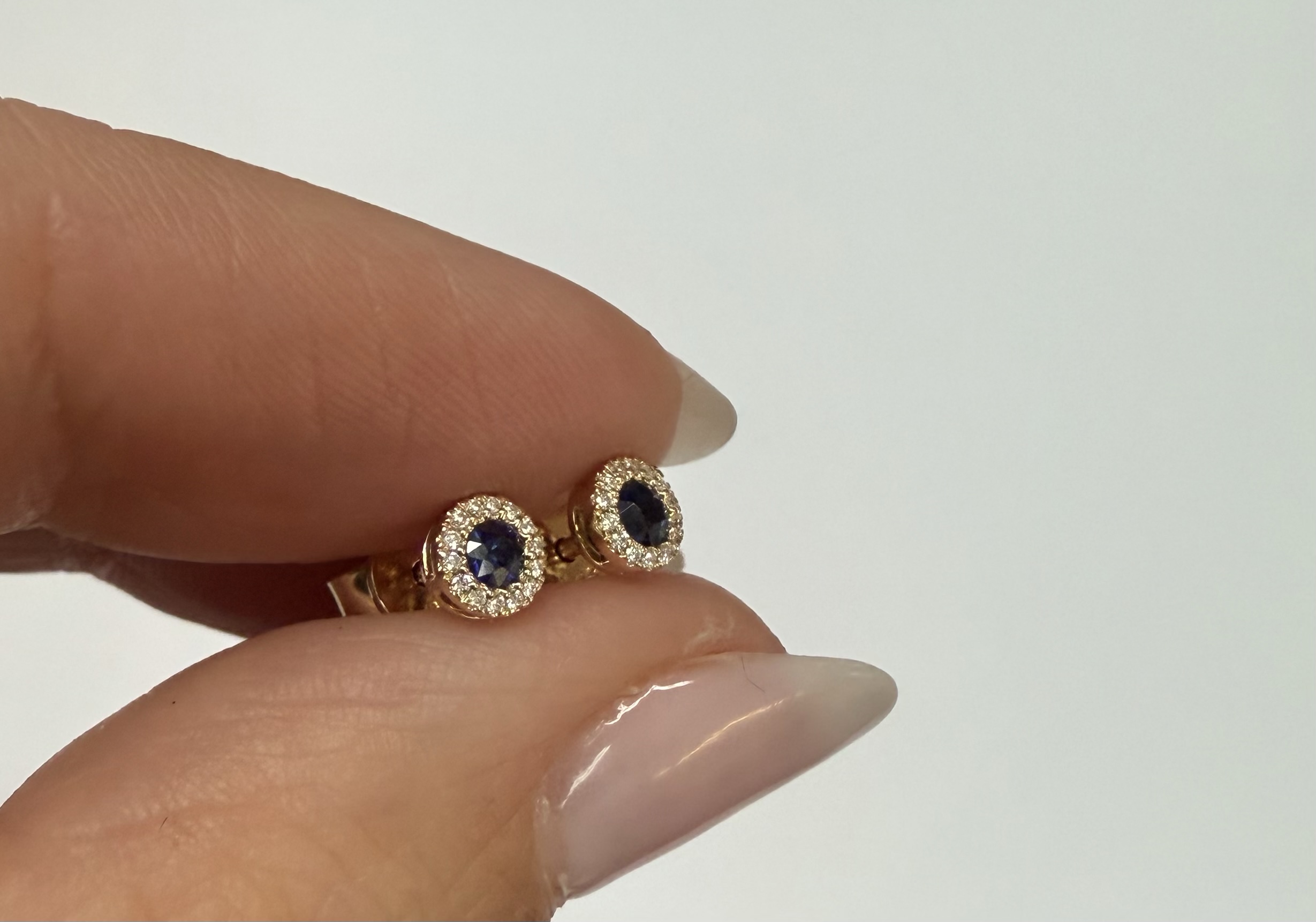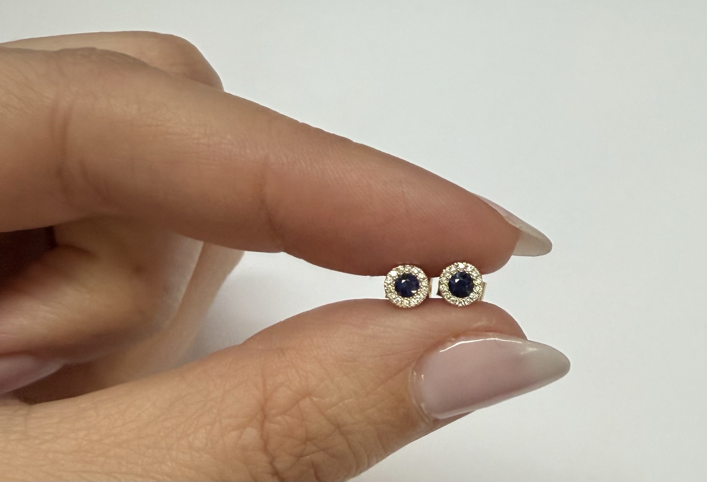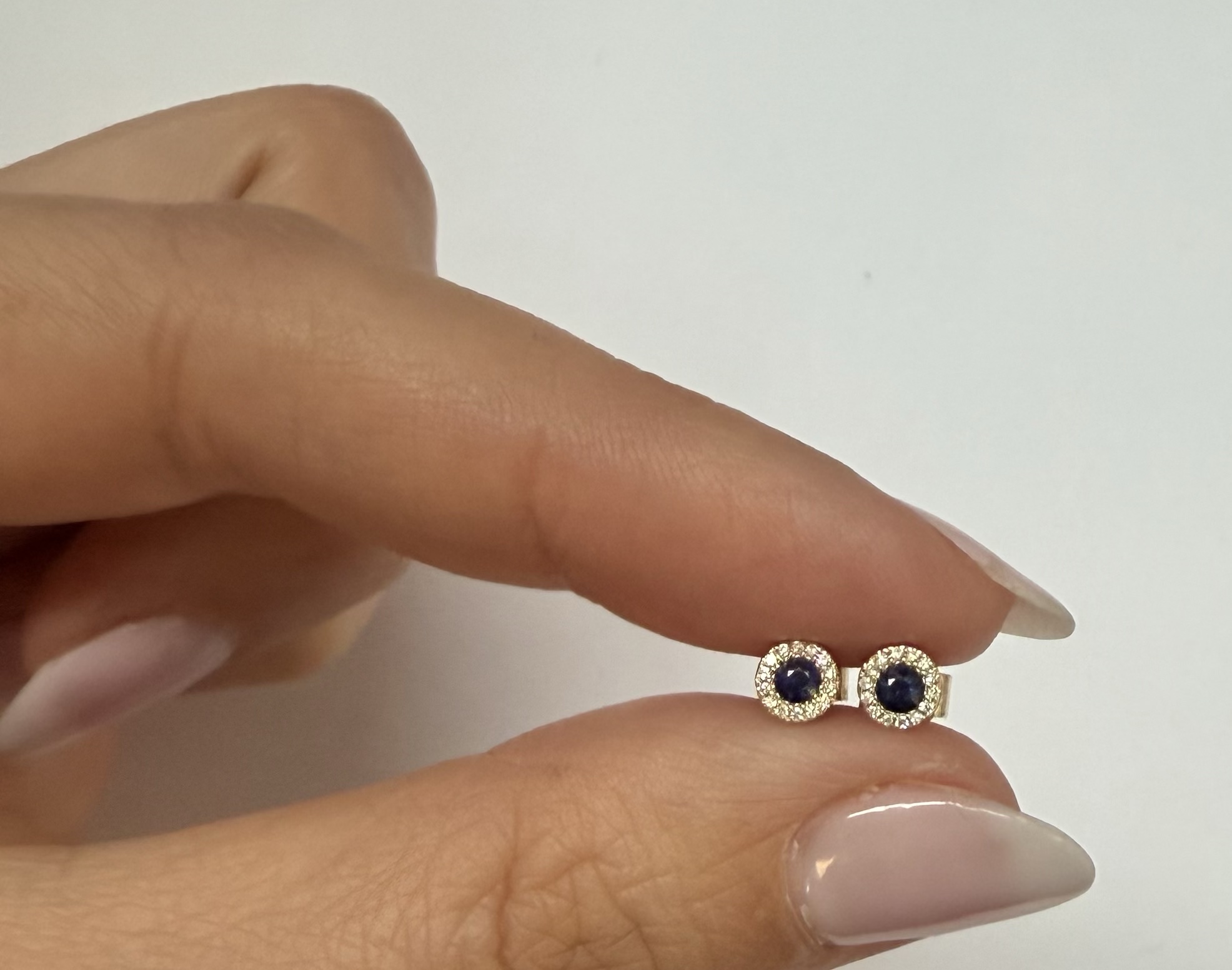 14k yellow gold genuine .15 Cttw Sapphire and .05 cttw Round Brilliant Cut diamond halo stud earrings. These diamonds average G in color, and SI in clarity. These earrings have an entire weight of 1.1 grams.