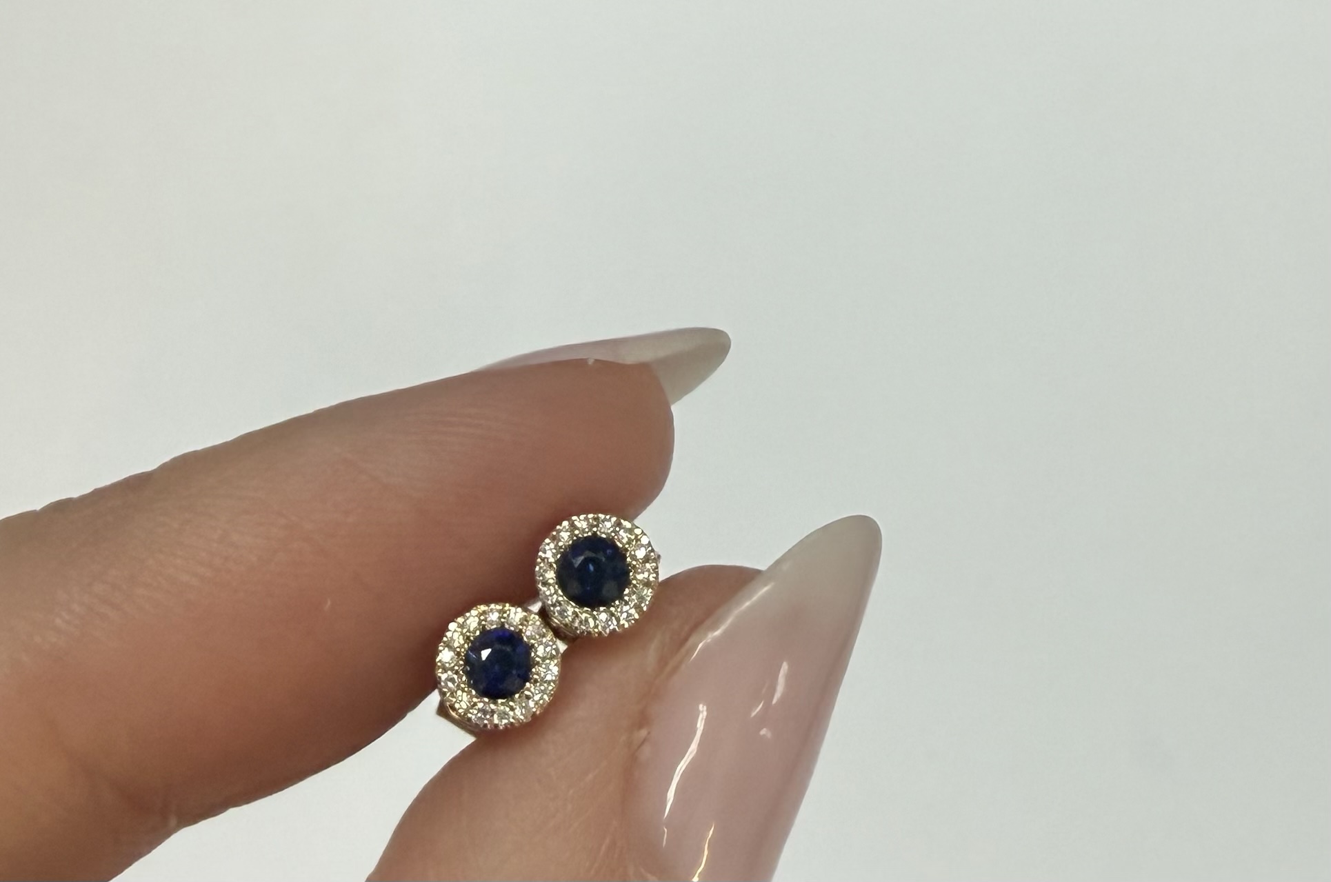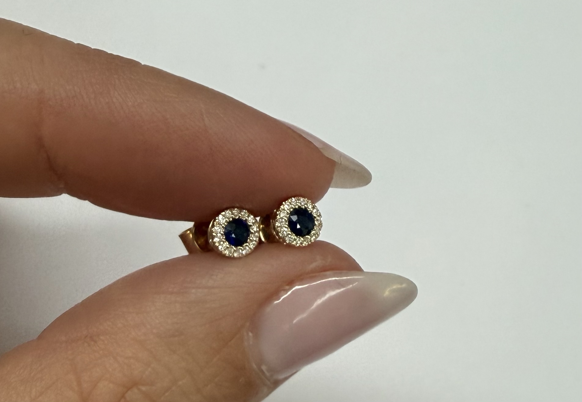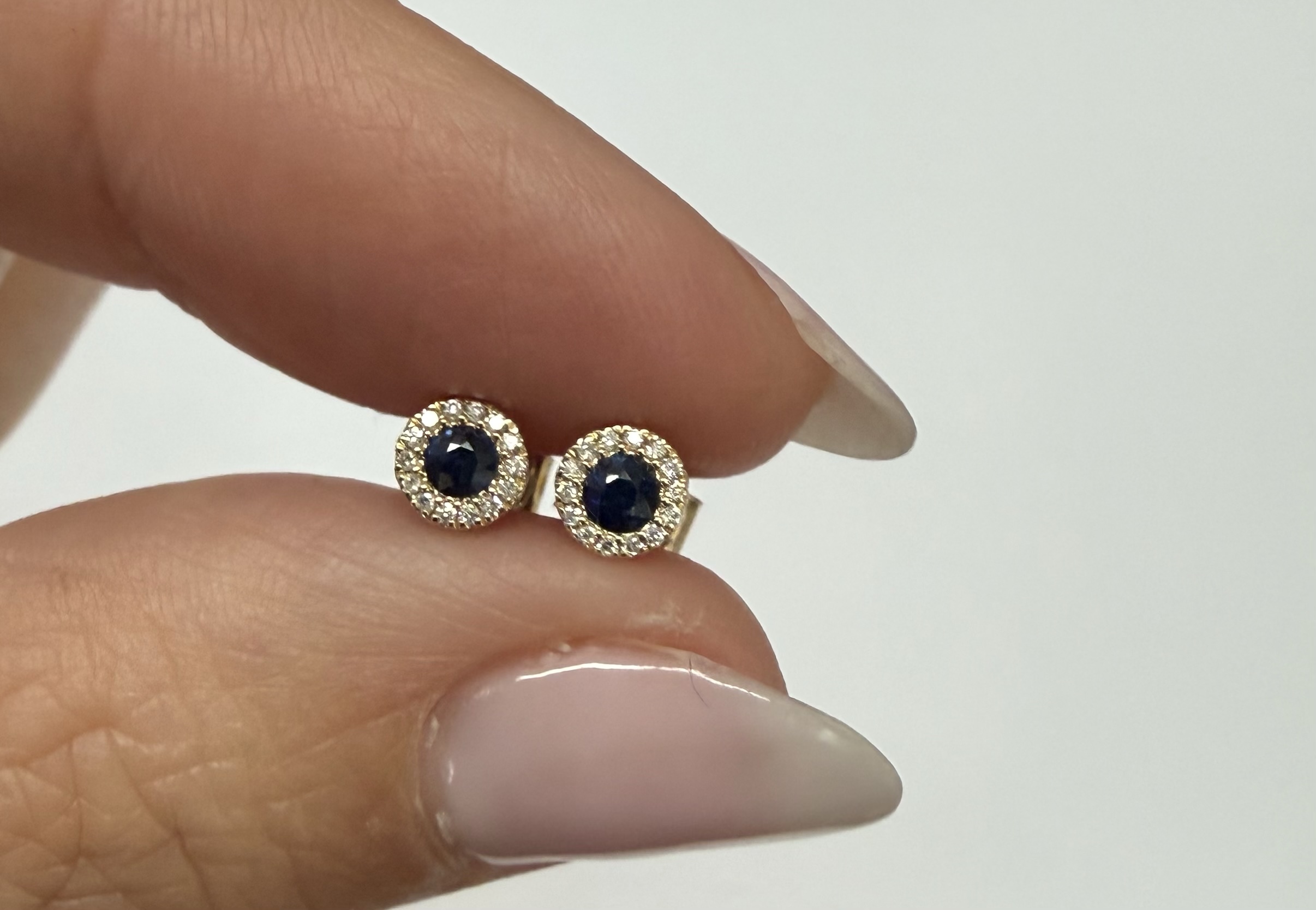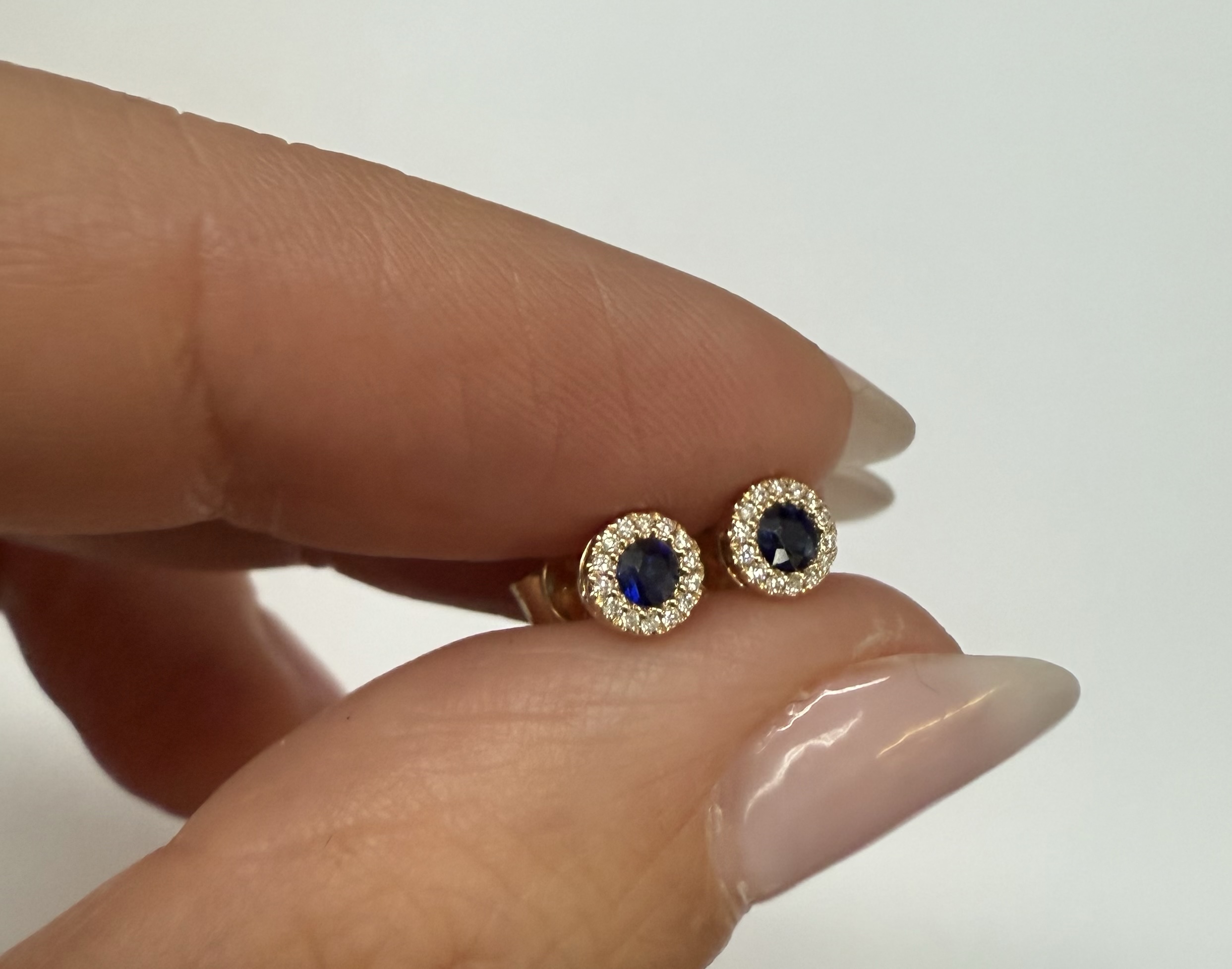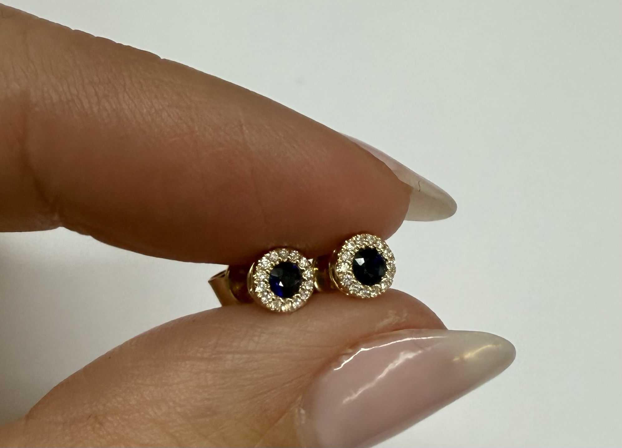 14k yellow gold genuine .15 Cttw Sapphire and .05 cttw Round Brilliant Cut diamond halo stud earrings. These diamonds average G in color, and SI in clarity. These earrings have an entire weight of 1.1 grams.