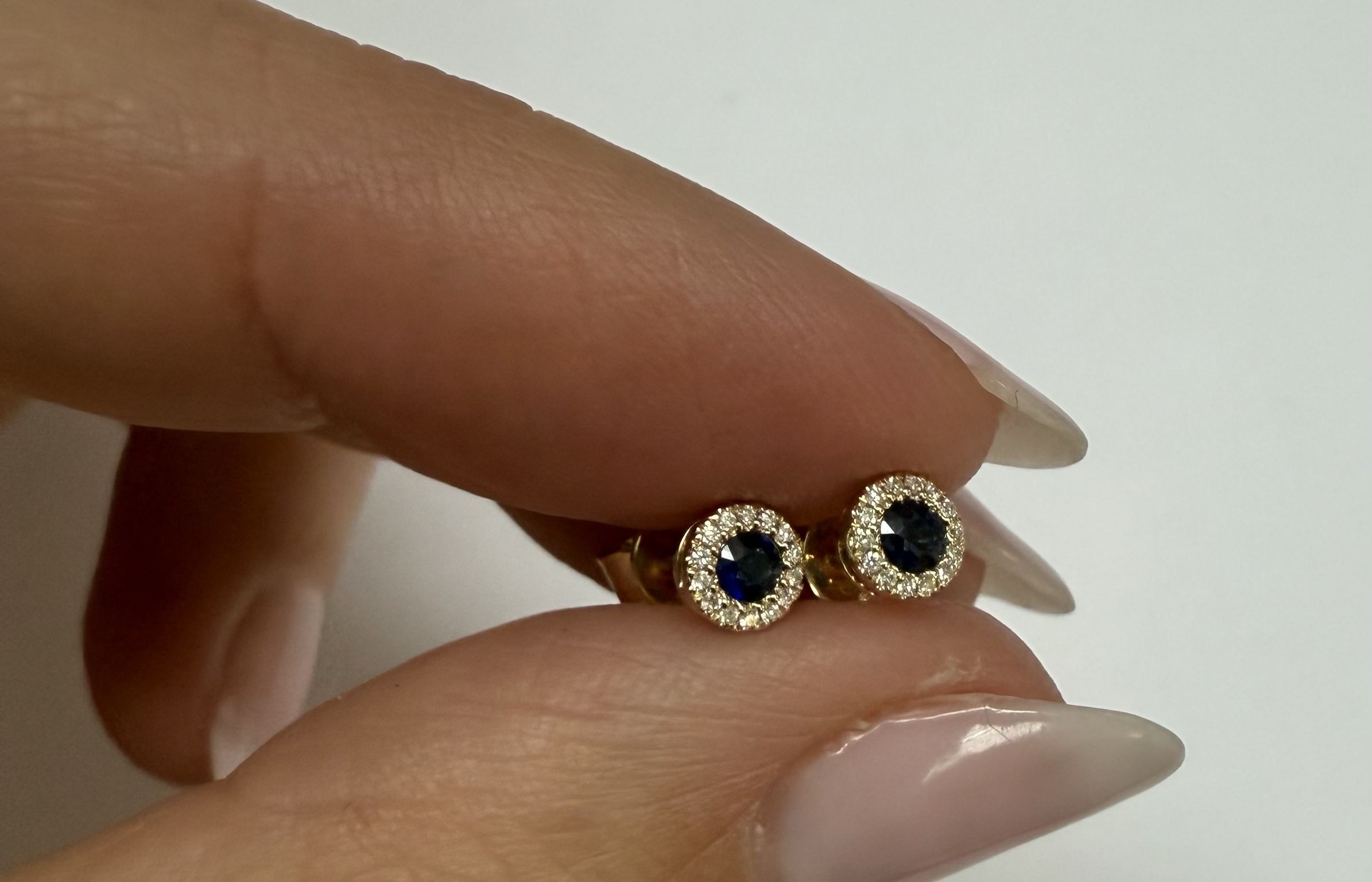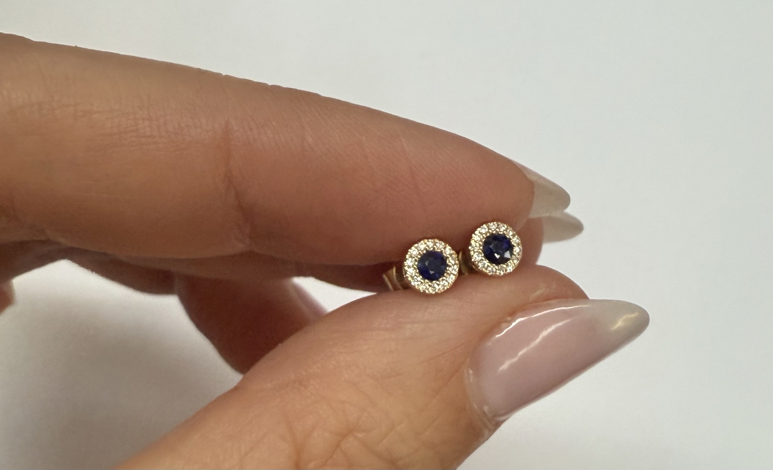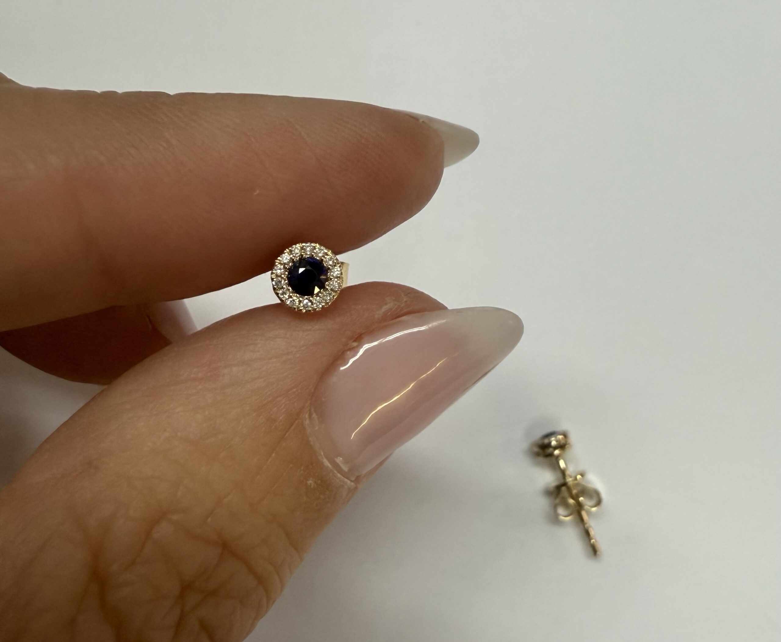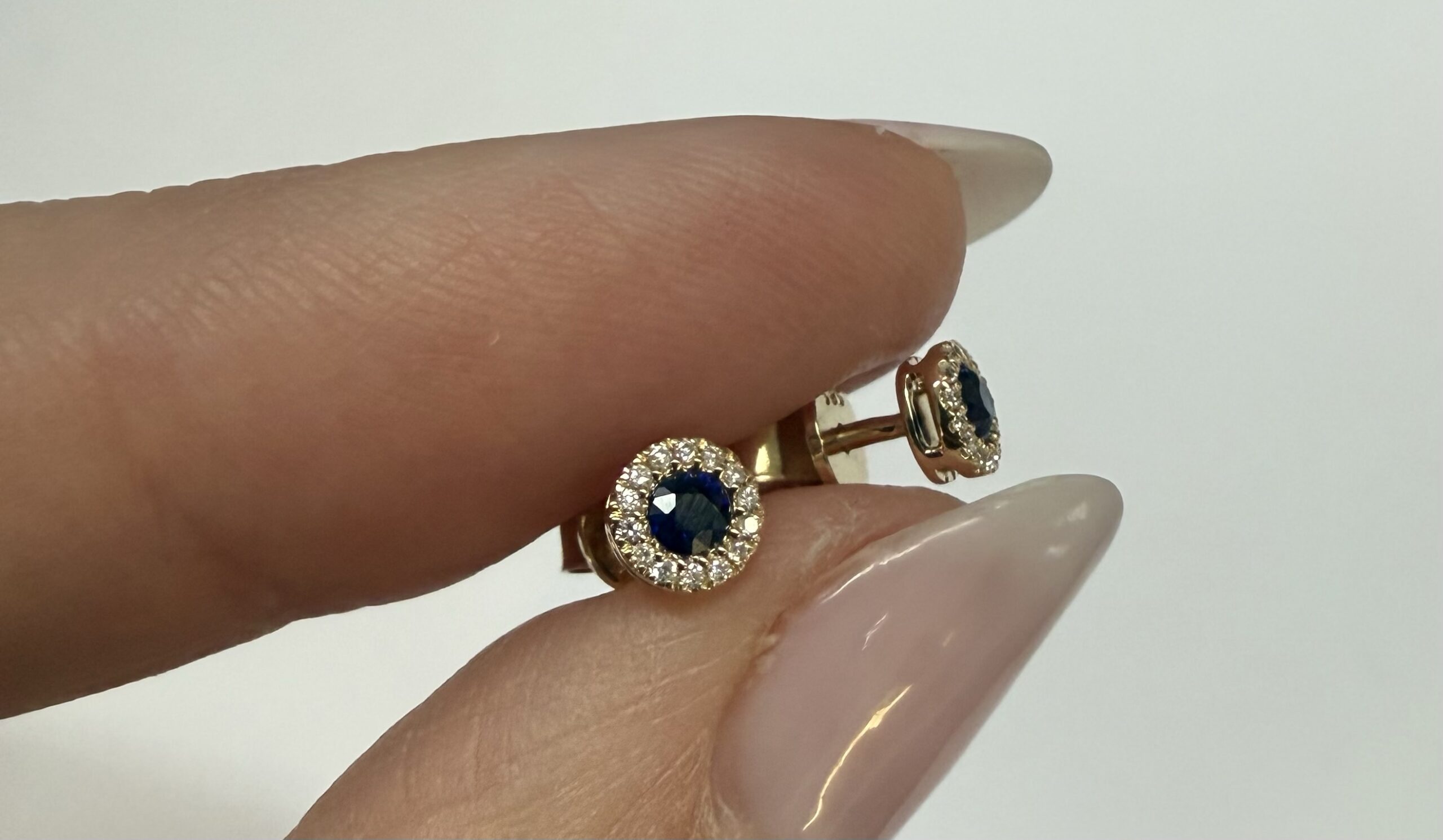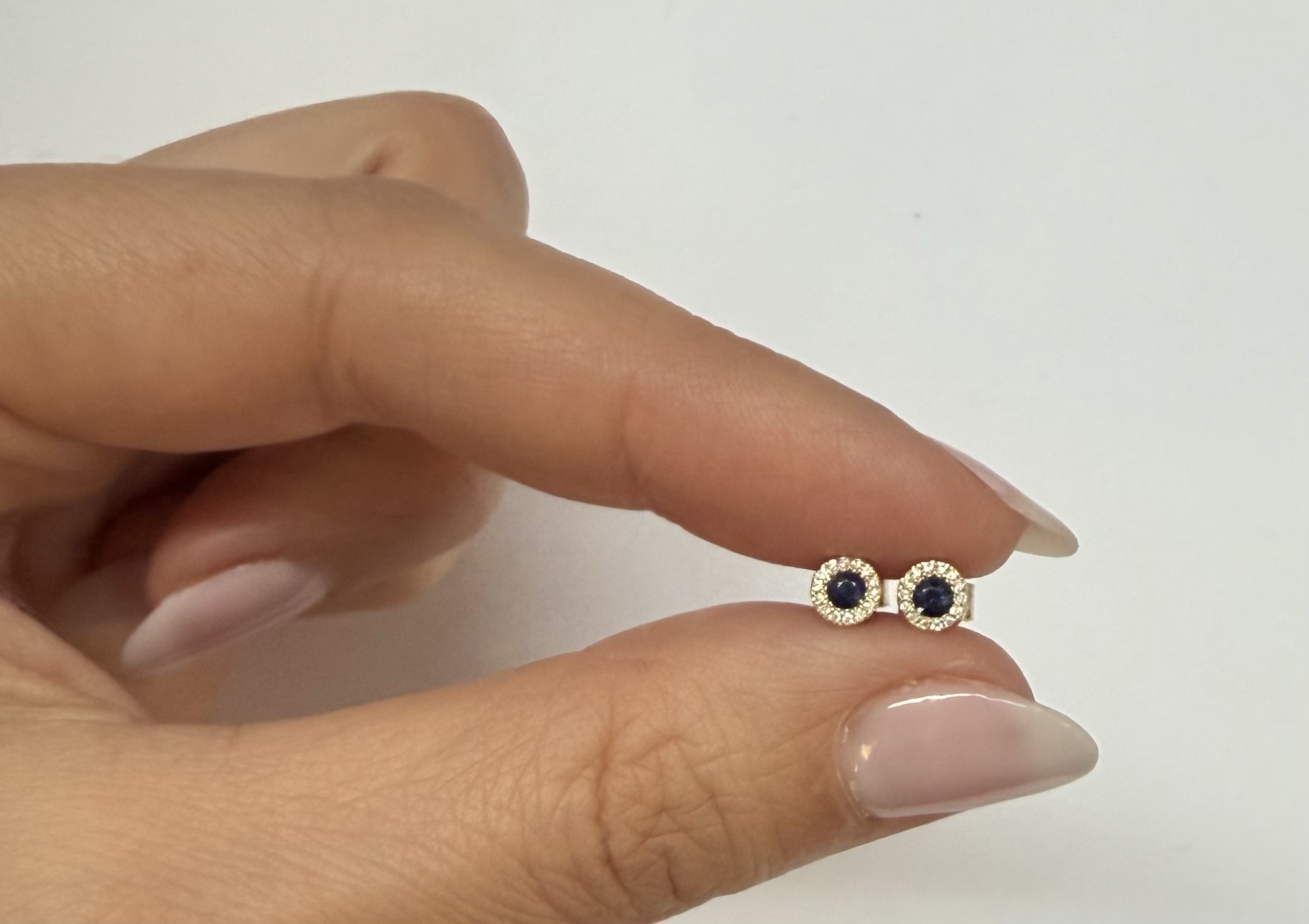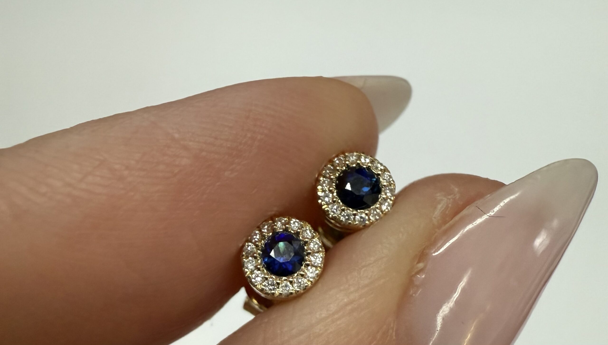 14k yellow gold genuine .15 Cttw Sapphire and .05 cttw Round Brilliant Cut diamond halo stud earrings. These diamonds average G in color, and SI in clarity. These earrings have an entire weight of 1.1 grams.