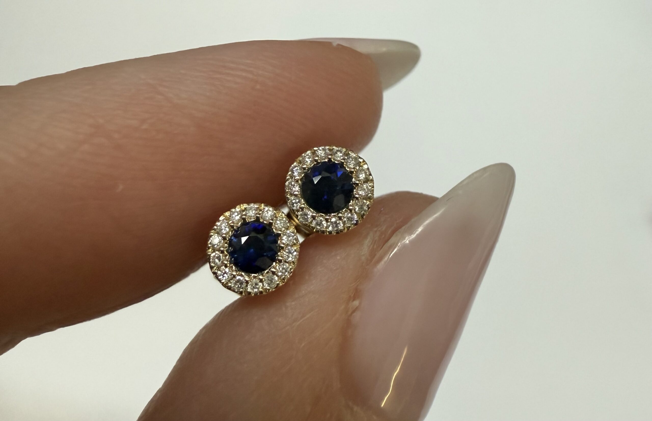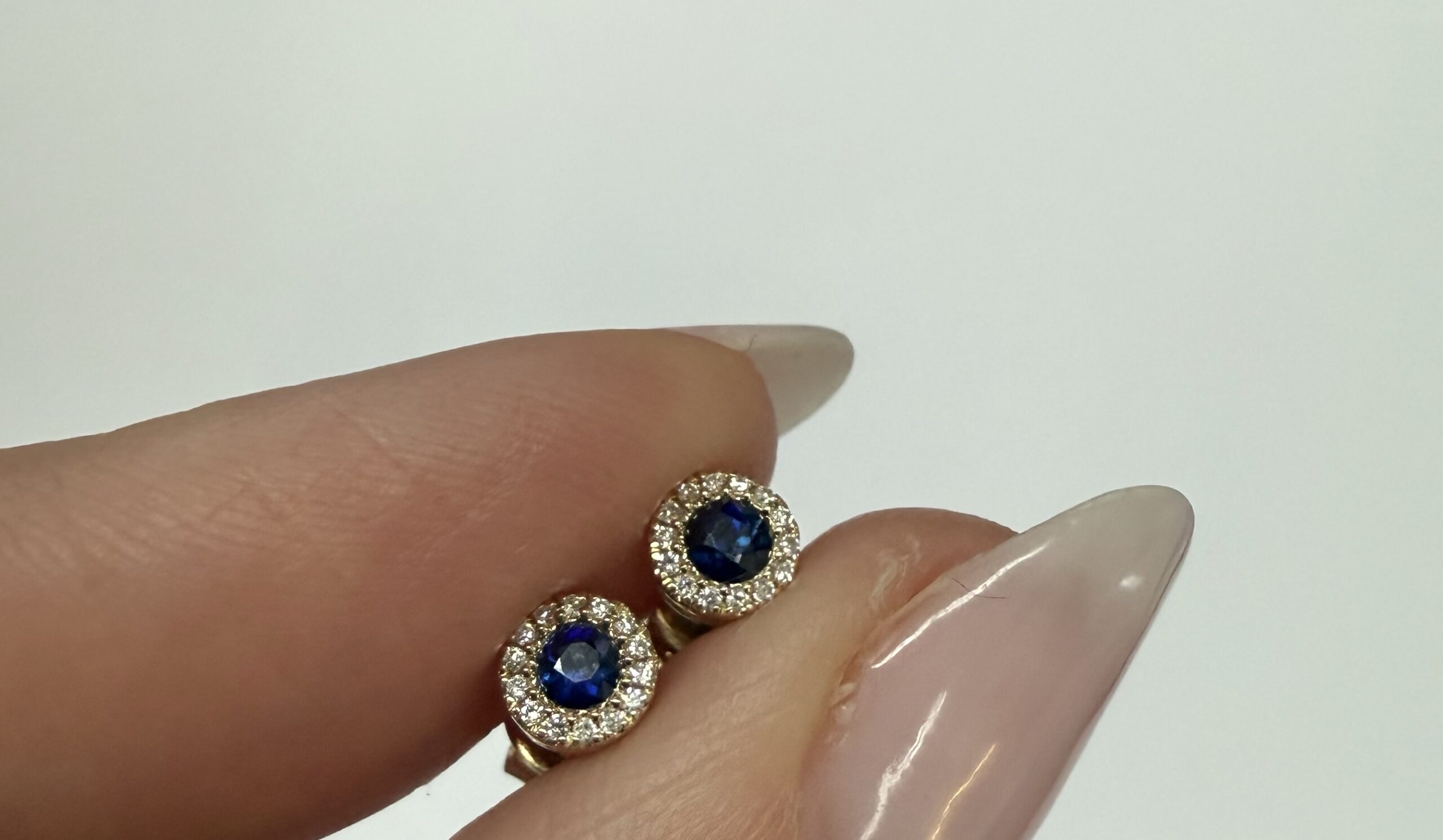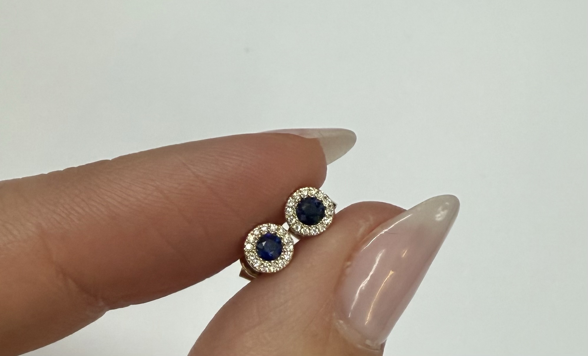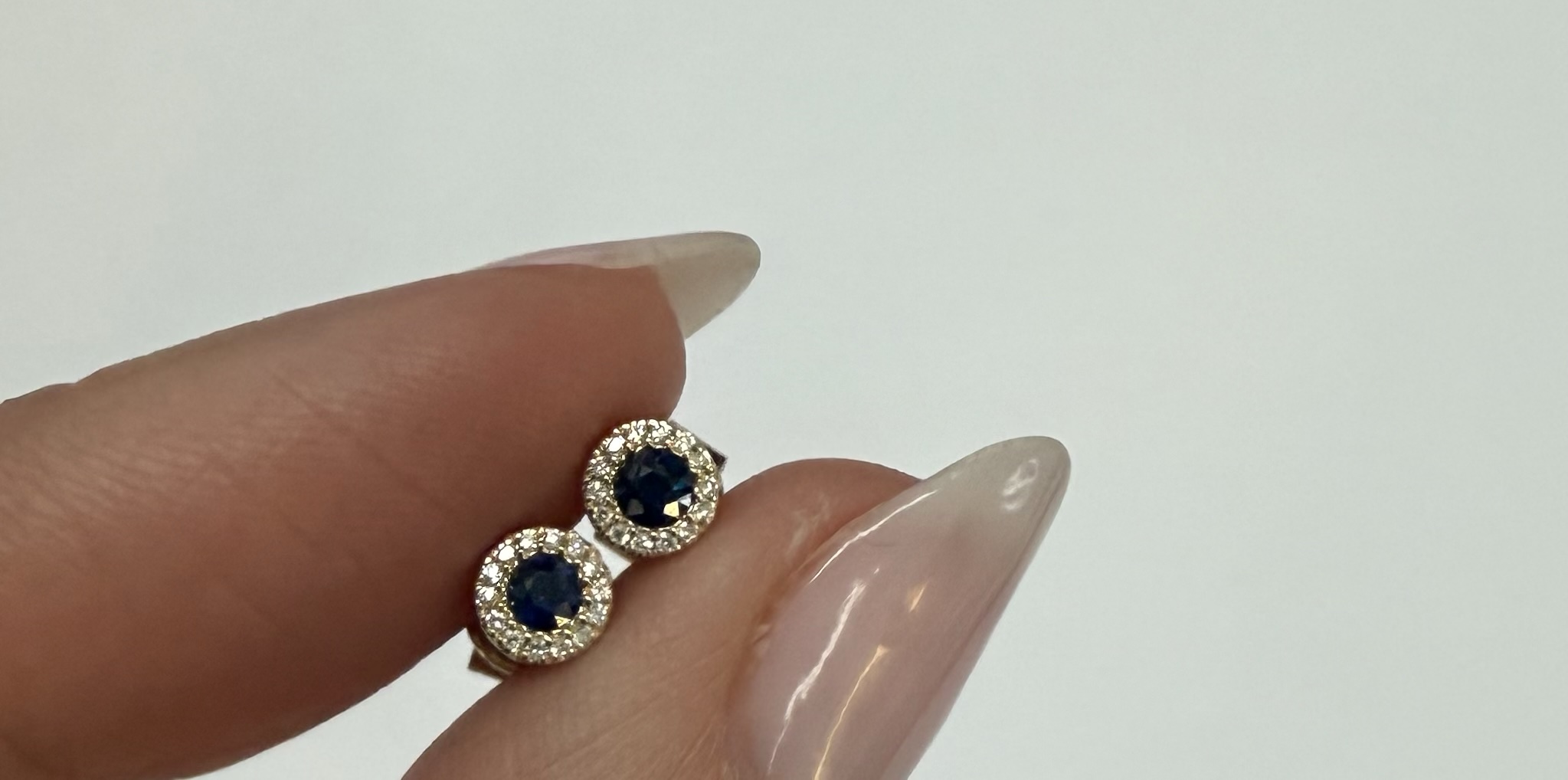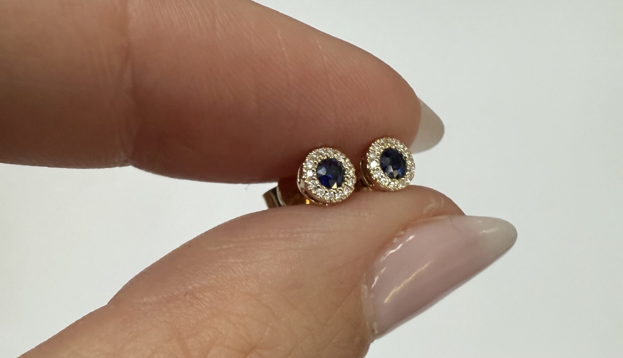 14k yellow gold genuine .15 Cttw Sapphire and .05 cttw Round Brilliant Cut diamond halo stud earrings. These diamonds average G in color, and SI in clarity. These earrings have an entire weight of 1.1 grams.