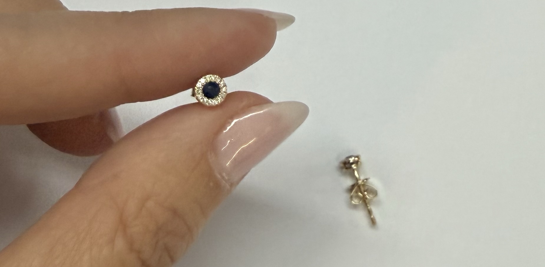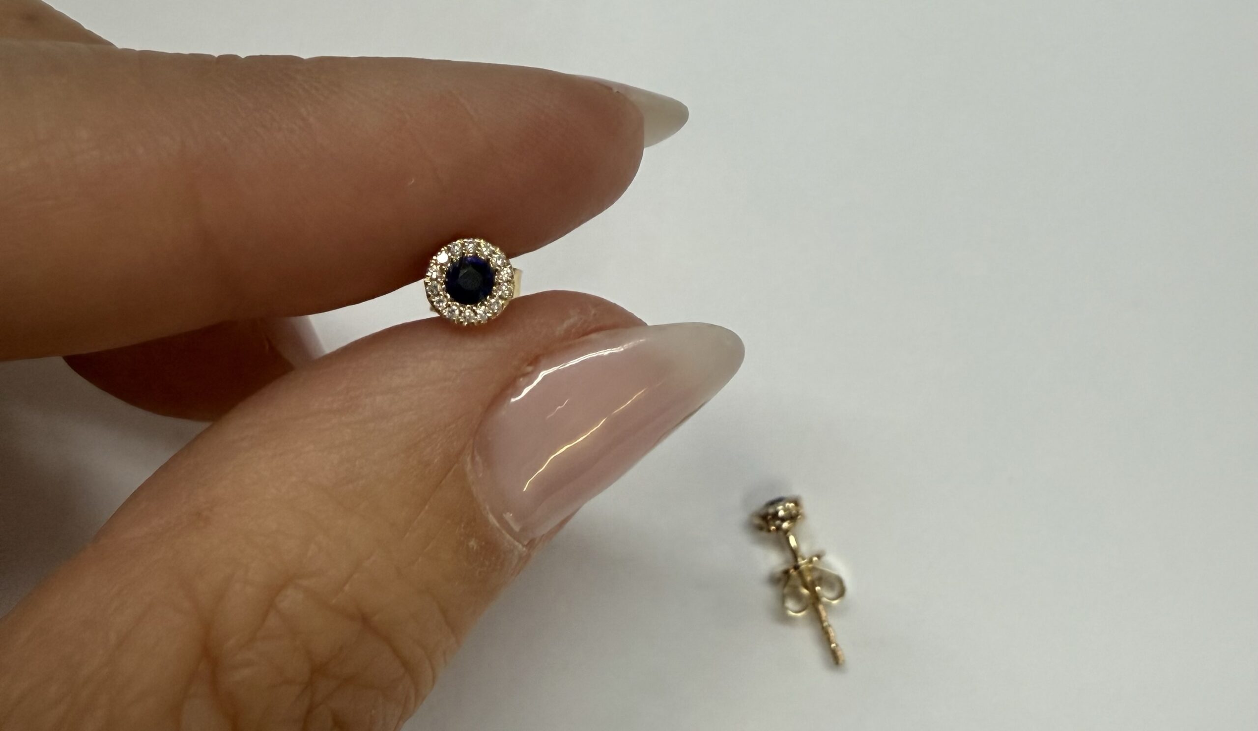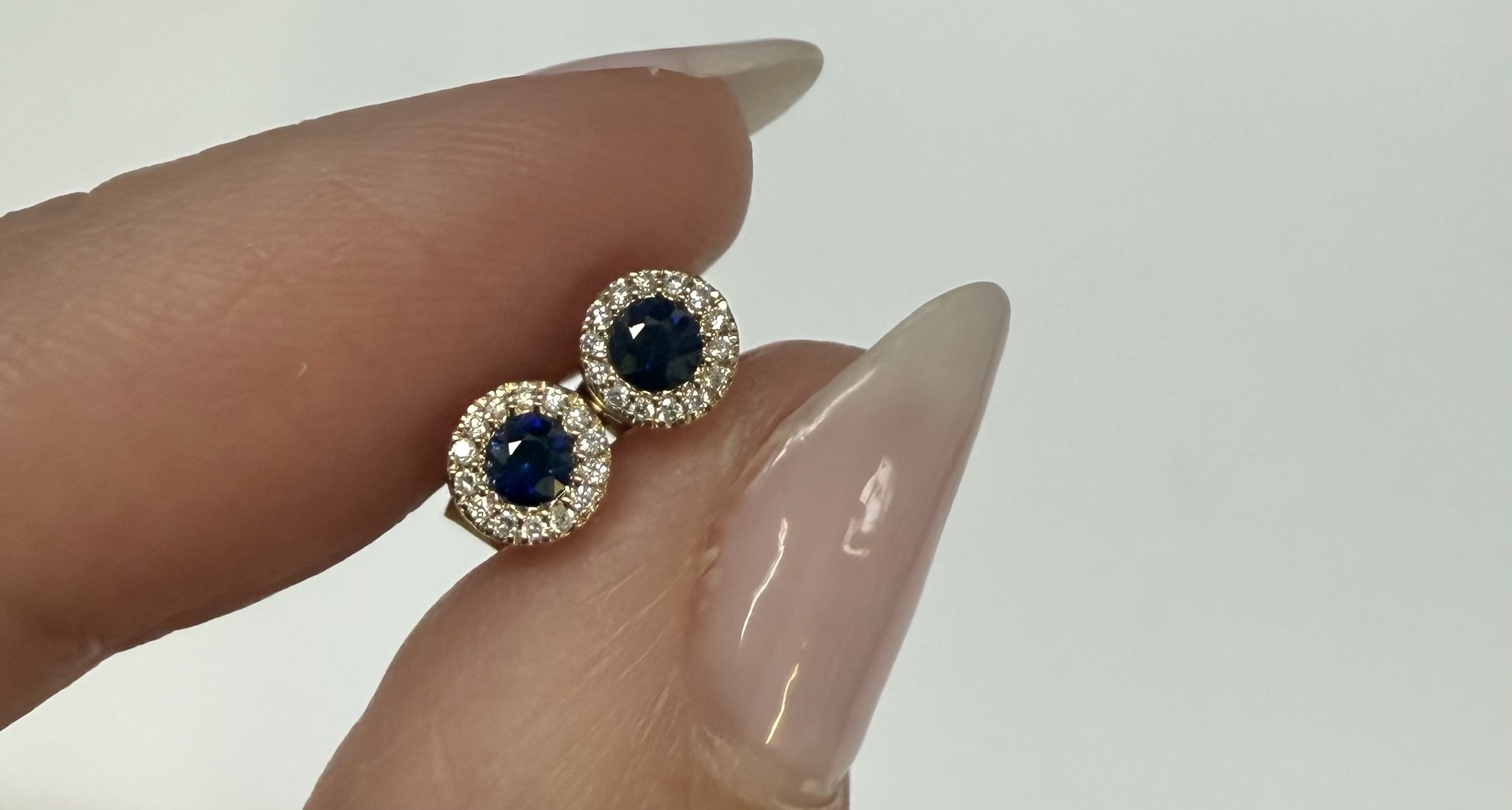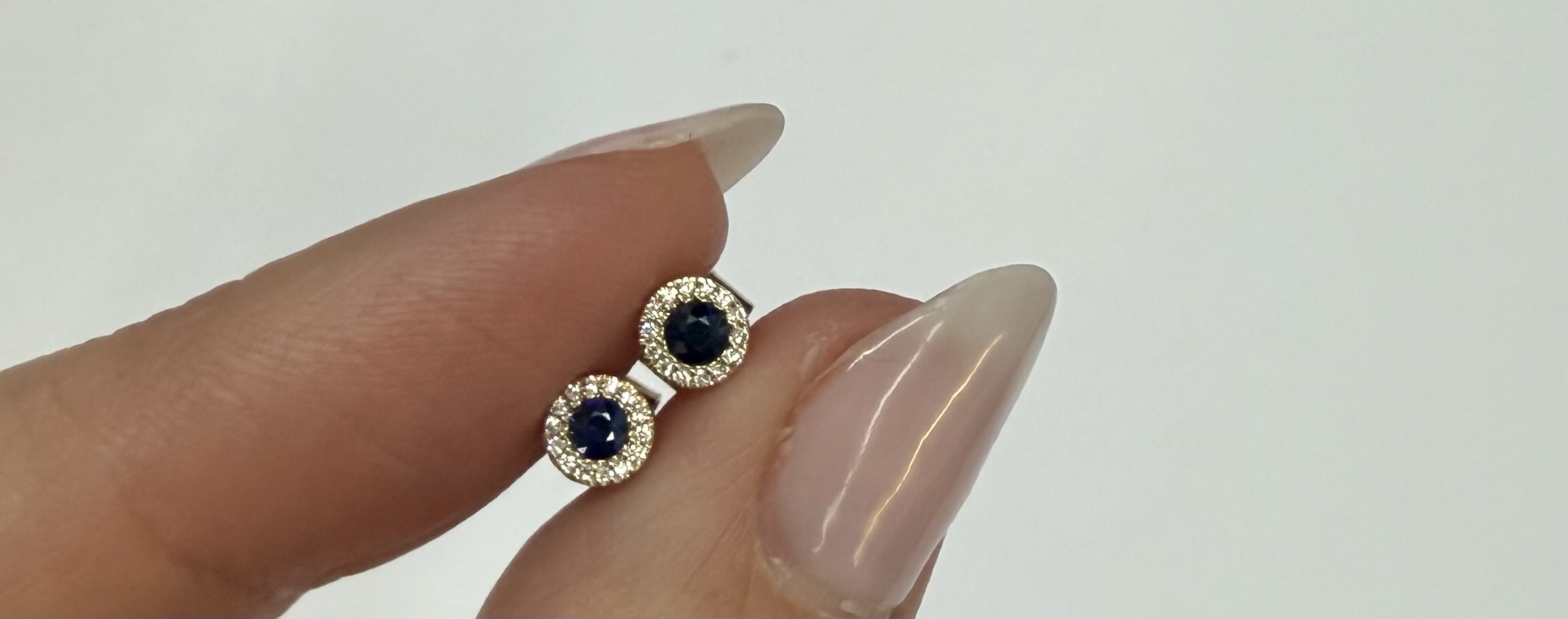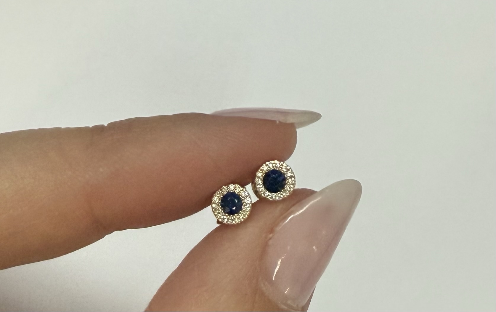 14k yellow gold genuine .15 Cttw Sapphire and .05 cttw Round Brilliant Cut diamond halo stud earrings. These diamonds average G in color, and SI in clarity. These earrings have an entire weight of 1.1 grams.