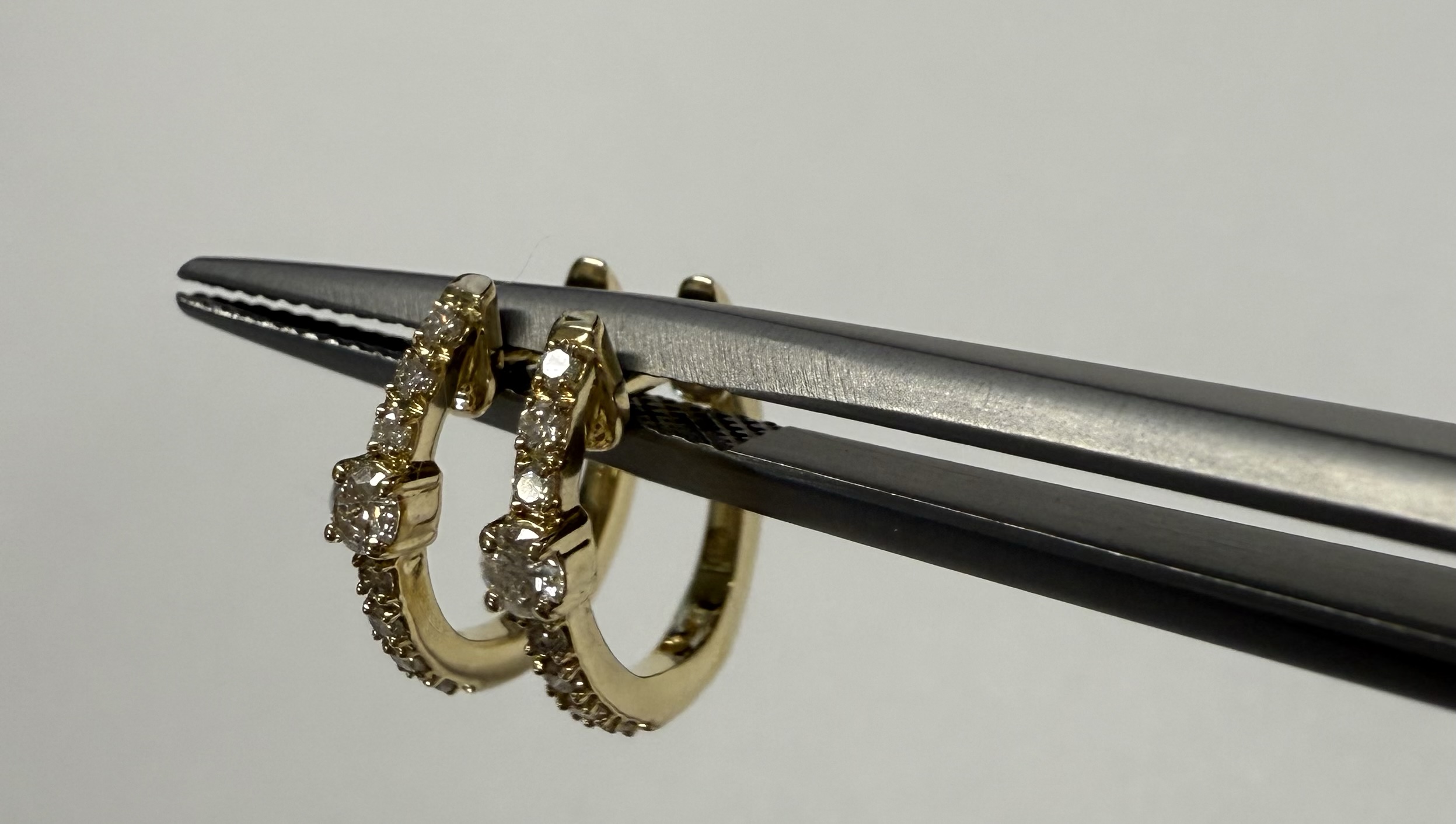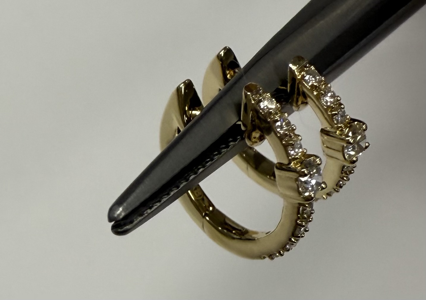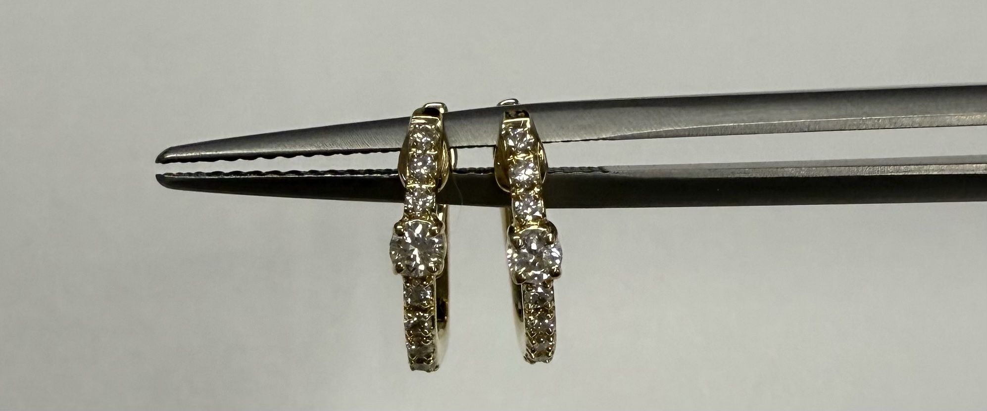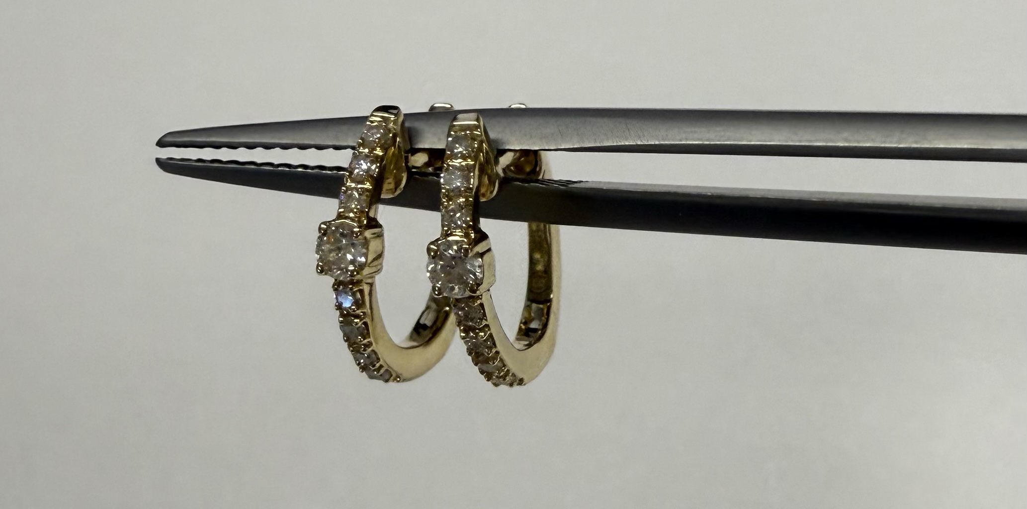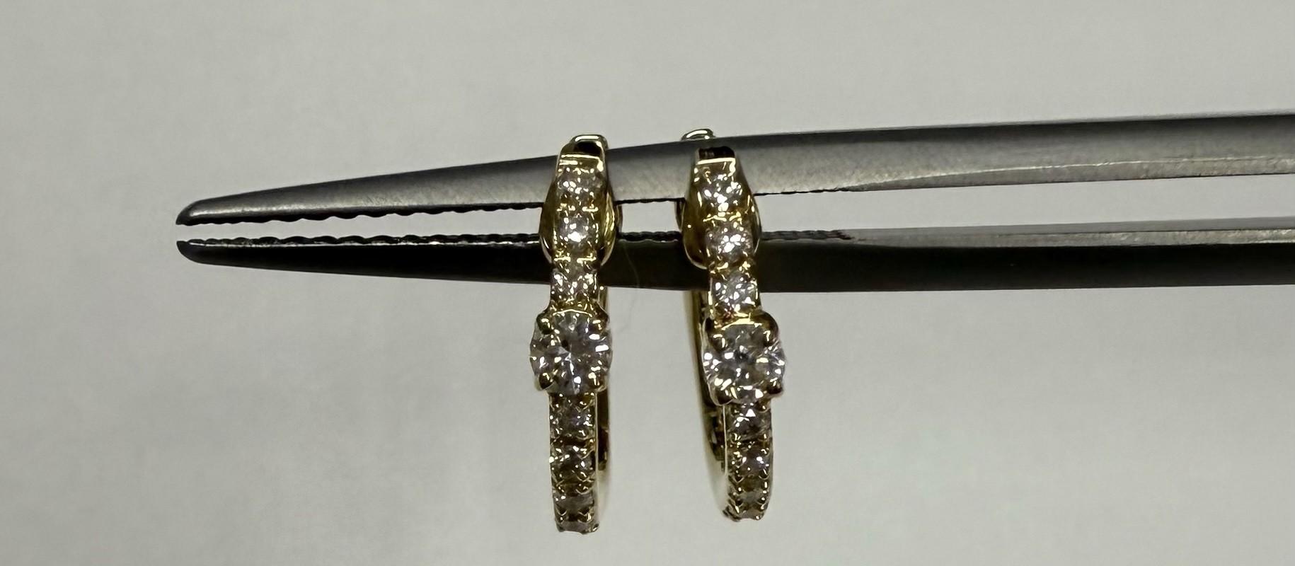14k yellow gold genuine .20 cttw Round Brilliant Cut diamond huggy style hoop earrings with one larger diamond set in the center. The diamonds average G-H in color, and SI2 in clarity. These earrings have an entire weight of grams.