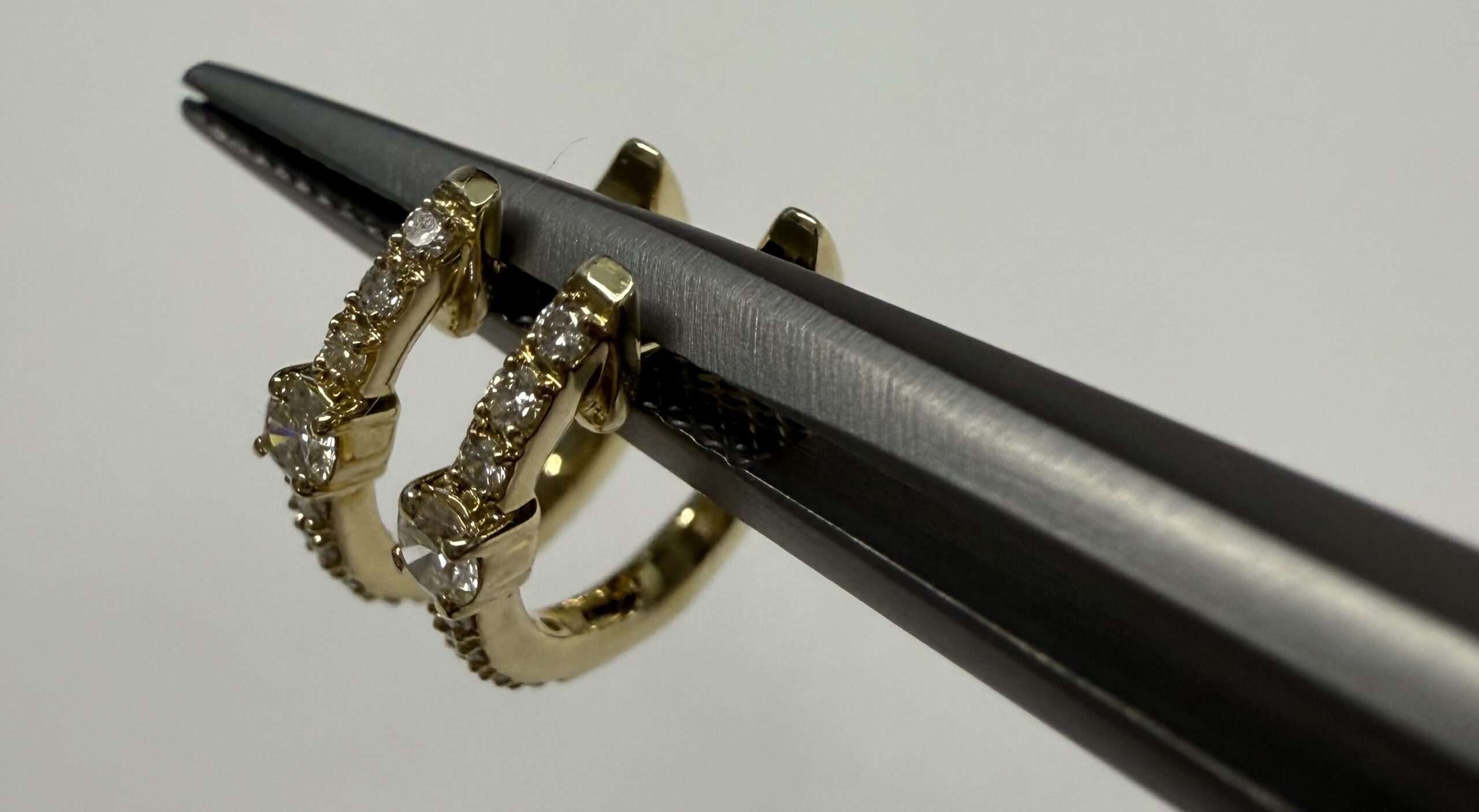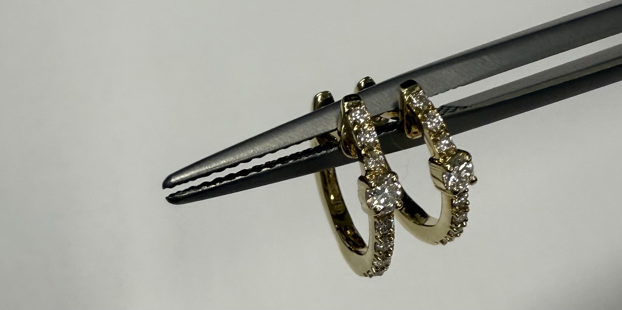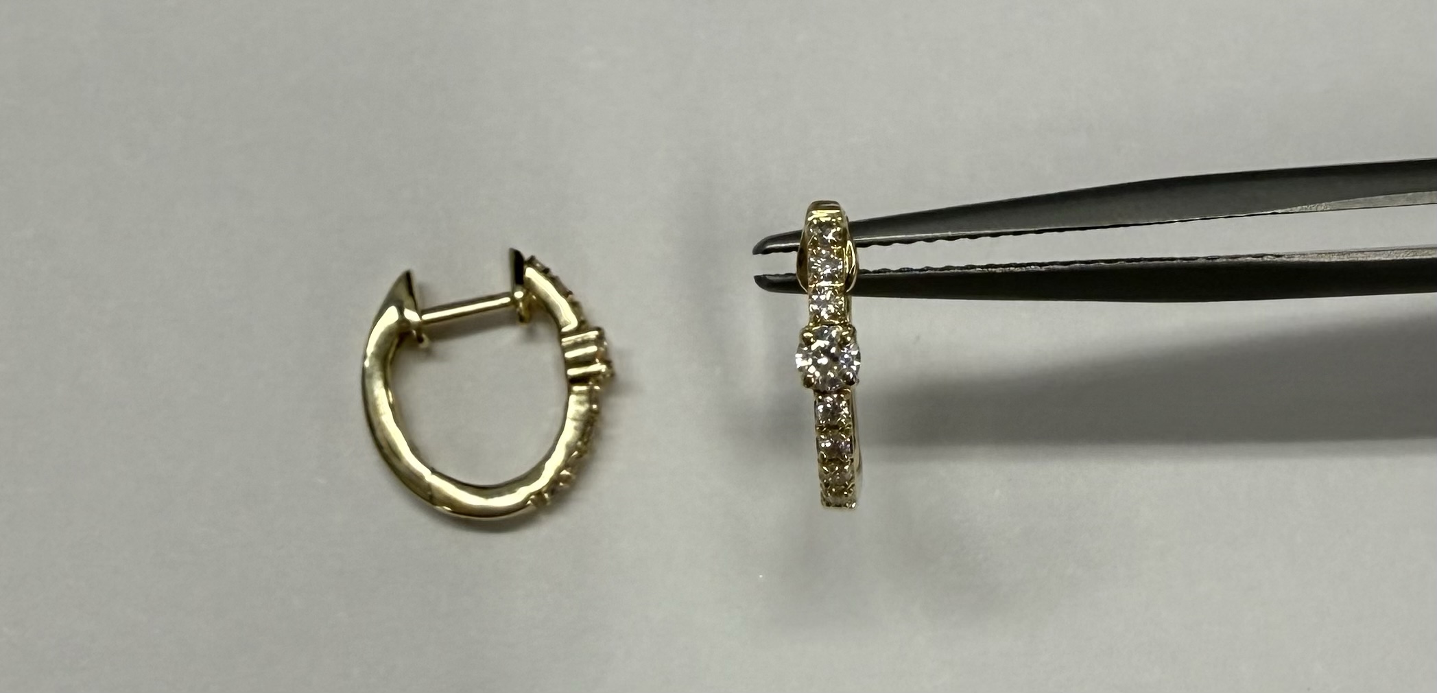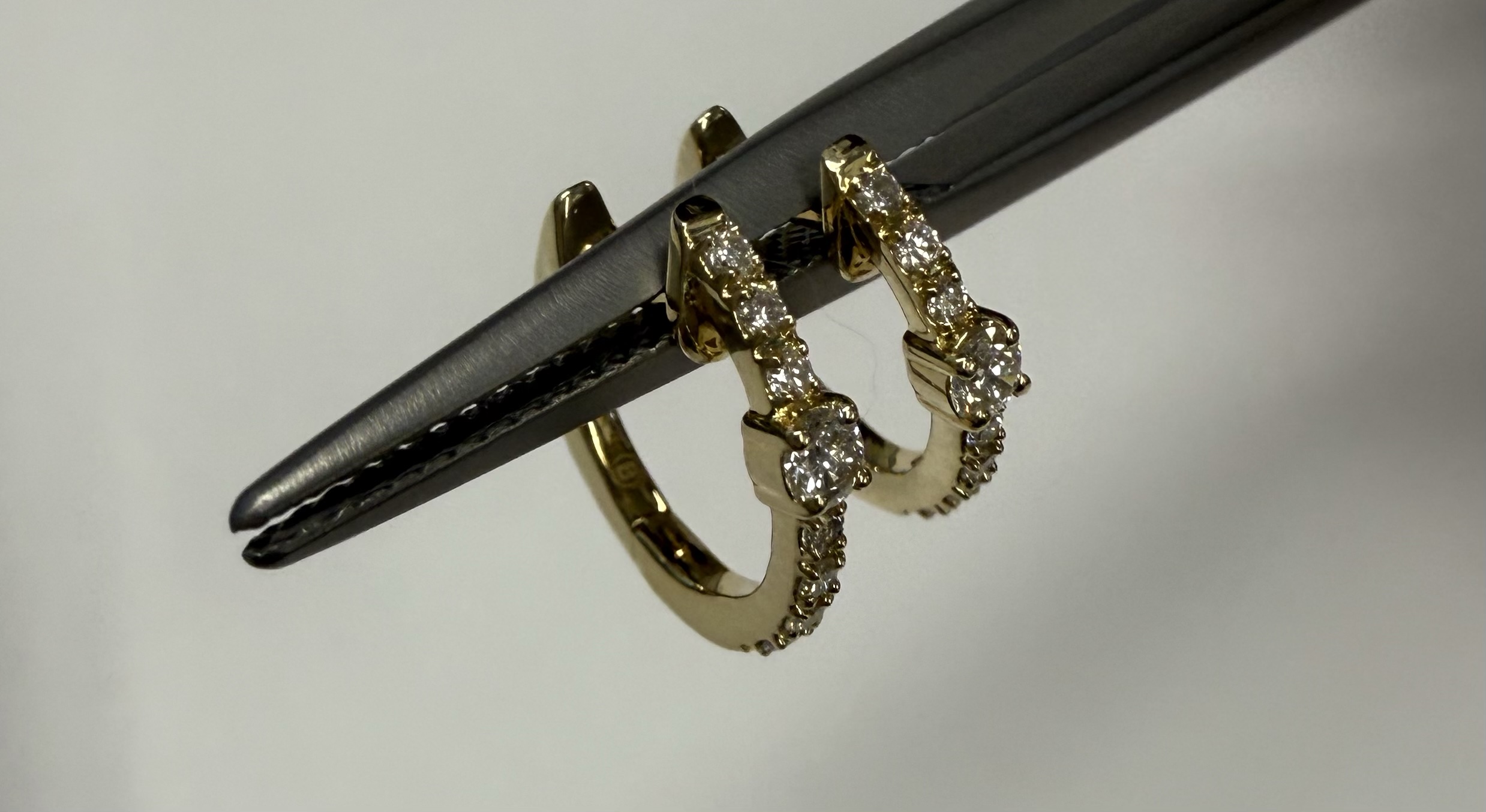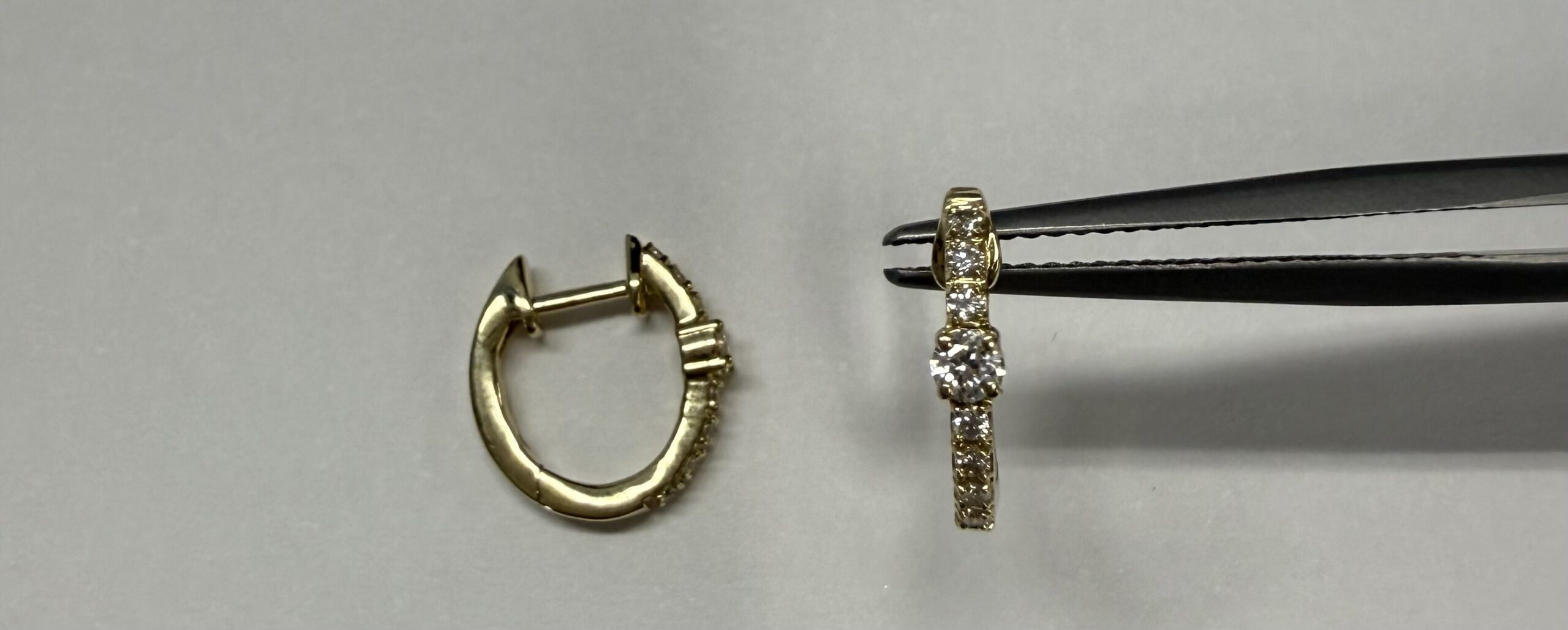 14k yellow gold genuine .20 cttw Round Brilliant Cut diamond huggy style hoop earrings with one larger diamond set in the center. The diamonds average G-H in color, and SI2 in clarity. These earrings have an entire weight of grams.
