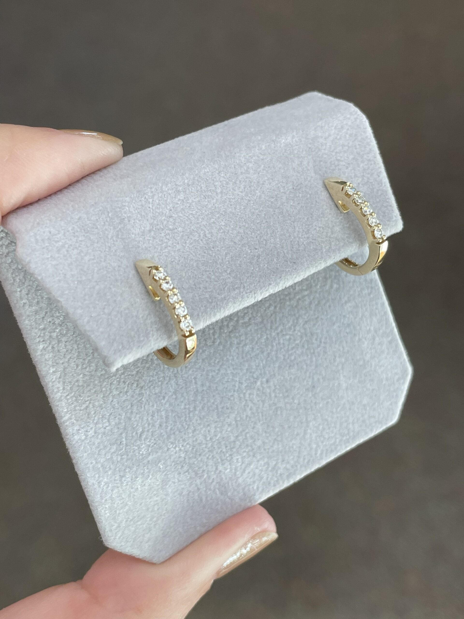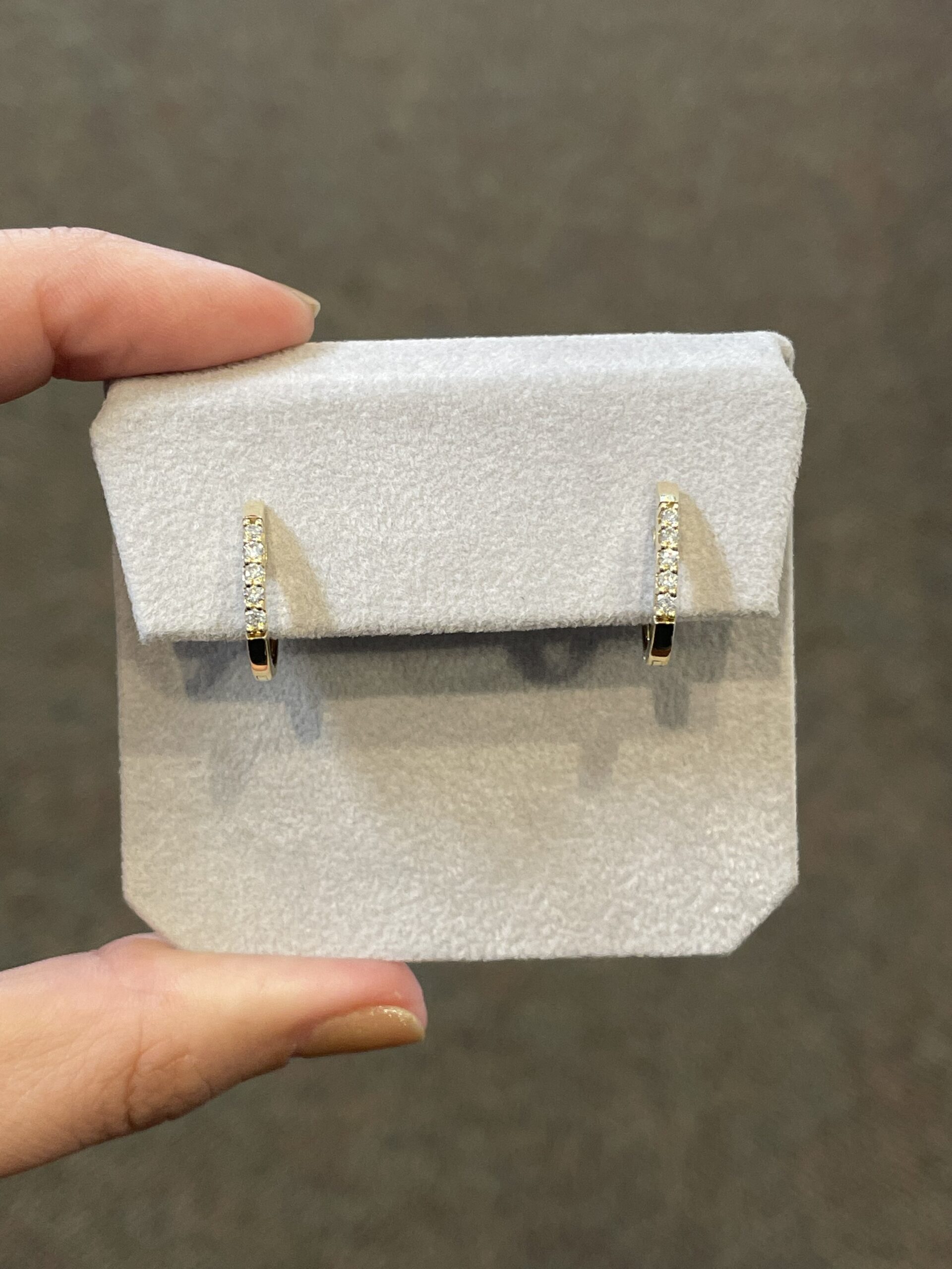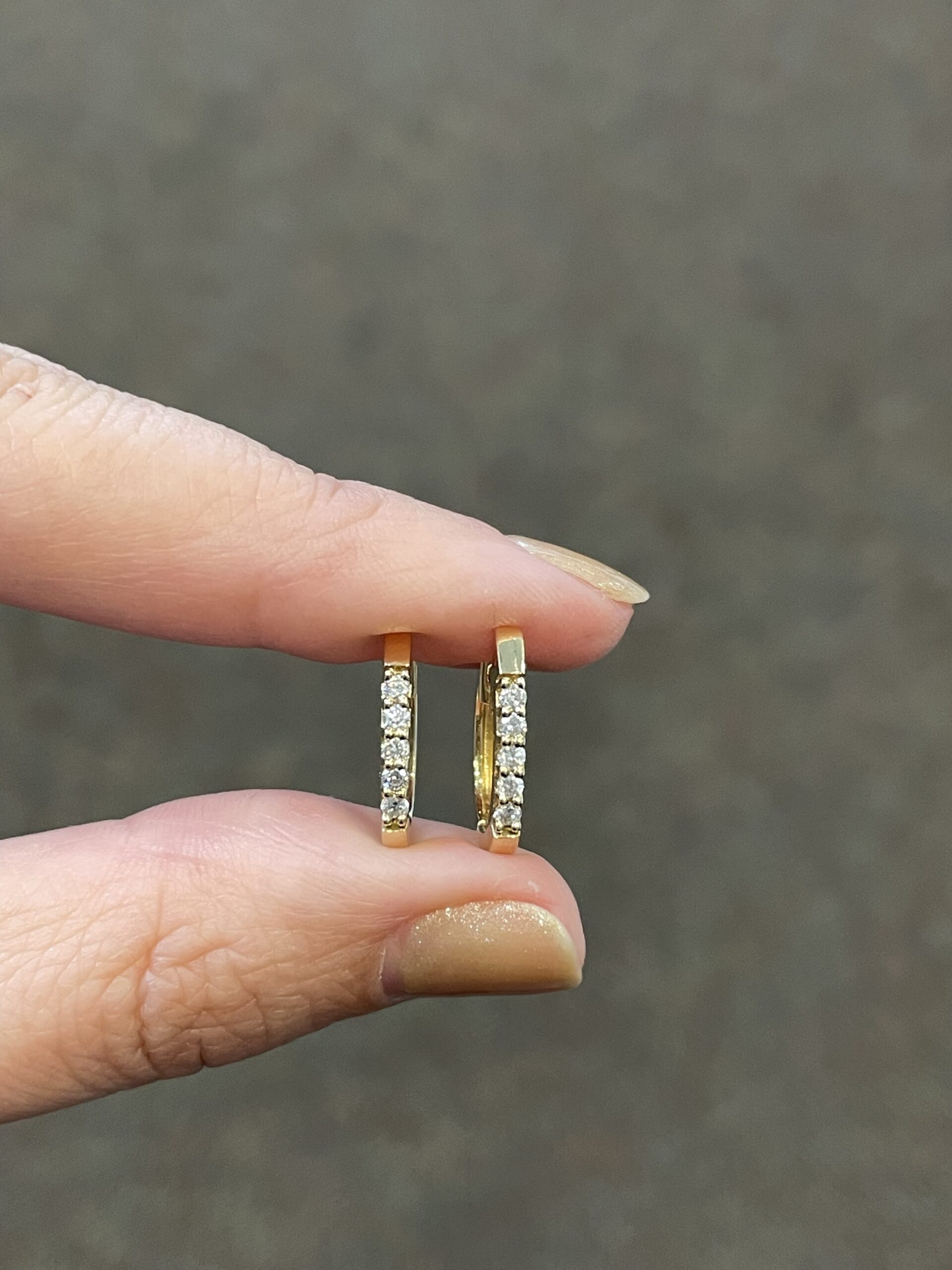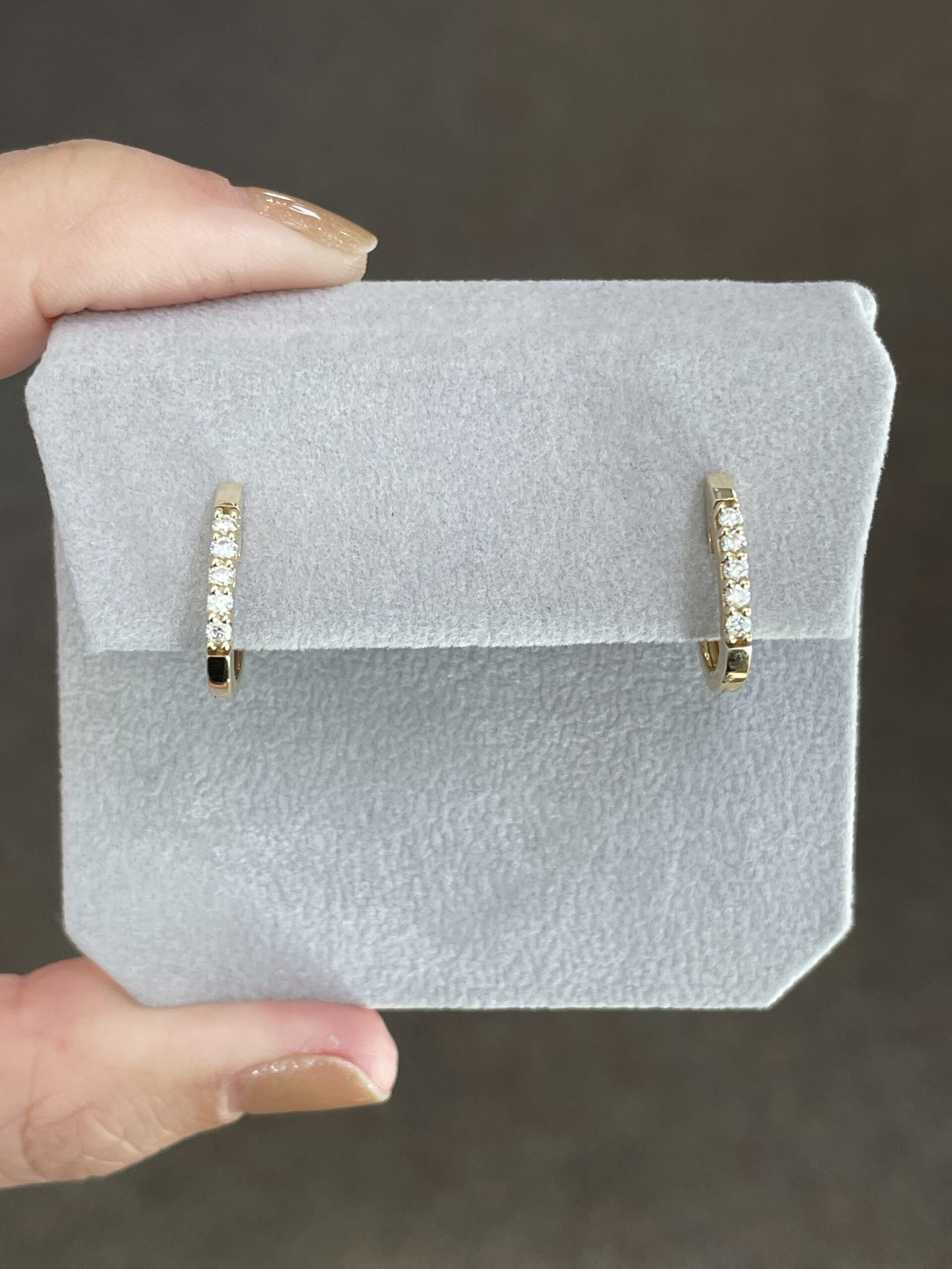 14k yellow gold genuine .22 Cttw Round Brilliant Cut diamond oval shaped huggy style hoop earrings, approximately 2 x 14.5 mm in size. These earrings have an entire weight of 2.6 grams.