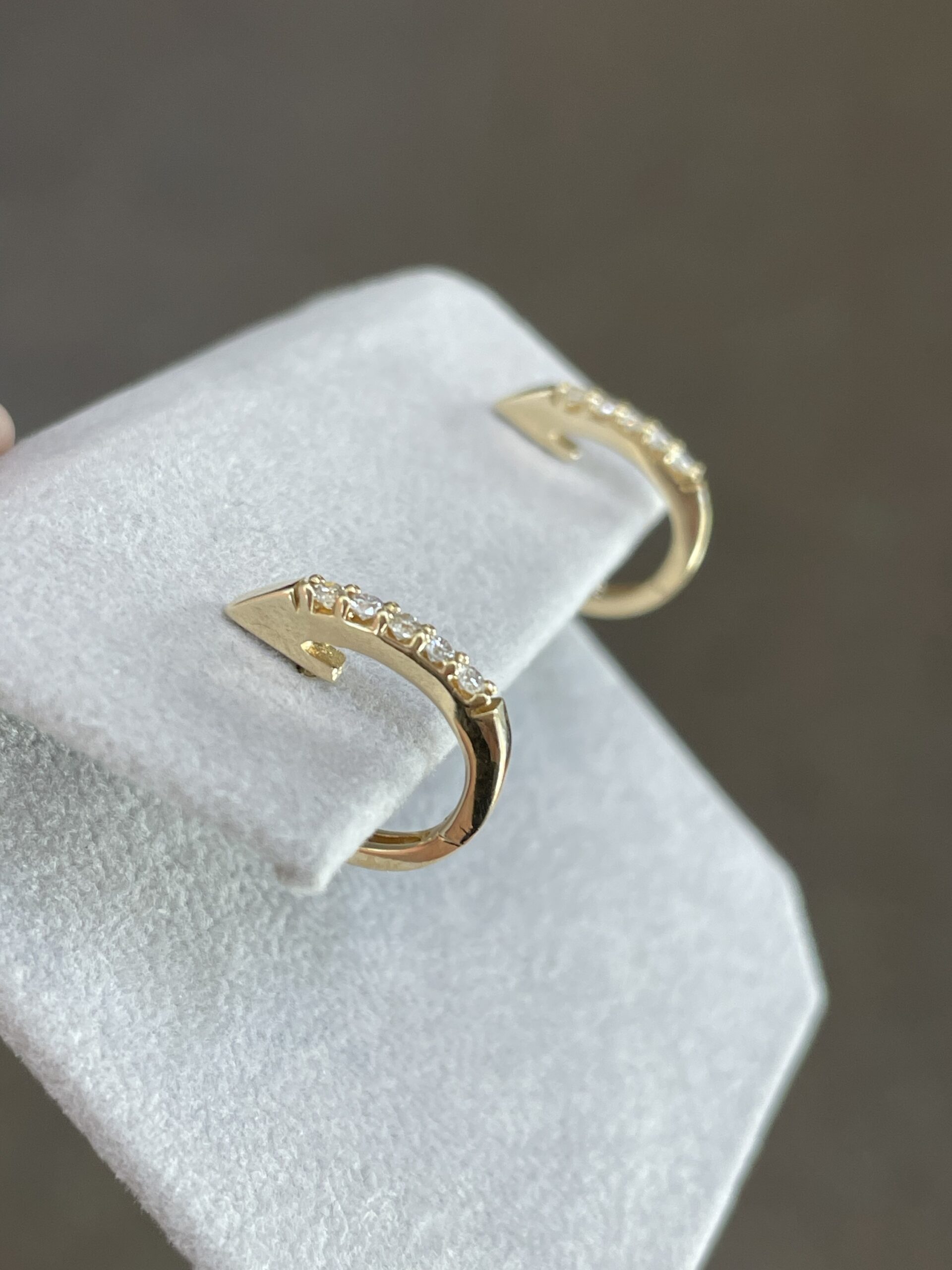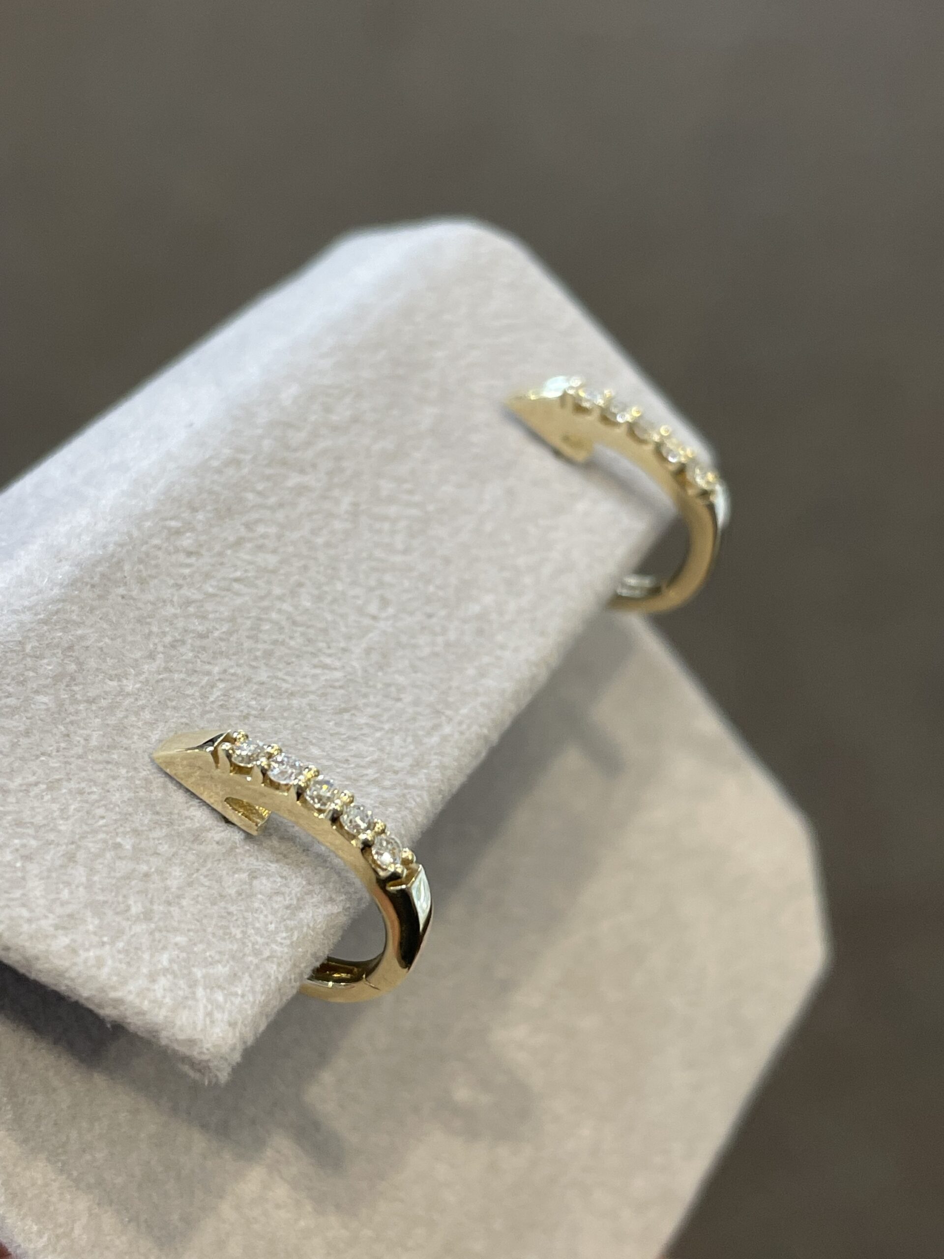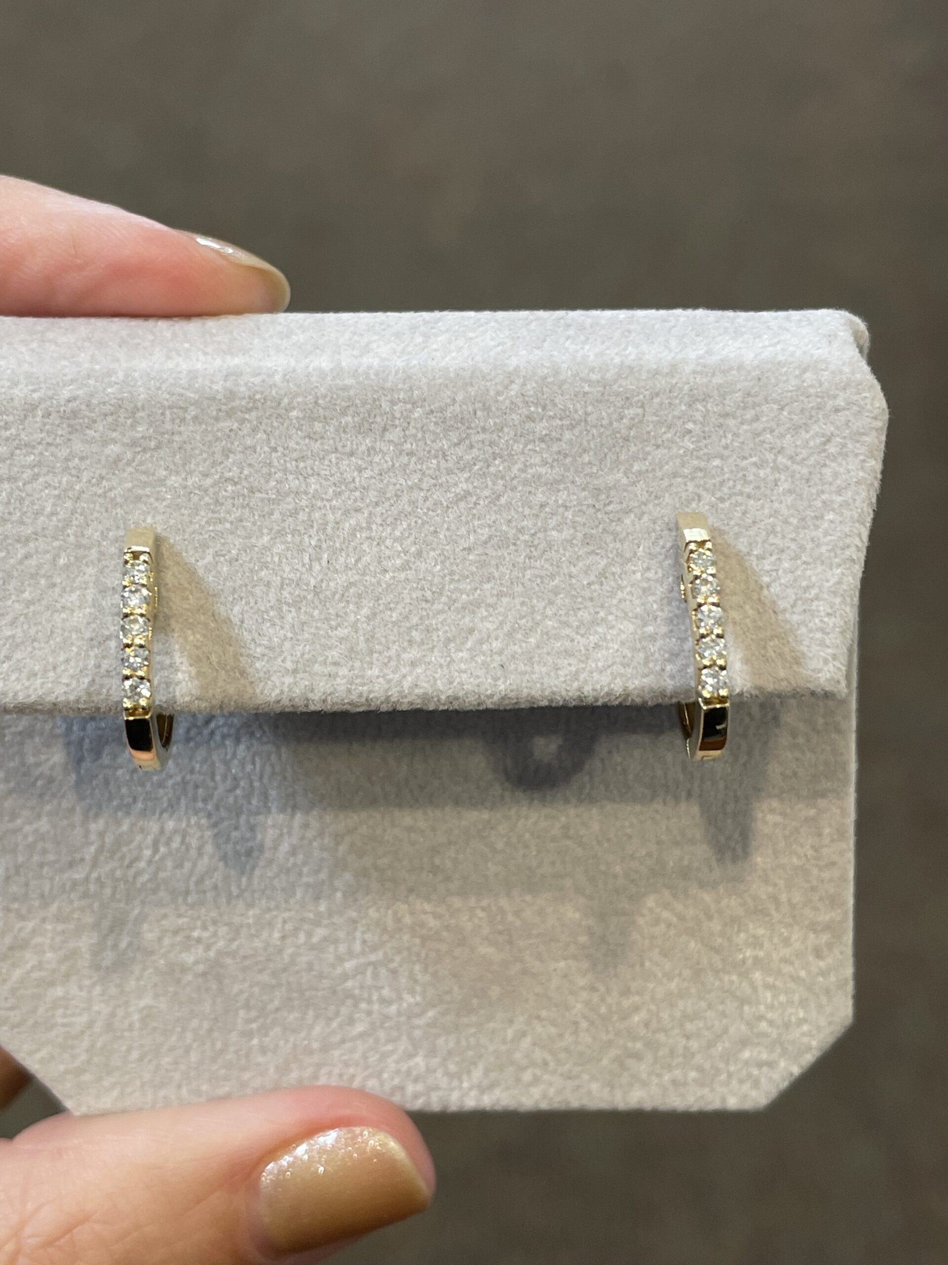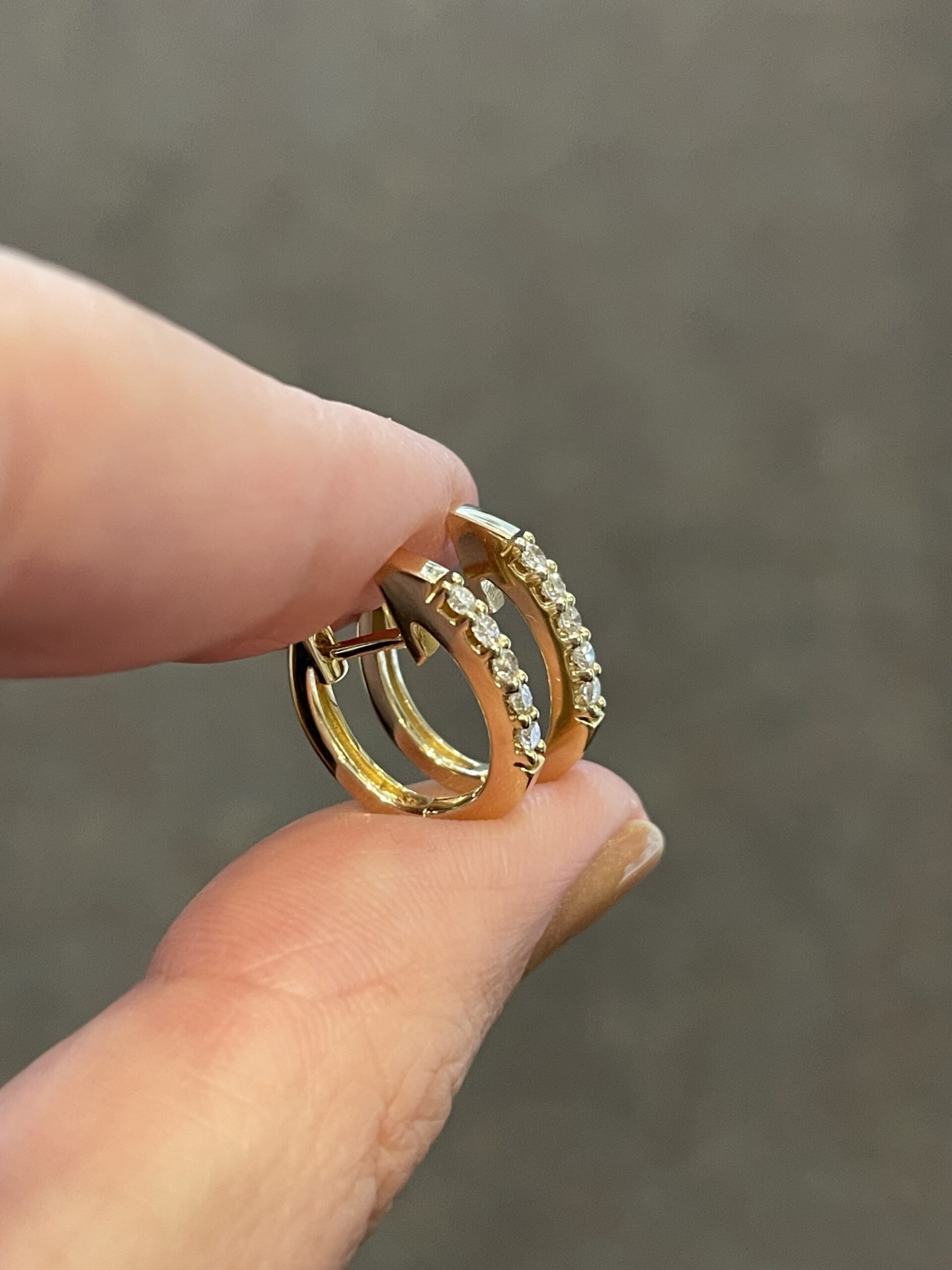 14k yellow gold genuine .22 Cttw Round Brilliant Cut diamond oval shaped huggy style hoop earrings, approximately 2 x 14.5 mm in size. These earrings have an entire weight of 2.6 grams.