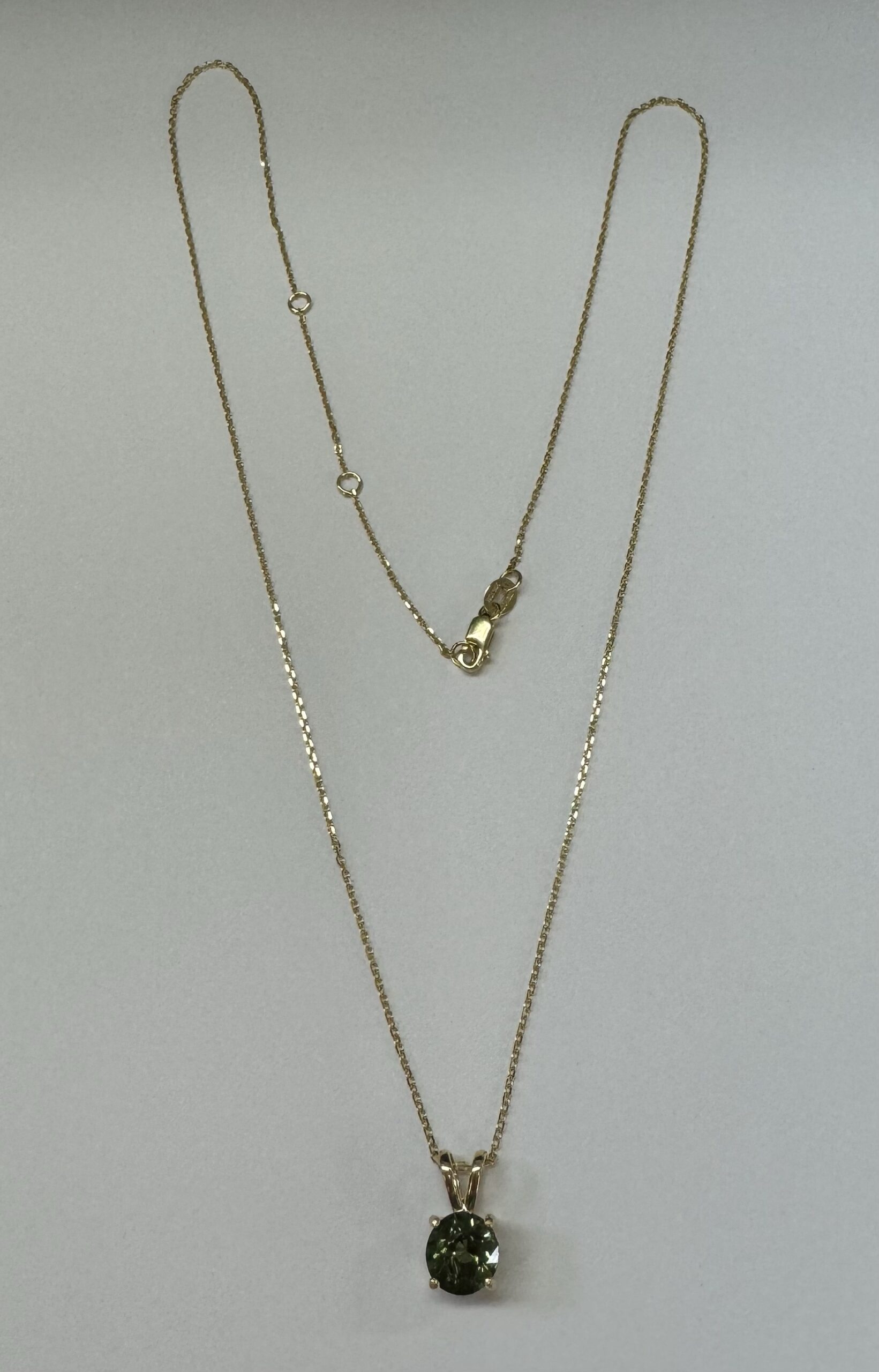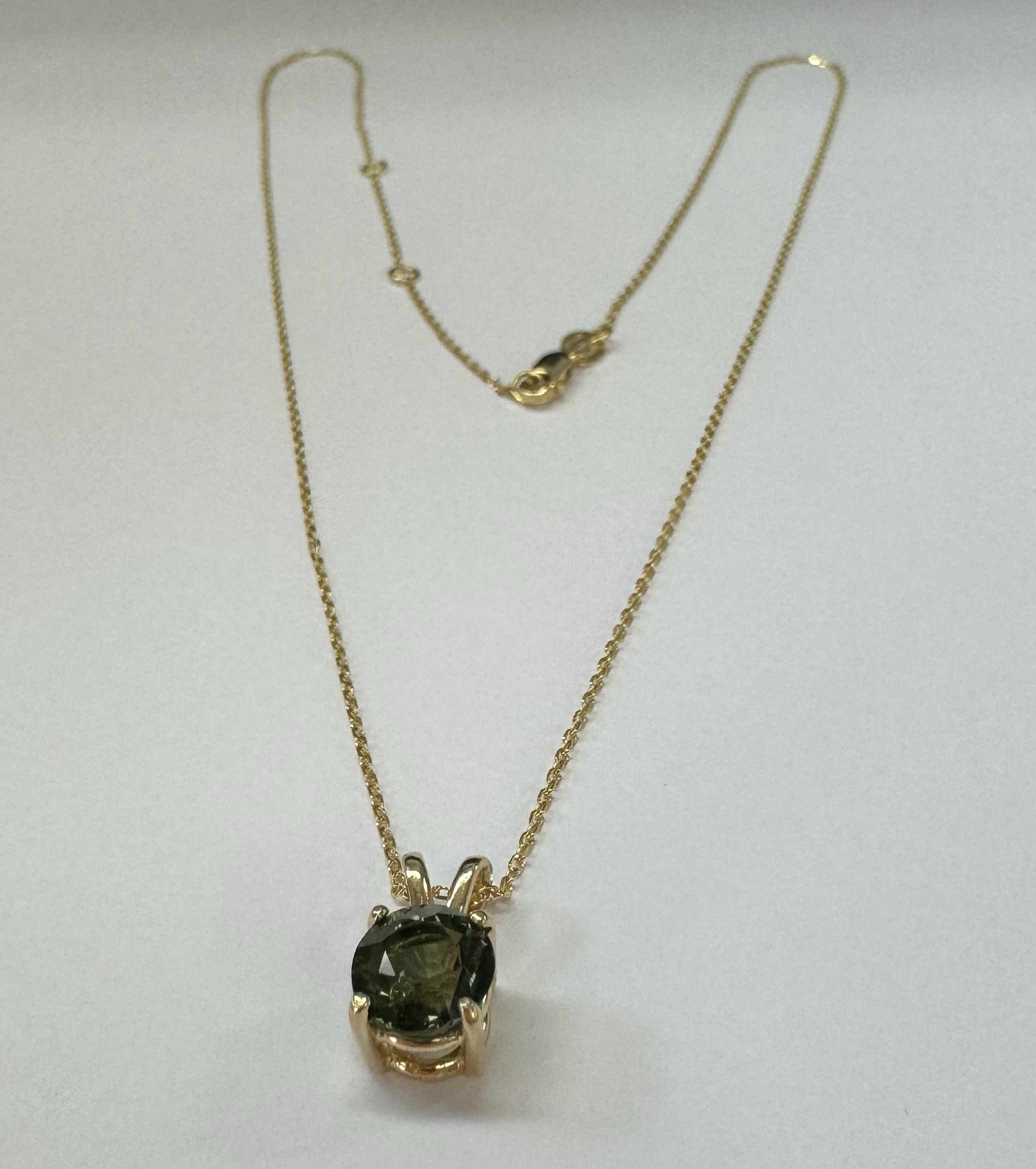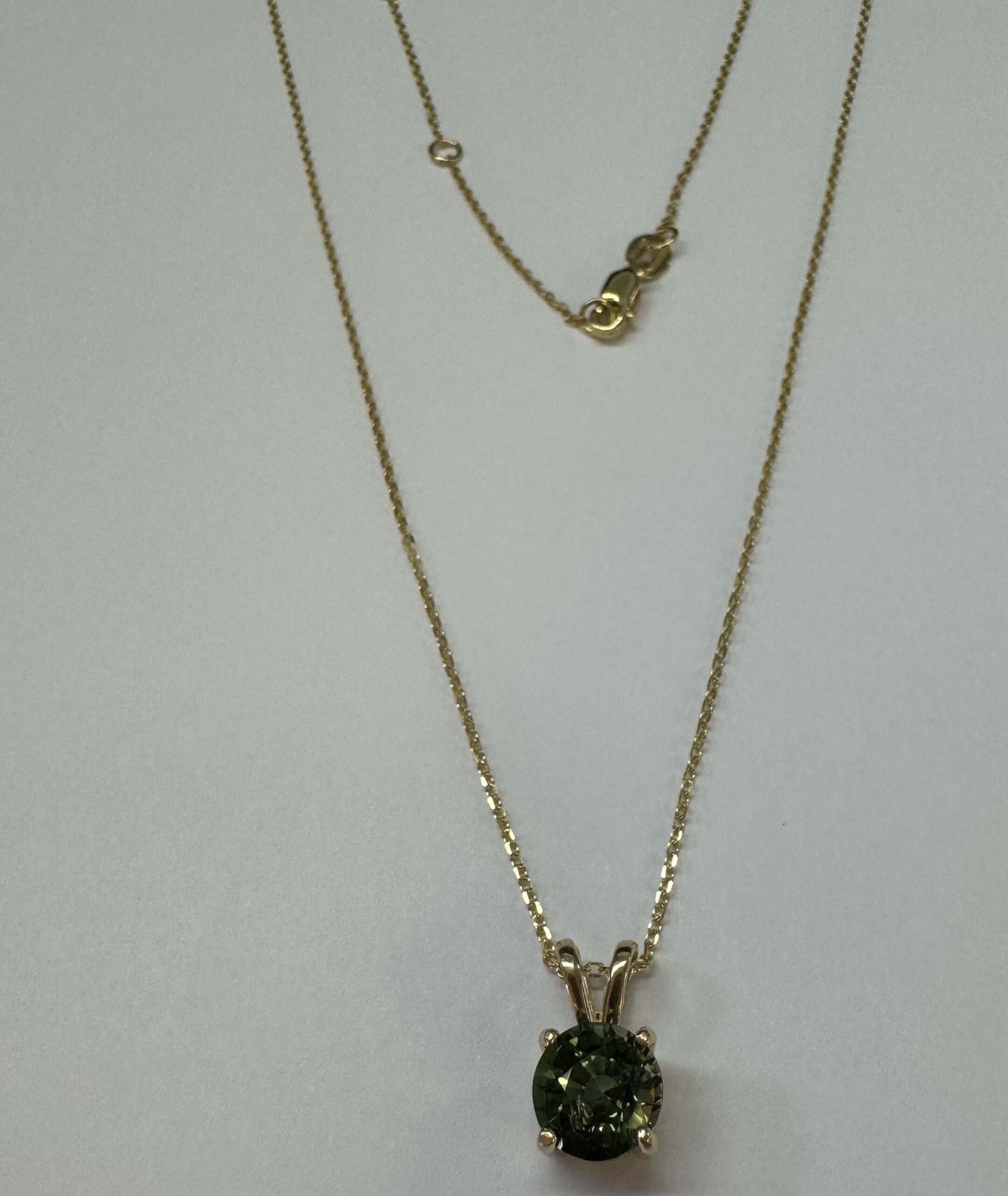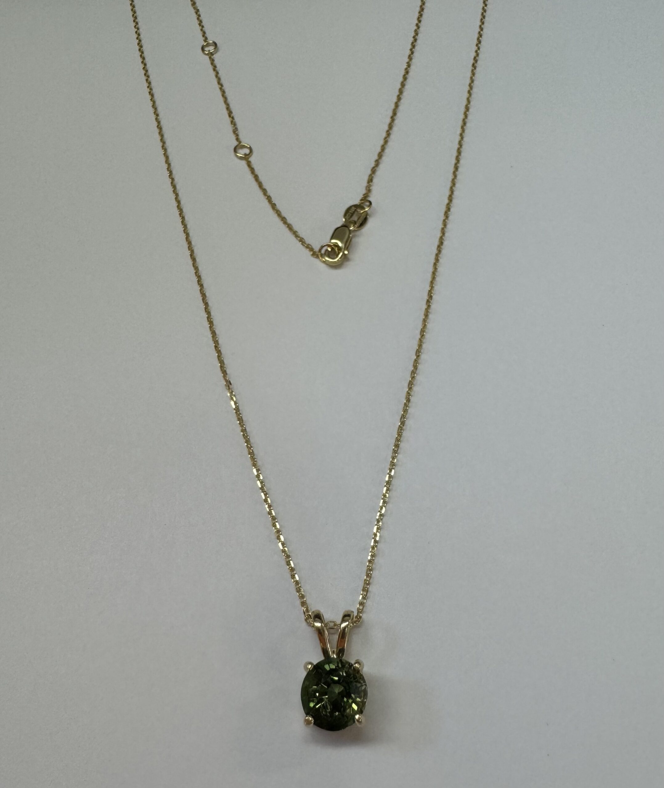14k yellow gold genuine 3/4 carat round, faceted Green Tourmaline (October birthstone alternative) basket set pendant, adjustable 16-18” with a lobster claw clasp. This piece has an entire weight of 2.0 grams.