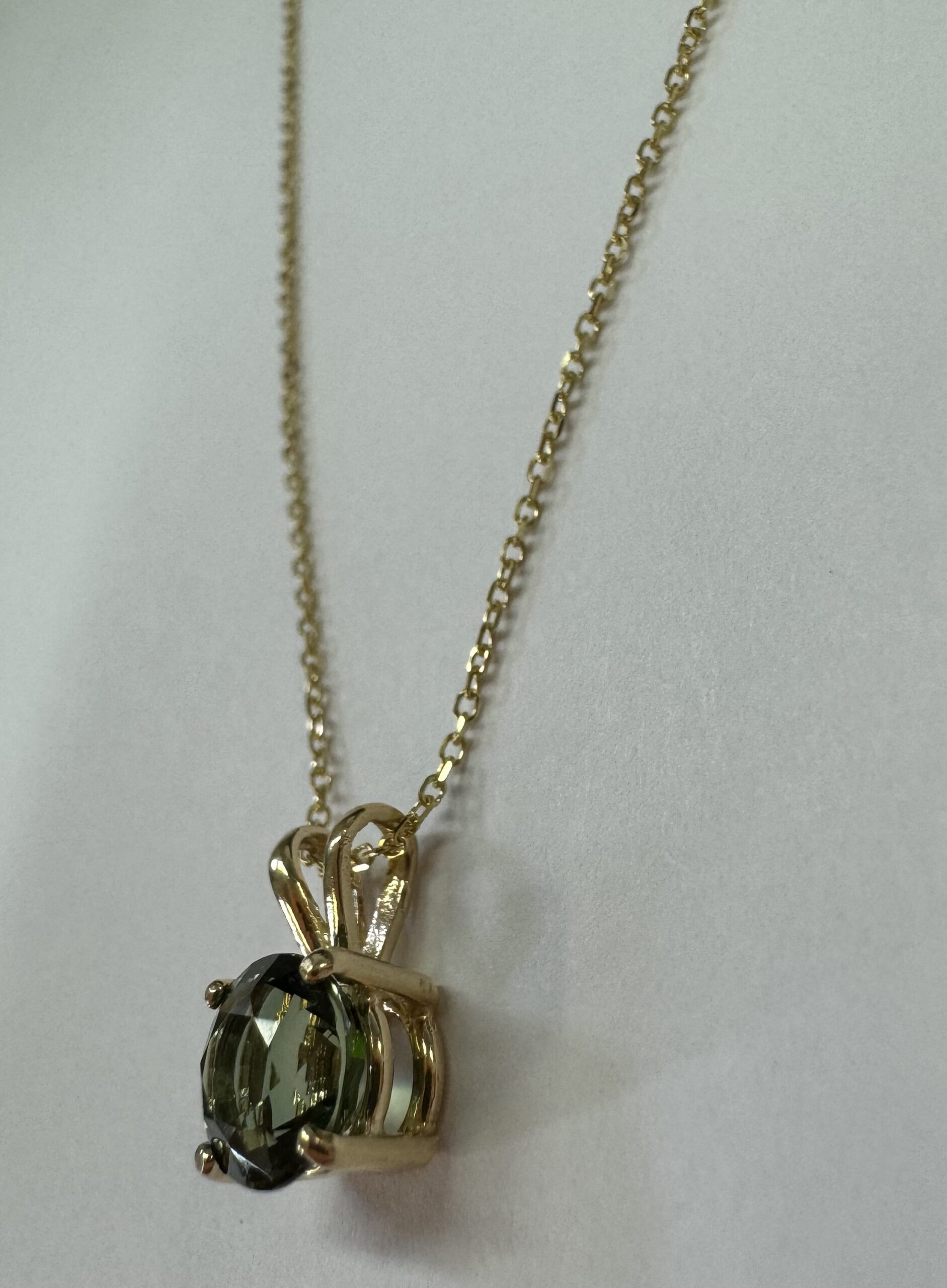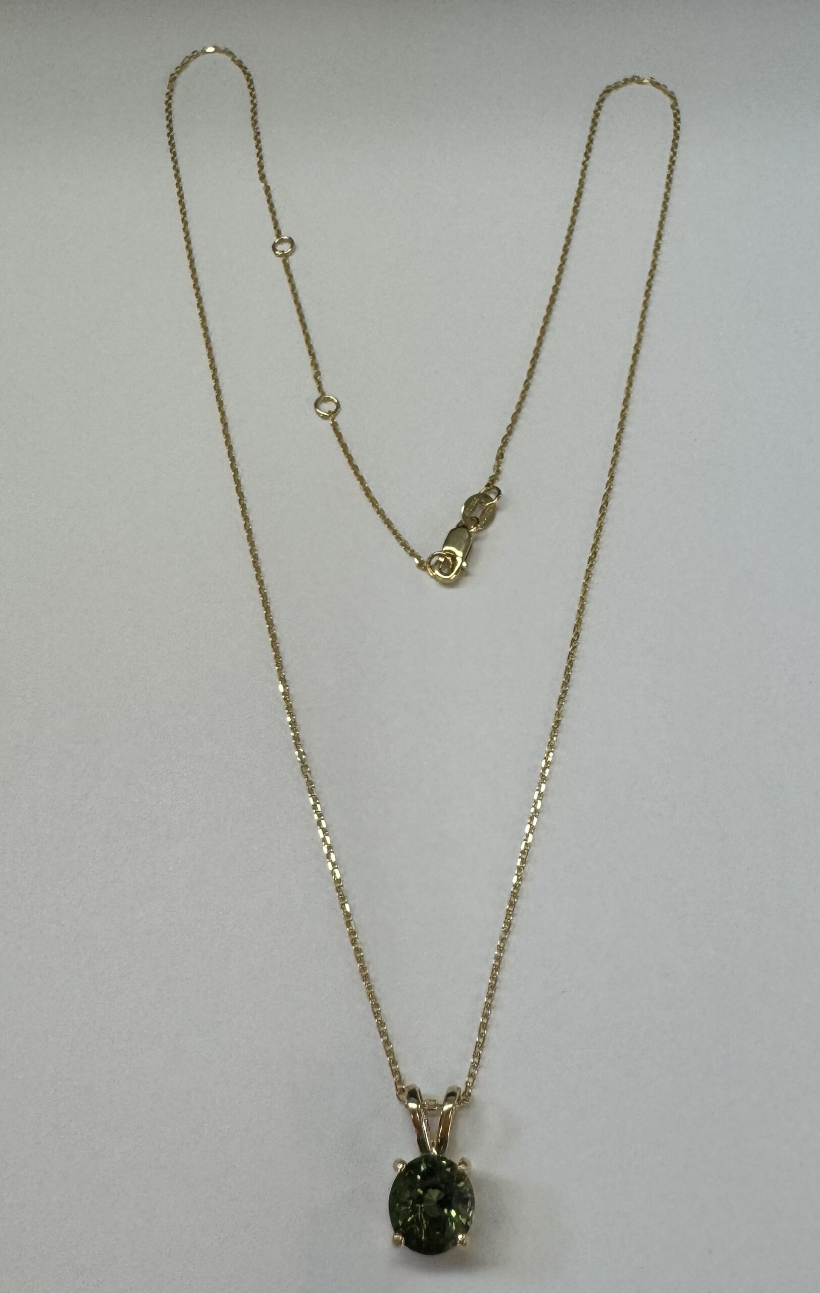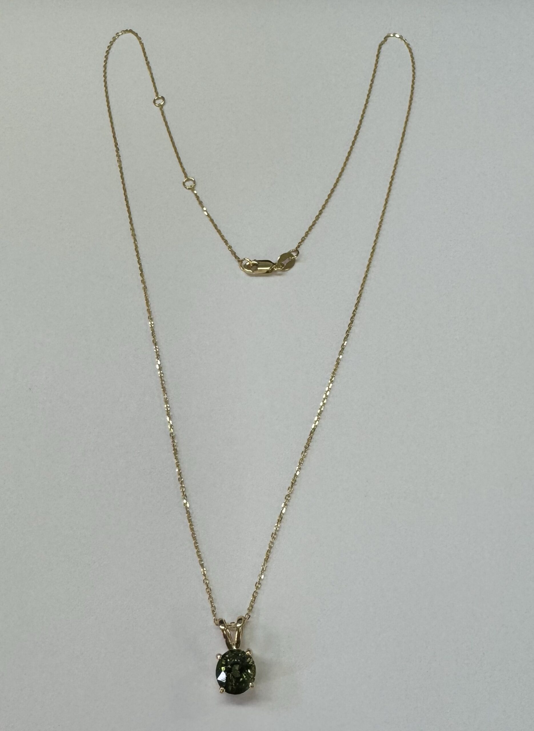 14k yellow gold genuine 3/4 carat round, faceted Green Tourmaline (October birthstone alternative) basket set pendant, adjustable 16-18” with a lobster claw clasp. This piece has an entire weight of 2.0 grams.
