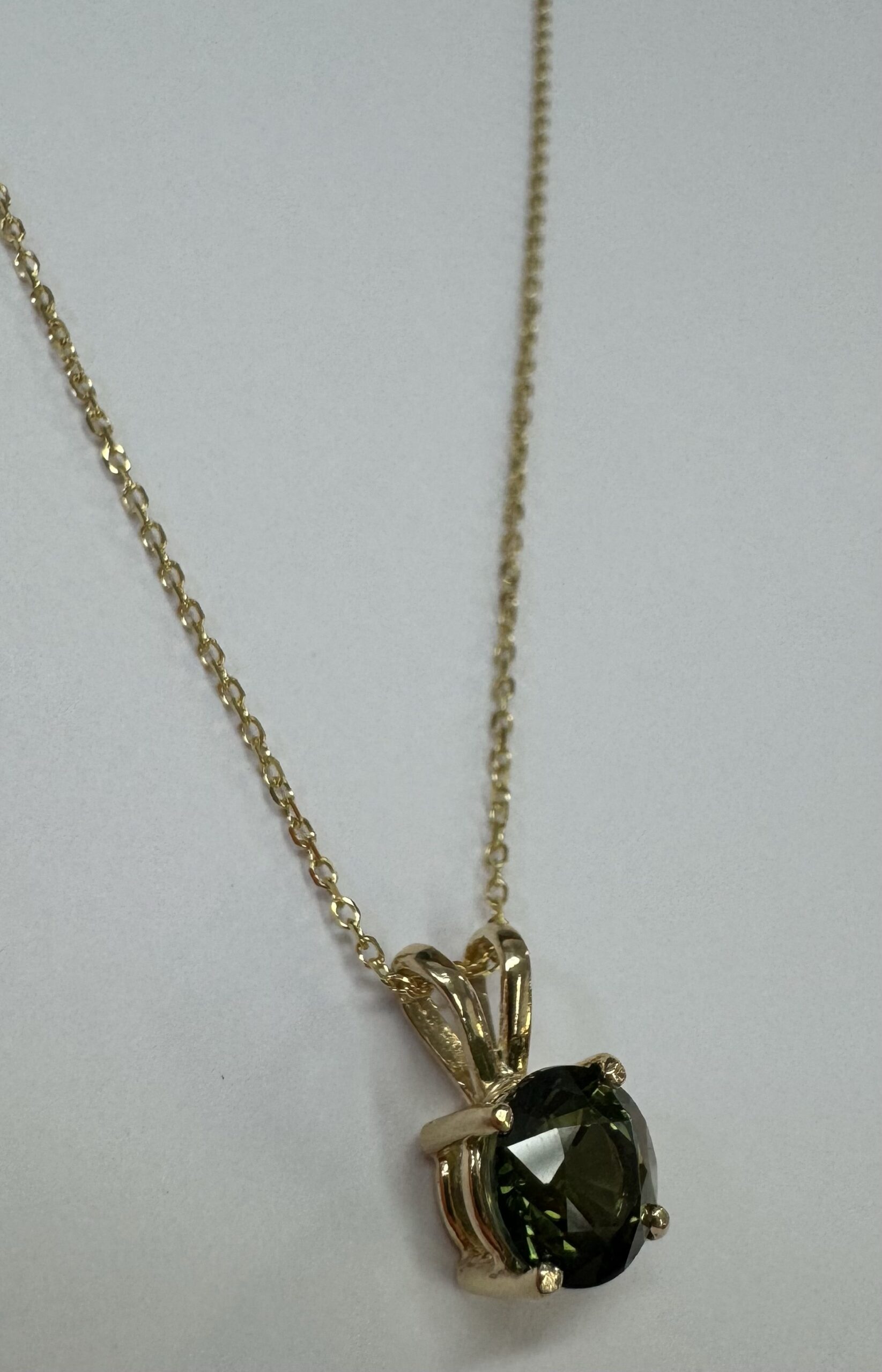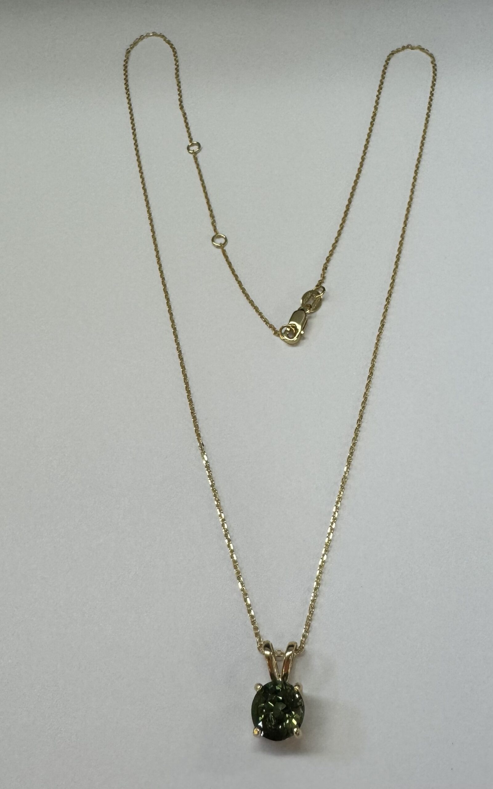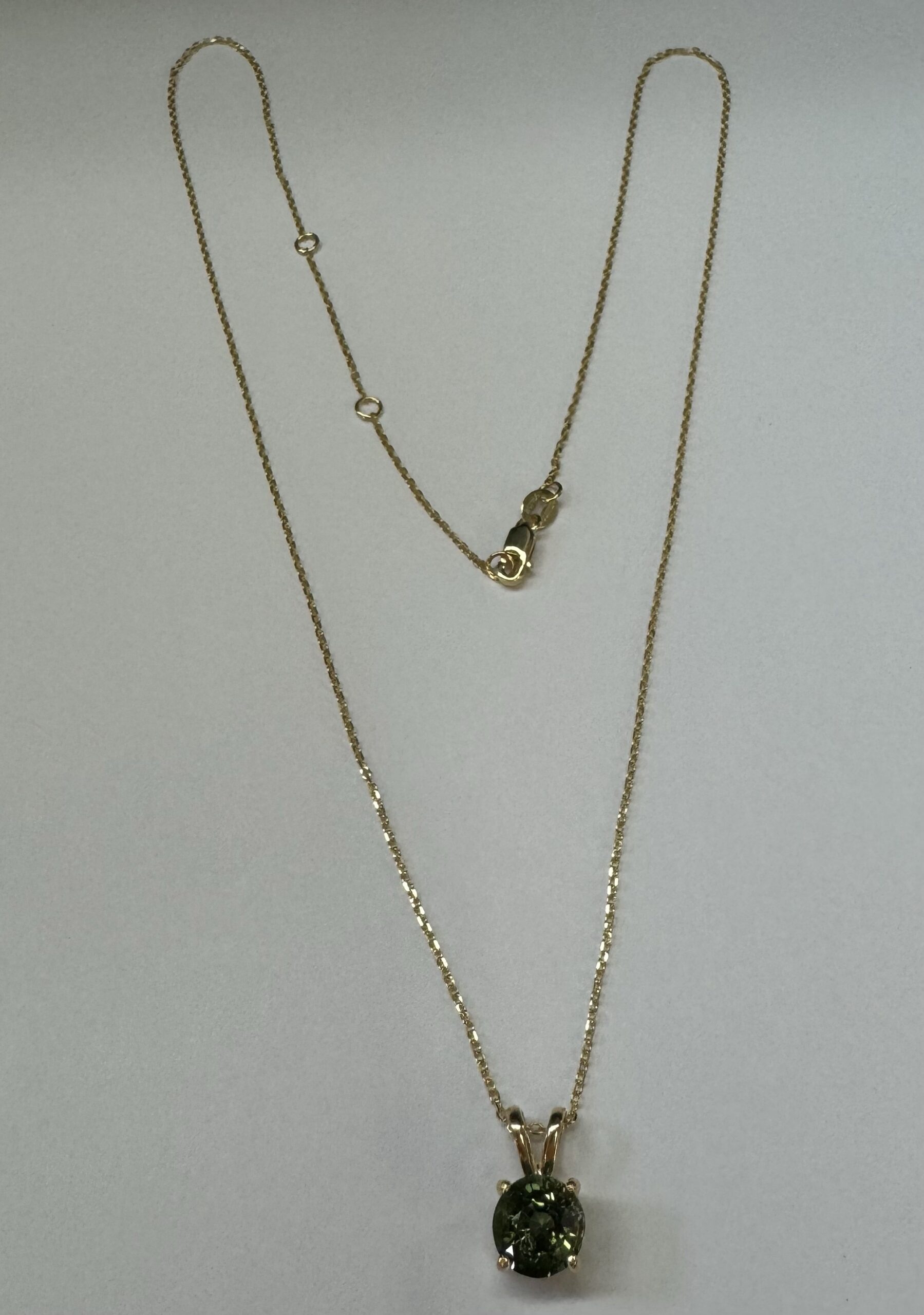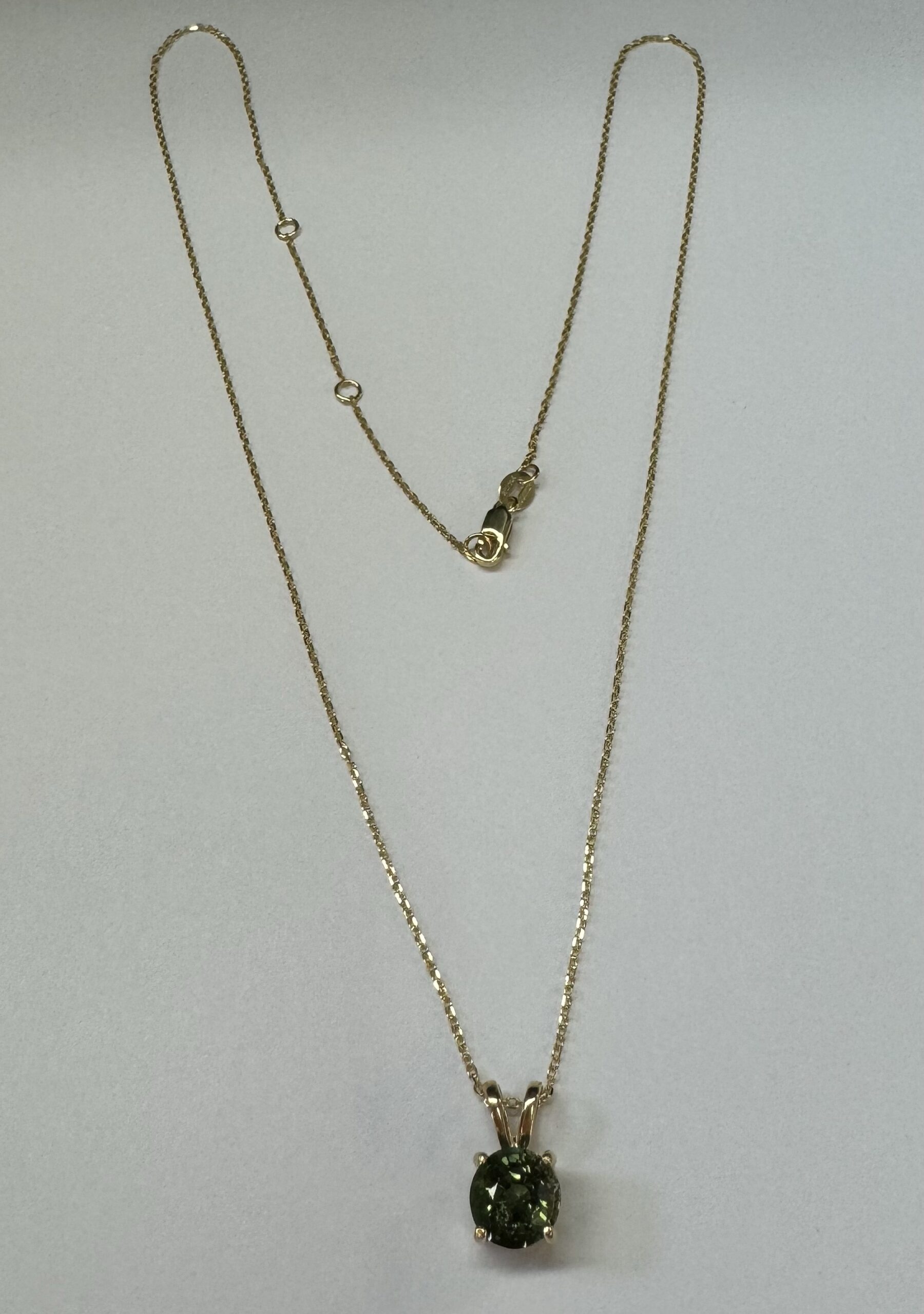14k yellow gold genuine 3/4 carat round, faceted Green Tourmaline (October birthstone alternative) basket set pendant, adjustable 16-18” with a lobster claw clasp. This piece has an entire weight of 2.0 grams.