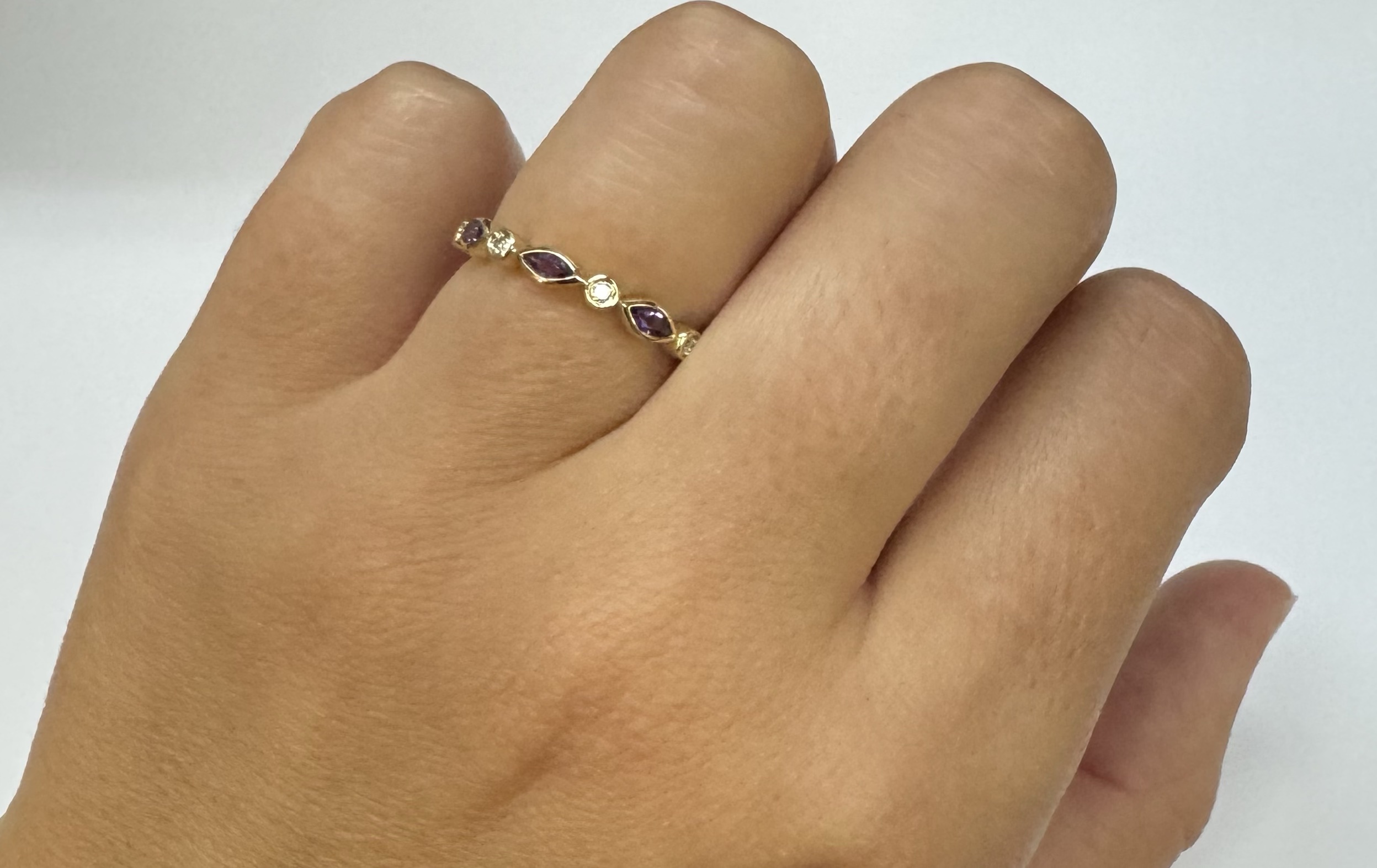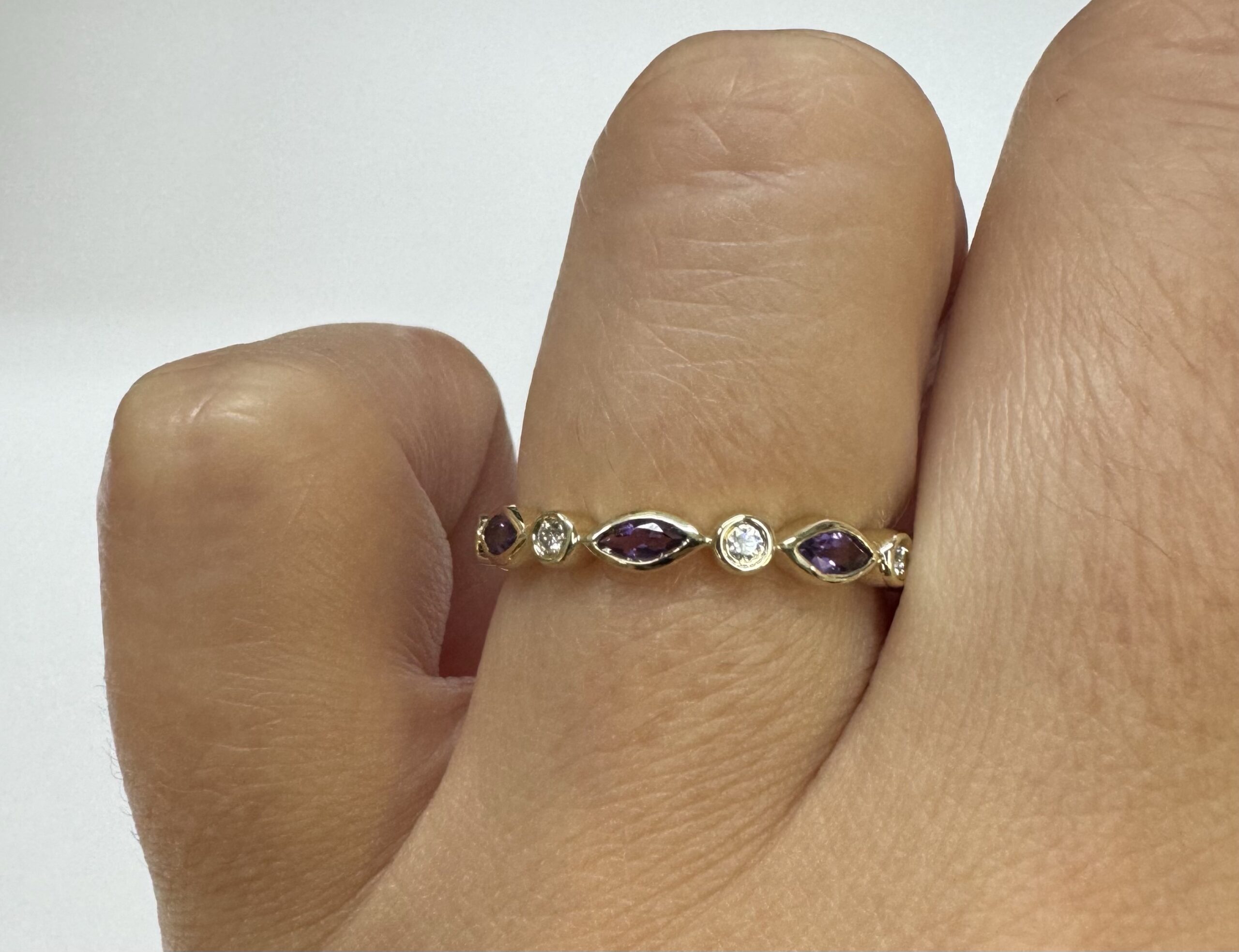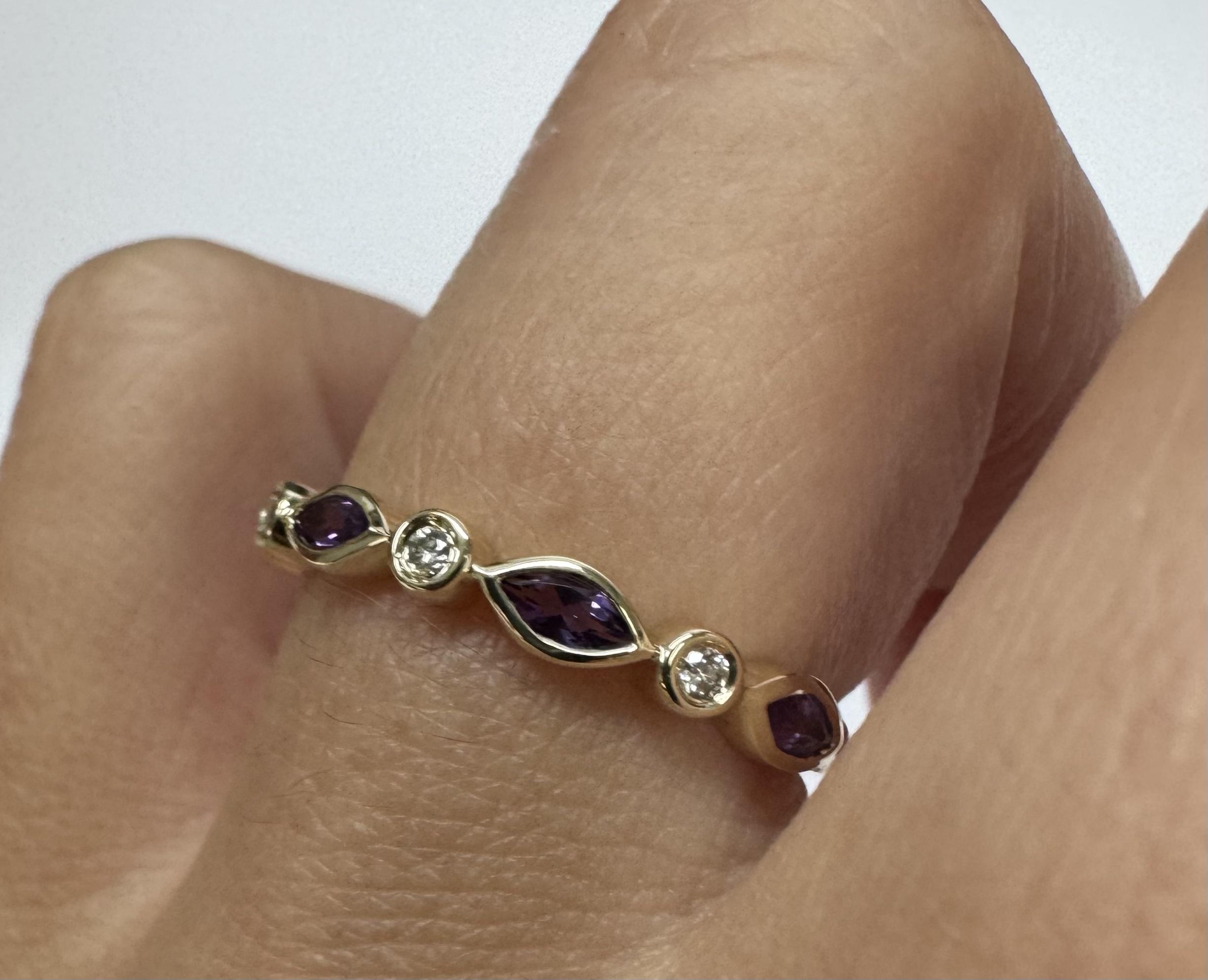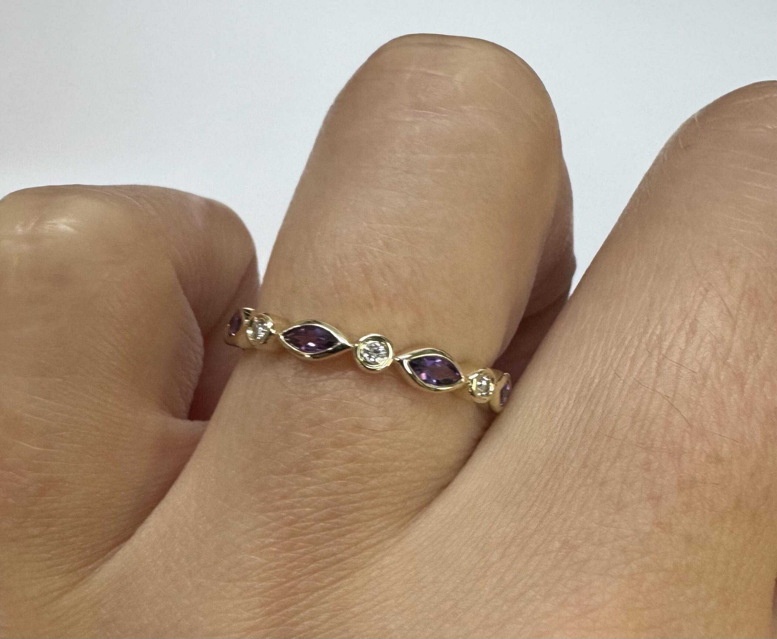 14k yellow gold genuine .36 cttw marquise shaped Amethyst & .06 cttw Round Brilliant Cut diamond bezel set band. These diamonds average G-H in color and SI1 in clarity. This band is a finger size 6 1/2, but it can be reasonably sized. Please make note of the finger size desired in the comments section at checkout. This band has an entire weight of 1.9 grams.