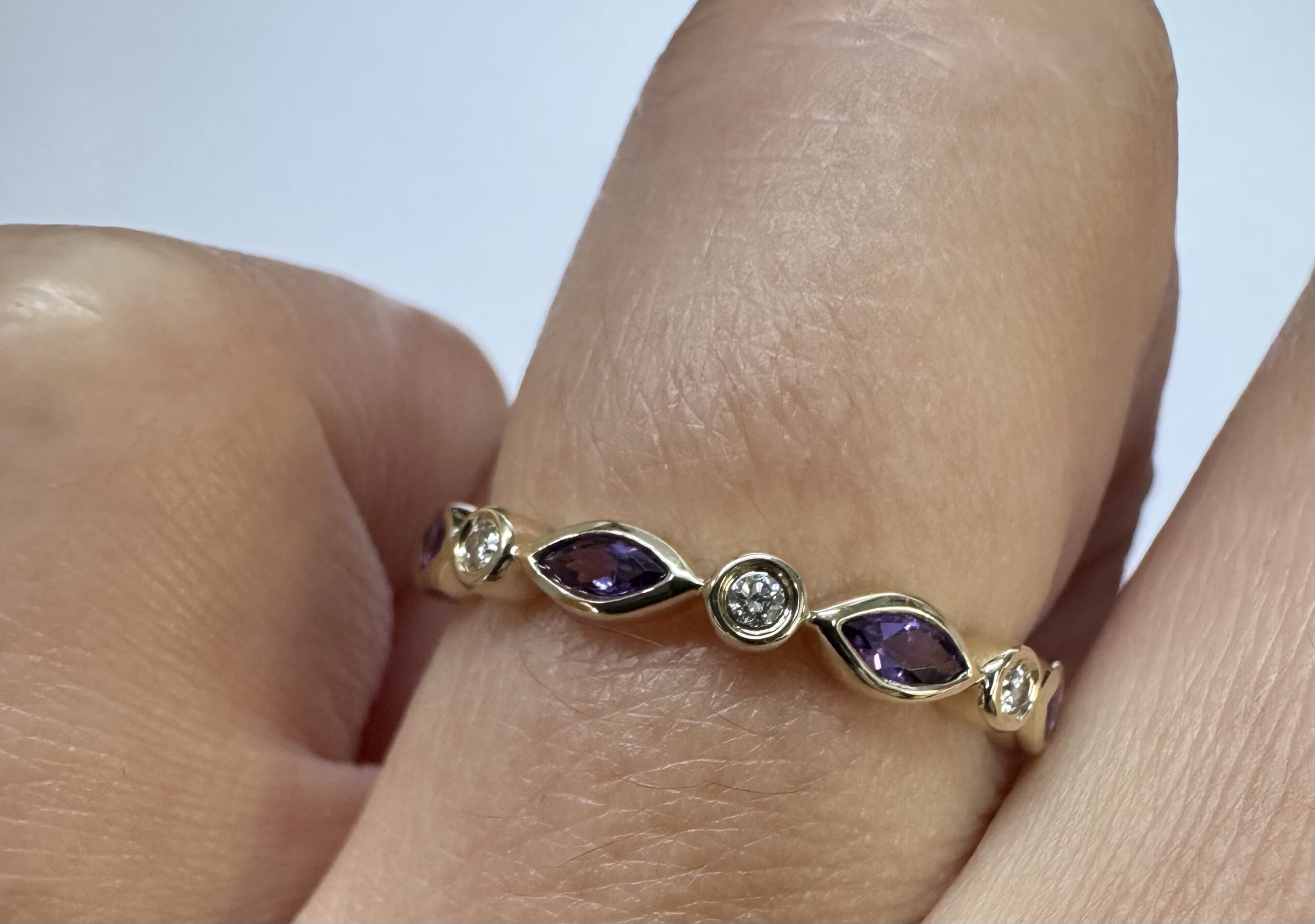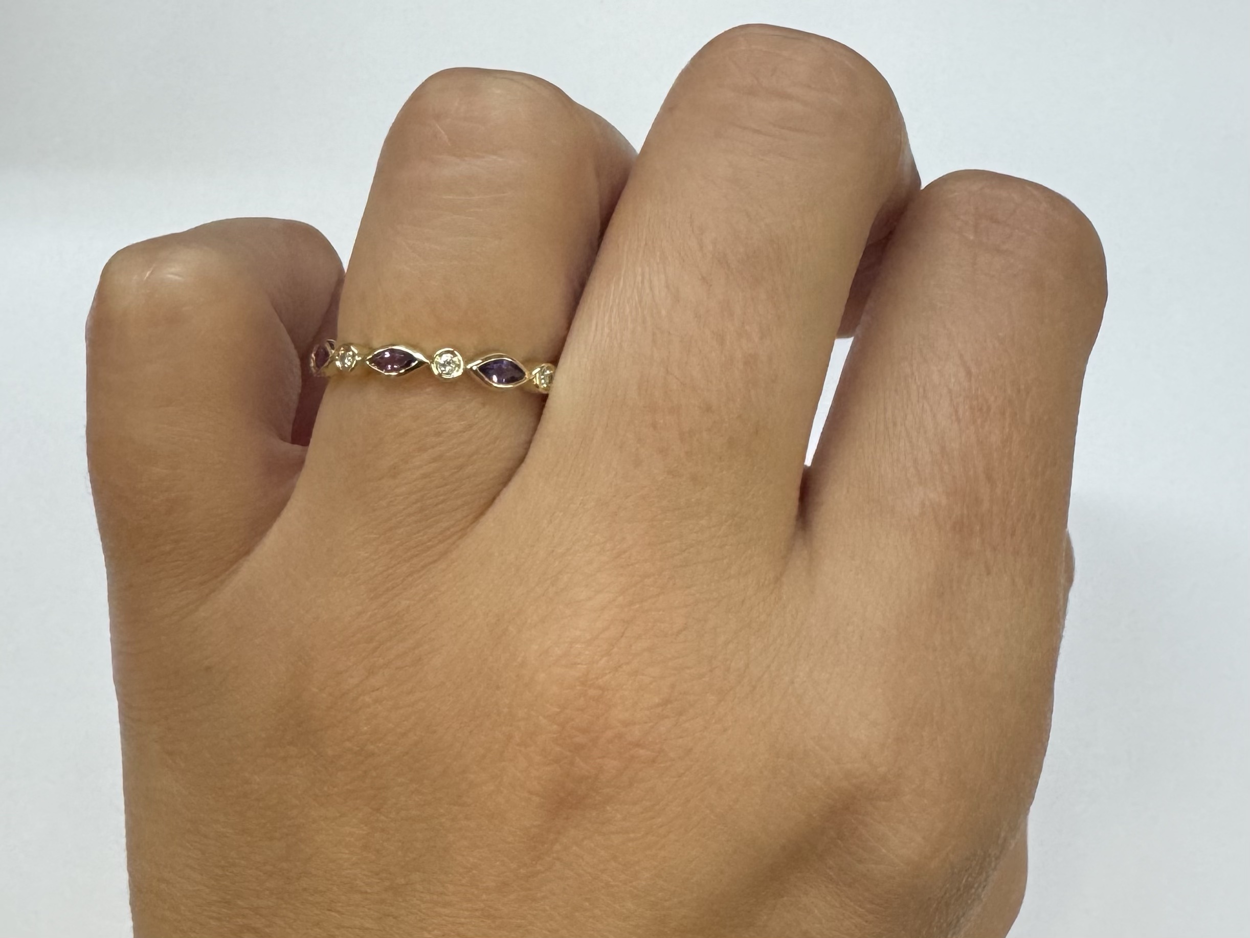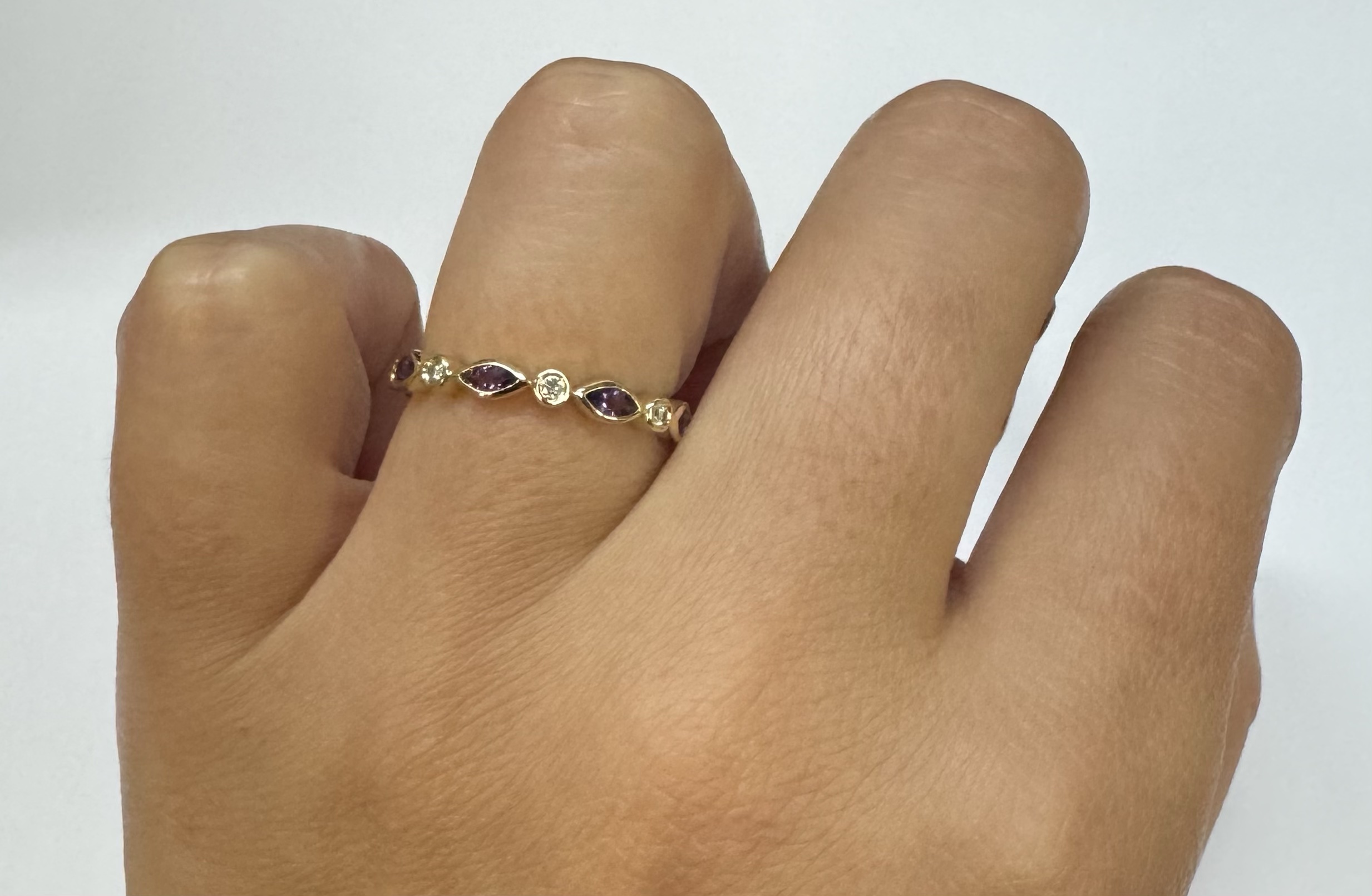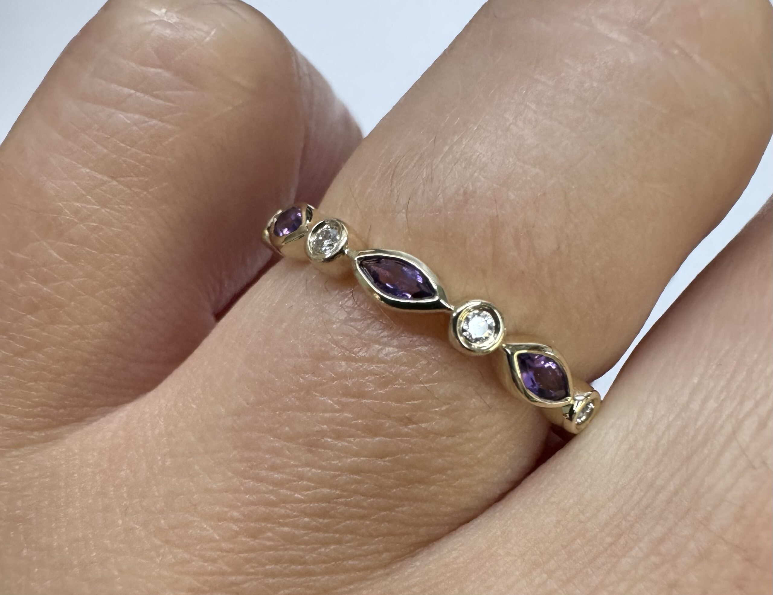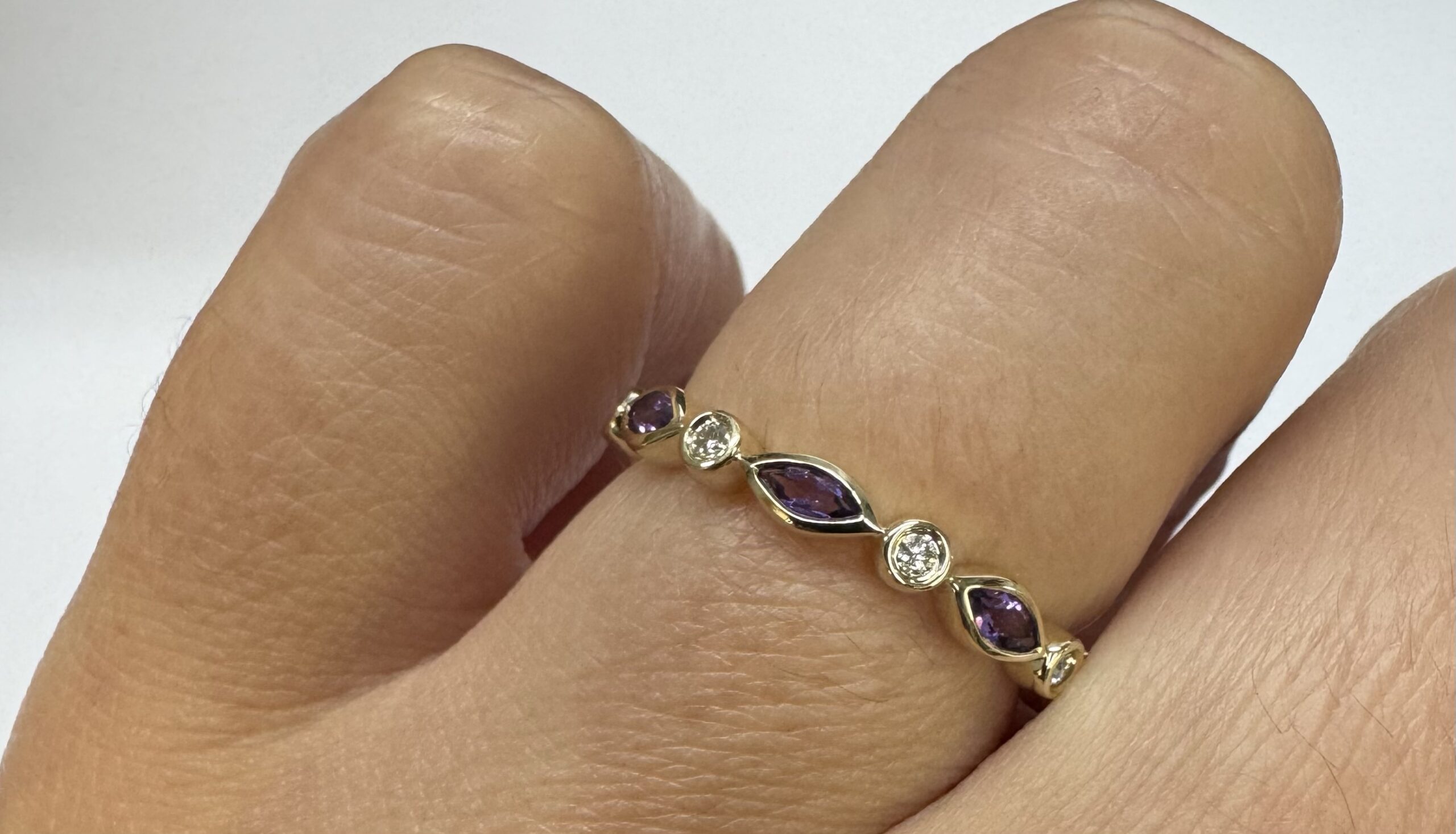 14k yellow gold genuine .36 cttw marquise shaped Amethyst & .06 cttw Round Brilliant Cut diamond bezel set band. These diamonds average G-H in color and SI1 in clarity. This band is a finger size 6 1/2, but it can be reasonably sized. Please make note of the finger size desired in the comments section at checkout. This band has an entire weight of 1.9 grams.