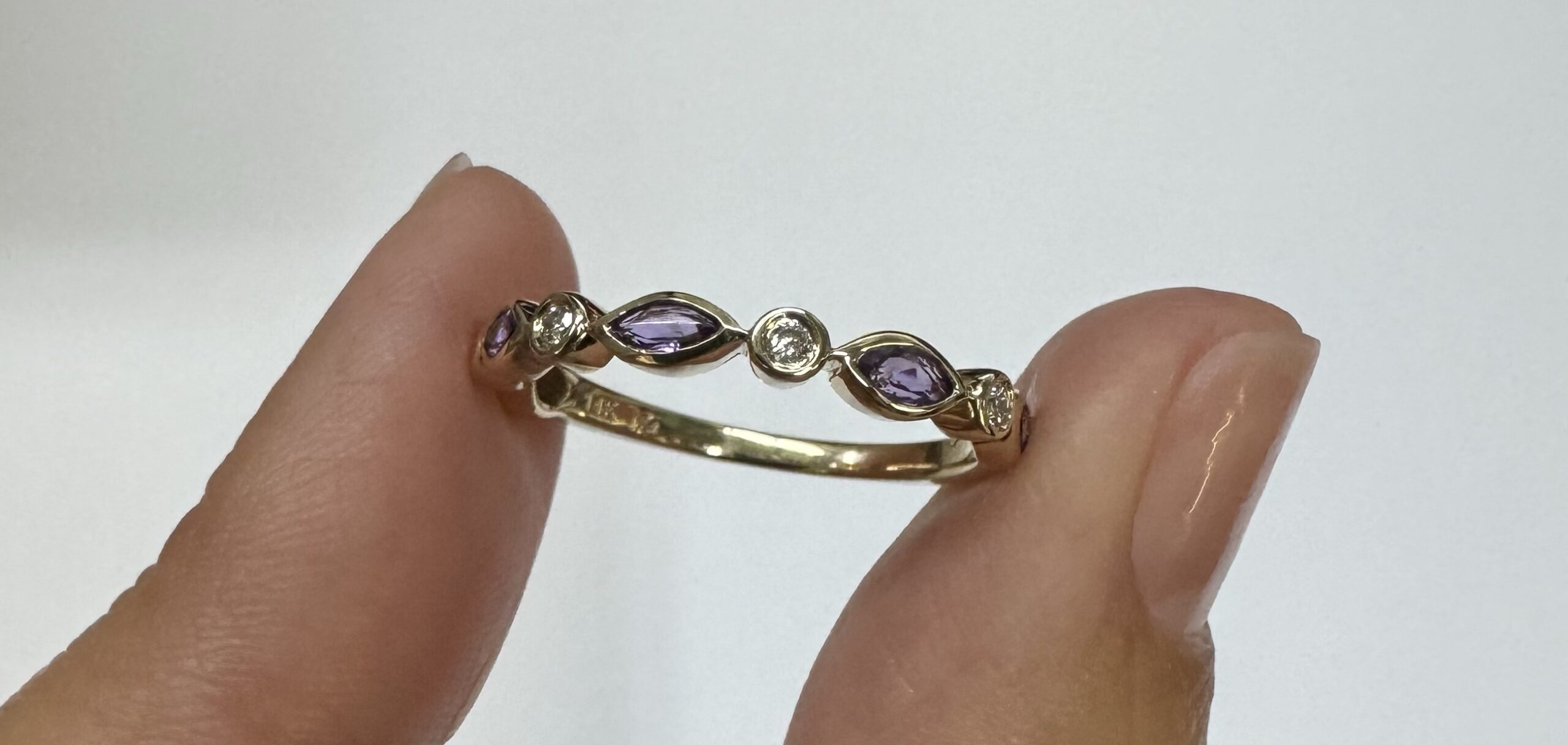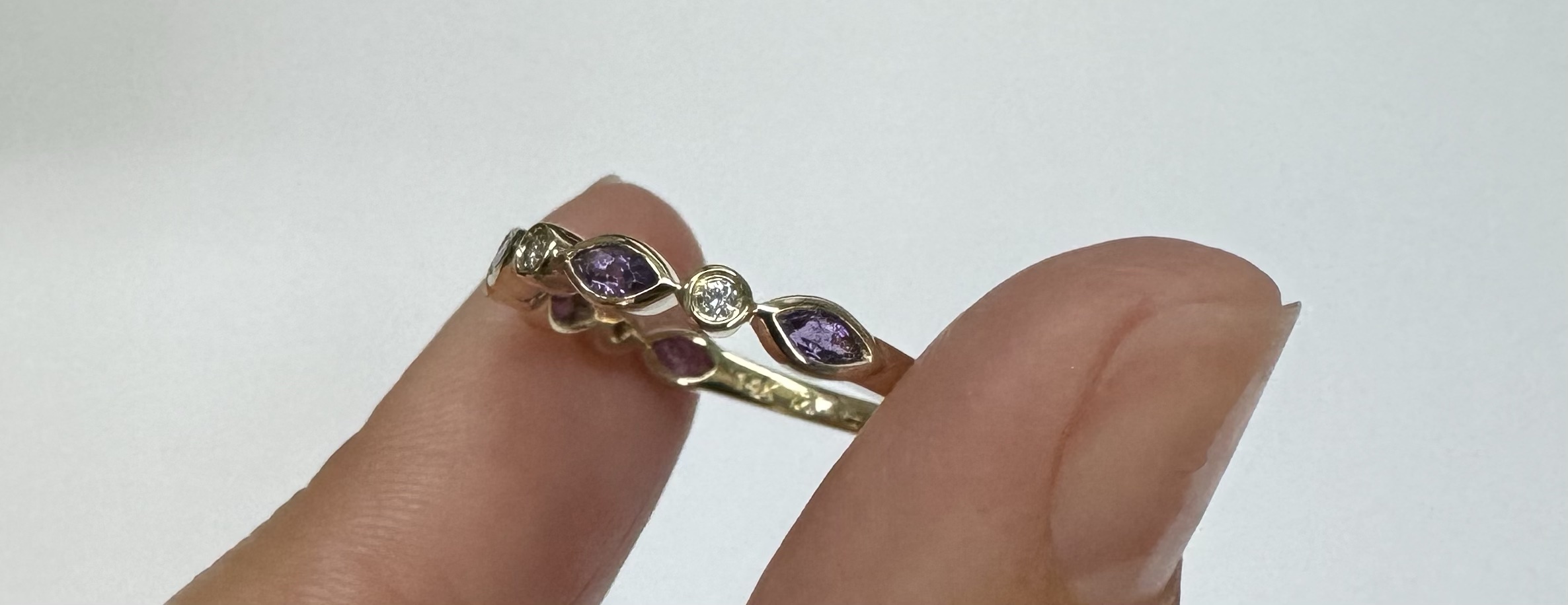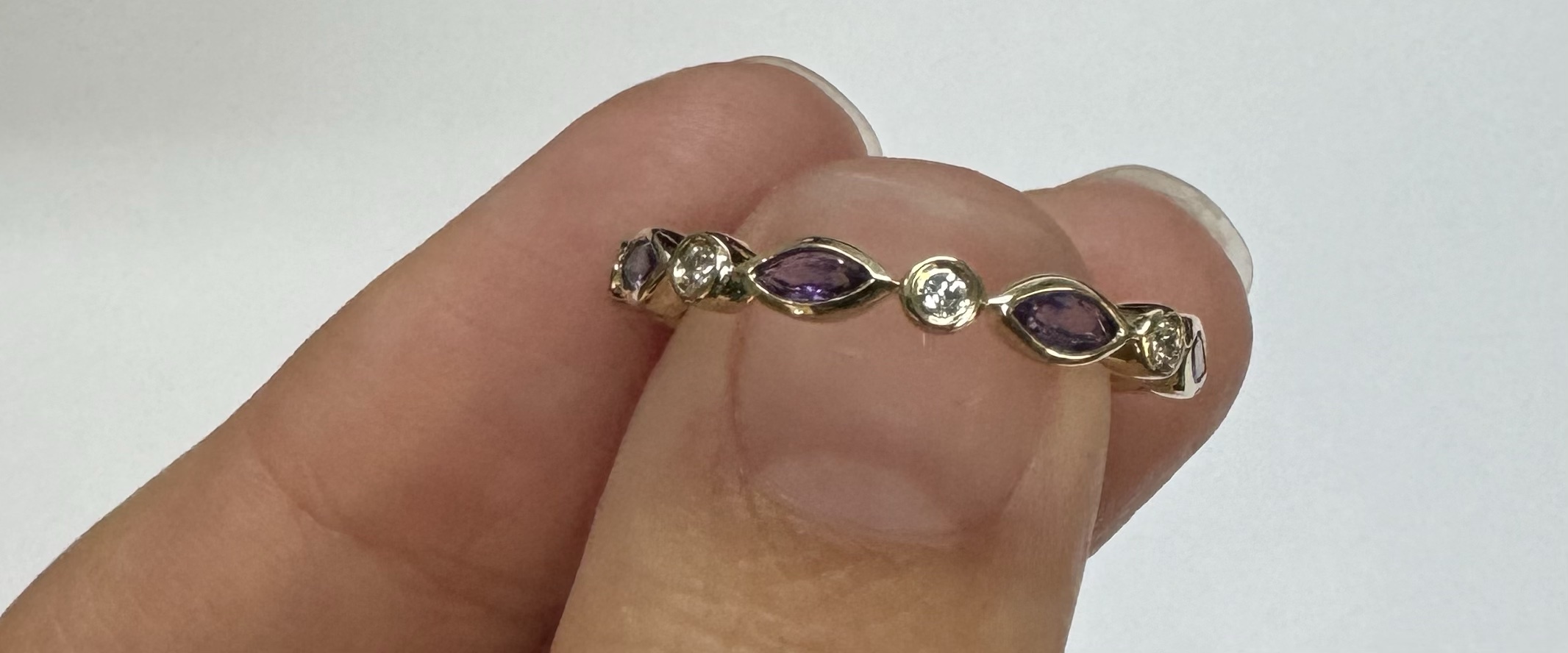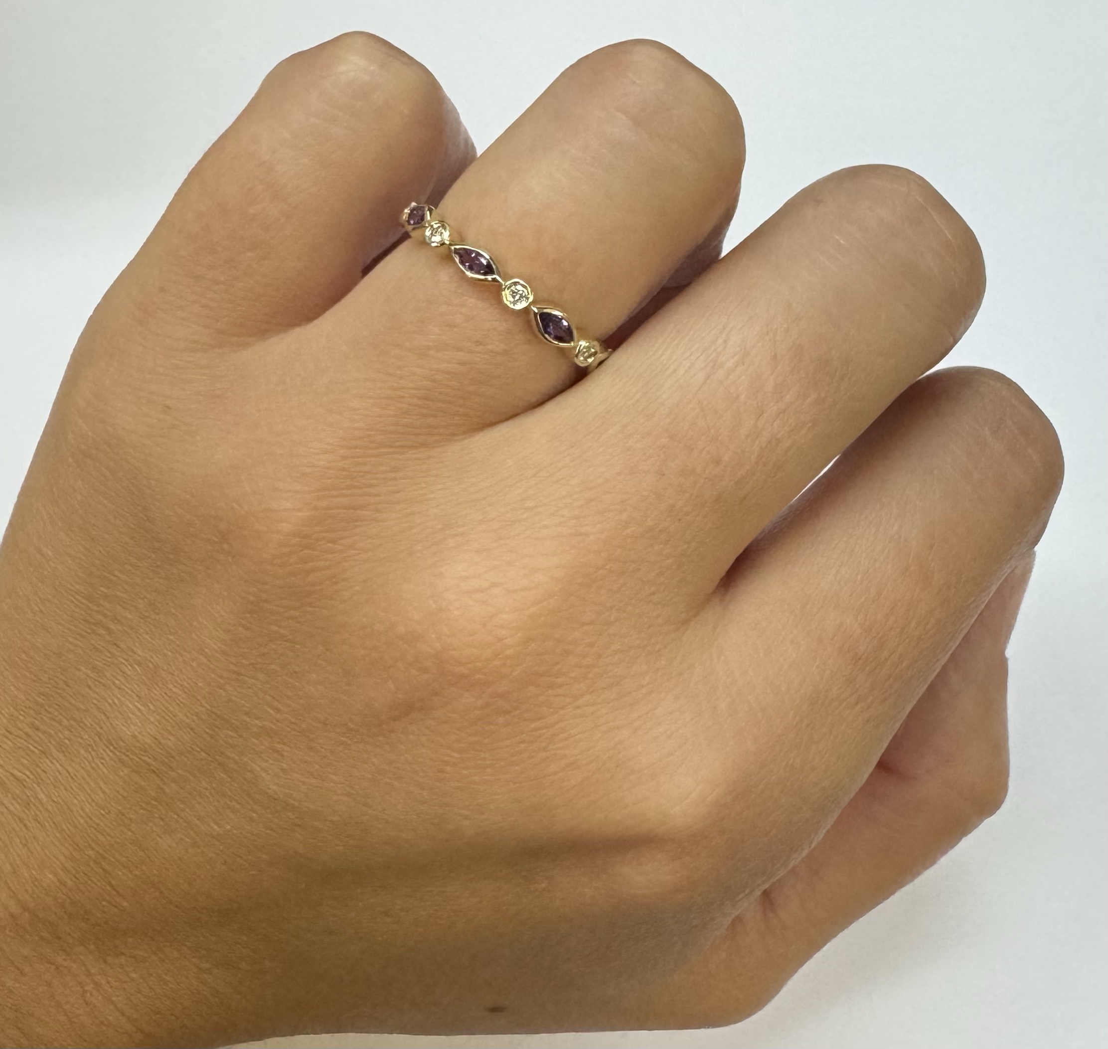 14k yellow gold genuine .36 cttw marquise shaped Amethyst & .06 cttw Round Brilliant Cut diamond bezel set band. These diamonds average G-H in color and SI1 in clarity. This band is a finger size 6 1/2, but it can be reasonably sized. Please make note of the finger size desired in the comments section at checkout. This band has an entire weight of 1.9 grams.