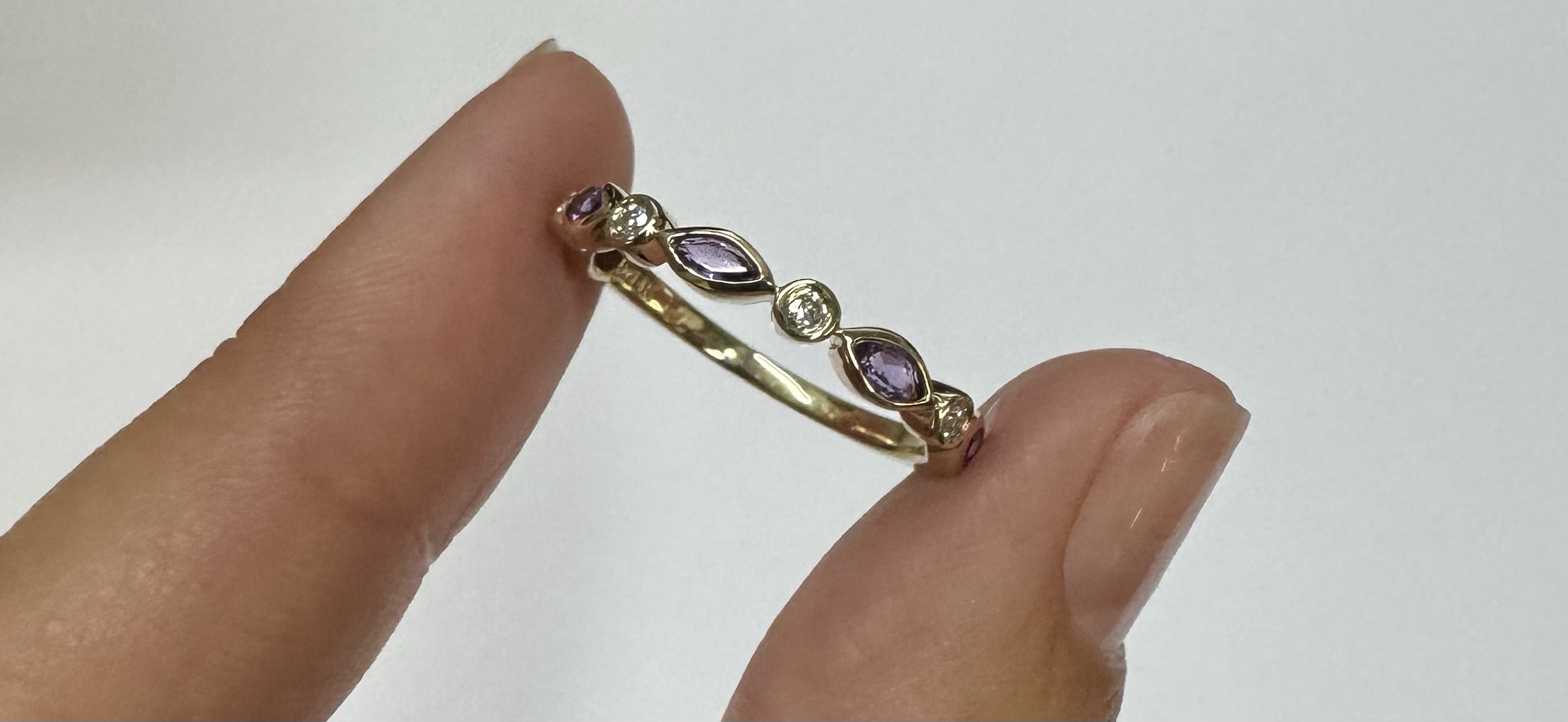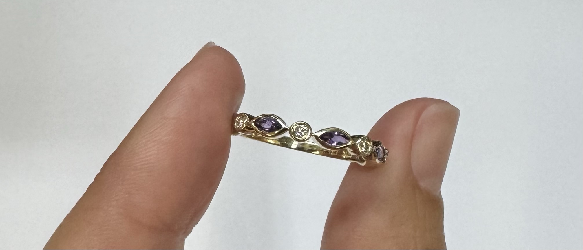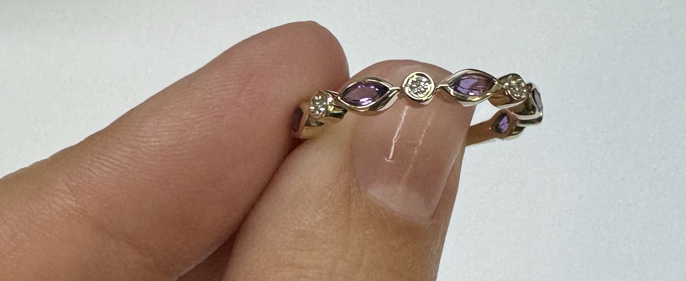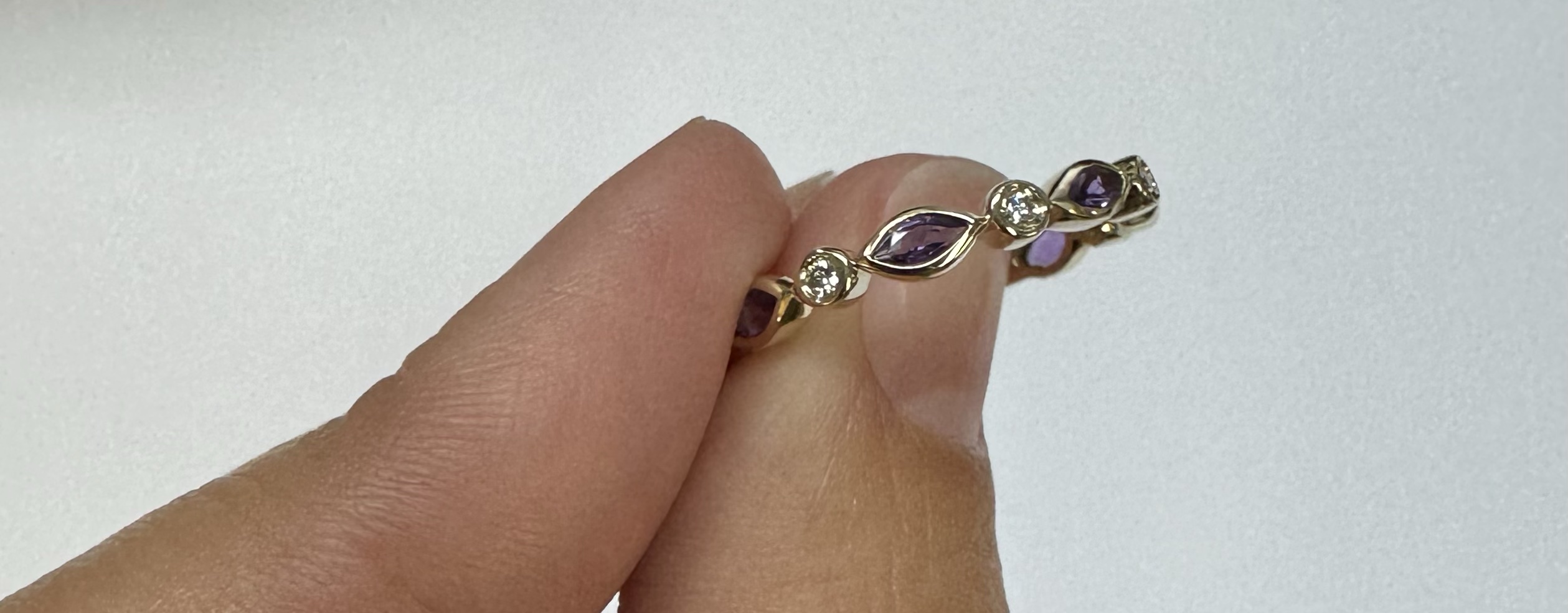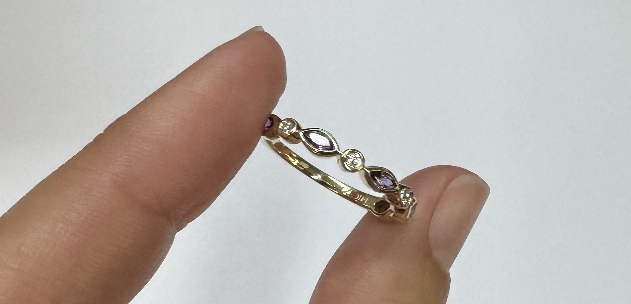 14k yellow gold genuine .36 cttw marquise shaped Amethyst & .06 cttw Round Brilliant Cut diamond bezel set band. These diamonds average G-H in color and SI1 in clarity. This band is a finger size 6 1/2, but it can be reasonably sized. Please make note of the finger size desired in the comments section at checkout. This band has an entire weight of 1.9 grams.