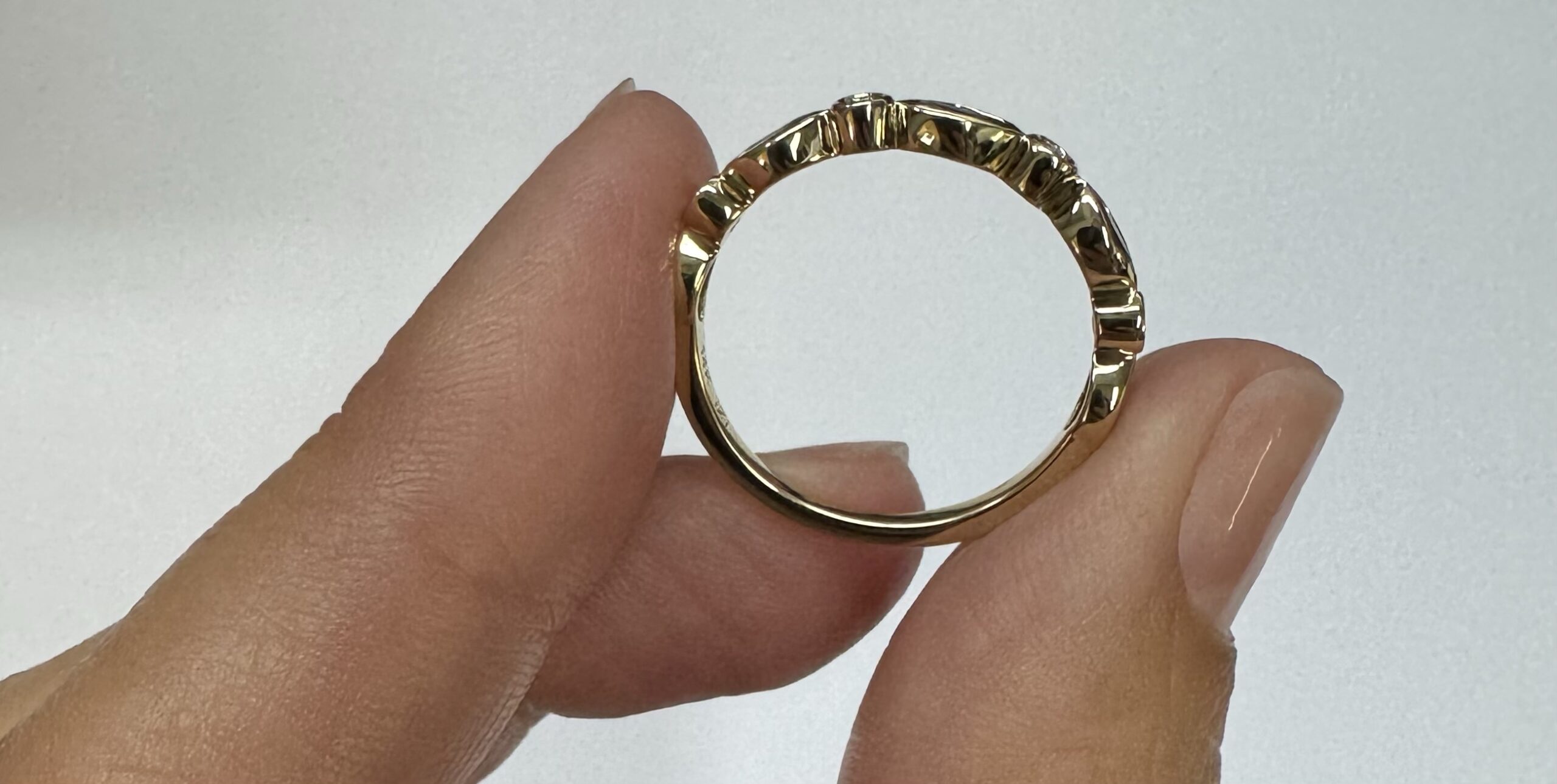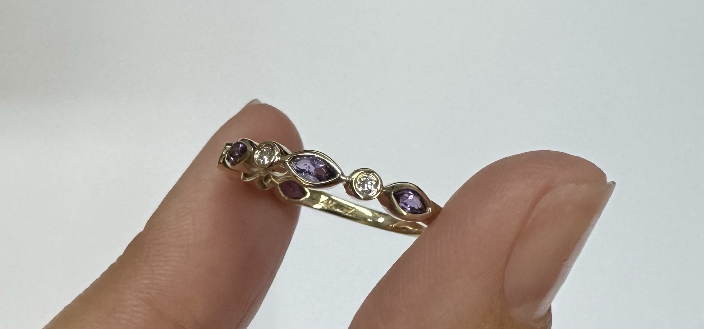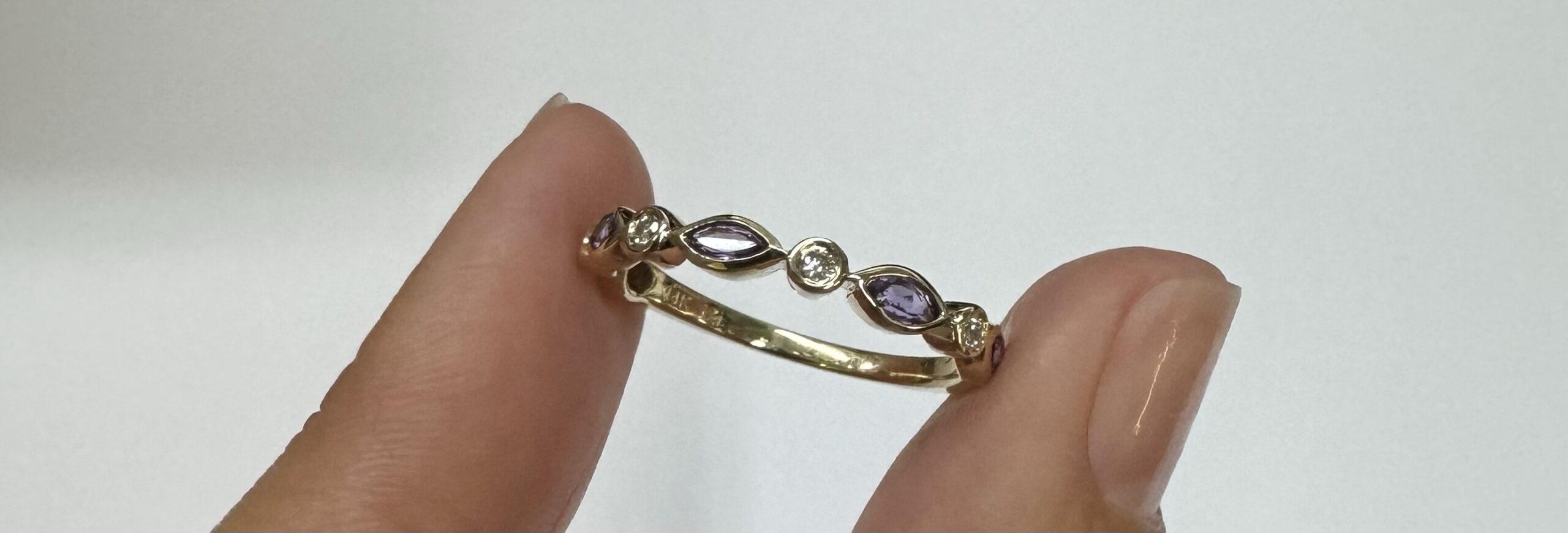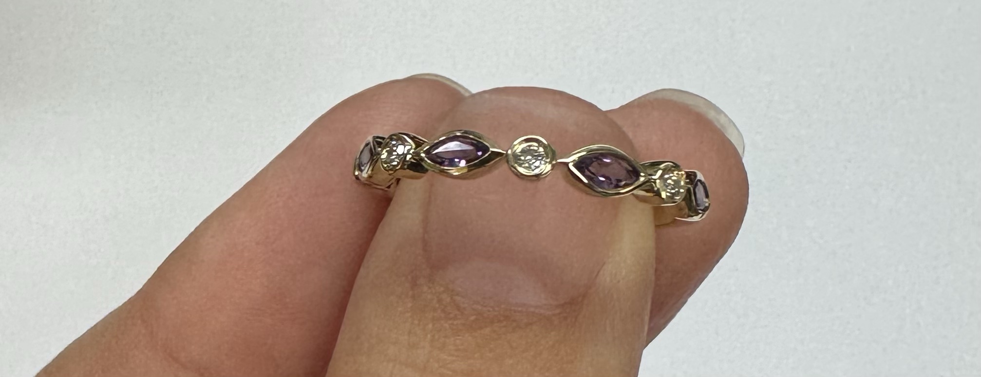14k yellow gold genuine .36 cttw marquise shaped Amethyst & .06 cttw Round Brilliant Cut diamond bezel set band. These diamonds average G-H in color and SI1 in clarity. This band is a finger size 6 1/2, but it can be reasonably sized. Please make note of the finger size desired in the comments section at checkout. This band has an entire weight of 1.9 grams.