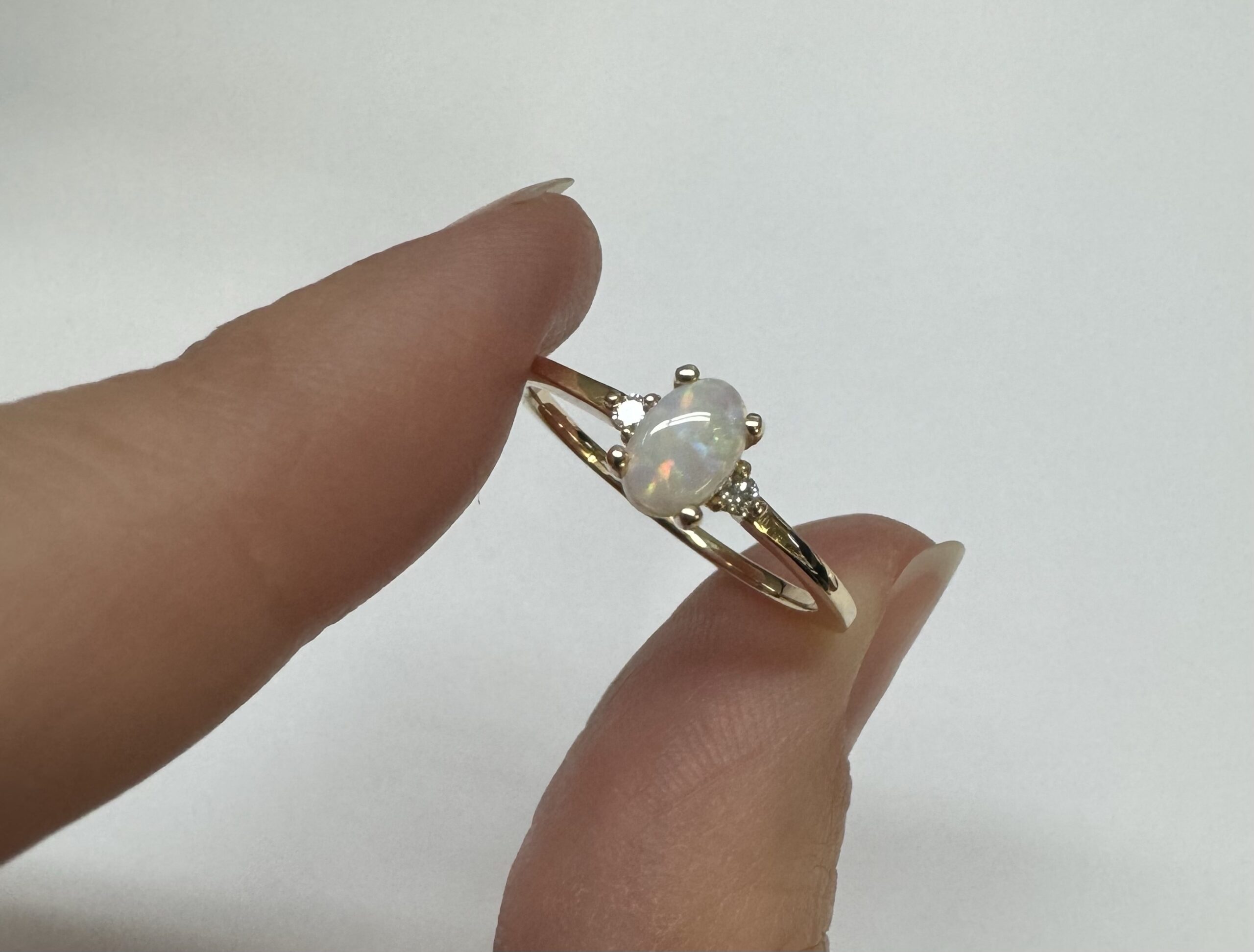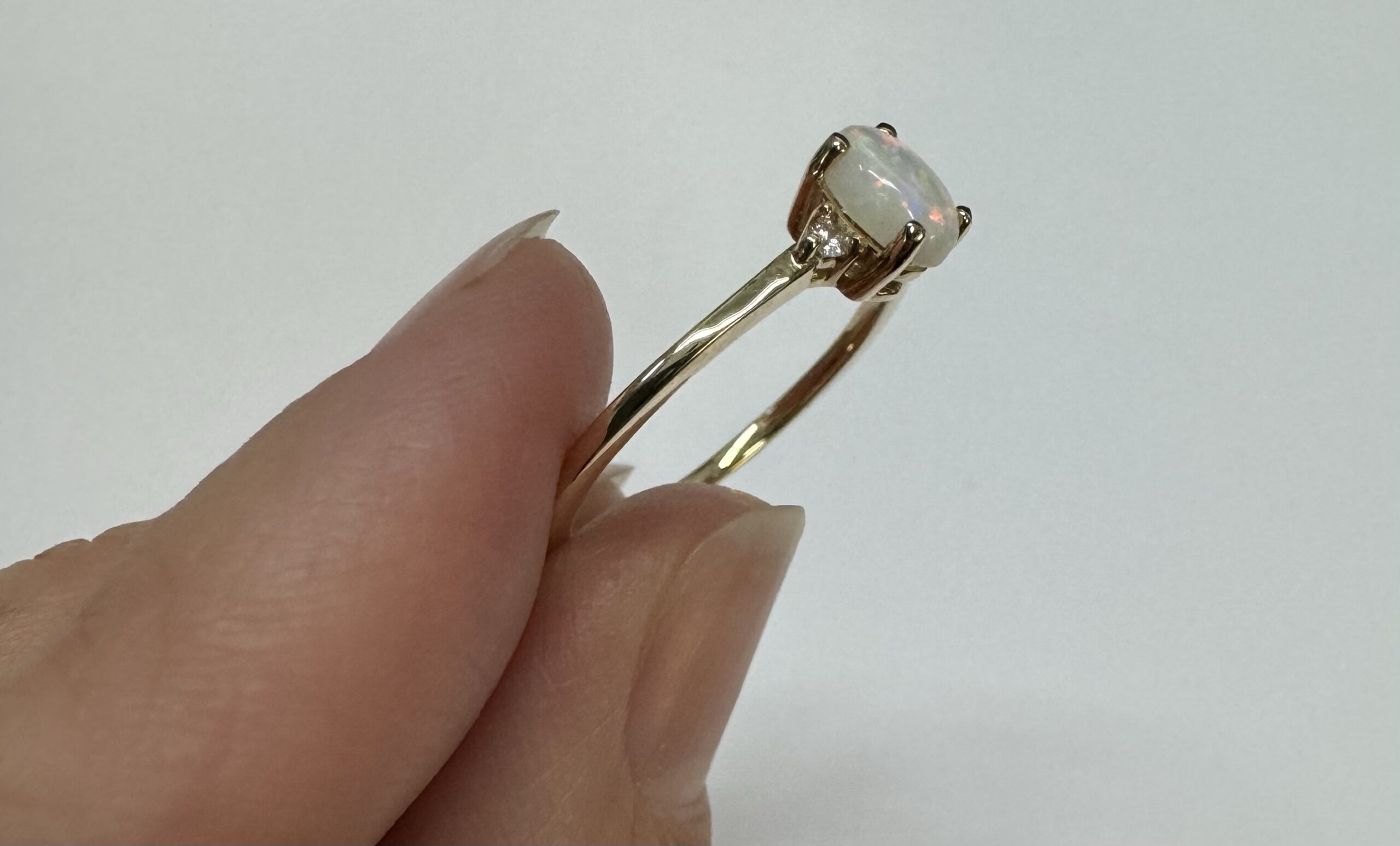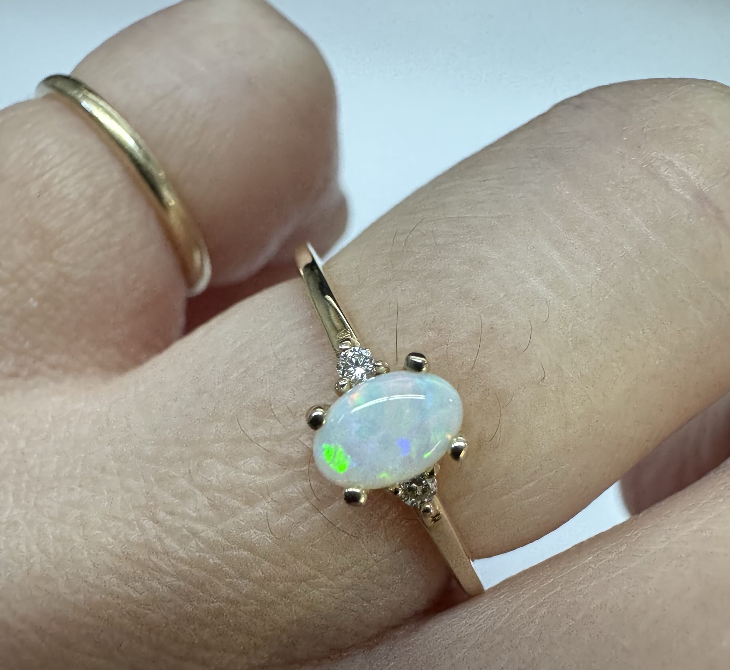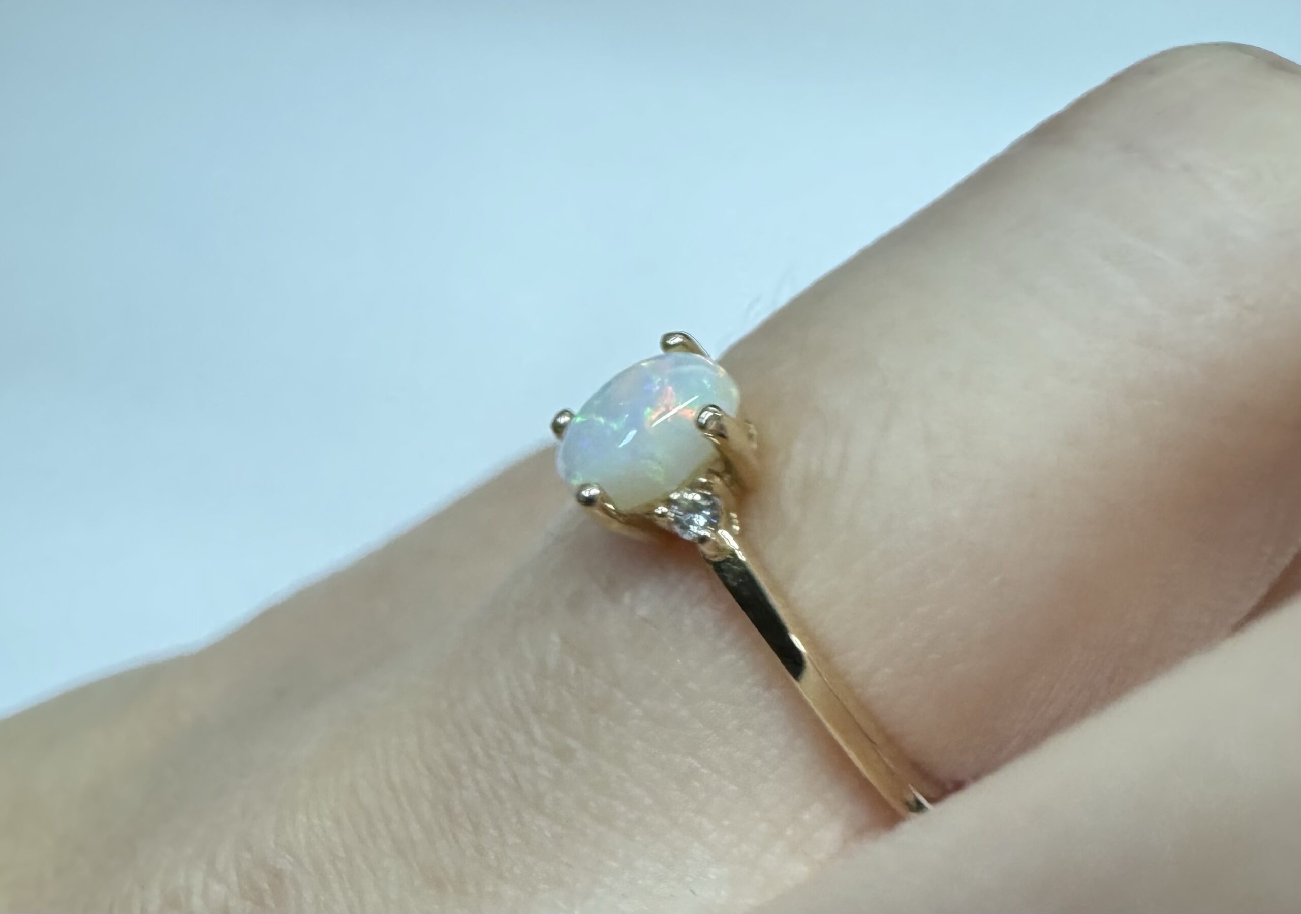 14k yellow gold oval shaped genuine .38 Cttw Opal (October birthstone) and genuine .04 cttw diamond ring. This ring has an entire weight of 1.7 grams. This ring is a finger size 6 1/4, but it can be reasonably sized. Please make note of the finger size needed in the comments section at checkout.