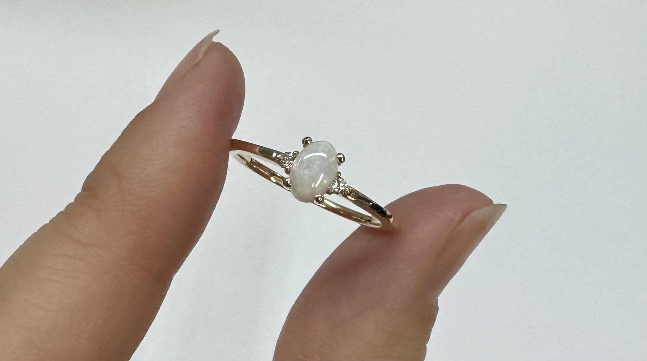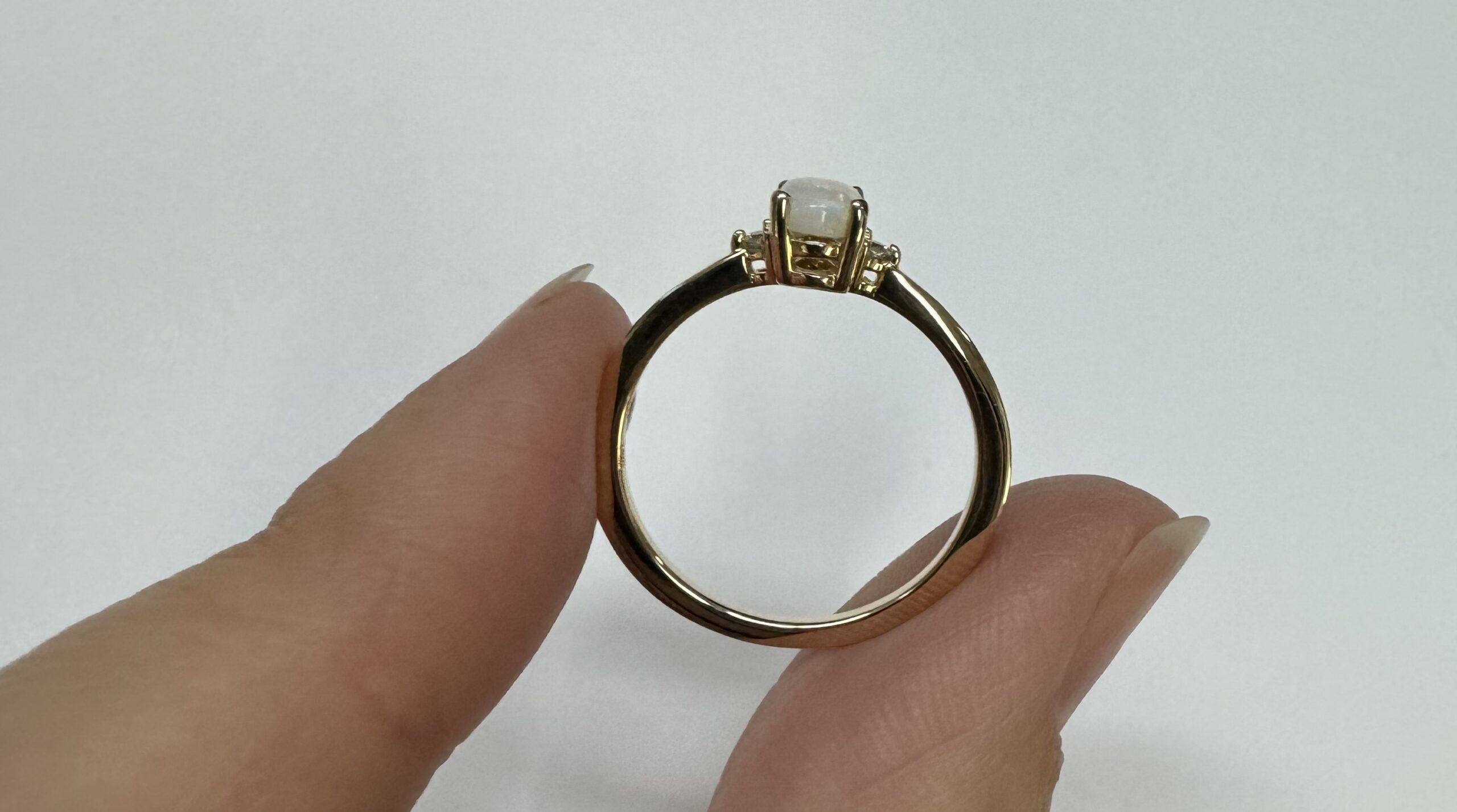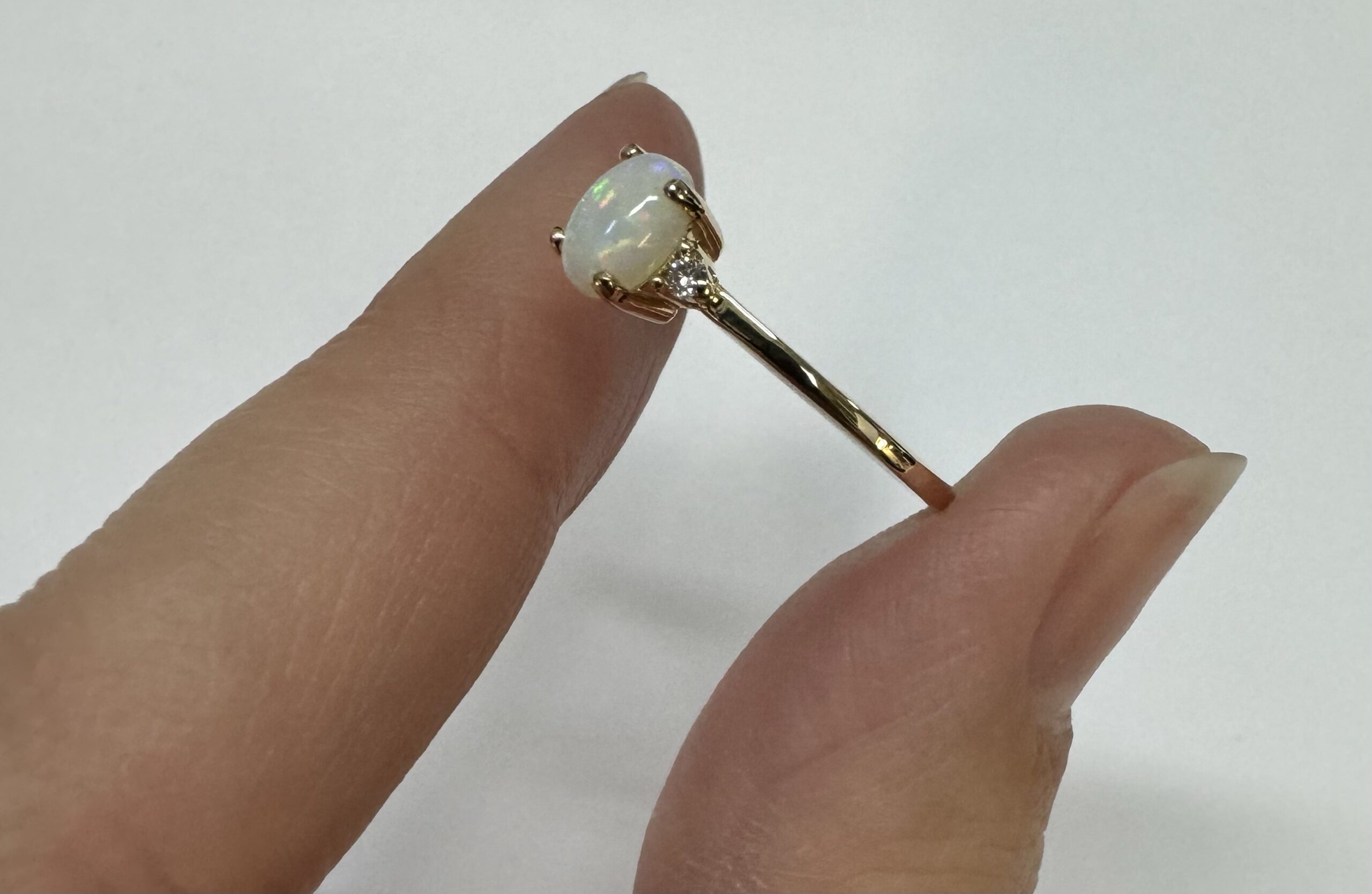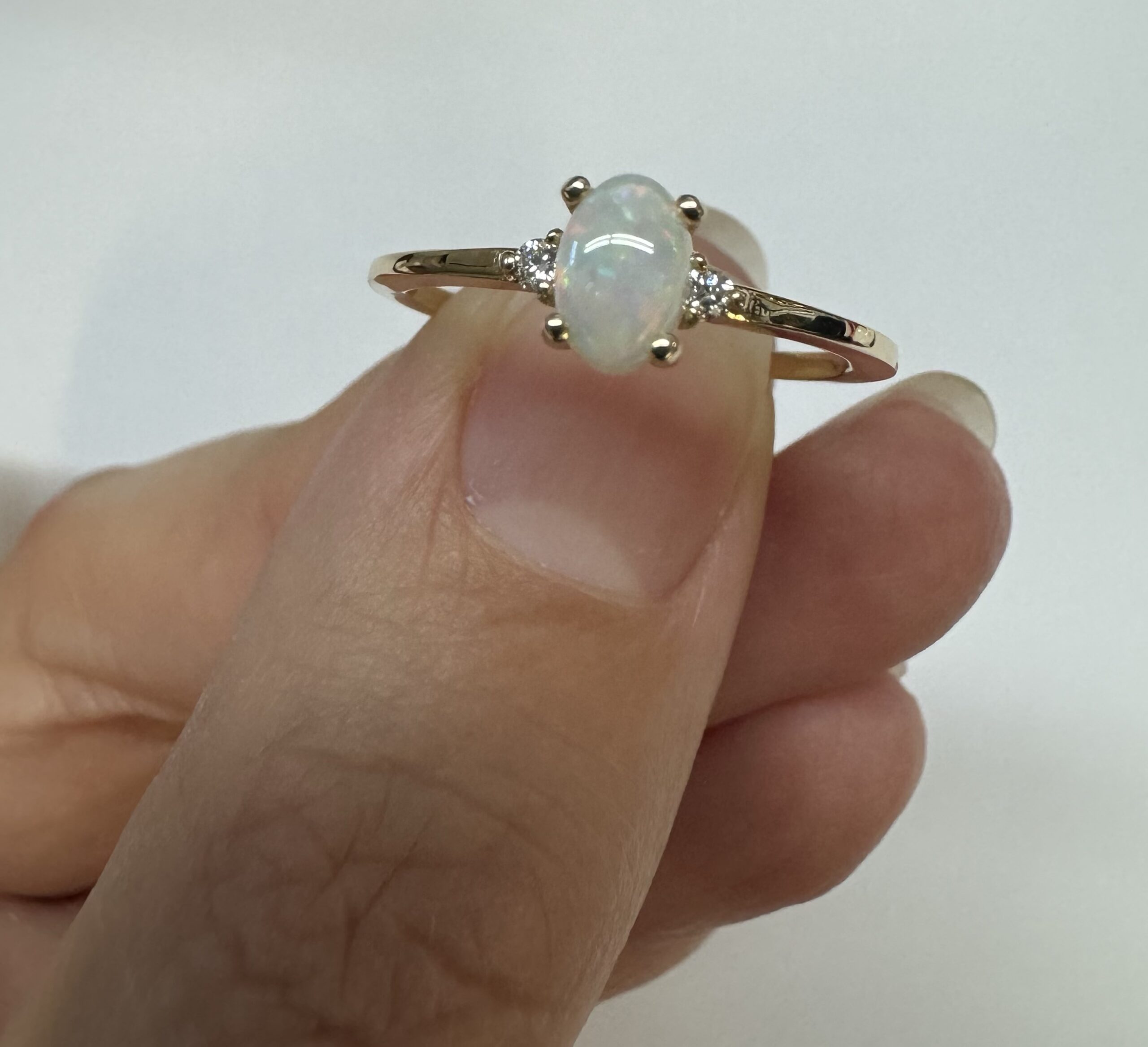14k yellow gold oval shaped genuine .38 Cttw Opal (October birthstone) and genuine .04 cttw diamond ring. This ring has an entire weight of 1.7 grams. This ring is a finger size 6 1/4, but it can be reasonably sized. Please make note of the finger size needed in the comments section at checkout.