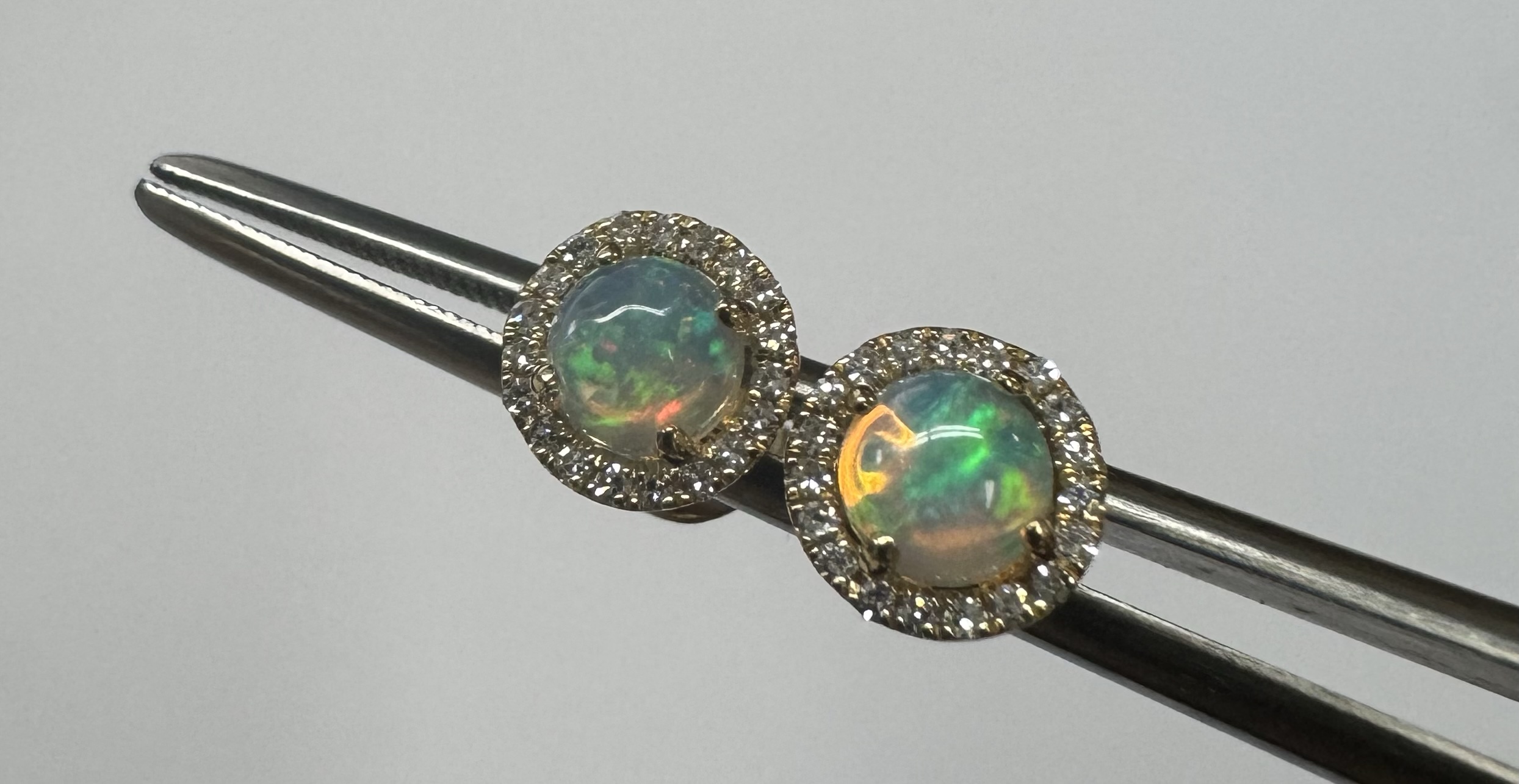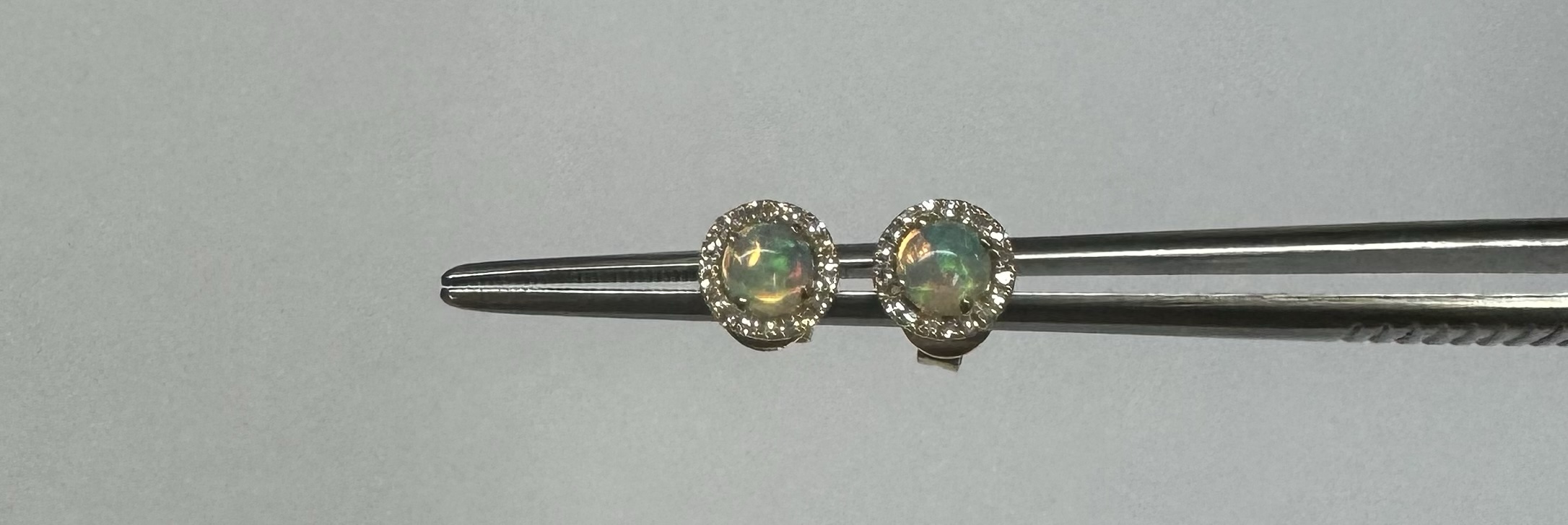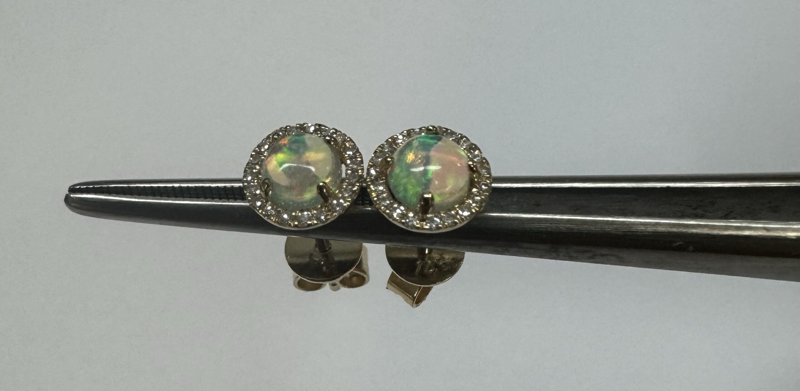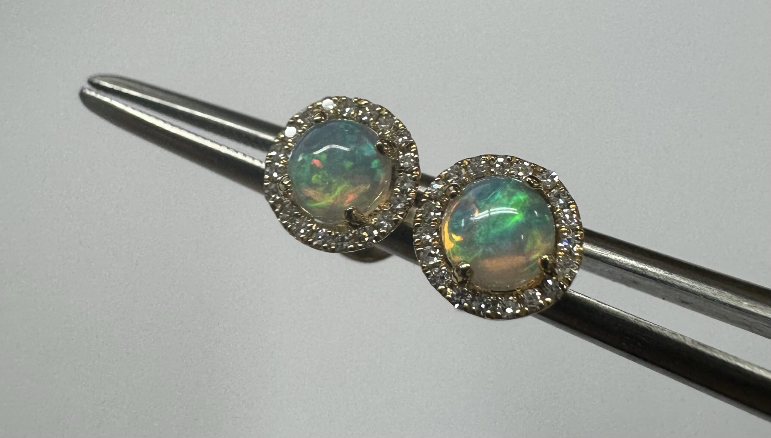 14k yellow gold genuine .40 cttw Opal & genuine .08 cttw Round Brilliant Cut diamond halo stud earrings. These diamonds average G-H in color and SI1 in clarity. These earrings have a total combined weight of 1.0 grams.